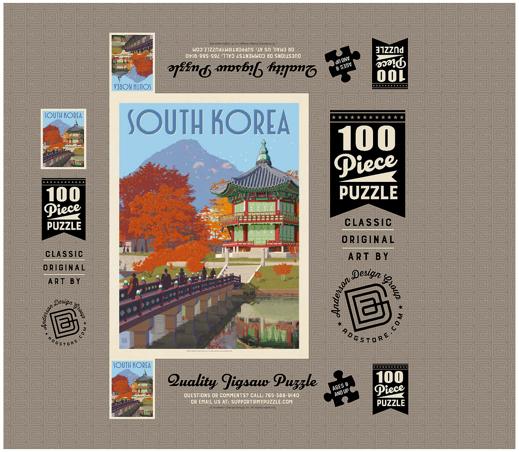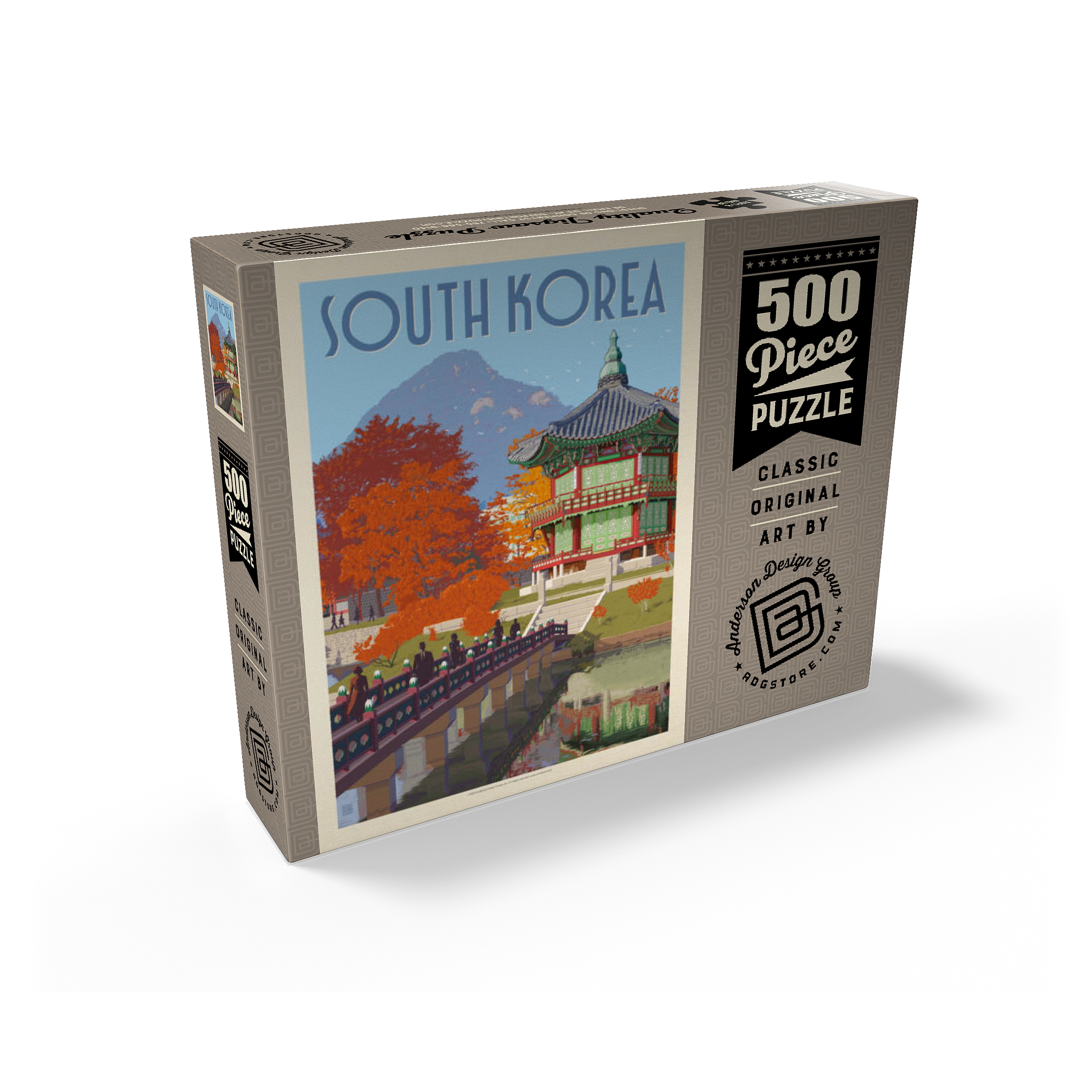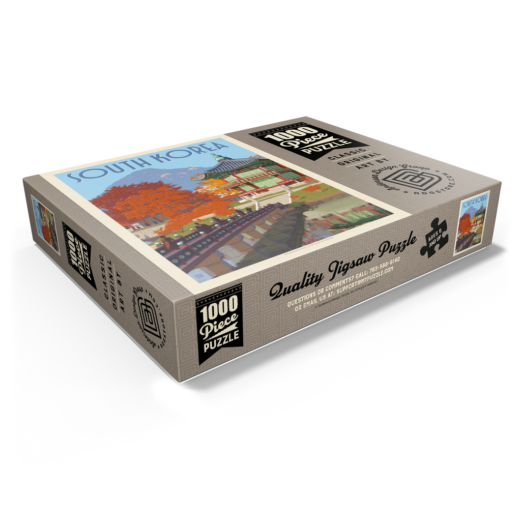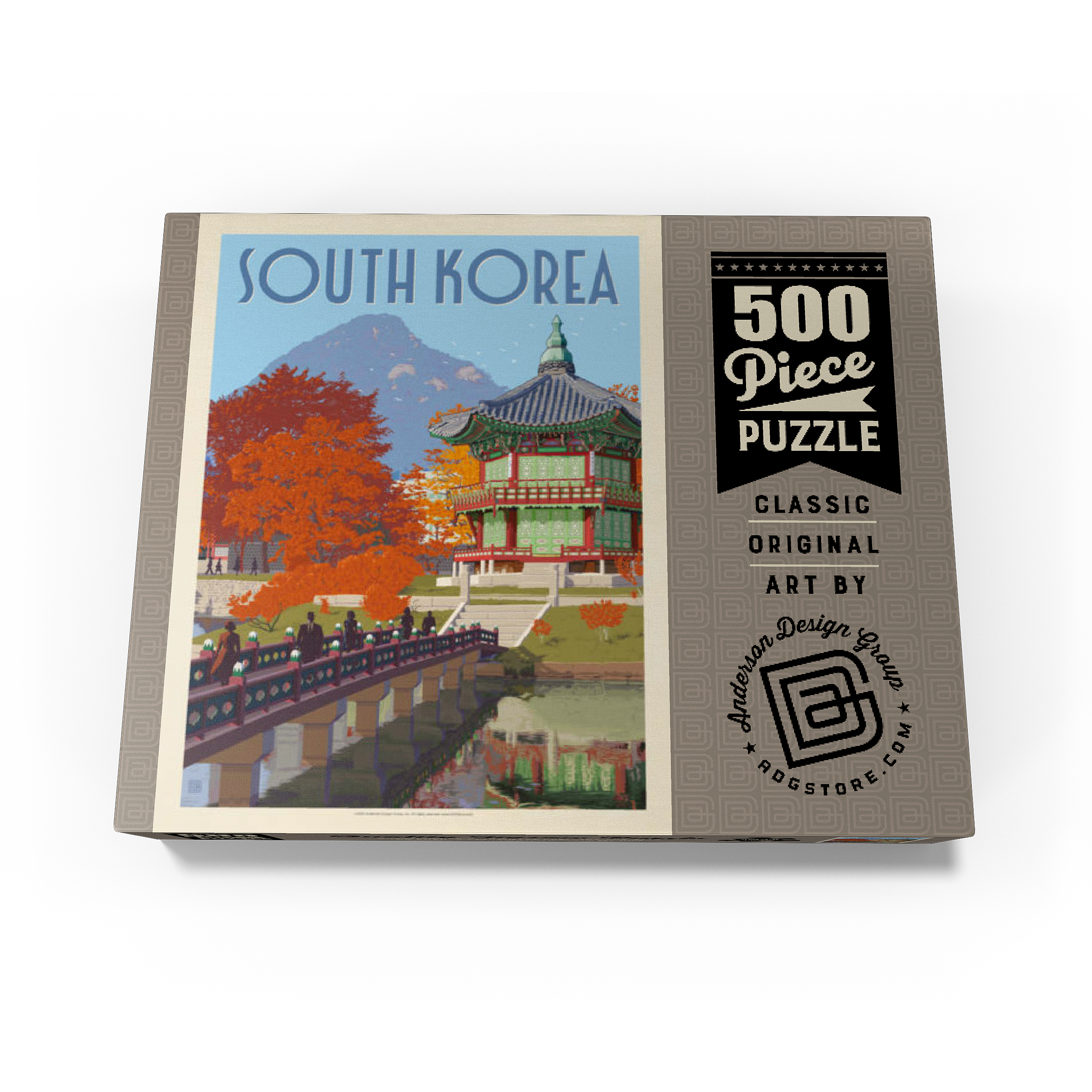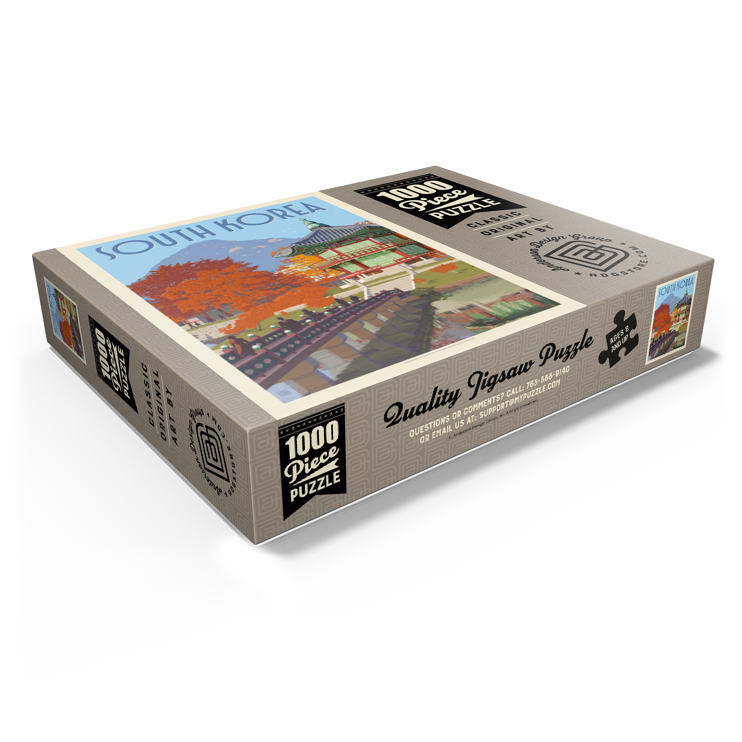 This beautifully styled travel artwork showcases the iconic Gyeongbokgung Palace in Seoul, South Korea, during the peak of autumn. The vibrant red and orange foliage frames the historic Hyangwonjeong Pavilion, a graceful two-story hexagonal structure built in the 19th century and one of the palace’s most picturesque highlights. Set against the backdrop of Bugaksan Mountain, the pavilion sits elegantly on an island in a tranquil pond, connected by a charming wooden bridge adorned with traditional Korean patterns. The reflection of the pavilion and trees in the still water enhances the serene beauty of the scene, capturing both cultural heritage and natural harmony. Gyeongbokgung Palace, originally constructed in 1395, is the largest of Seoul’s Five Grand Palaces and a treasured symbol of Korea’s Joseon Dynasty. The depiction emphasizes the blending of architectural sophistication with seasonal landscapes, making it a timeless representation of Korean history, art, and tradition.