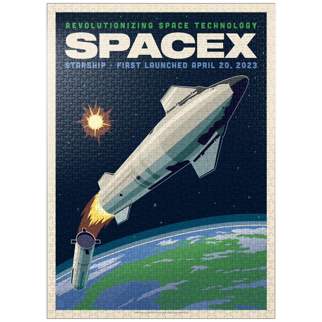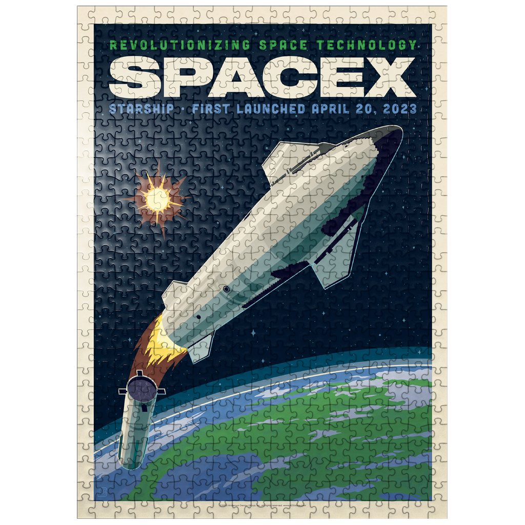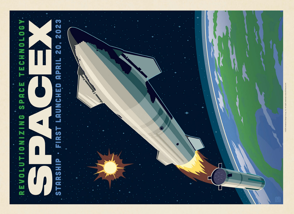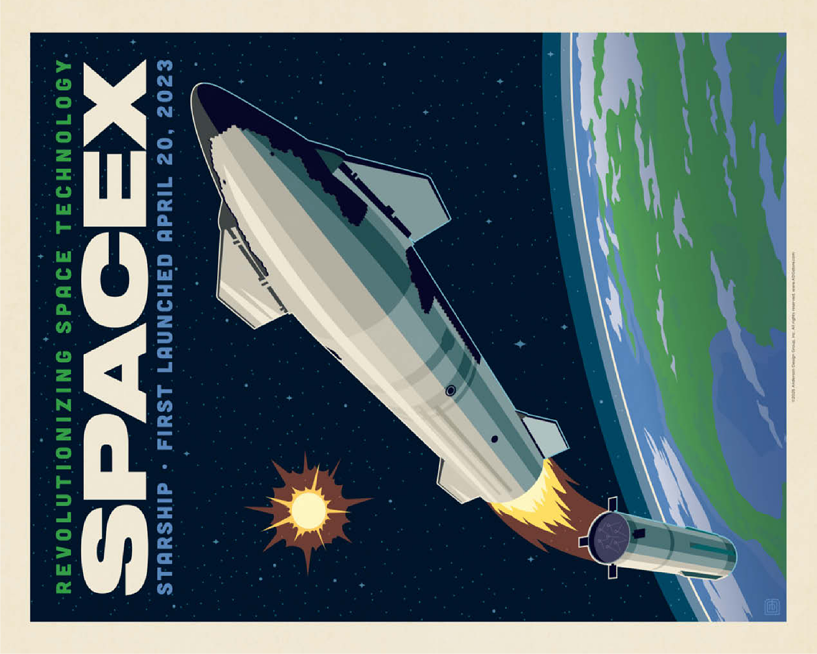 This striking retro-style illustration celebrates the SpaceX Starship's first launch on April 20, 2023, marking a major step toward revolutionizing space technology. The scene depicts Starship separating from its Super Heavy booster as it ascends into low Earth orbit, set against a backdrop of stars, the glowing sun, and the curvature of Earth. As the most powerful rocket ever built, Starship is designed for fully reusable deep space missions, including future crewed flights to the Moon and Mars. The bold colors and vintage design emphasize innovation, ambition, and the new era of private space exploration led by SpaceX.