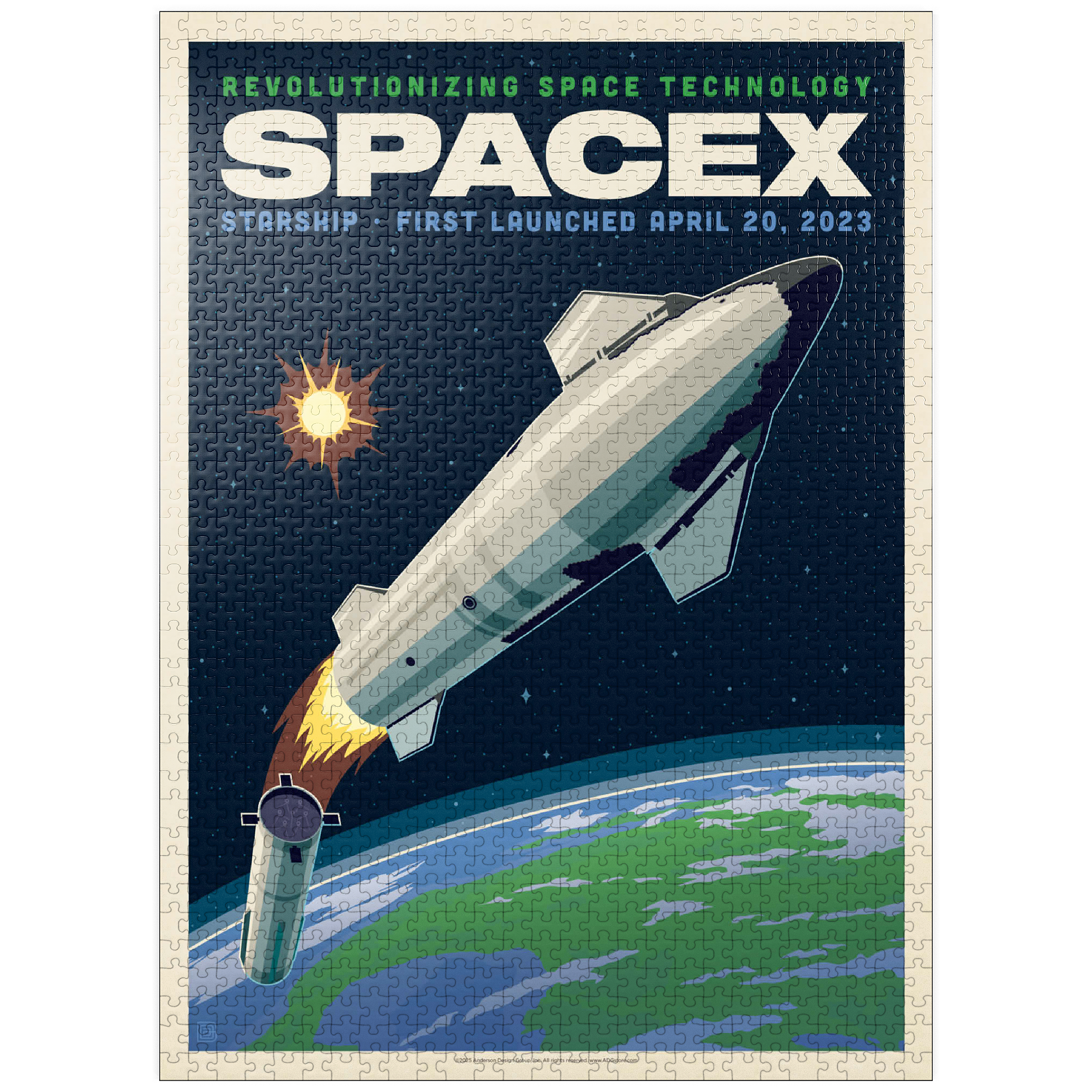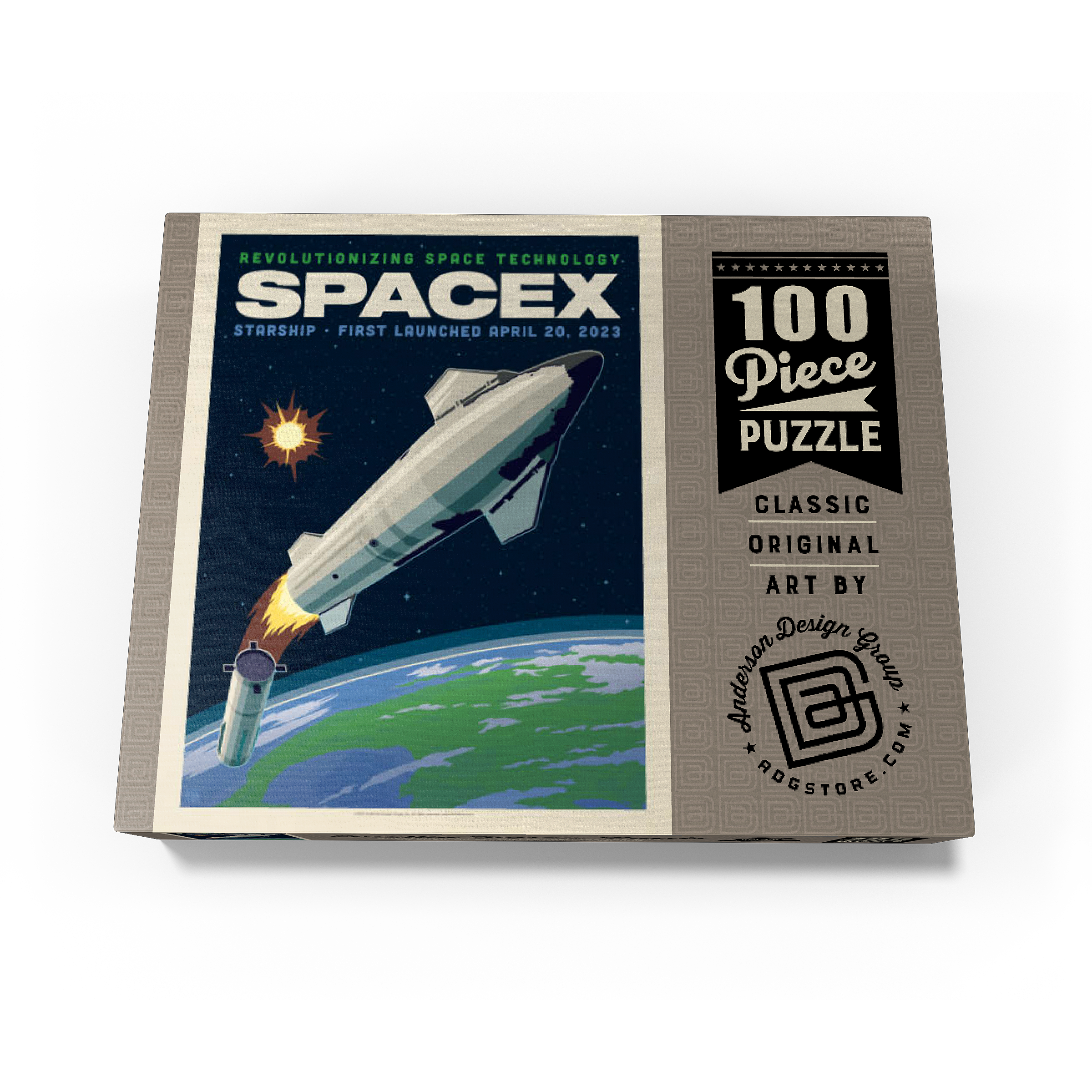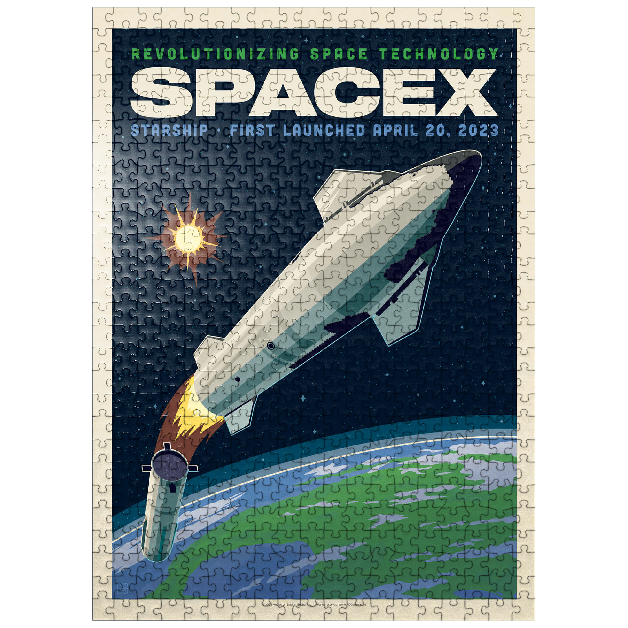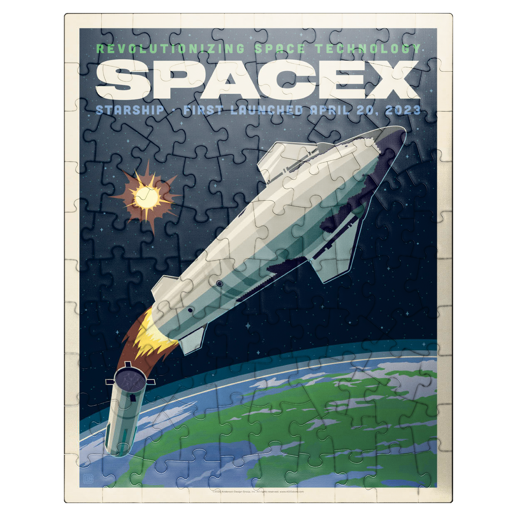 This striking retro-style illustration celebrates the SpaceX Starship's first launch on April 20, 2023, marking a major step toward revolutionizing space technology. The scene depicts Starship separating from its Super Heavy booster as it ascends into low Earth orbit, set against a backdrop of stars, the glowing sun, and the curvature of Earth. As the most powerful rocket ever built, Starship is designed for fully reusable deep space missions, including future crewed flights to the Moon and Mars. The bold colors and vintage design emphasize innovation, ambition, and the new era of private space exploration led by SpaceX.