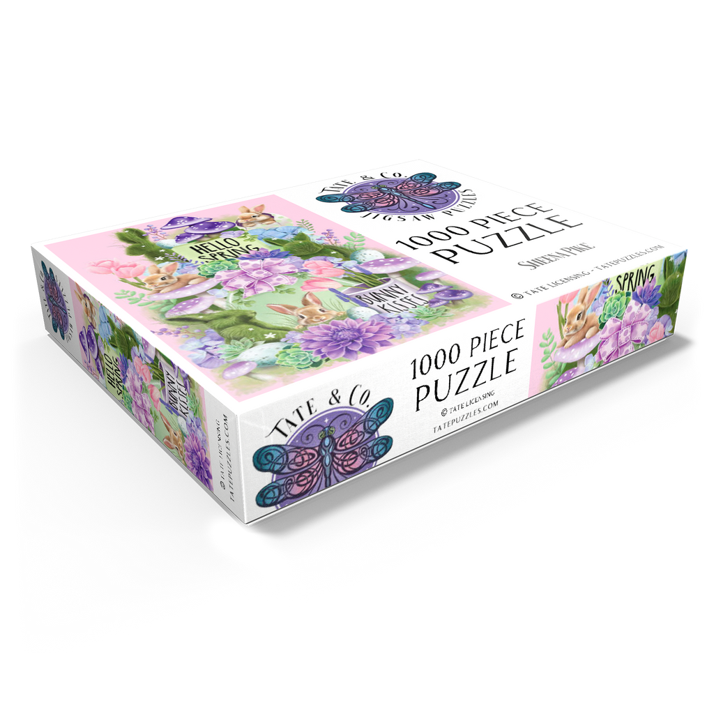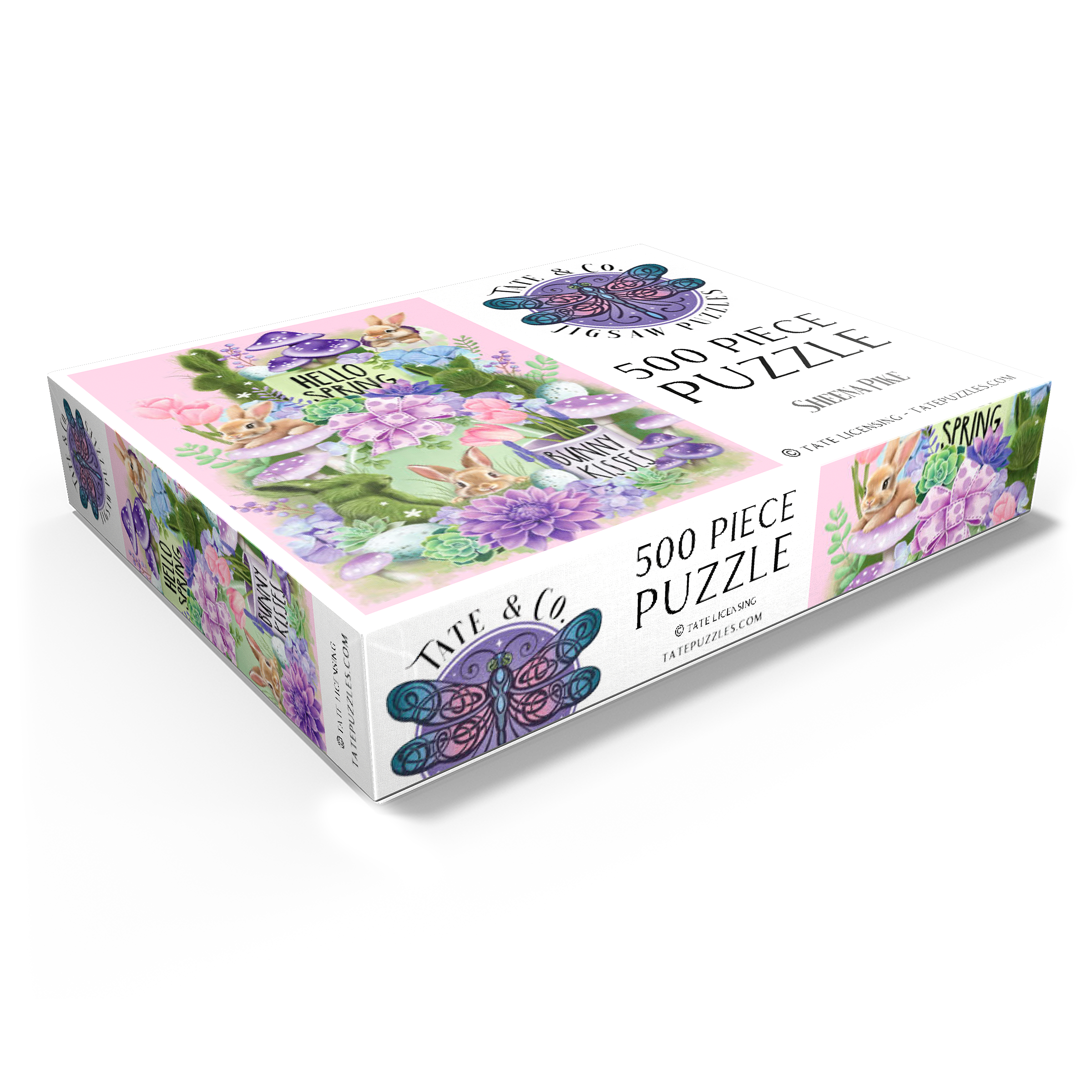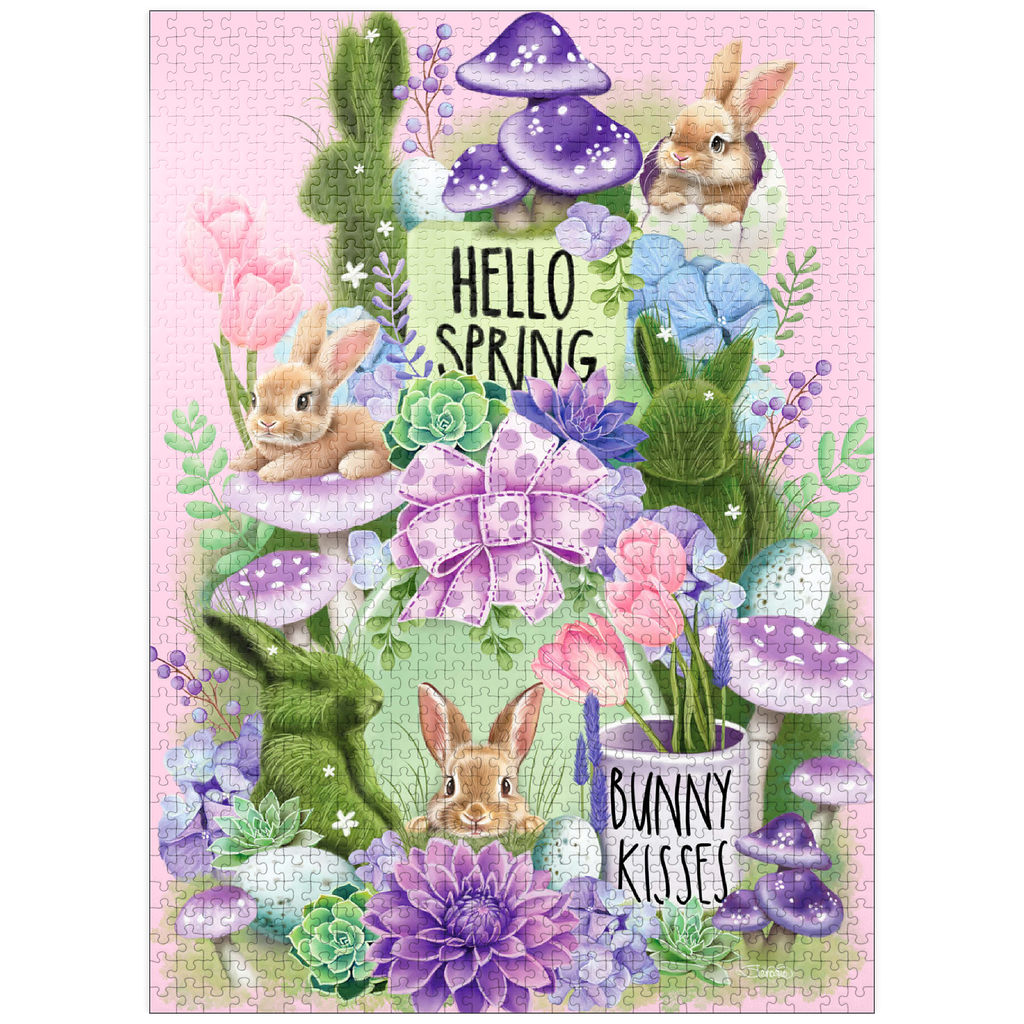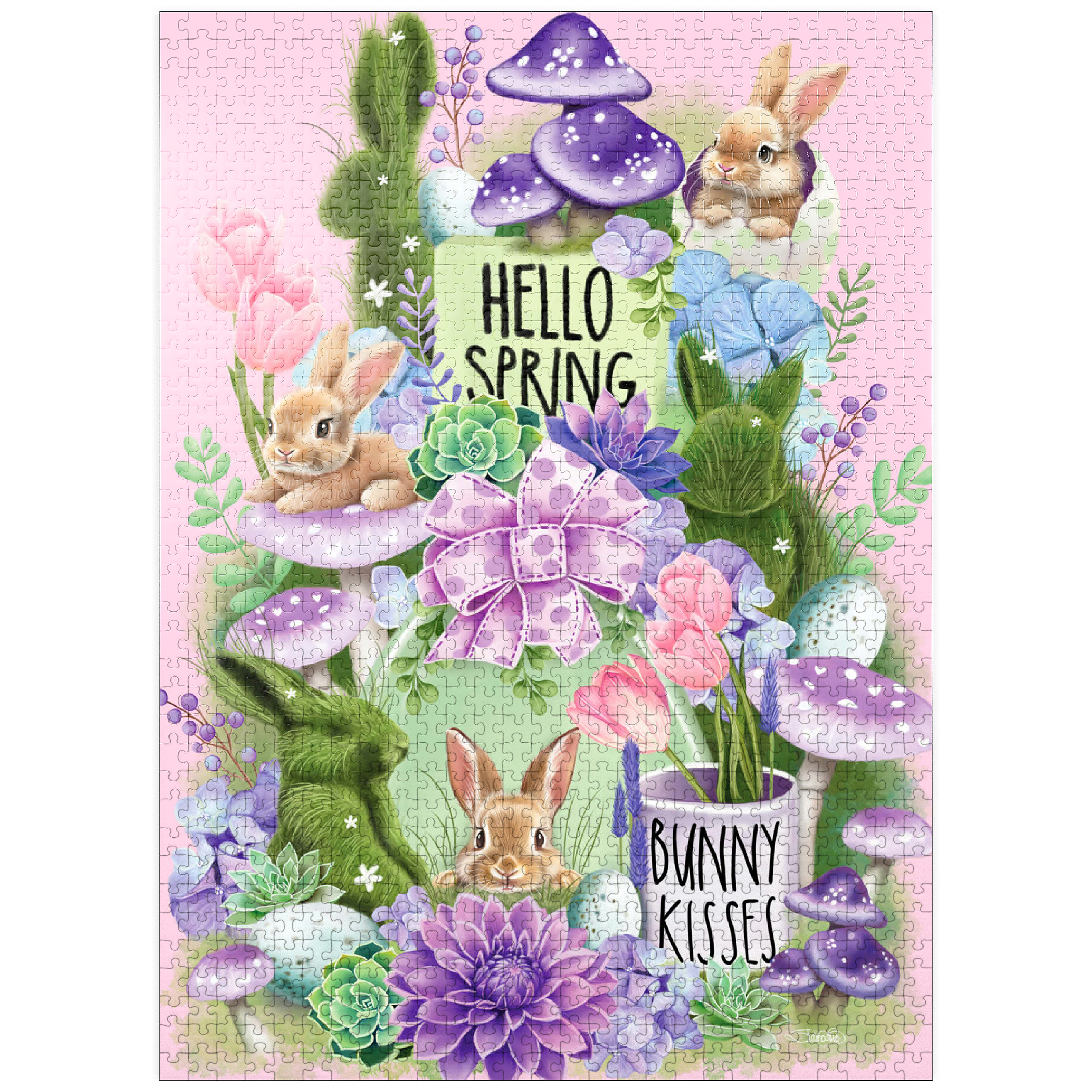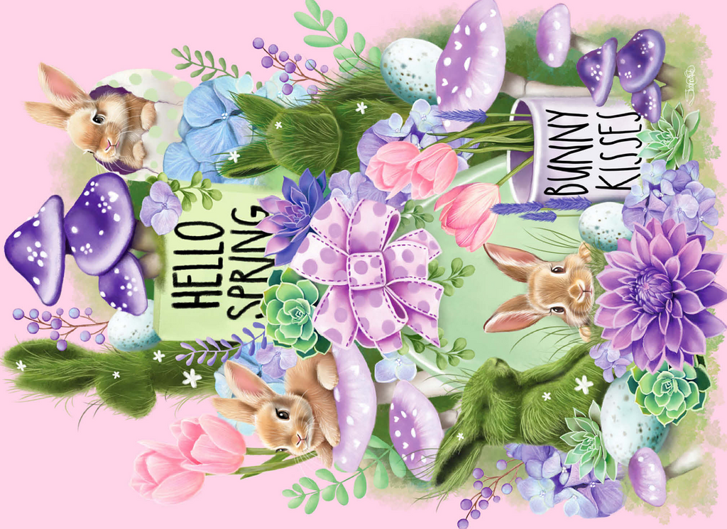-A whimsical and endearing drawing in pastel shades by Sheena Pike. Adorable, sweet little bunnies are stacked playfully amidst a vibrant springtime scene. Lush succulents, whimsical mushrooms, and delicate flowers create a colorful and joyful composition. Ideal for Easter or as a charming spring puzzle, this image radiates sweetness and light