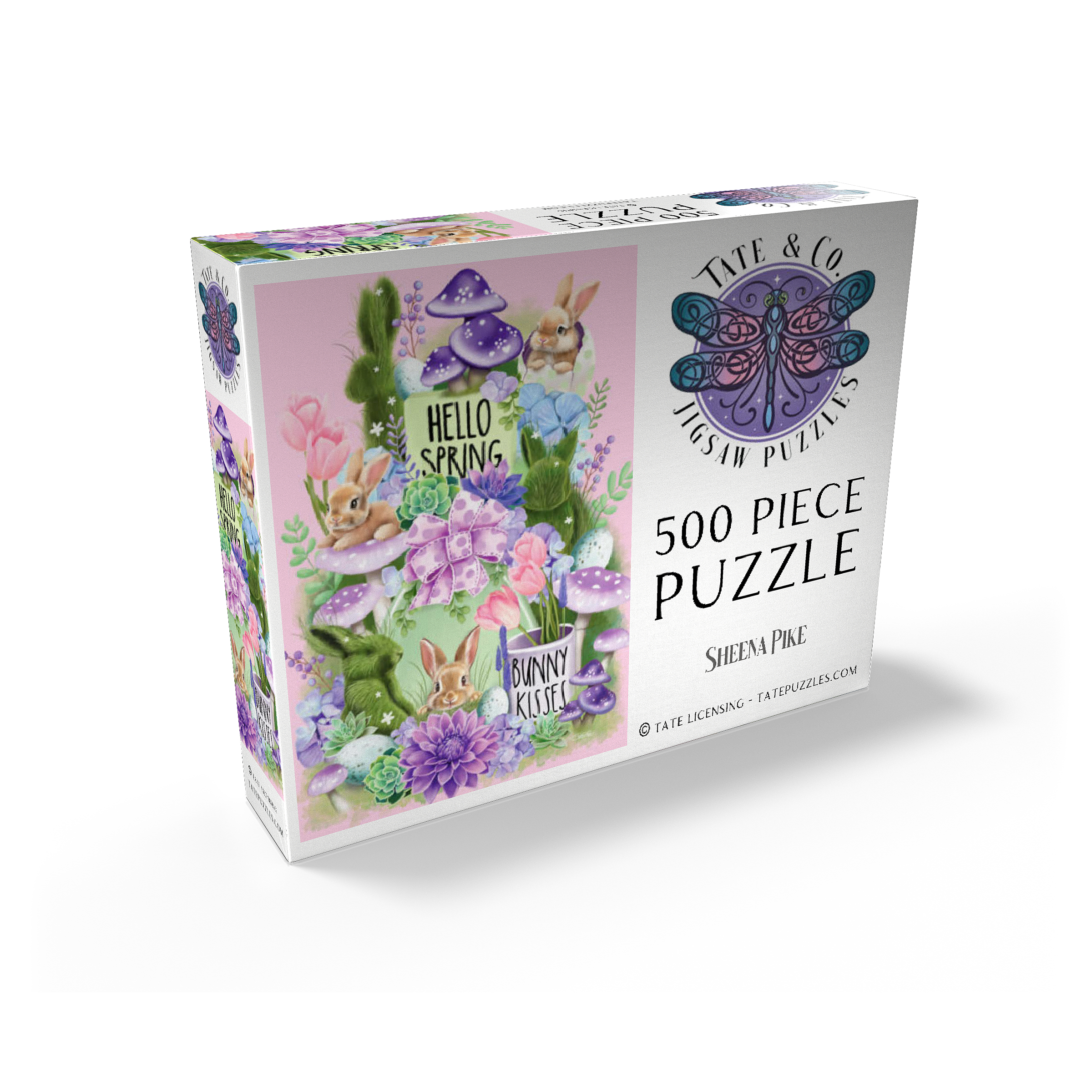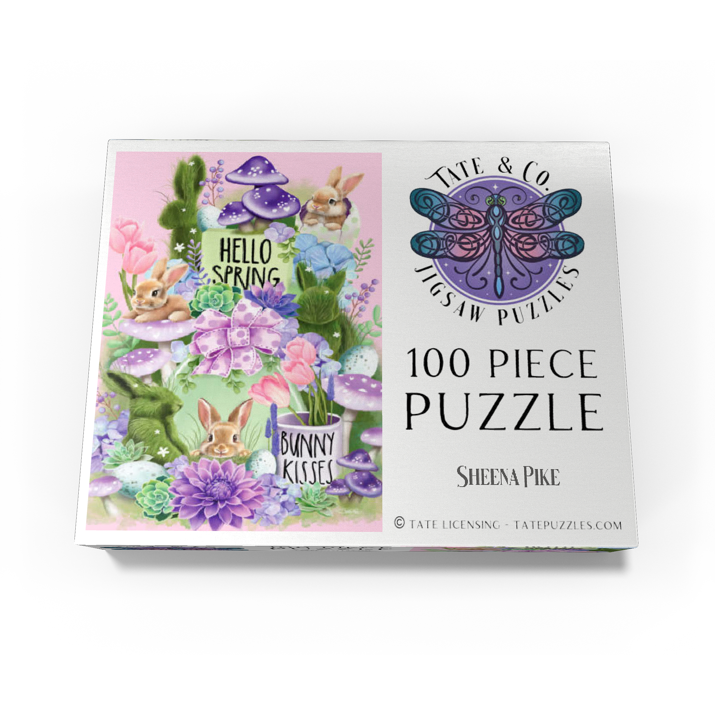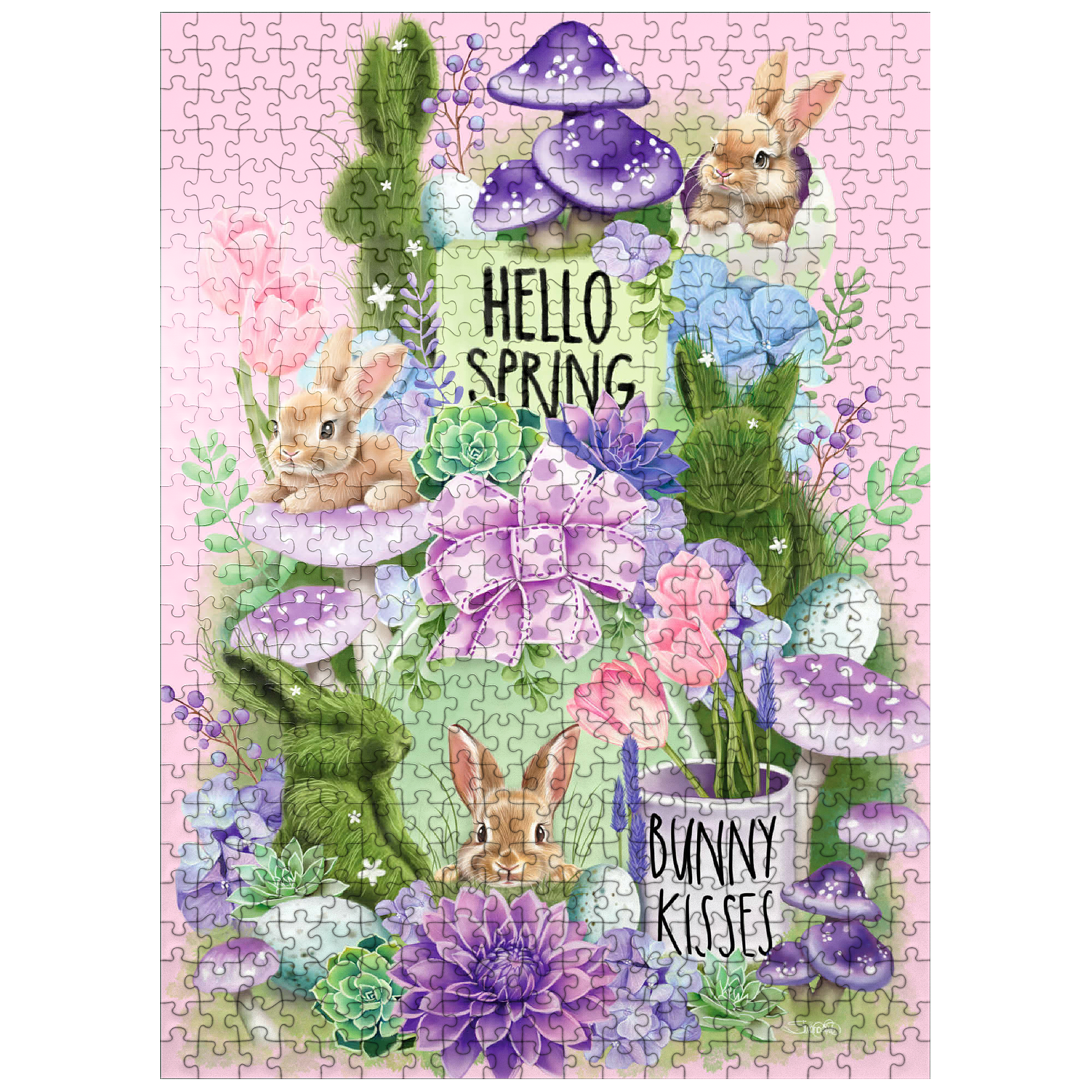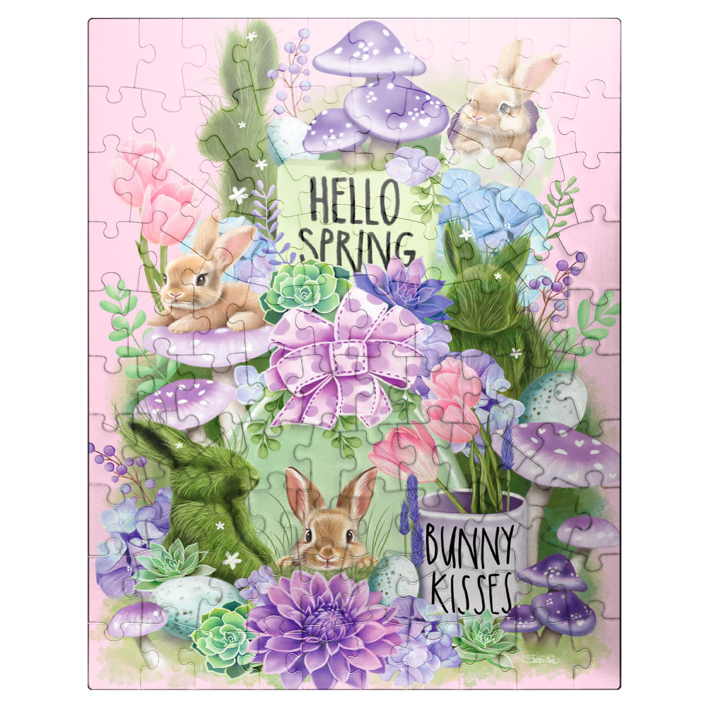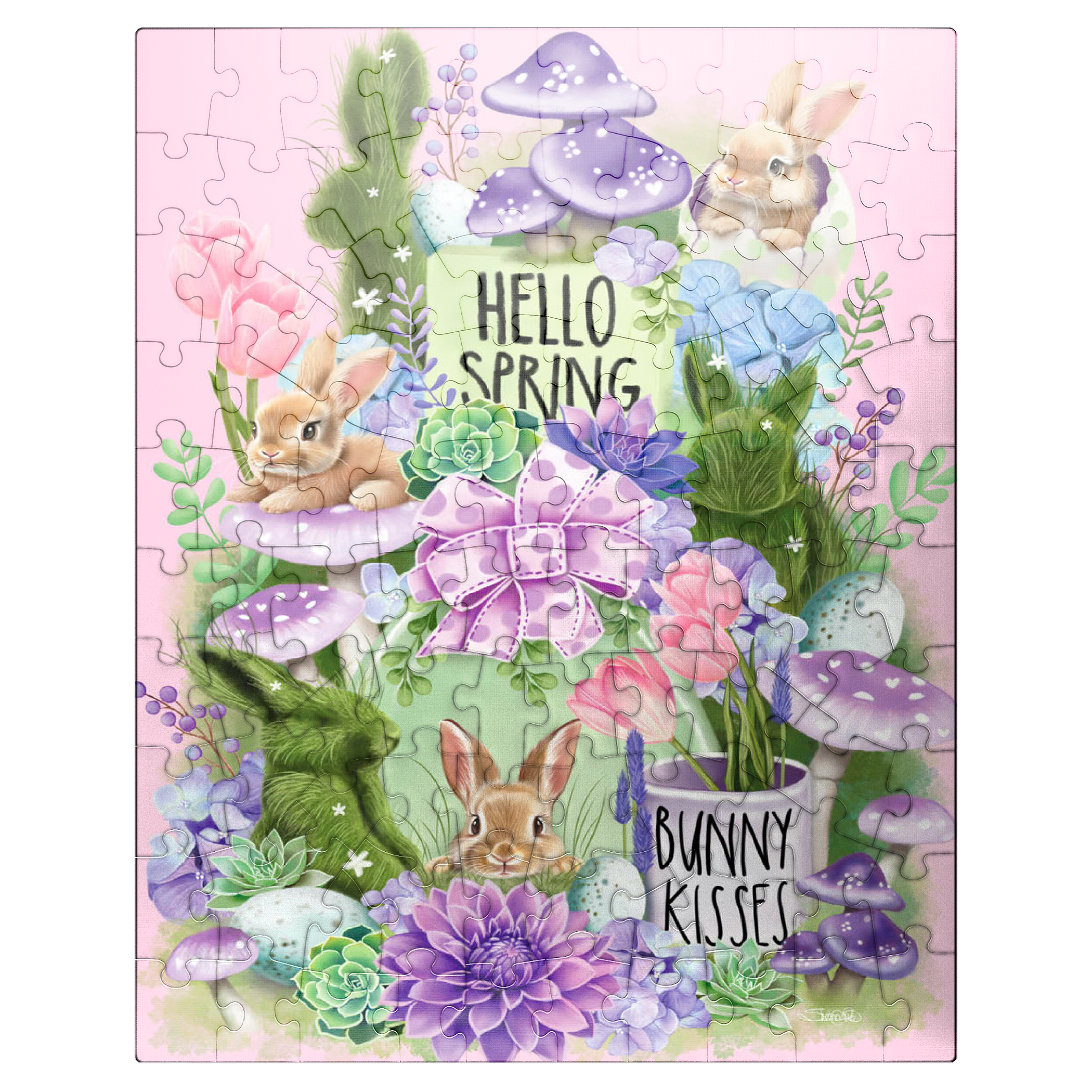 -A whimsical and endearing drawing in pastel shades by Sheena Pike. Adorable, sweet little bunnies are stacked playfully amidst a vibrant springtime scene. Lush succulents, whimsical mushrooms, and delicate flowers create a colorful and joyful composition. Ideal for Easter or as a charming spring puzzle, this image radiates sweetness and light