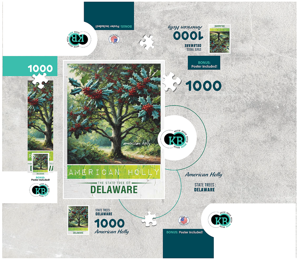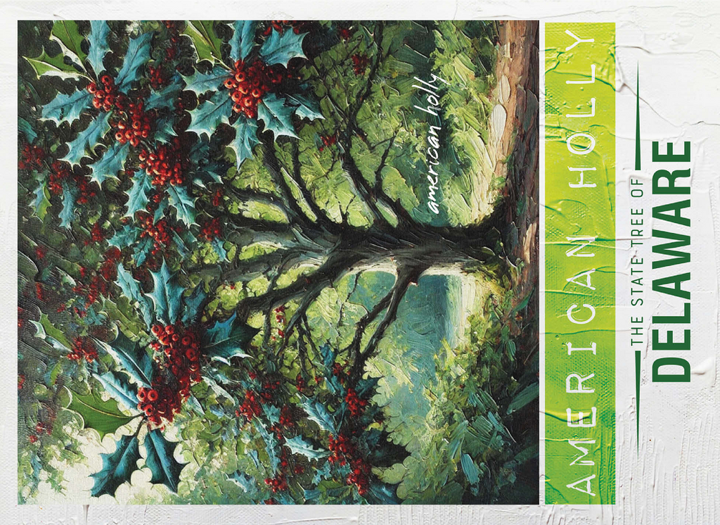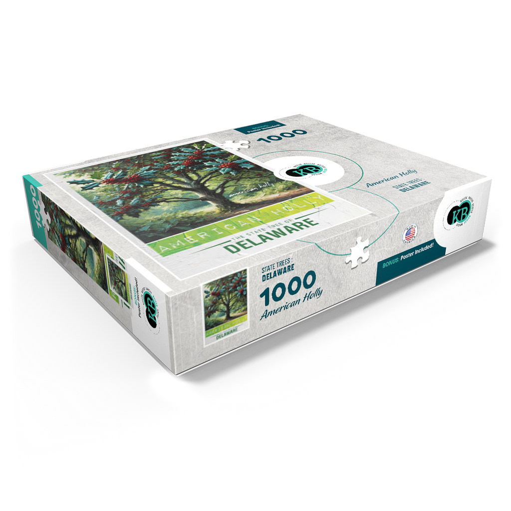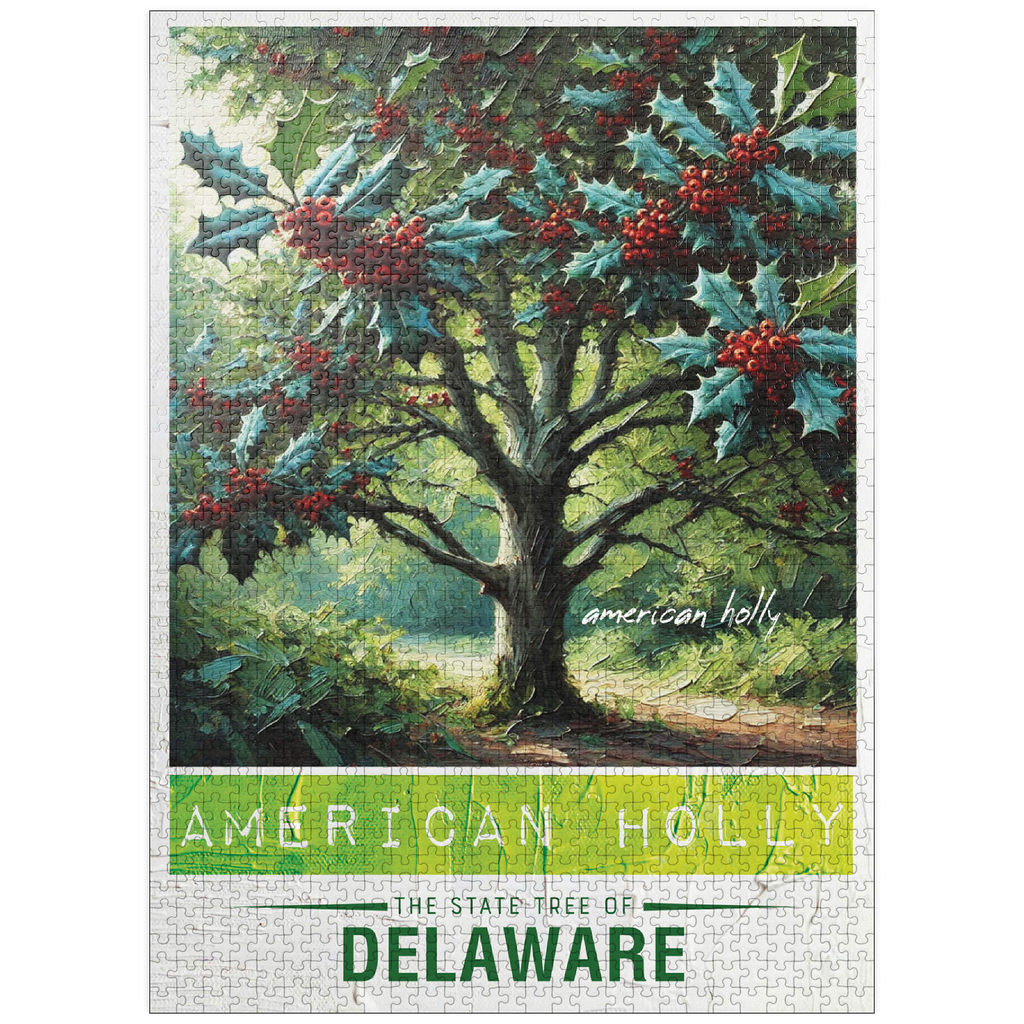 The state tree of Delaware is the American holly (Ilex opaca), designated in 1939. This evergreen tree is known for its glossy, dark green leaves and bright red berries, which provide food for birds and other wildlife. American holly was once an important crop in Delaware, as its branches were widely used for holiday decorations. It thrives in the state's forests and wetlands, adding beauty and ecological value to the landscape. The State Trees collection is a unique way to show your state pride! Choose your state, or pick your favorite tree from the collection and watch it come to life. This would make a great gift for a fellow out-of-state puzzle-lover. Go on an 'adventure across the country' and collect them all!