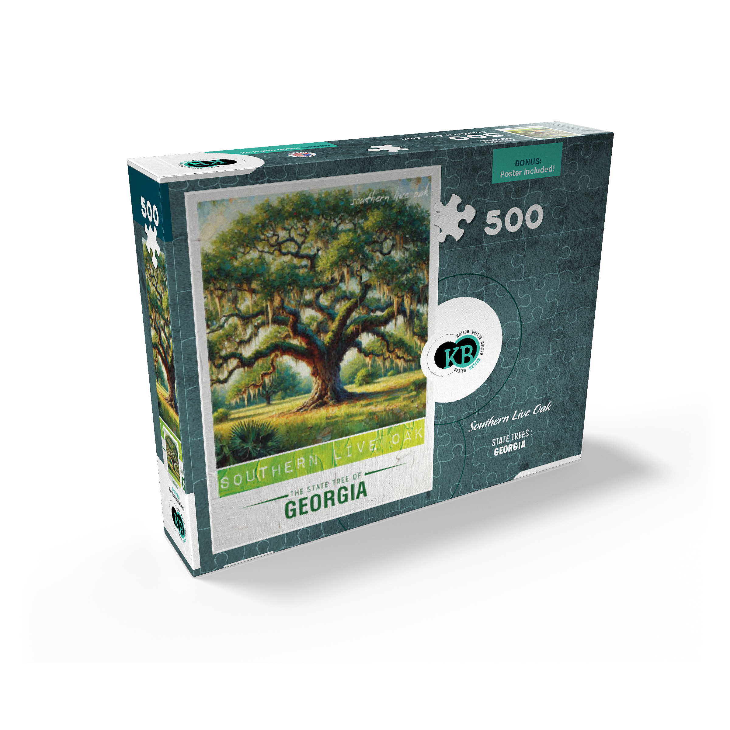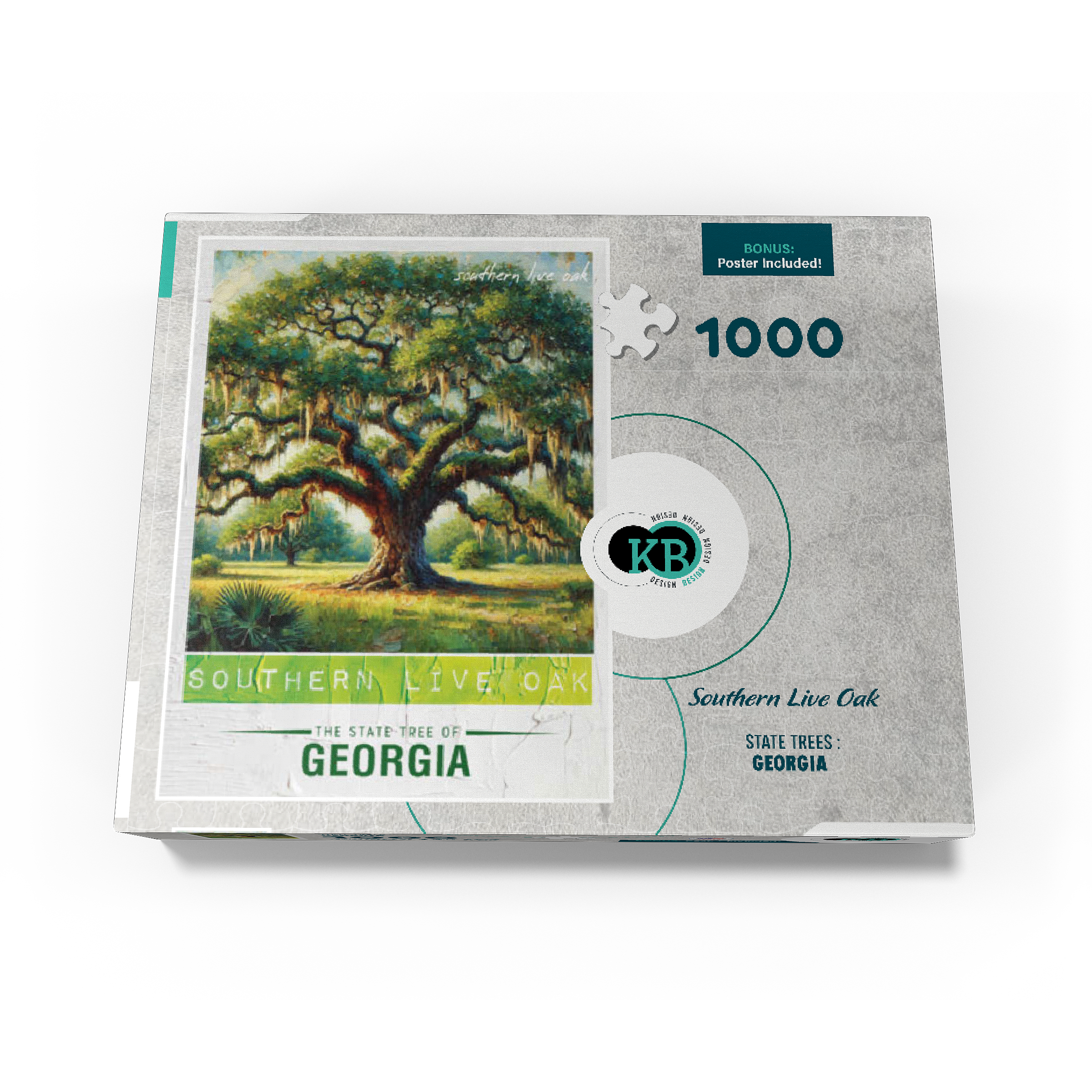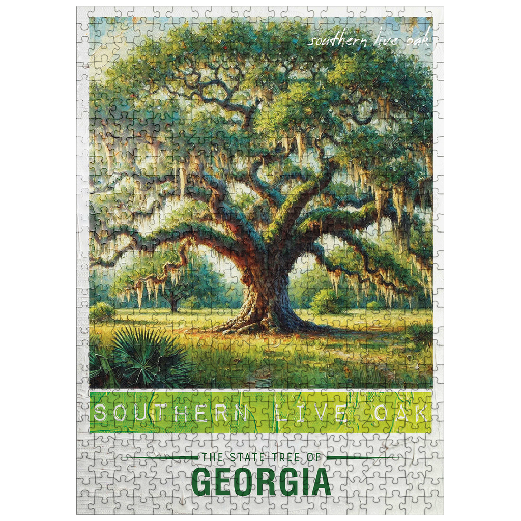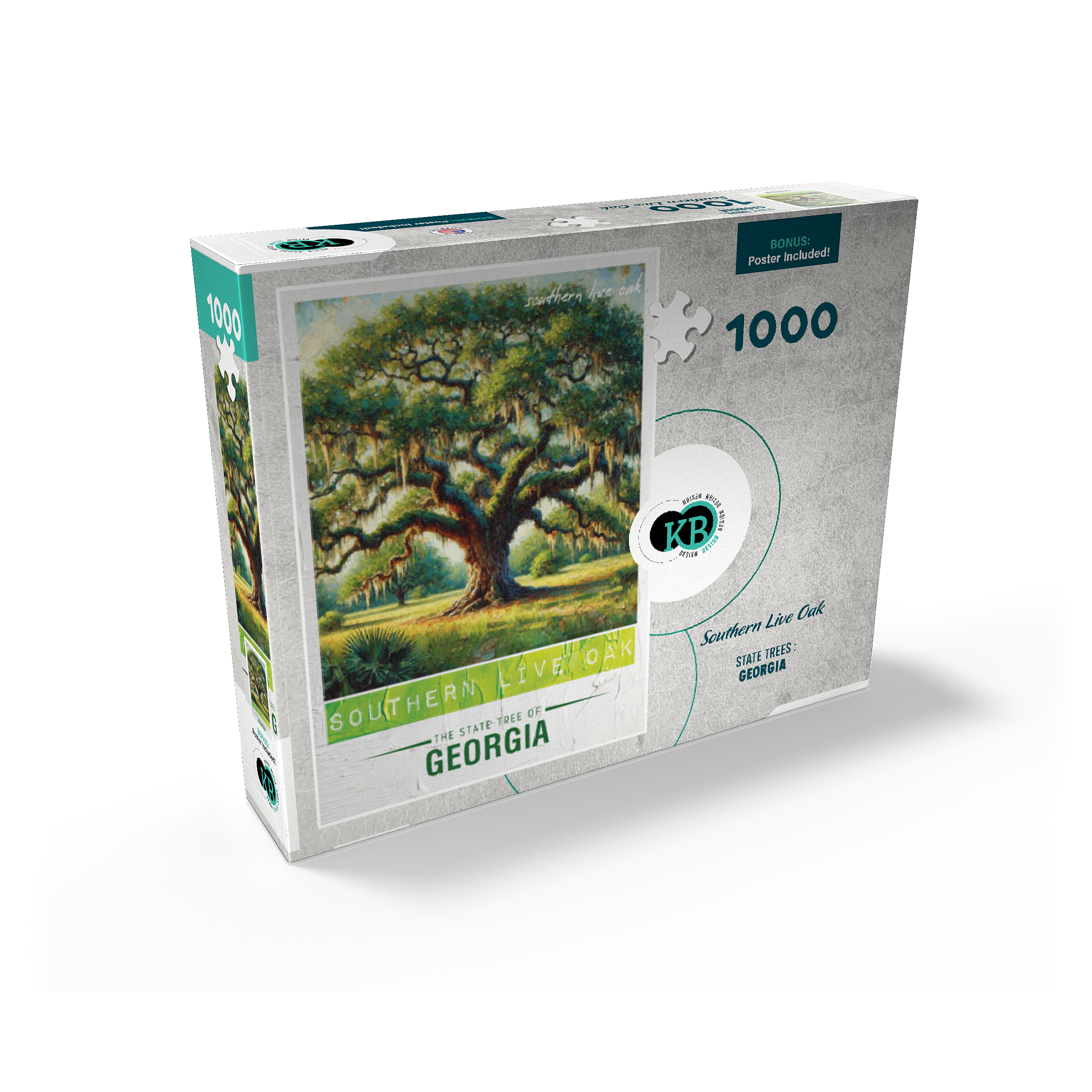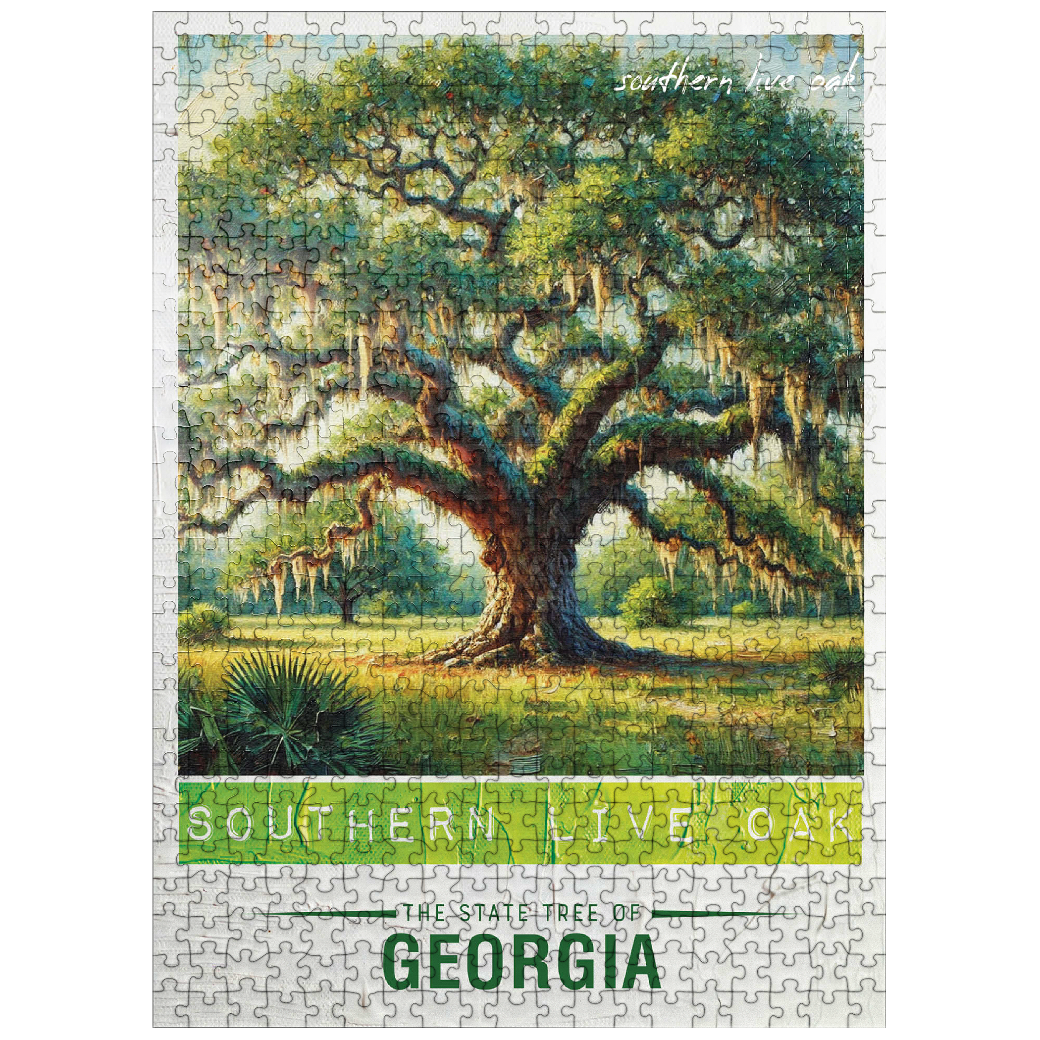 The state tree of Georgia is the live oak (Quercus virginiana), designated in 1937. This majestic tree is known for its sprawling branches, strong wood, and evergreen leaves. It thrives in Georgia's coastal regions and provides vital habitat for wildlife. Historically, live oak wood was used in shipbuilding, including for the USS Constitution, nicknamed -Old Ironsides.- The tree symbolizes strength, resilience, and the beauty of the Southern landscape. The State Trees collection is a unique way to show your state pride! Choose your state, or pick your favorite tree from the collection and watch it come to life. This would make a great gift for a fellow out-of-state puzzle-lover. Go on an 'adventure across the country' and collect them all!