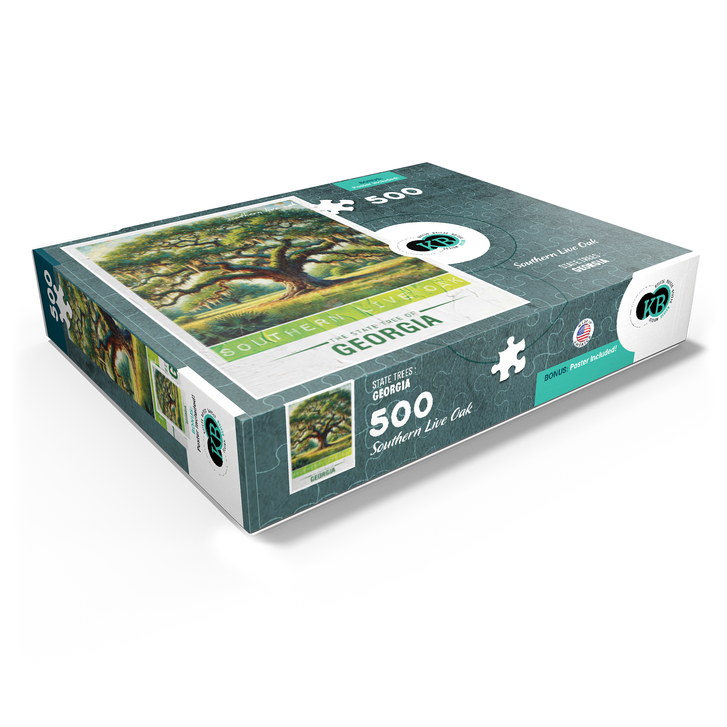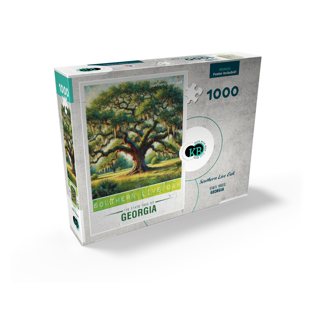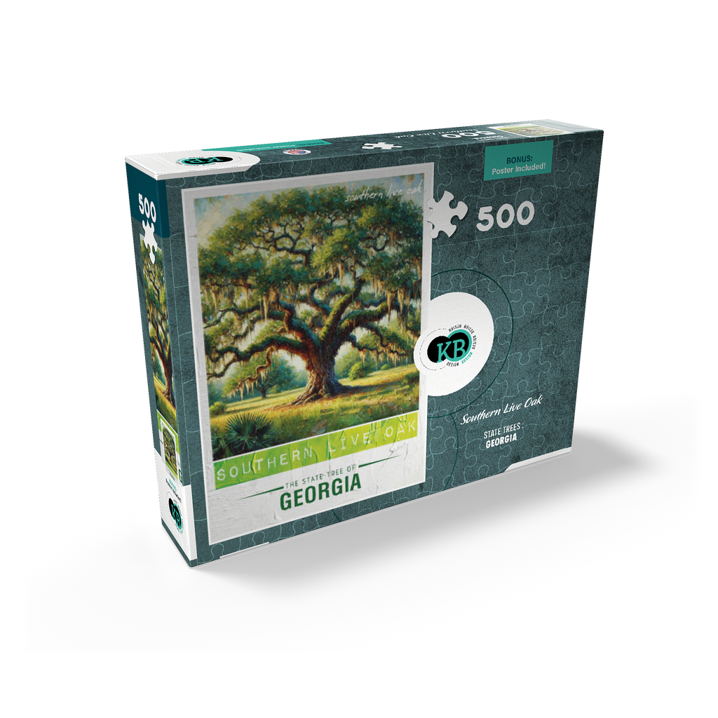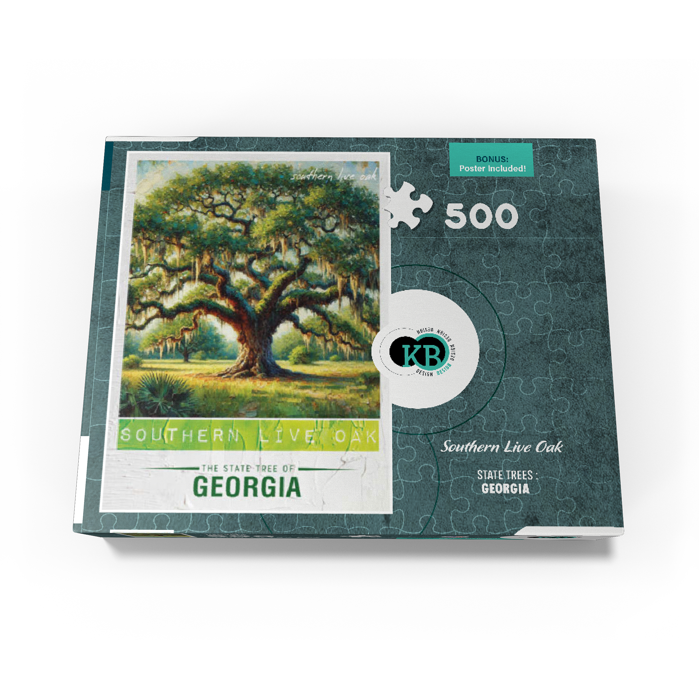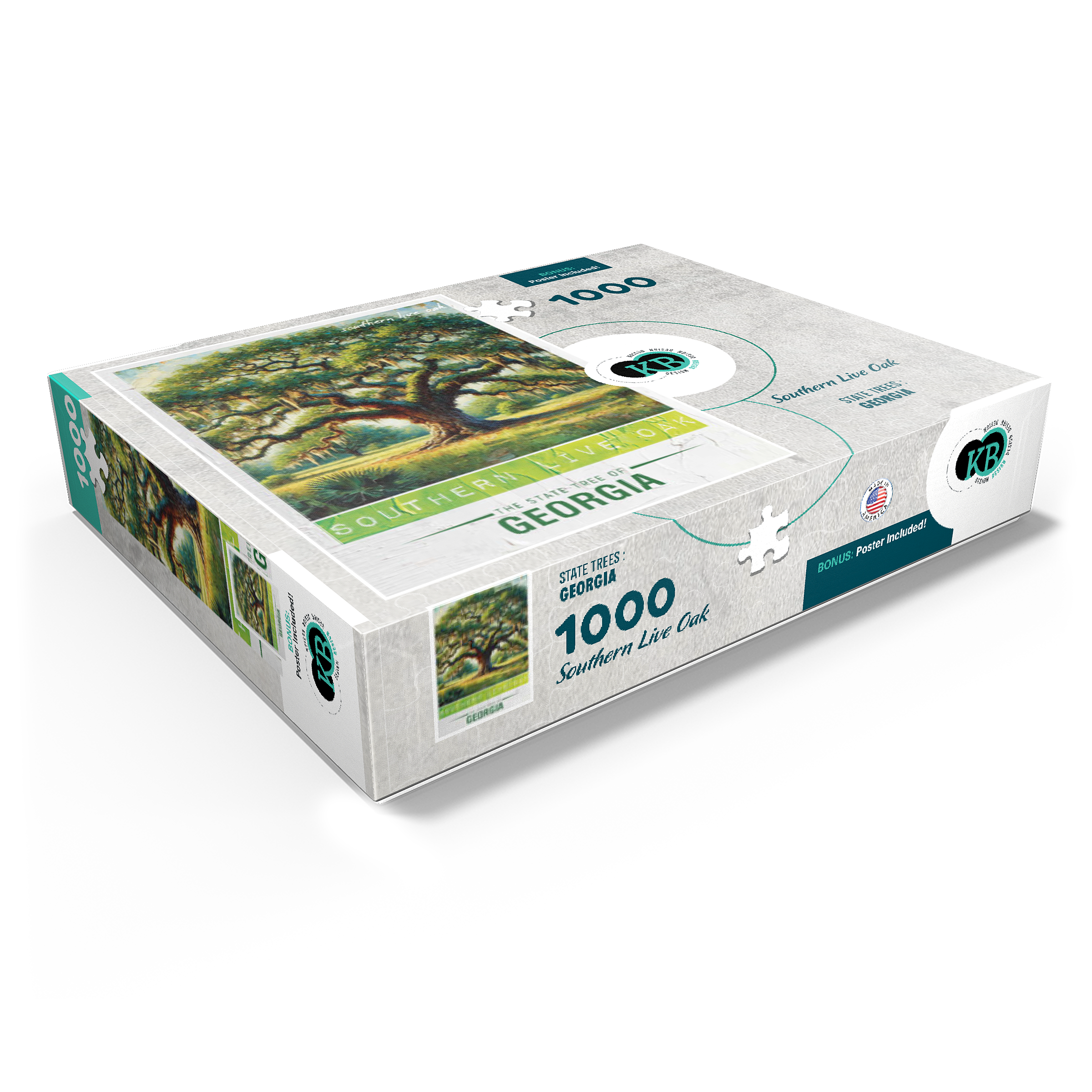 The state tree of Georgia is the live oak (Quercus virginiana), designated in 1937. This majestic tree is known for its sprawling branches, strong wood, and evergreen leaves. It thrives in Georgia's coastal regions and provides vital habitat for wildlife. Historically, live oak wood was used in shipbuilding, including for the USS Constitution, nicknamed -Old Ironsides.- The tree symbolizes strength, resilience, and the beauty of the Southern landscape. The State Trees collection is a unique way to show your state pride! Choose your state, or pick your favorite tree from the collection and watch it come to life. This would make a great gift for a fellow out-of-state puzzle-lover. Go on an 'adventure across the country' and collect them all!