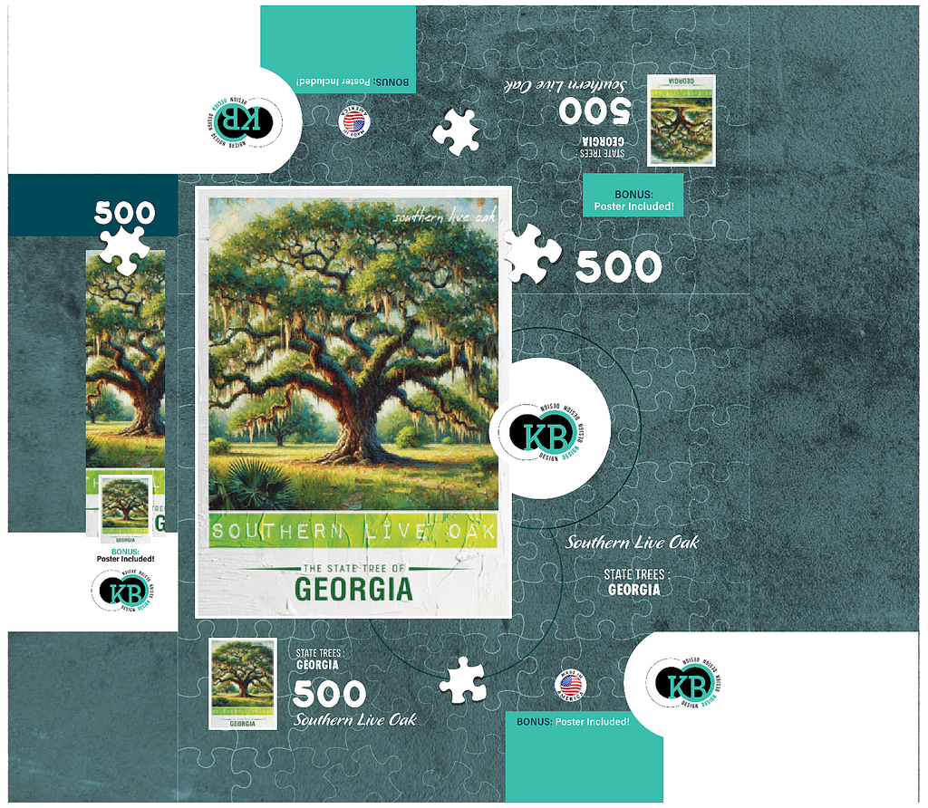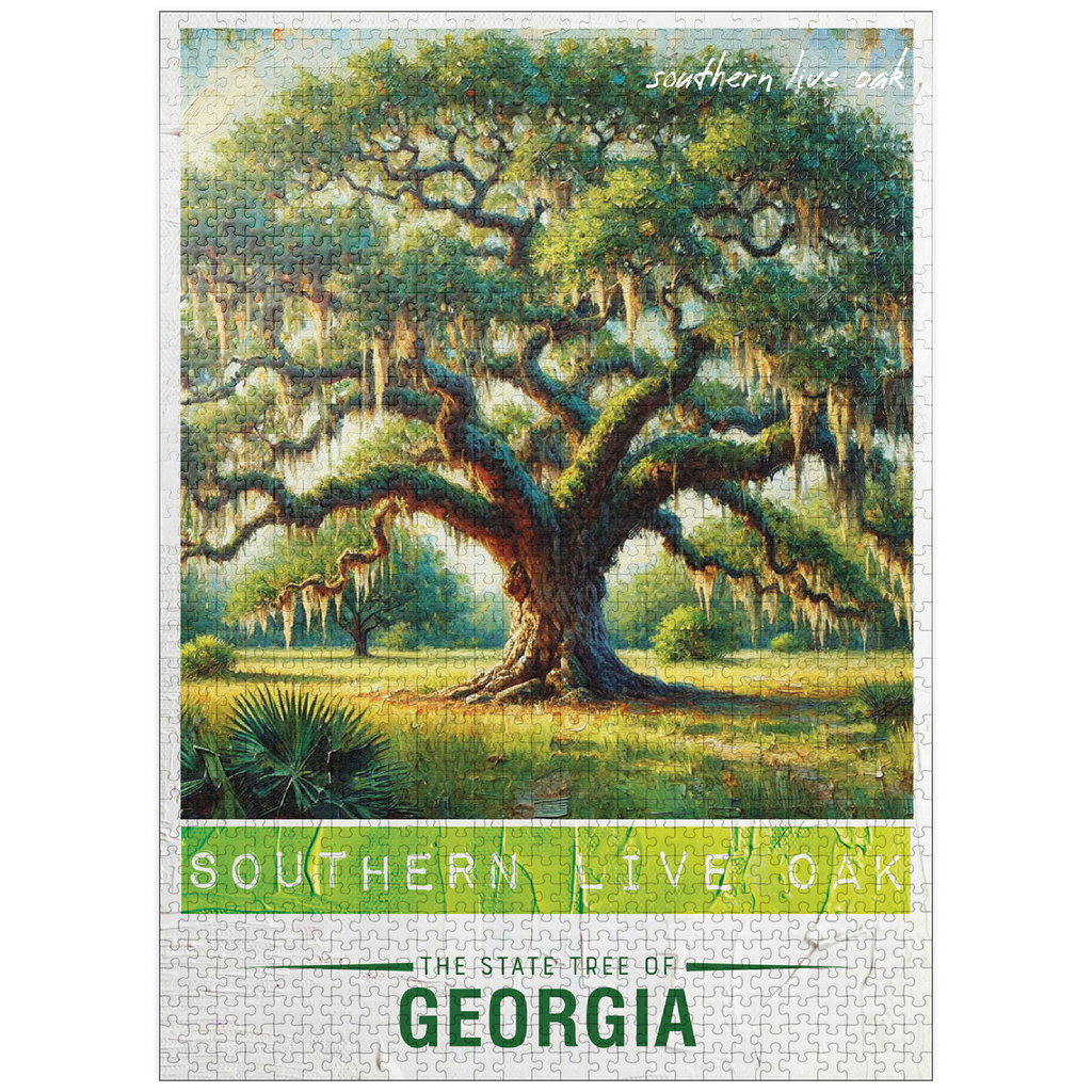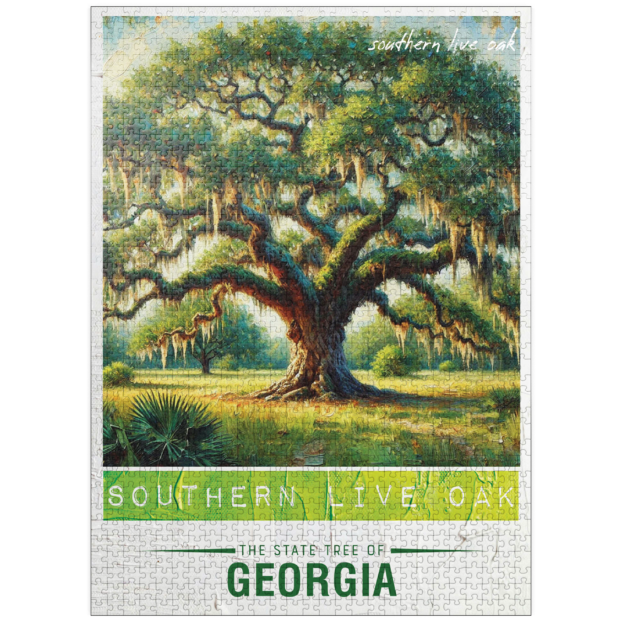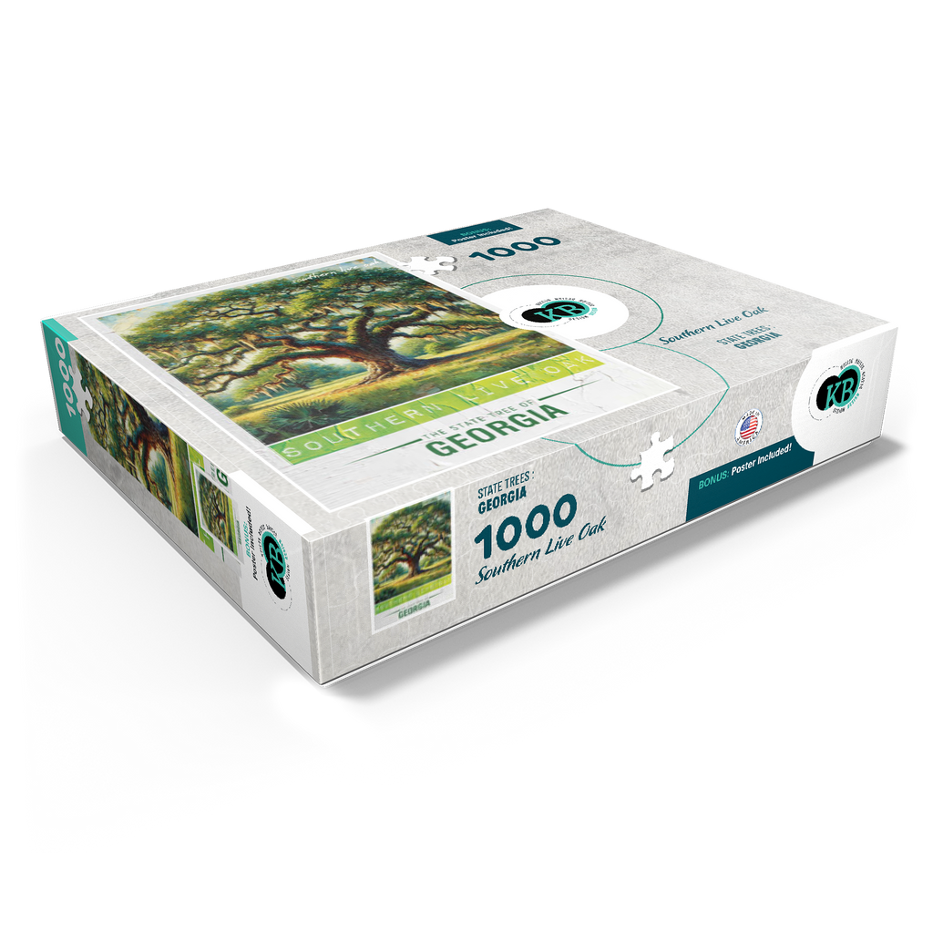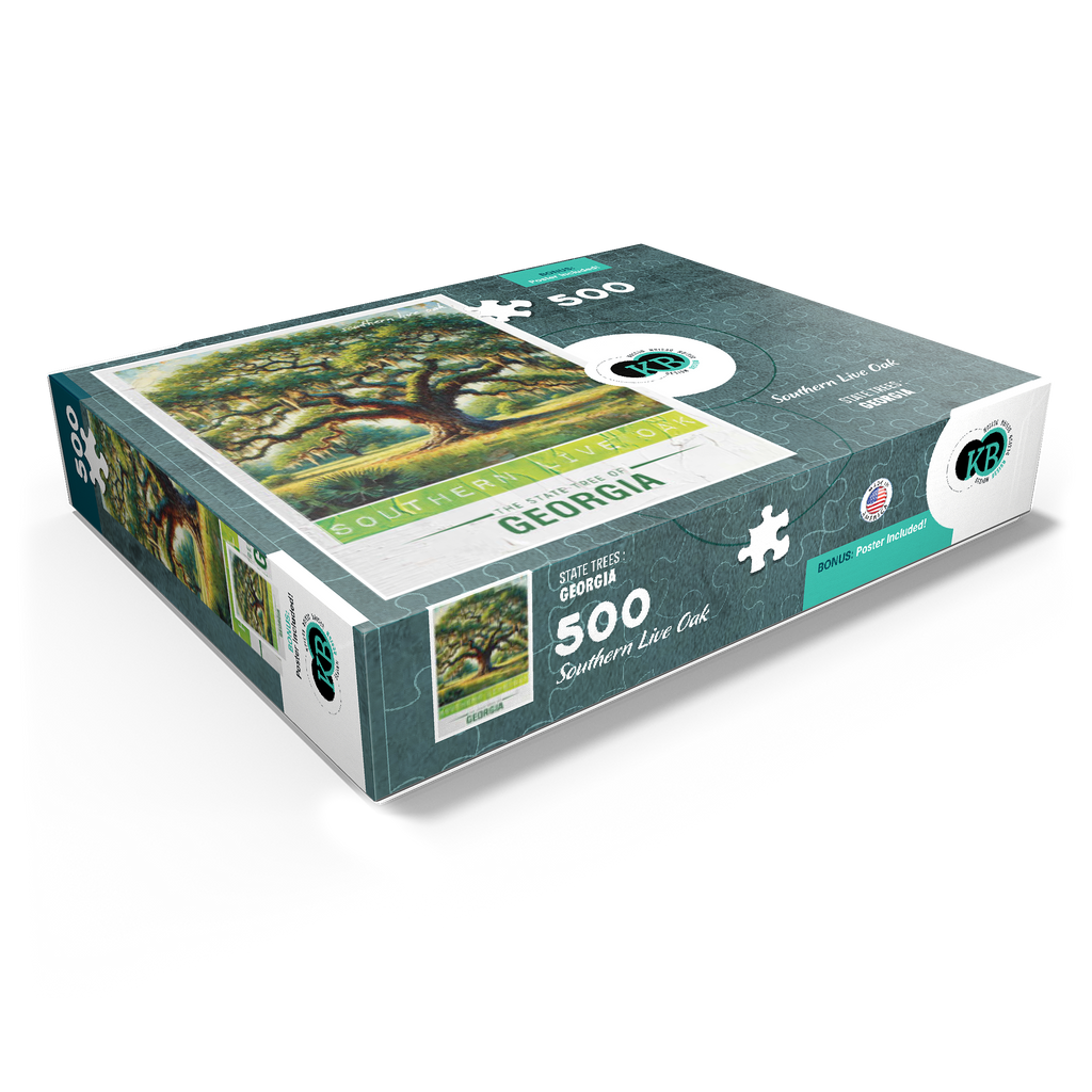 The state tree of Georgia is the live oak (Quercus virginiana), designated in 1937. This majestic tree is known for its sprawling branches, strong wood, and evergreen leaves. It thrives in Georgia's coastal regions and provides vital habitat for wildlife. Historically, live oak wood was used in shipbuilding, including for the USS Constitution, nicknamed -Old Ironsides.- The tree symbolizes strength, resilience, and the beauty of the Southern landscape. The State Trees collection is a unique way to show your state pride! Choose your state, or pick your favorite tree from the collection and watch it come to life. This would make a great gift for a fellow out-of-state puzzle-lover. Go on an 'adventure across the country' and collect them all!