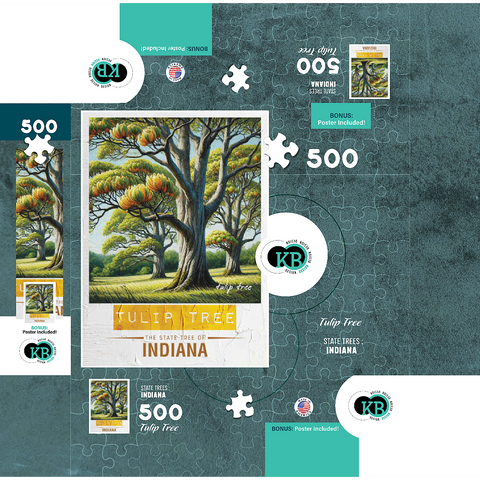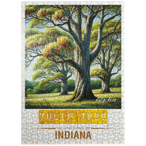 The state tree of Indiana is the tulip tree (Liriodendron tulipifera), also known as the yellow poplar. It was designated as the official state tree in 1931. This tall, fast-growing tree is known for its distinctive tulip-shaped flowers and bright green leaves that turn golden in the fall. Tulip trees provide strong, lightweight wood used in furniture and construction. They are a vital part of Indiana's forests and symbolize growth, resilience, and natural beauty. The State Trees collection is a unique way to show your state pride! Choose your state, or pick your favorite tree from the collection and watch it come to life. This would make a great gift for a fellow out-of-state puzzle-lover. Go on an 'adventure across the country' and collect them all!