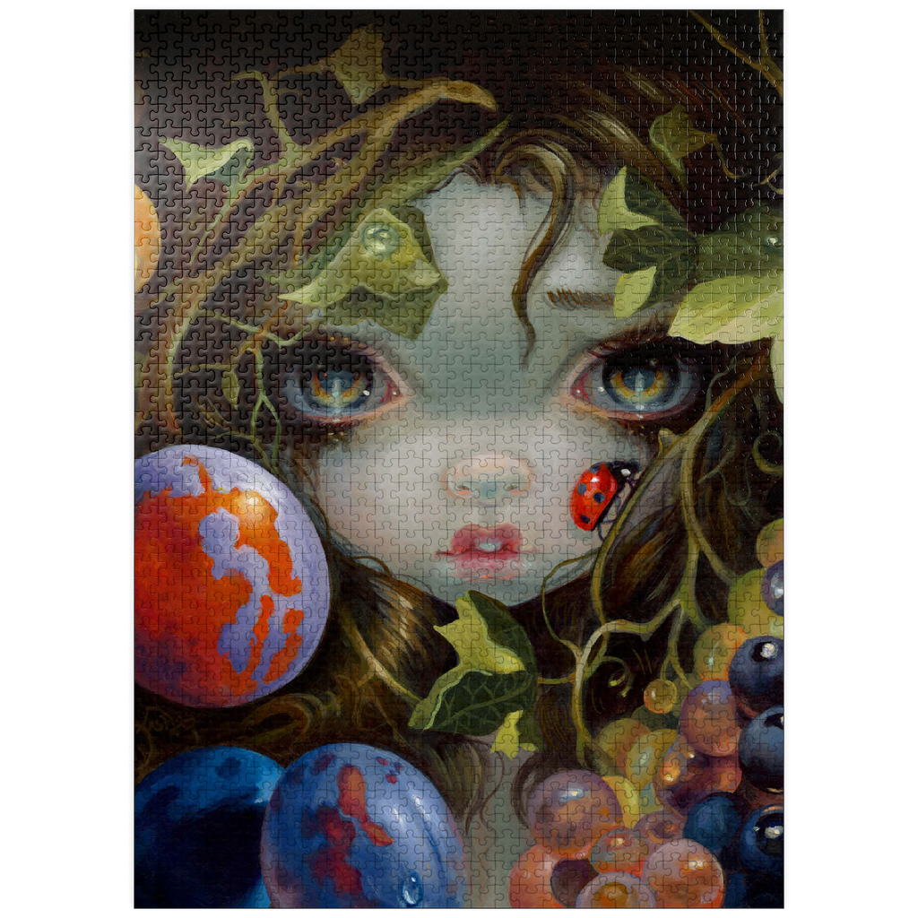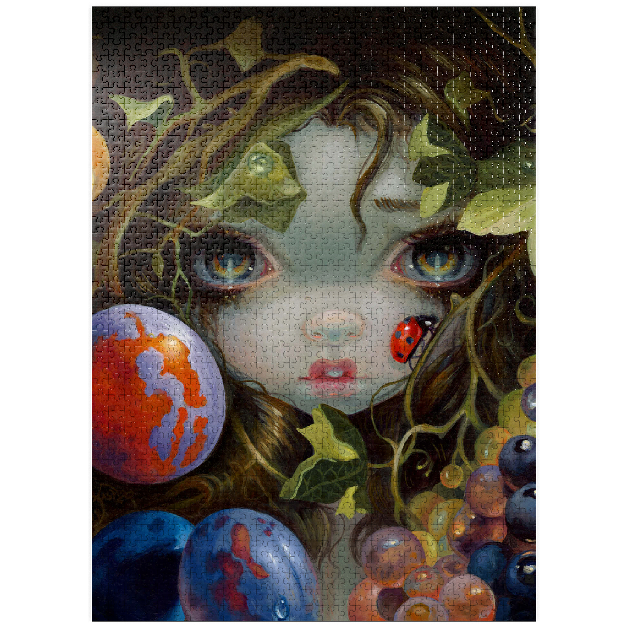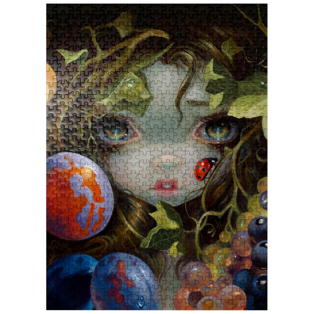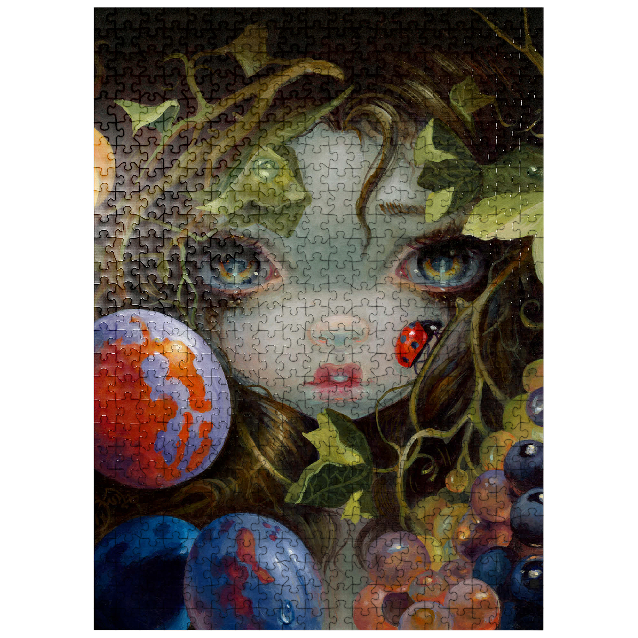 Discover the magic of Stilleven VIII: Lieveheersbeestje, a unique puzzle inspired by Dutch Master still life paintings (1500s-1600s). This artwork -deconstructs- classic elements-beautiful leaves, fruit, and a ladybug (Lieveheersbeestje)-blended with lovely girls, fairies, and nymphs. Bring this captivating blend of historical art and fantasy, which means -Still Life- (Stilleven) in Dutch, to life piece by piece.