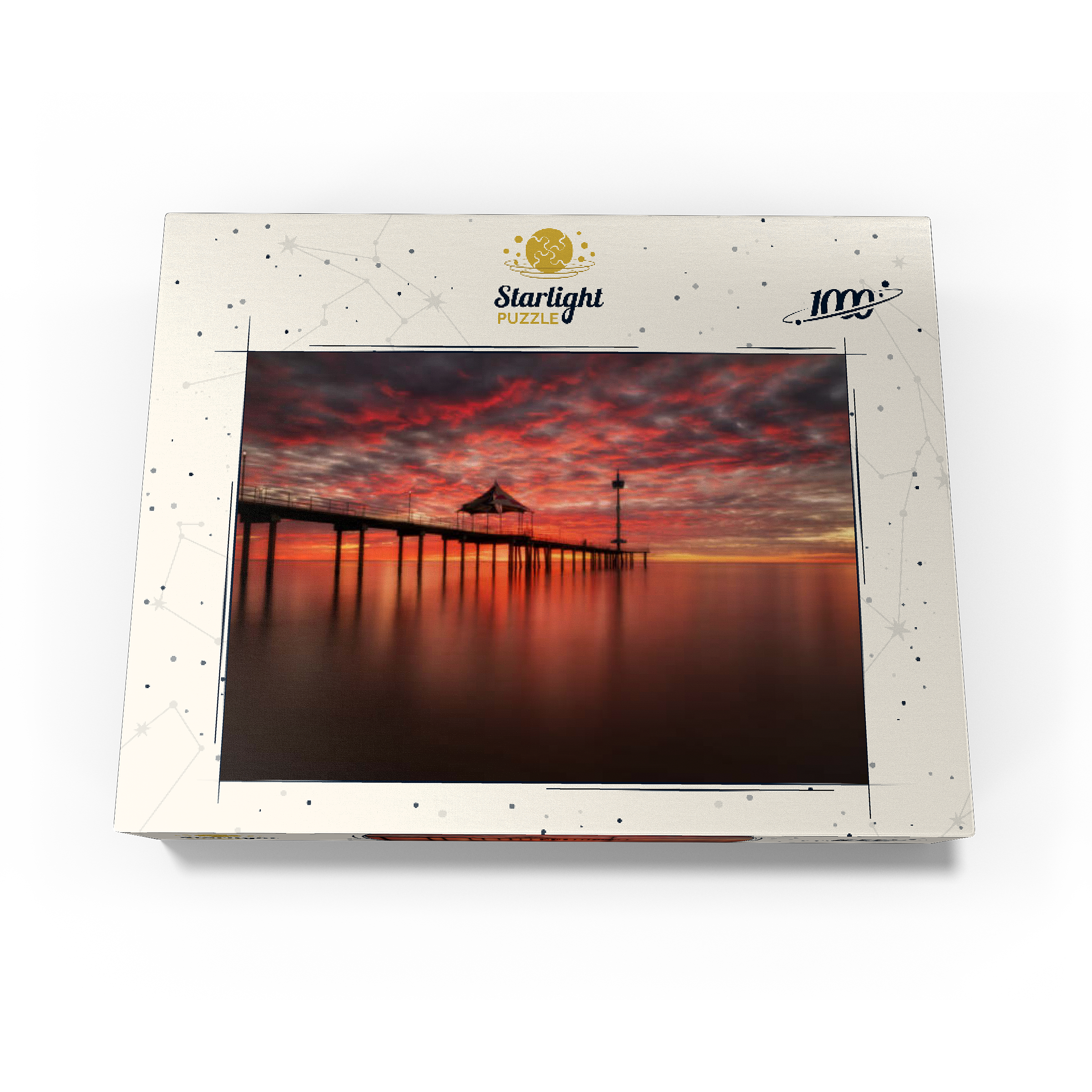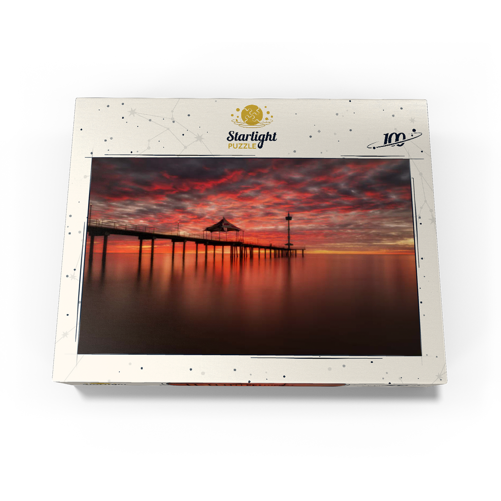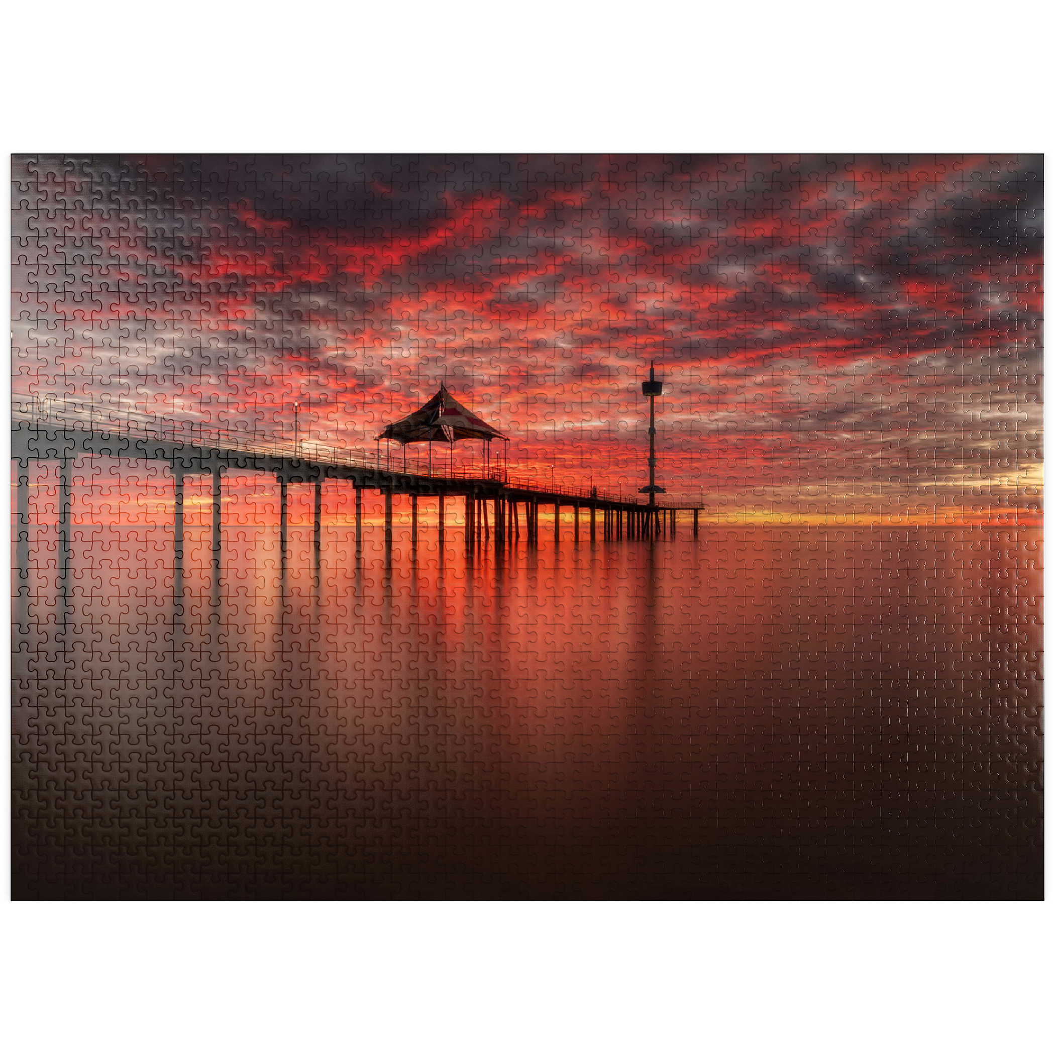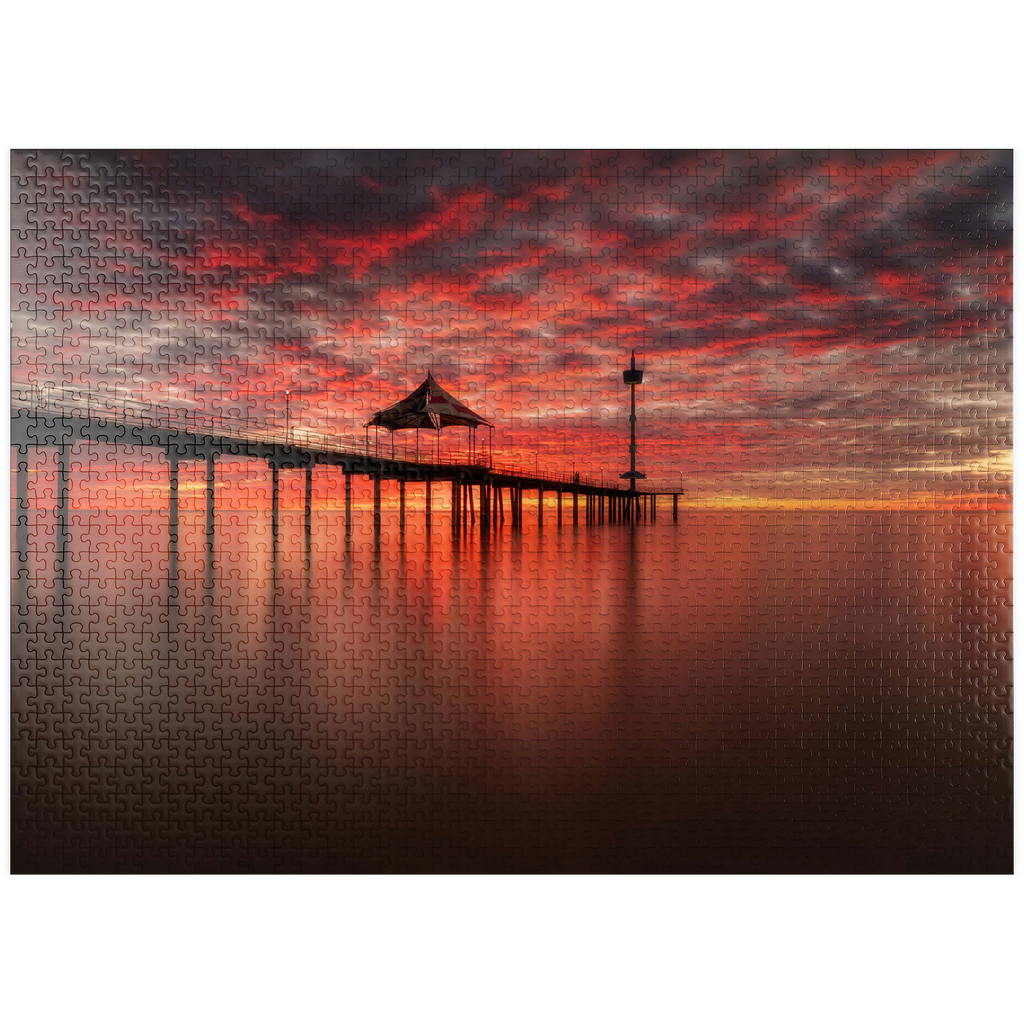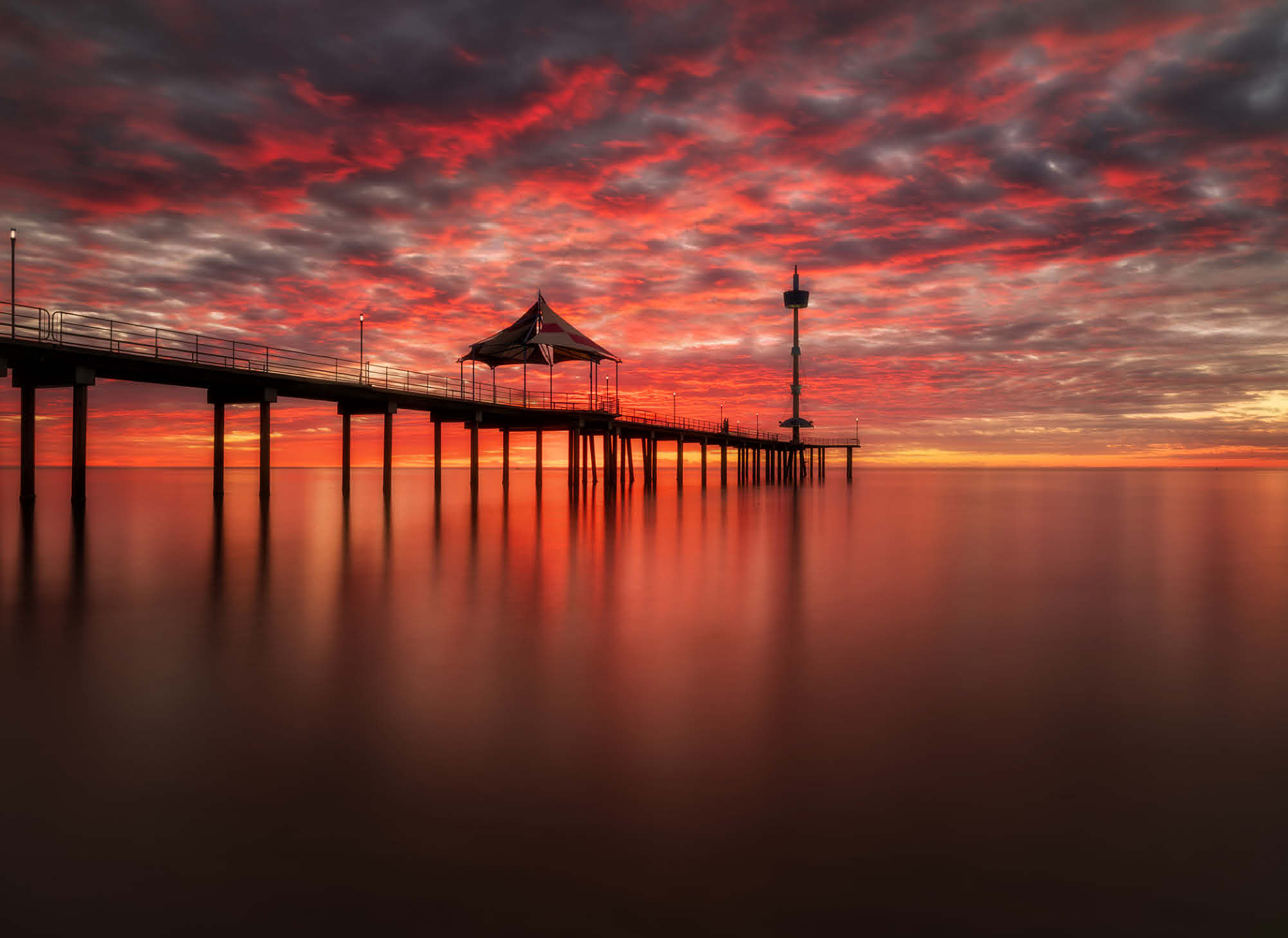 Brighton Jetty in South Australia offers a stunning view of the sunset, with vibrant hues of red, orange, and purple reflecting across the calm waters. The long pier, extending into the Gulf St Vincent, provides a perfect silhouette against the dramatic sky. Popular among locals and tourists, the jetty is a favored spot for leisurely walks, fishing, and photography. The unique pavilion and beacon structure add character to the scene, creating an idyllic coastal atmosphere that captures the essence of a serene Australian evening.
