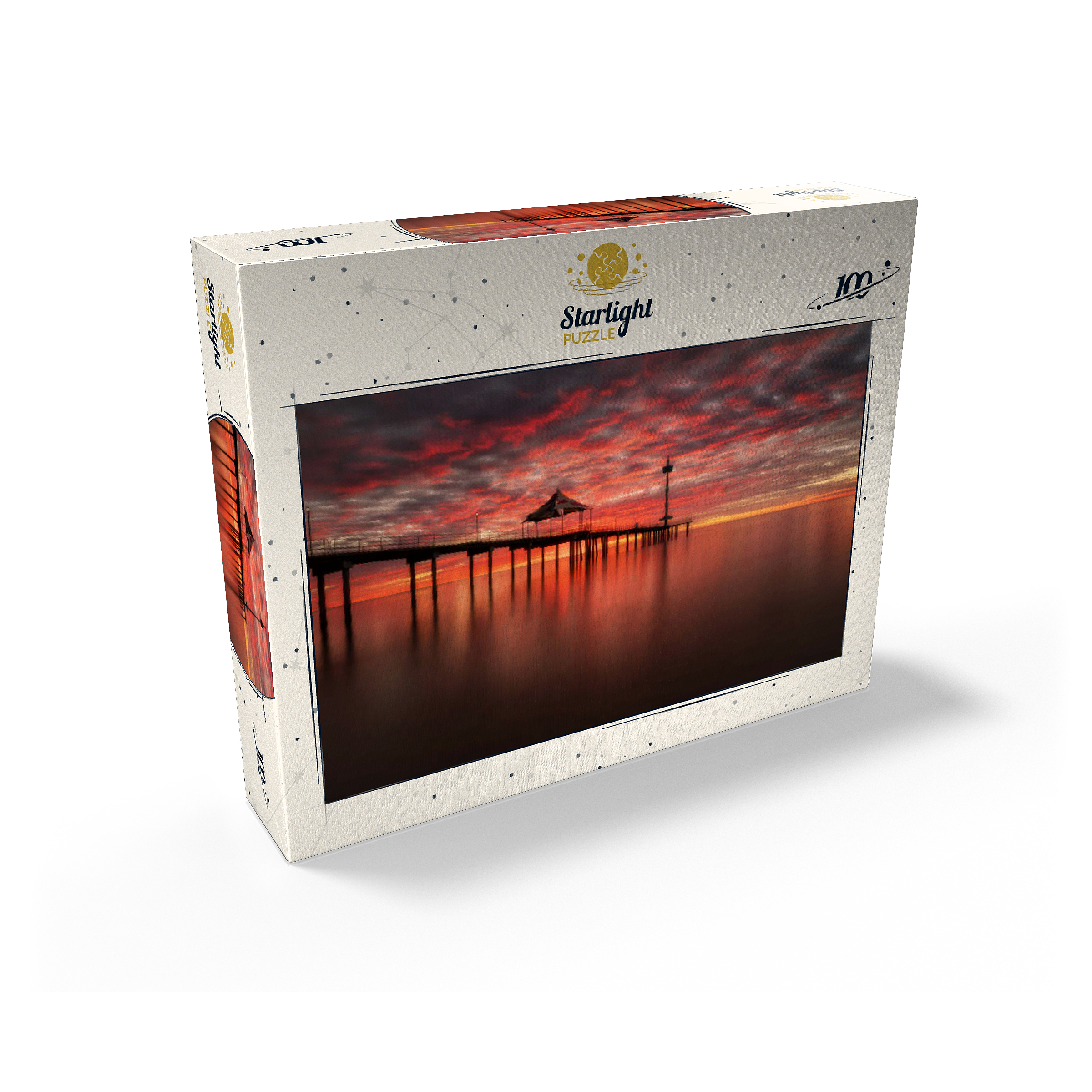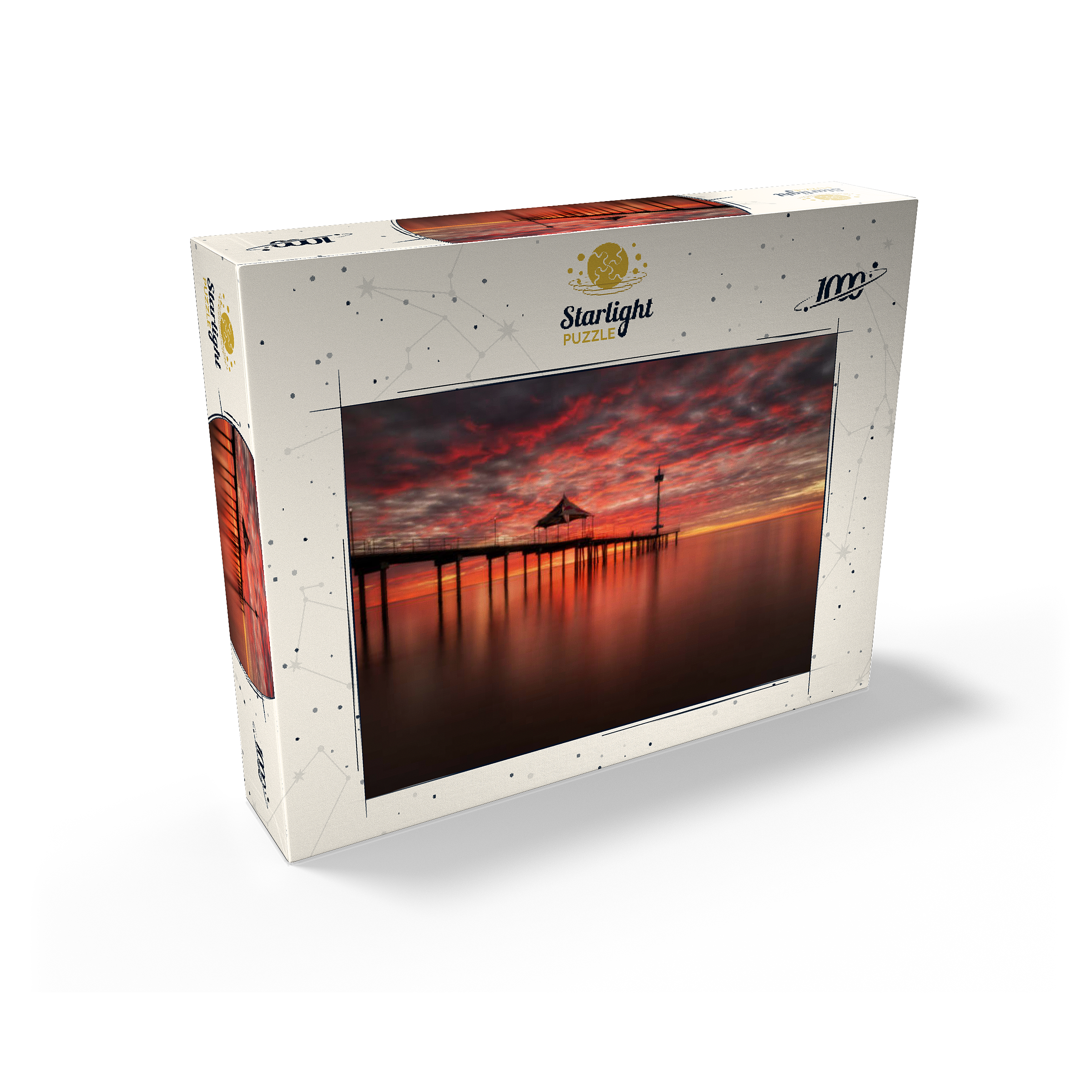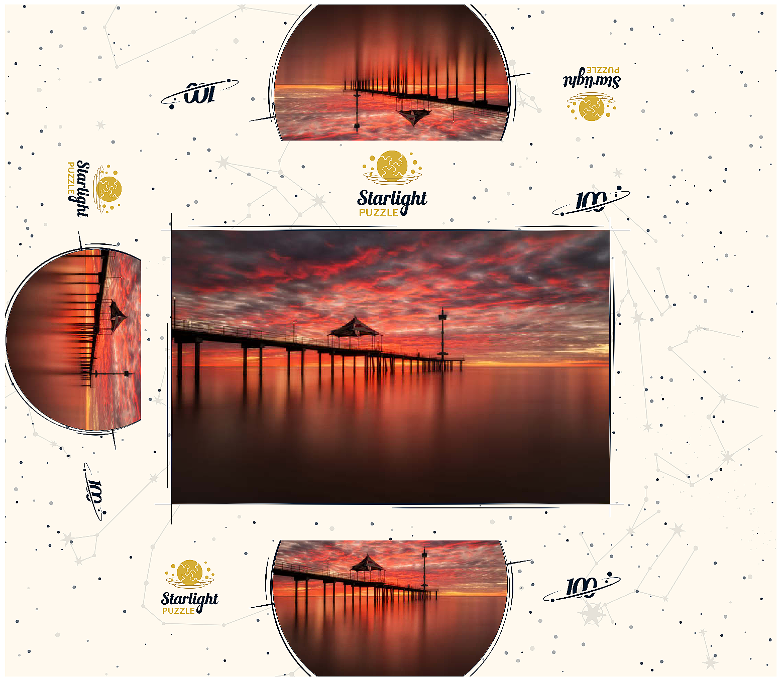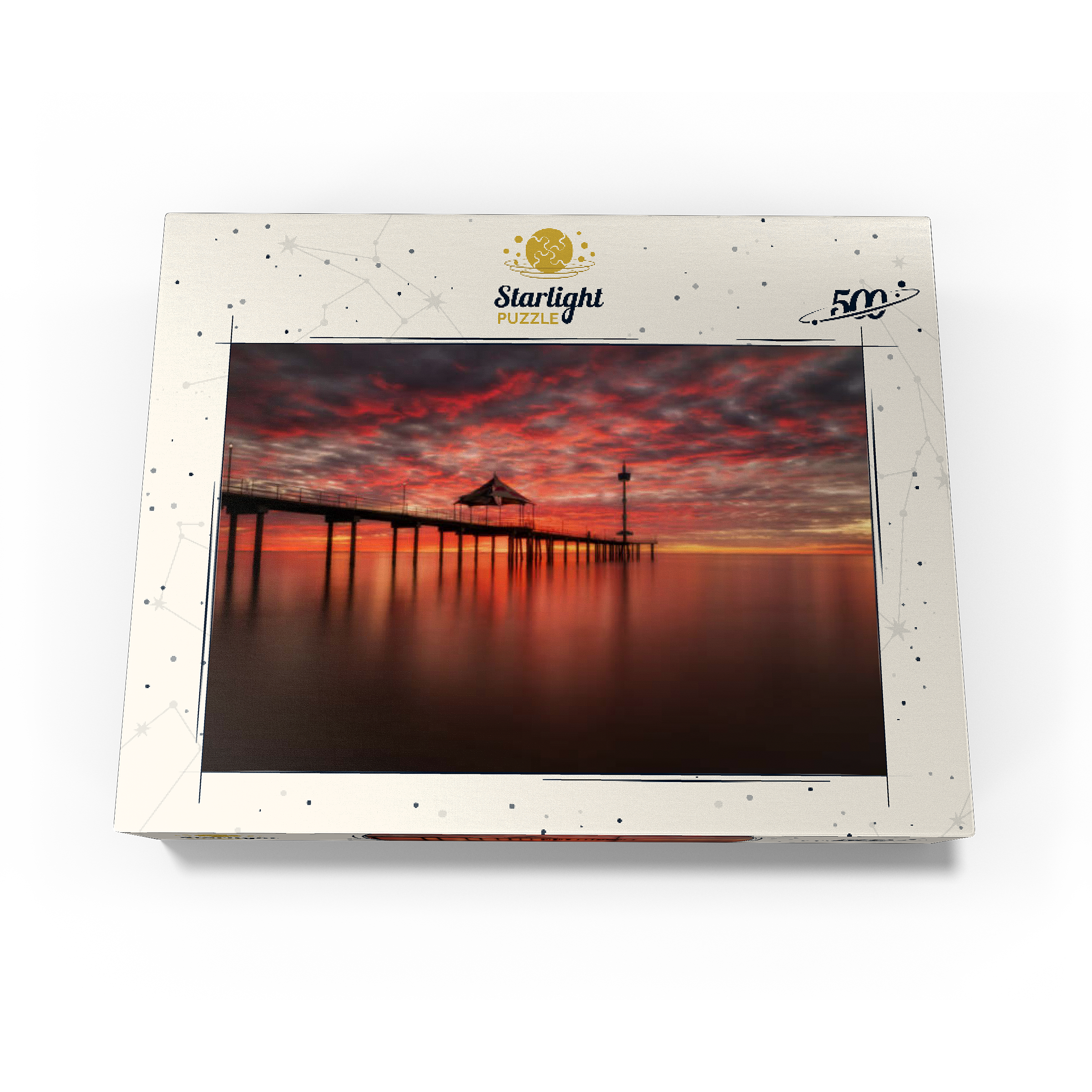 Brighton Jetty in South Australia offers a stunning view of the sunset, with vibrant hues of red, orange, and purple reflecting across the calm waters. The long pier, extending into the Gulf St Vincent, provides a perfect silhouette against the dramatic sky. Popular among locals and tourists, the jetty is a favored spot for leisurely walks, fishing, and photography. The unique pavilion and beacon structure add character to the scene, creating an idyllic coastal atmosphere that captures the essence of a serene Australian evening.