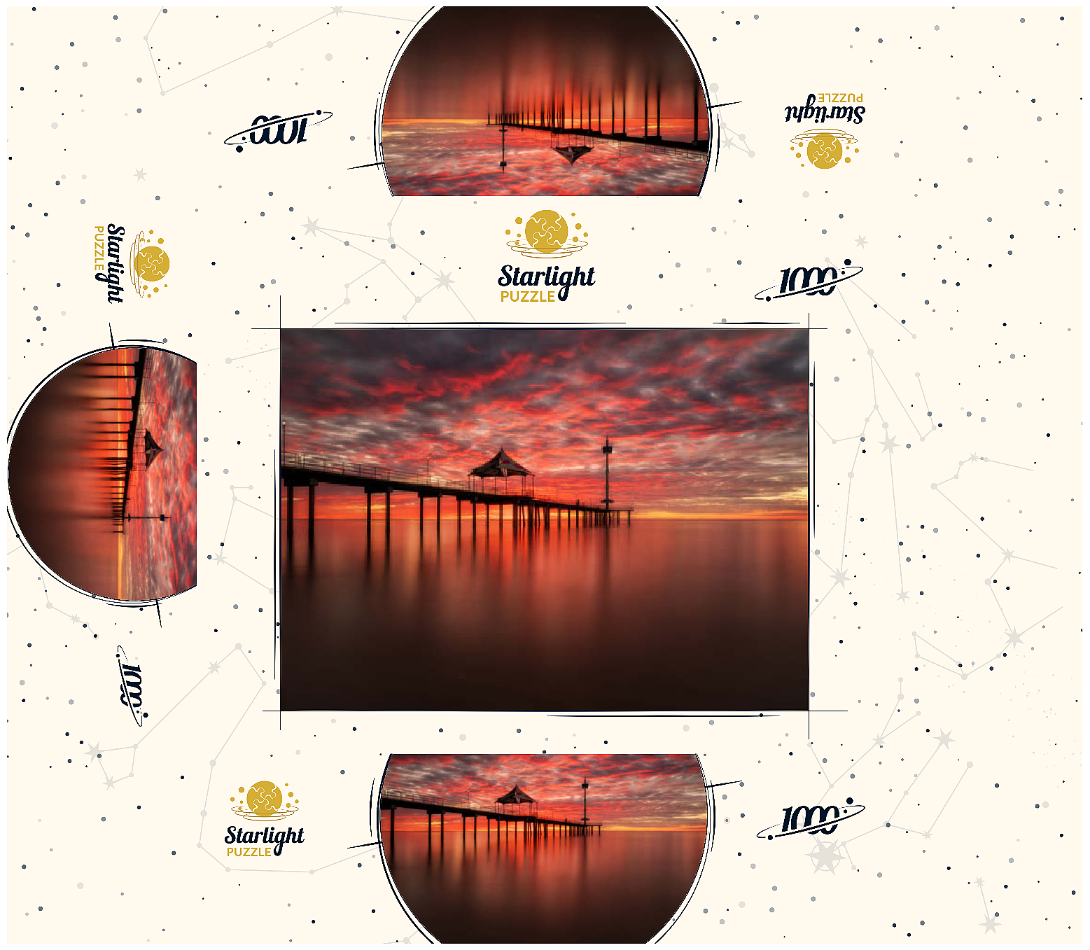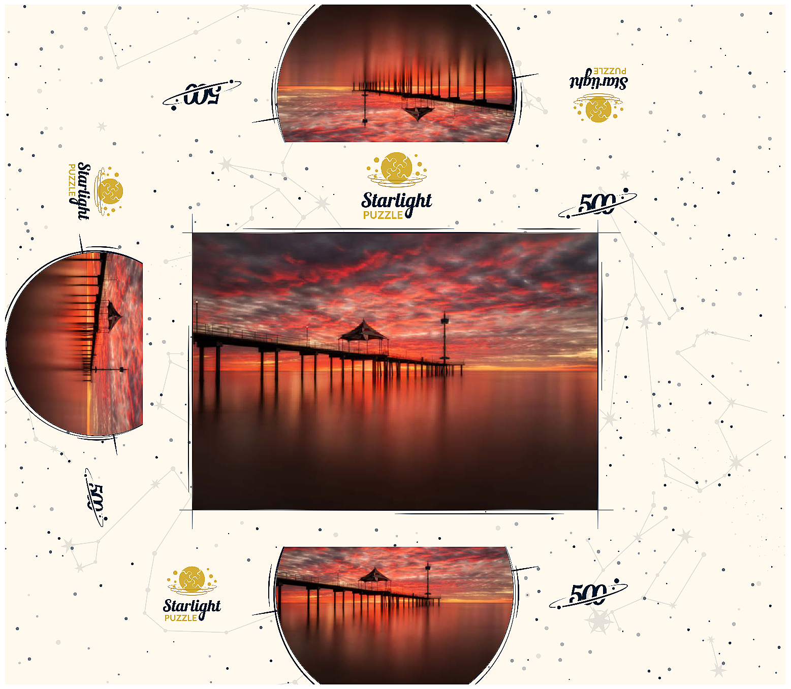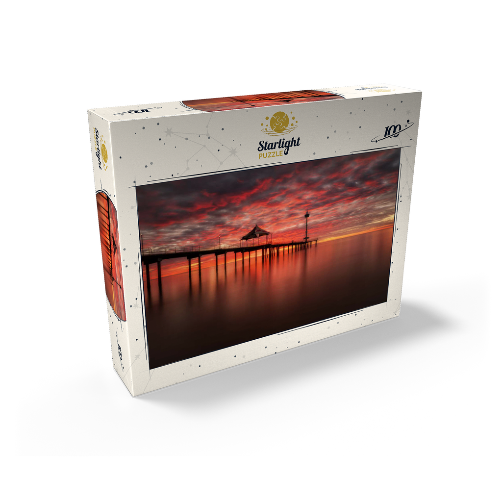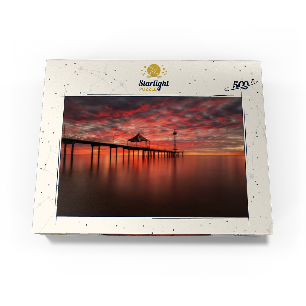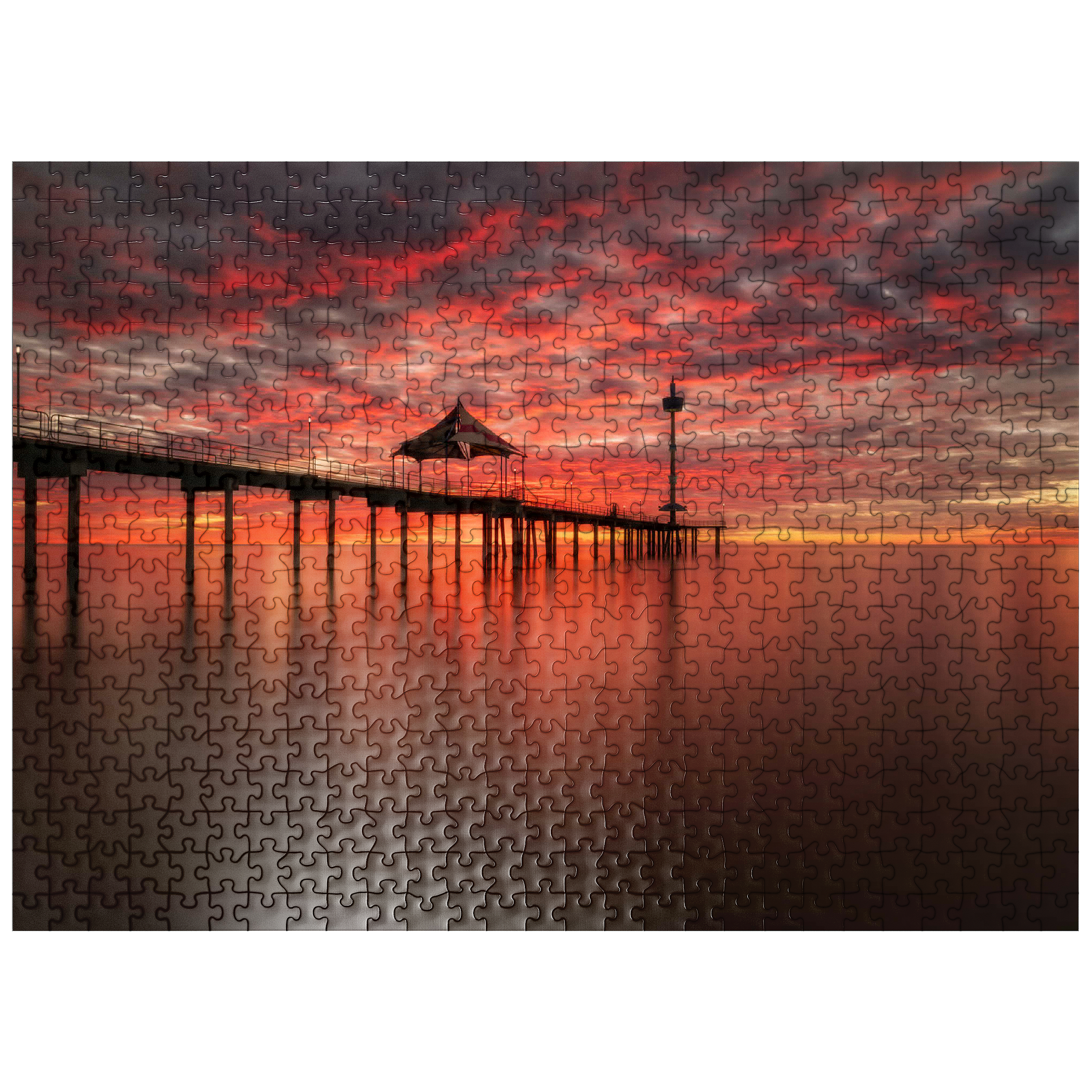 Brighton Jetty in South Australia offers a stunning view of the sunset, with vibrant hues of red, orange, and purple reflecting across the calm waters. The long pier, extending into the Gulf St Vincent, provides a perfect silhouette against the dramatic sky. Popular among locals and tourists, the jetty is a favored spot for leisurely walks, fishing, and photography. The unique pavilion and beacon structure add character to the scene, creating an idyllic coastal atmosphere that captures the essence of a serene Australian evening.
