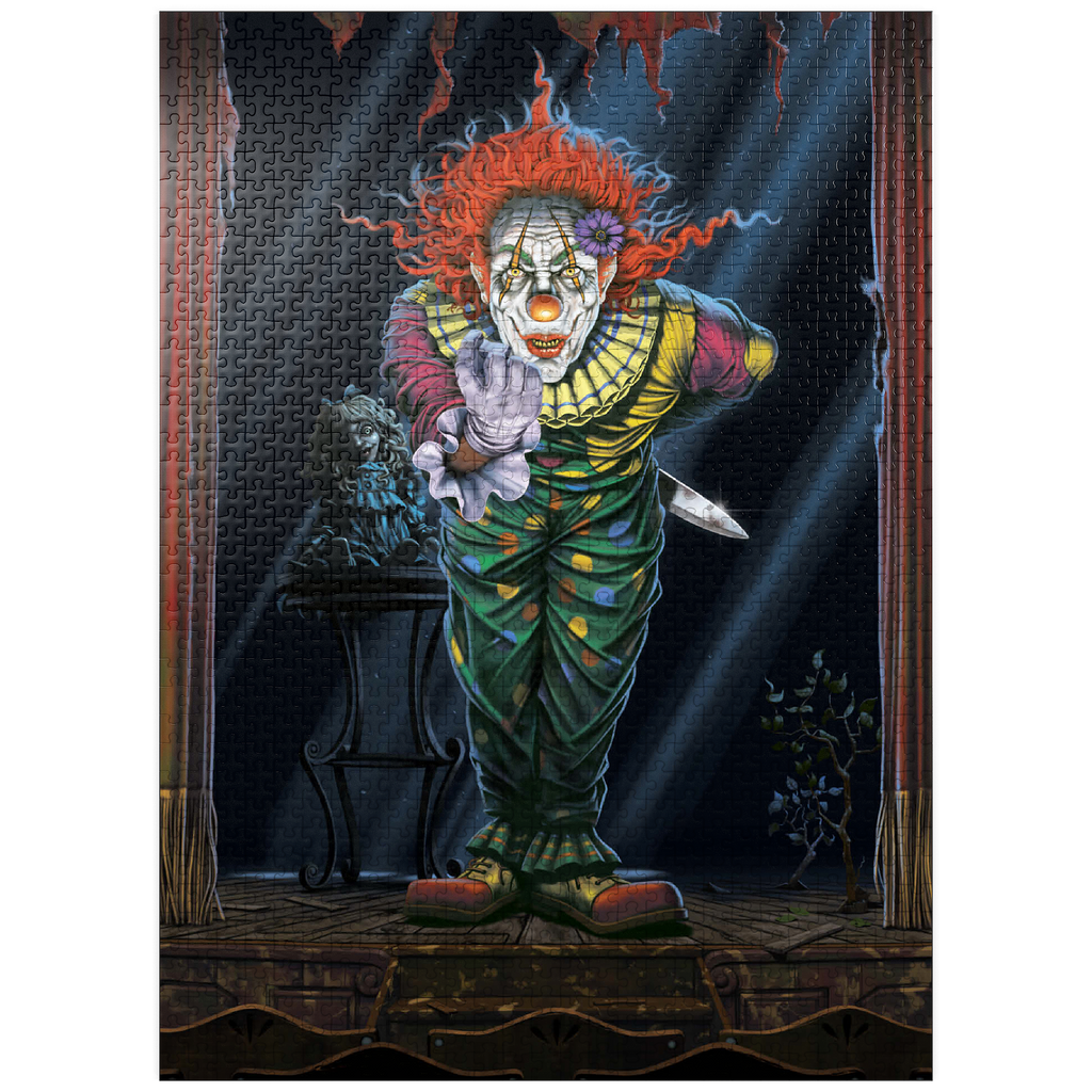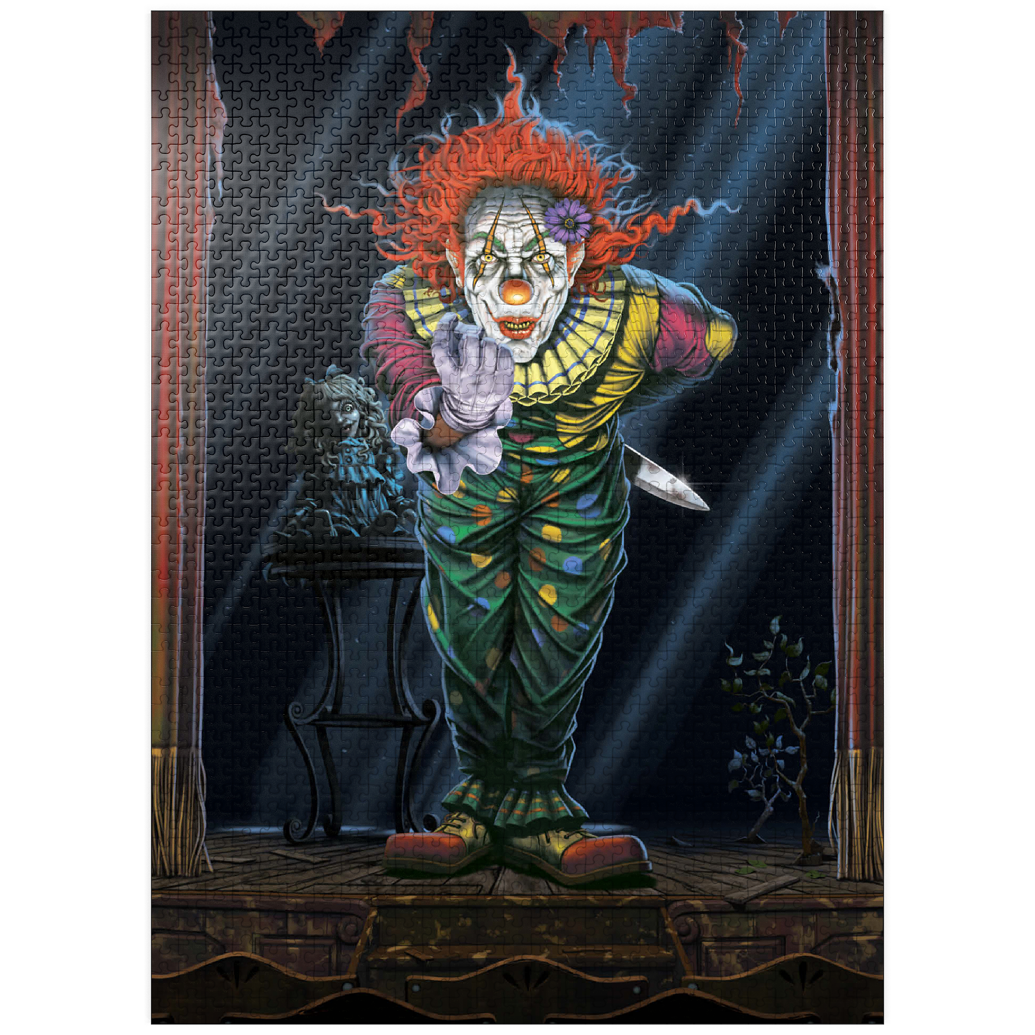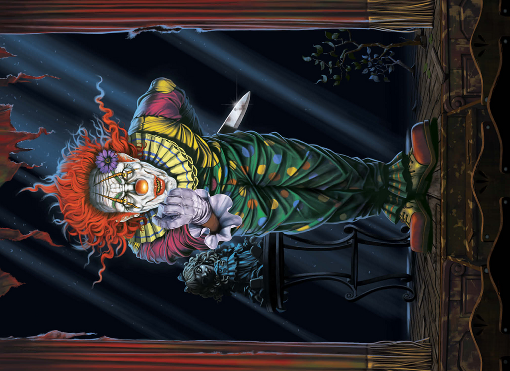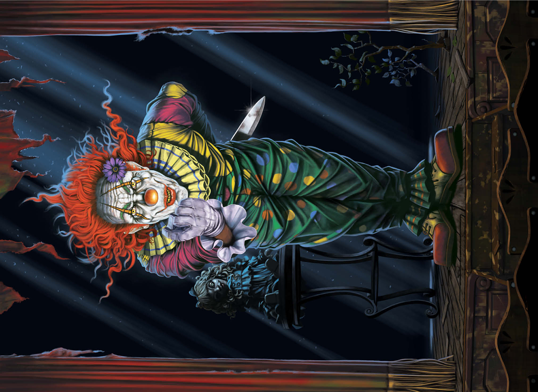 The image depicts a sinister clown standing center stage in a dilapidated theater. The clown has bright red hair, menacing makeup, and is holding a knife. A creepy doll sits on a small stand to the clown's left. The overall mood is dark, eerie, and unsettling