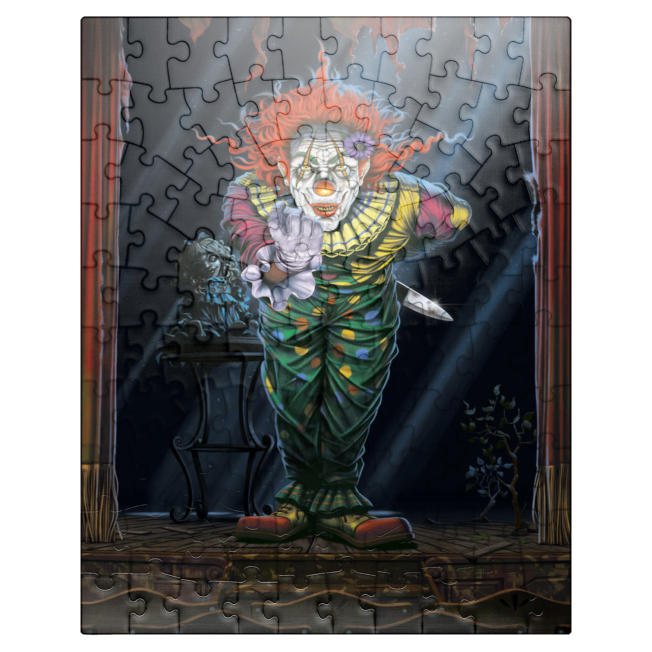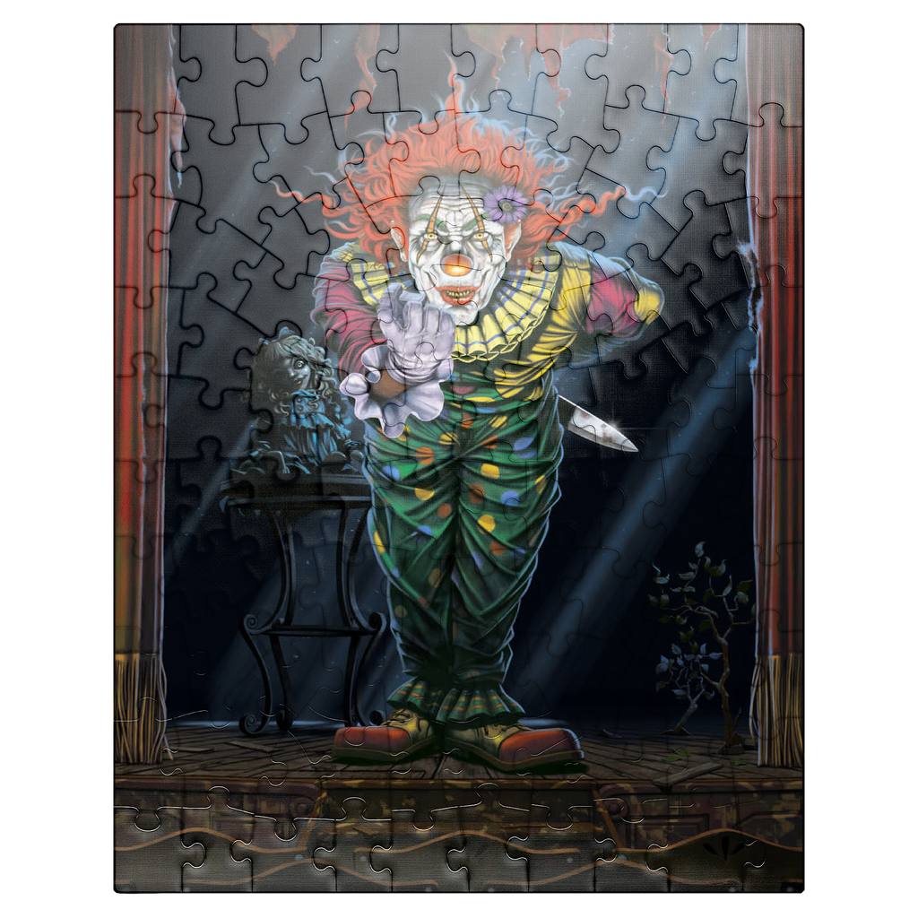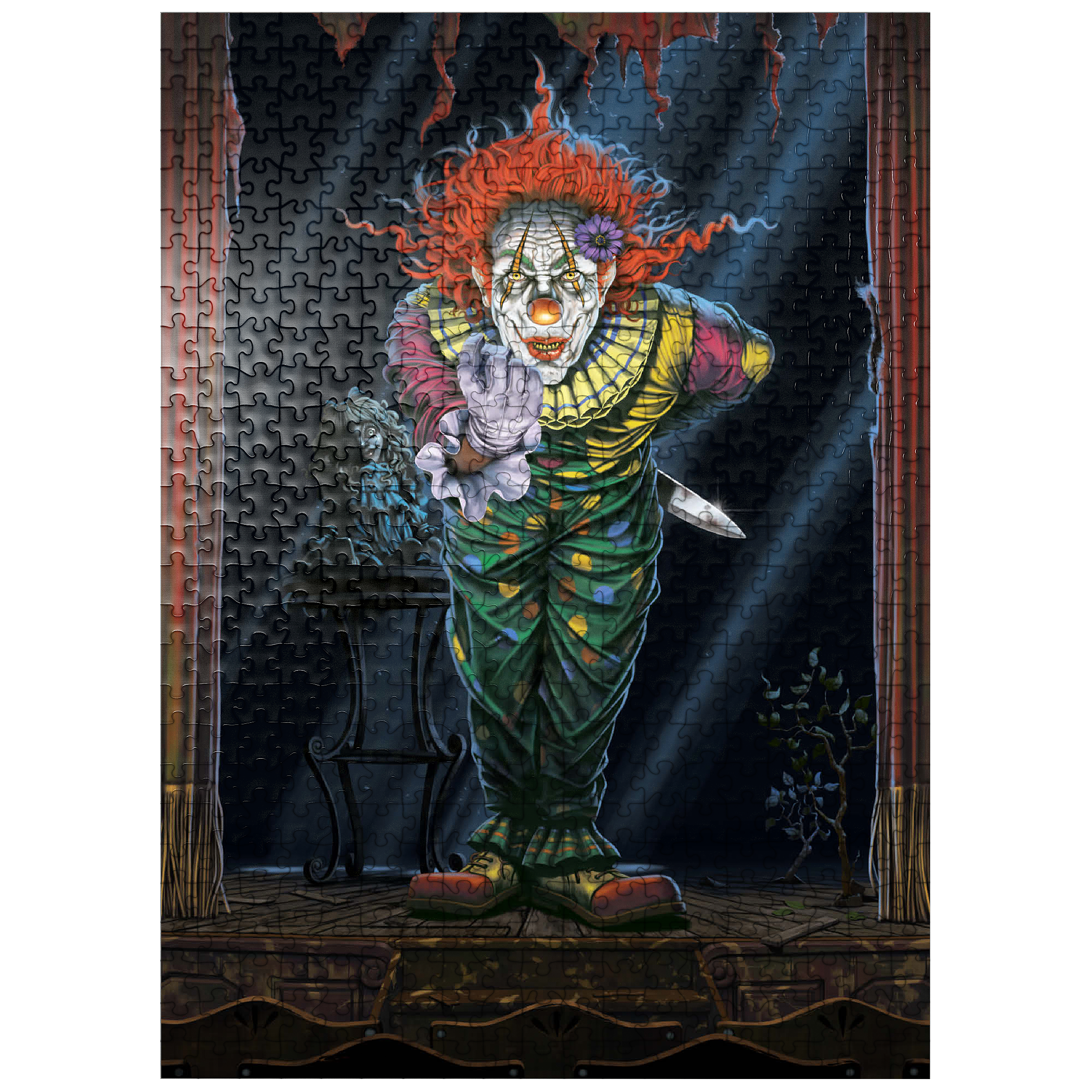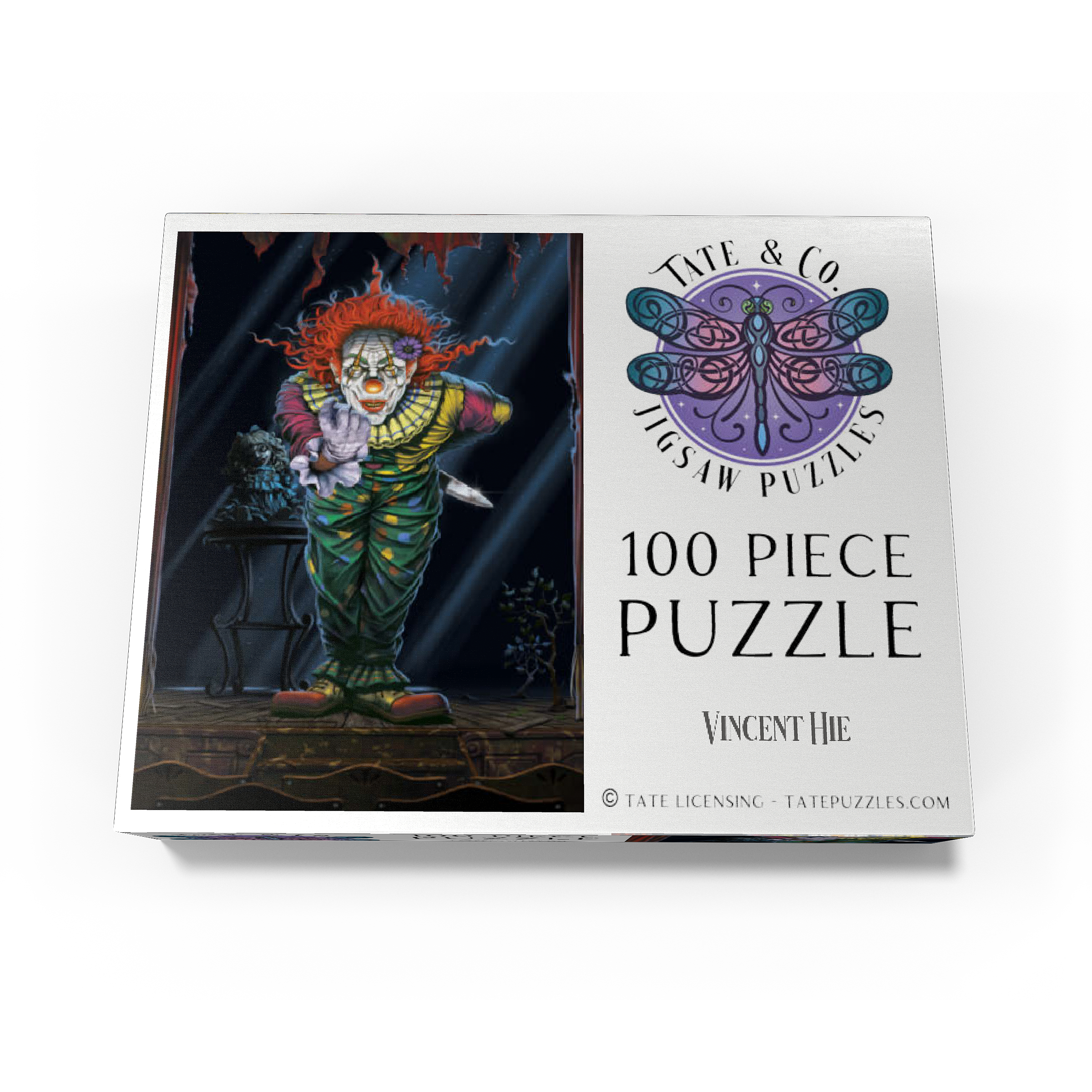 The image depicts a sinister clown standing center stage in a dilapidated theater. The clown has bright red hair, menacing makeup, and is holding a knife. A creepy doll sits on a small stand to the clown's left. The overall mood is dark, eerie, and unsettling