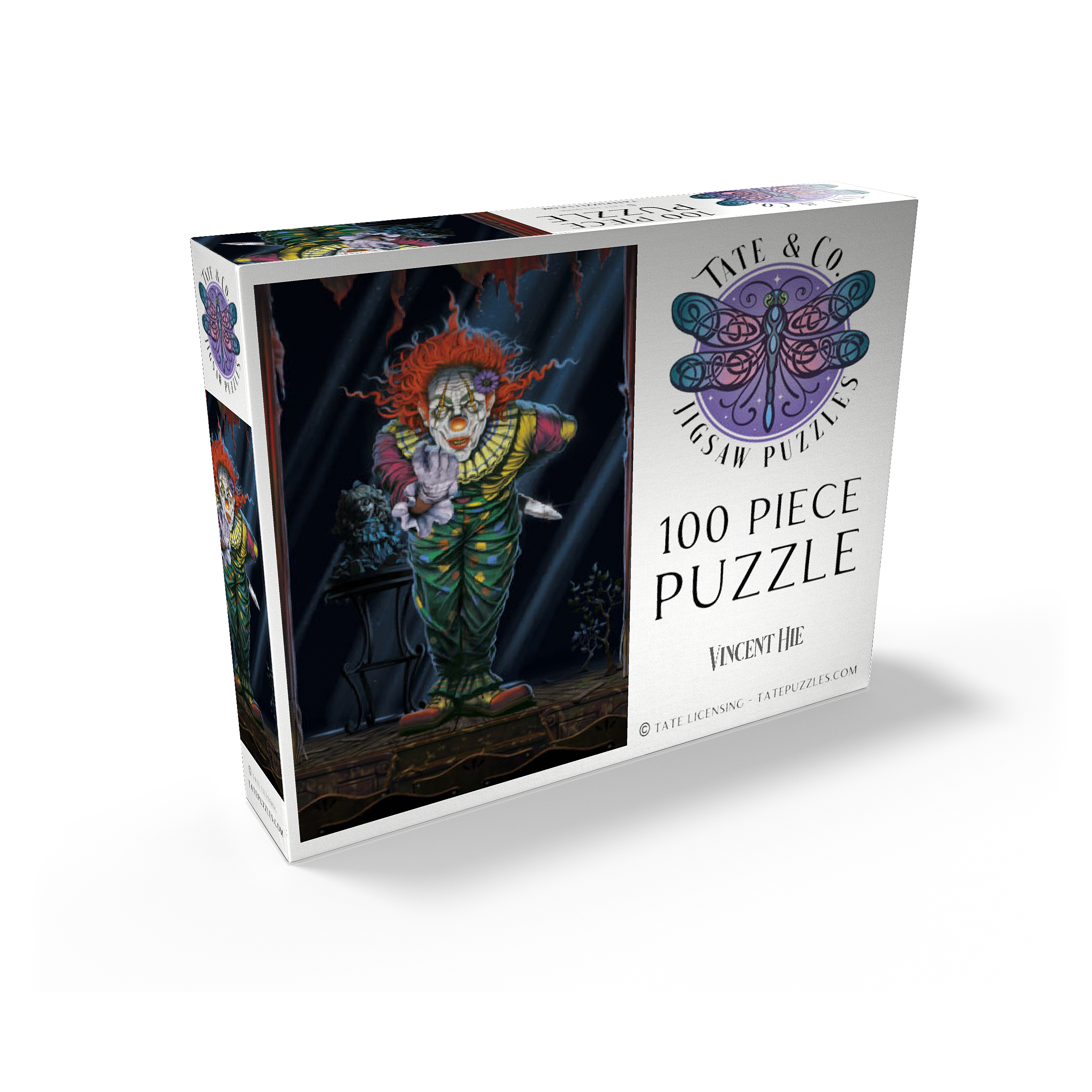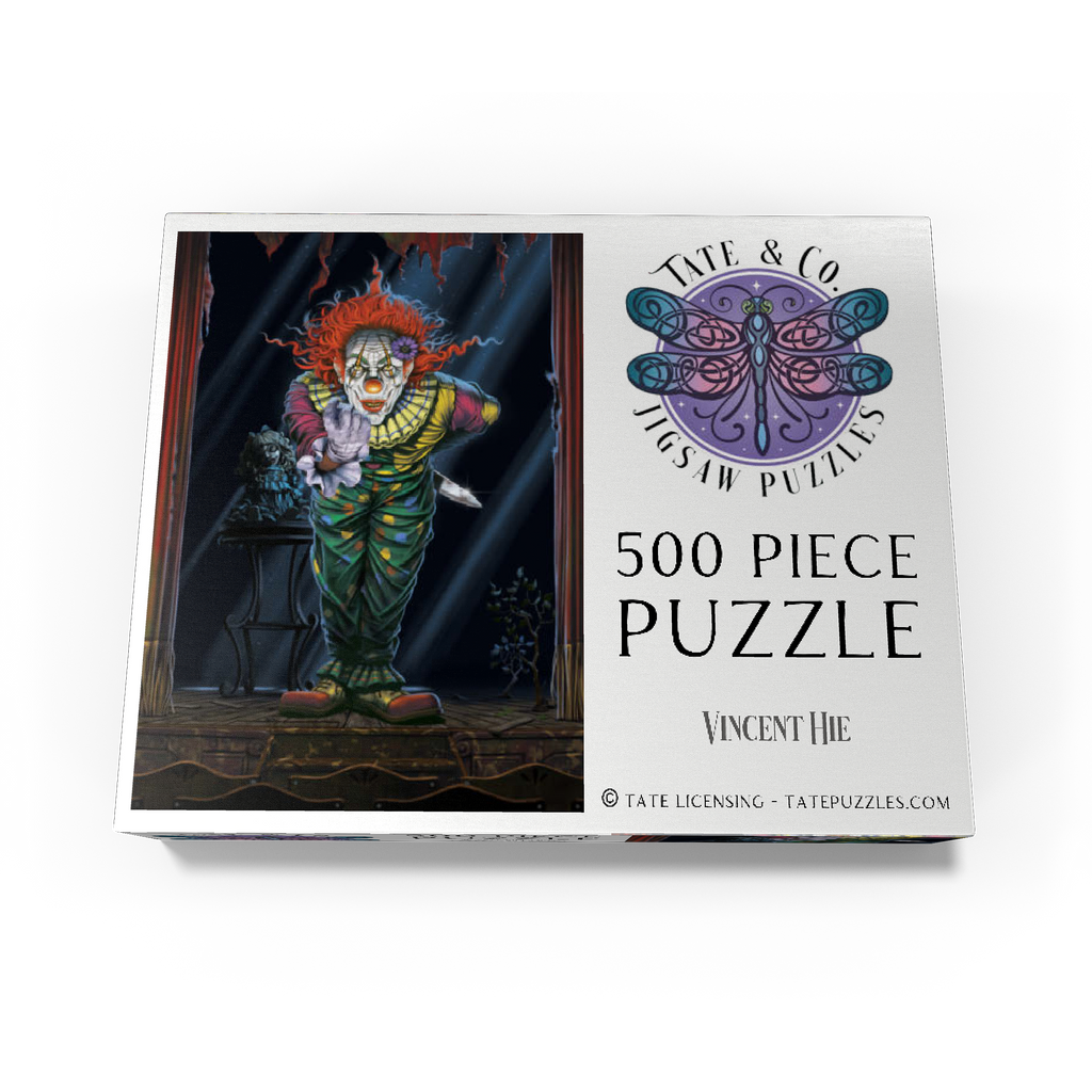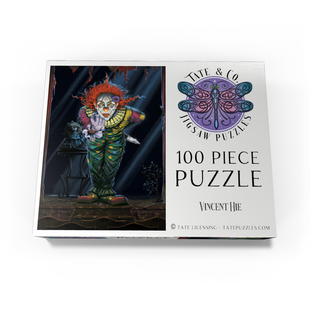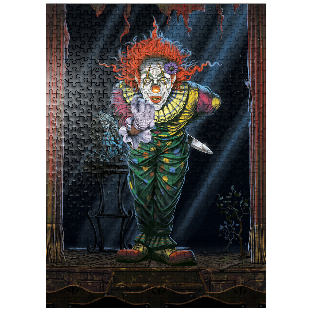 The image depicts a sinister clown standing center stage in a dilapidated theater. The clown has bright red hair, menacing makeup, and is holding a knife. A creepy doll sits on a small stand to the clown's left. The overall mood is dark, eerie, and unsettling