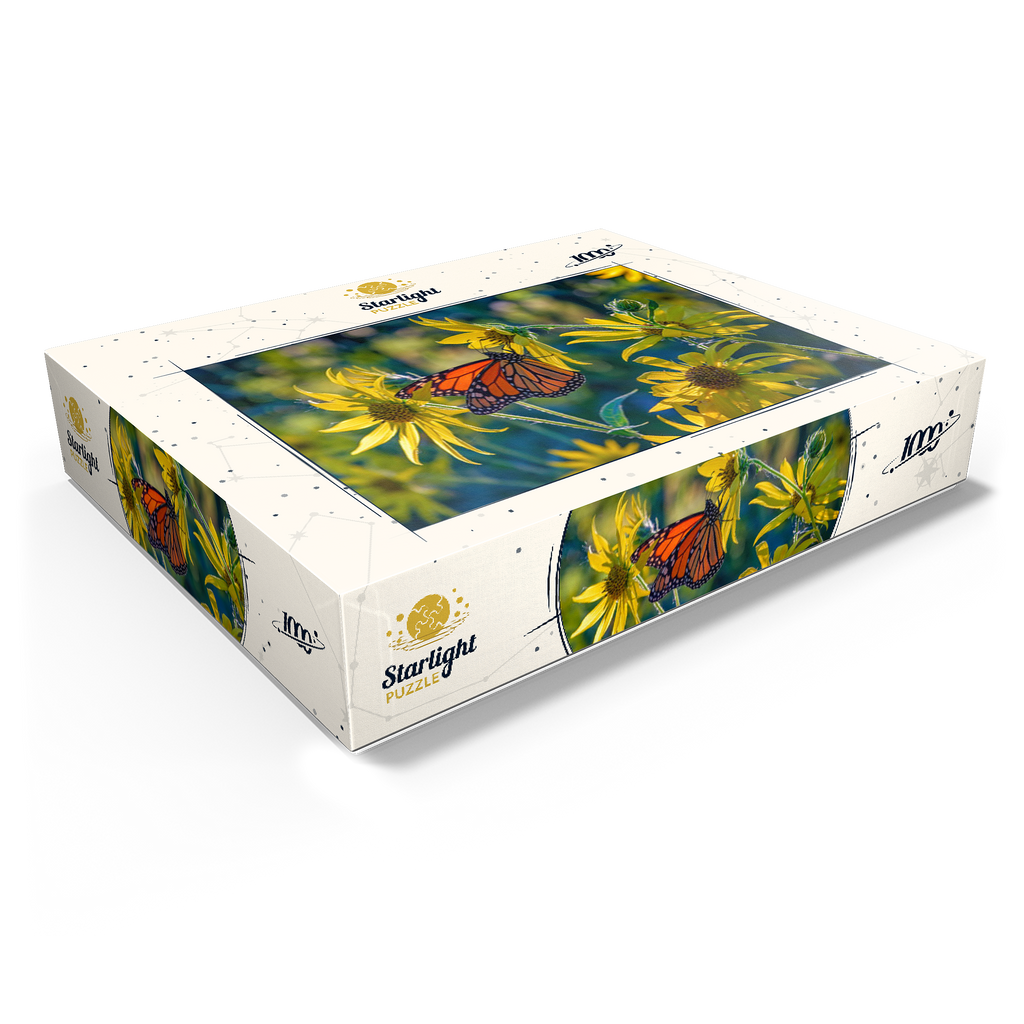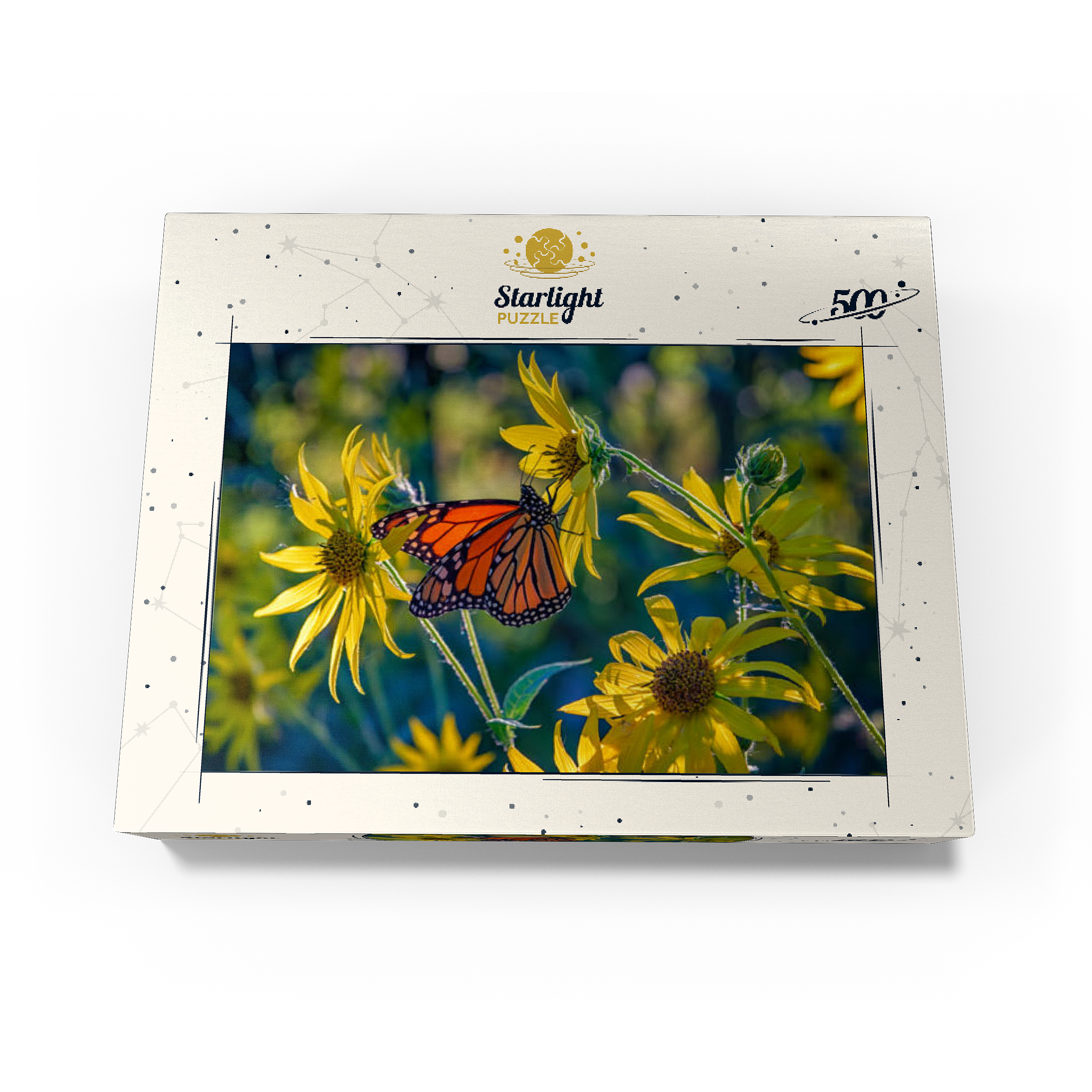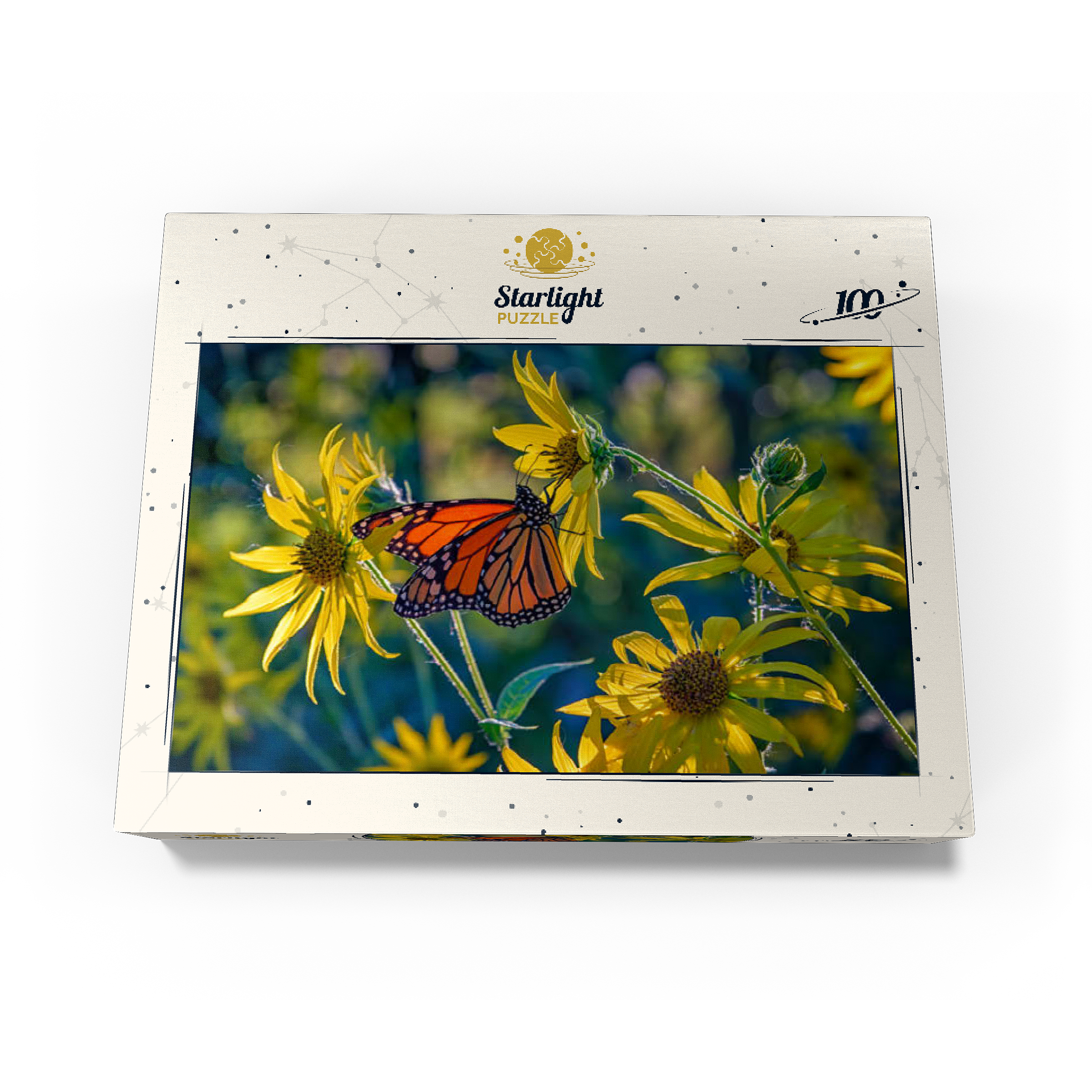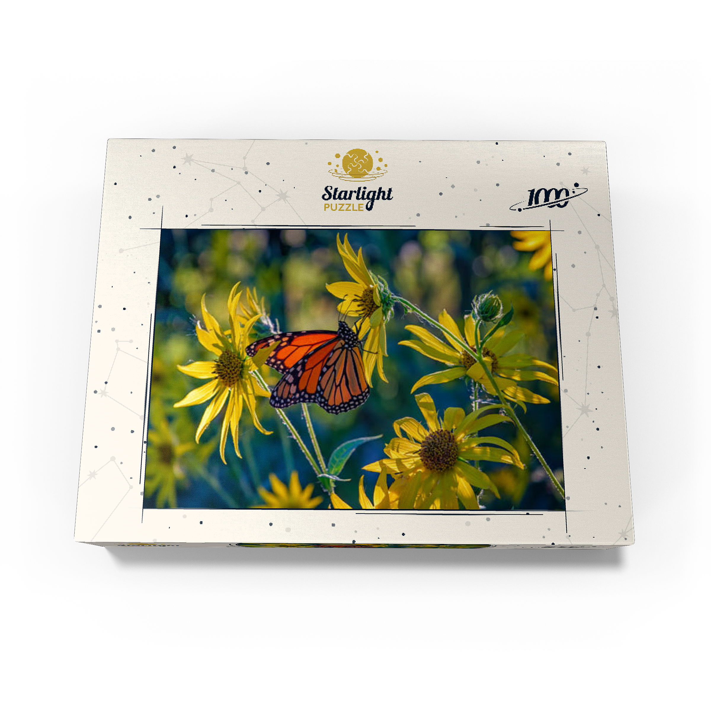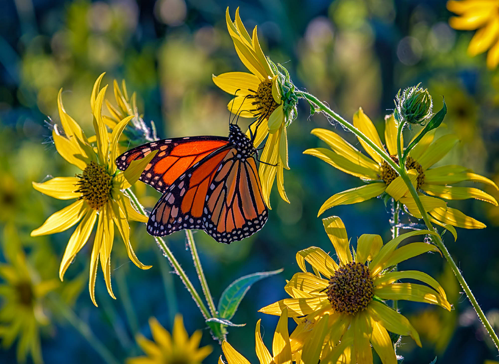 A vibrant image of a monarch butterfly perched delicately on a cluster of bright yellow wildflowers. The butterfly’s striking orange and black patterned wings contrast beautifully with the vivid petals and lush green stems. Bathed in warm sunlight, this serene scene captures the elegance of nature and the symbiotic relationship between pollinators and flowers. It is a perfect snapshot of late summer or early autumn in a blooming meadow.