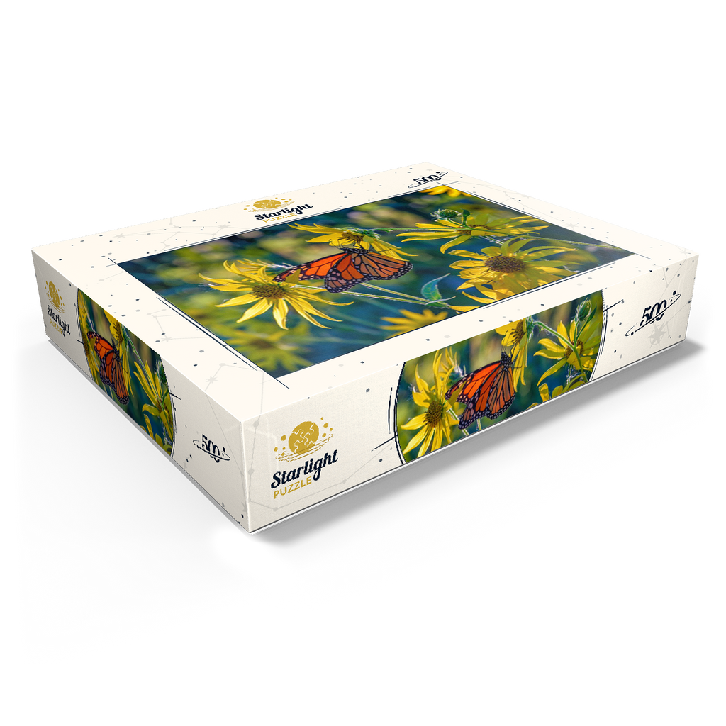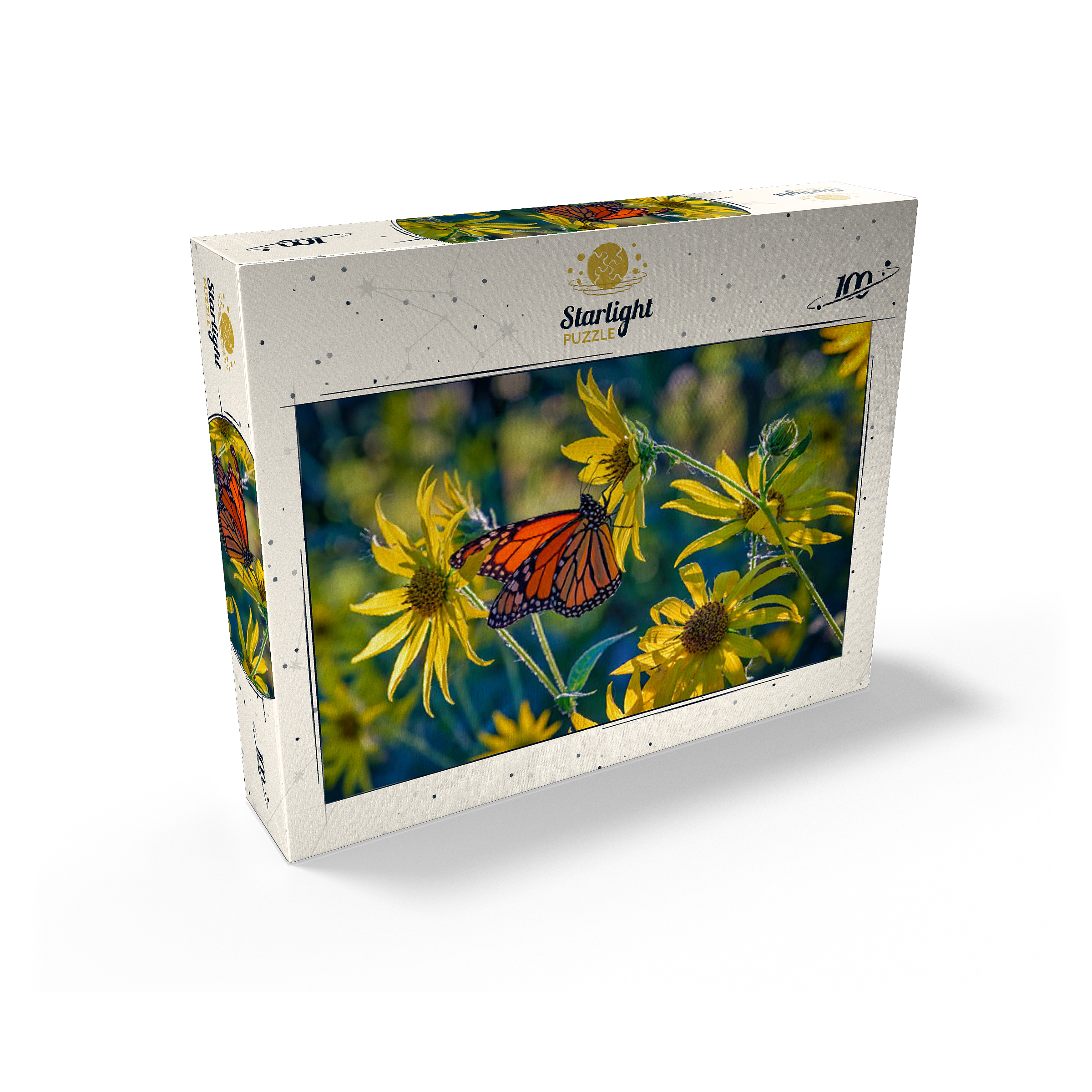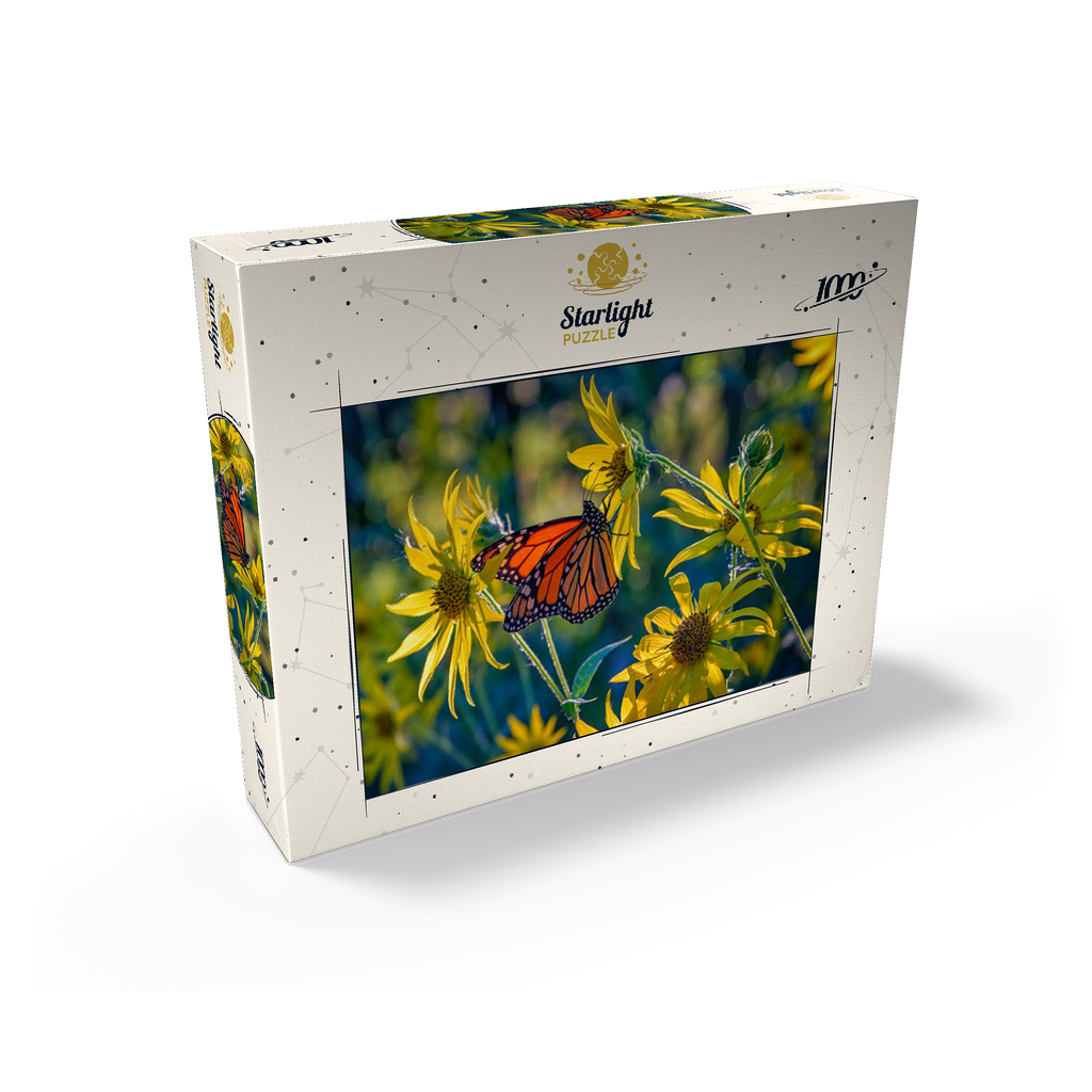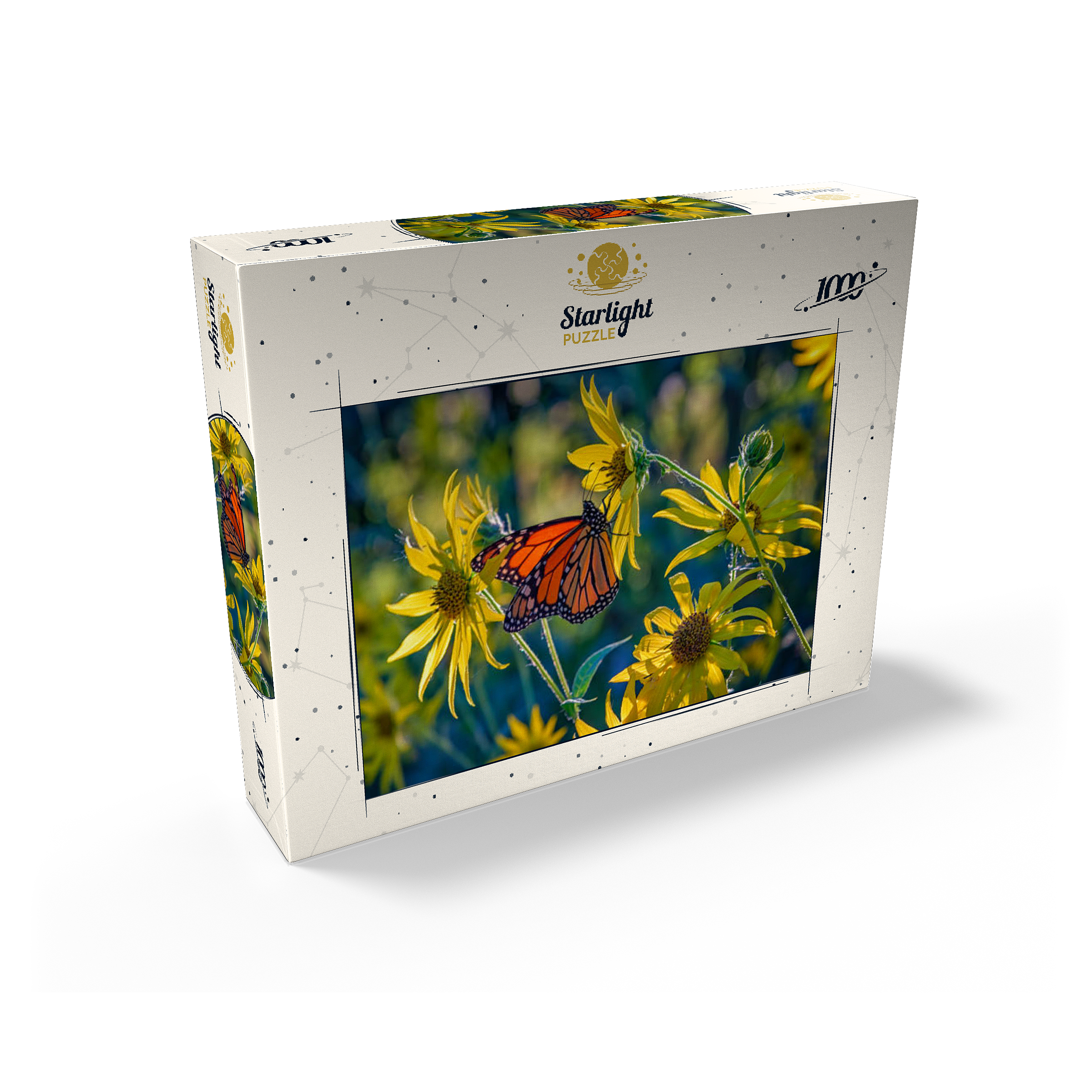 A vibrant image of a monarch butterfly perched delicately on a cluster of bright yellow wildflowers. The butterfly’s striking orange and black patterned wings contrast beautifully with the vivid petals and lush green stems. Bathed in warm sunlight, this serene scene captures the elegance of nature and the symbiotic relationship between pollinators and flowers. It is a perfect snapshot of late summer or early autumn in a blooming meadow.