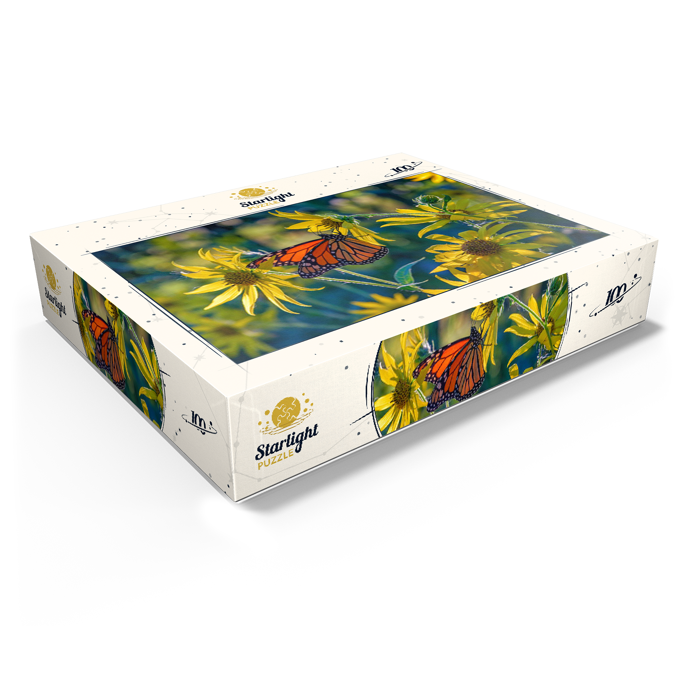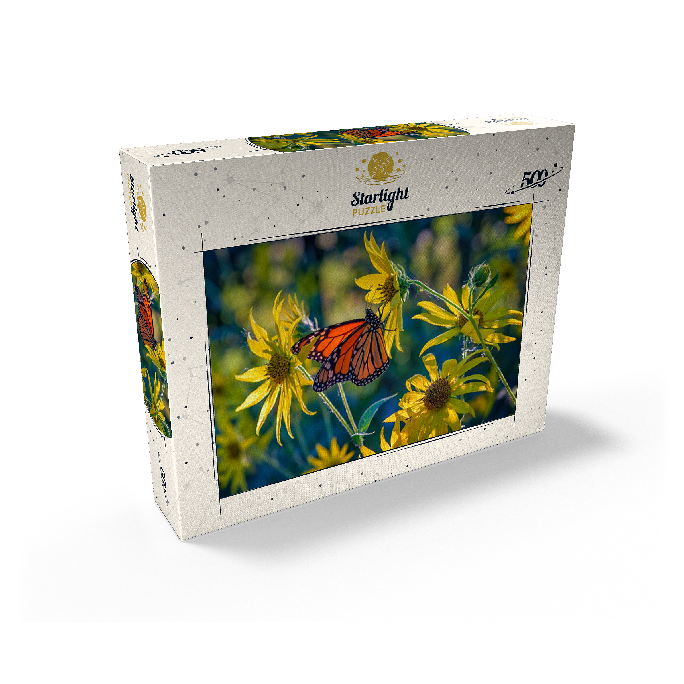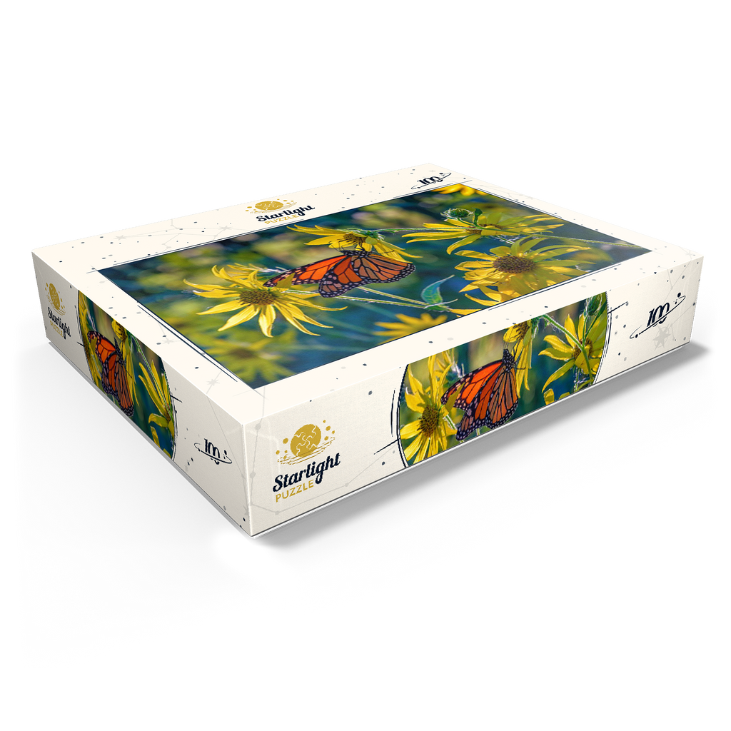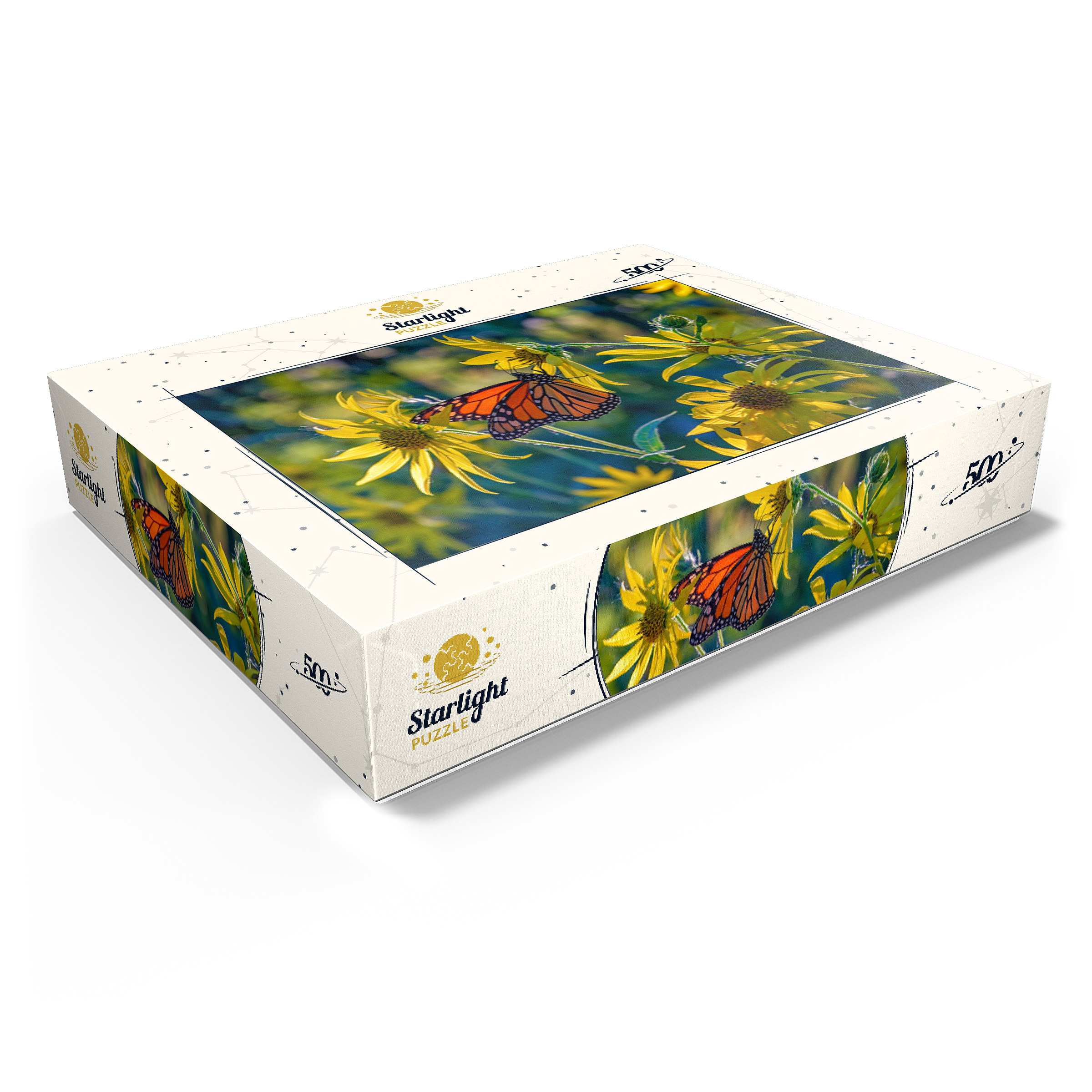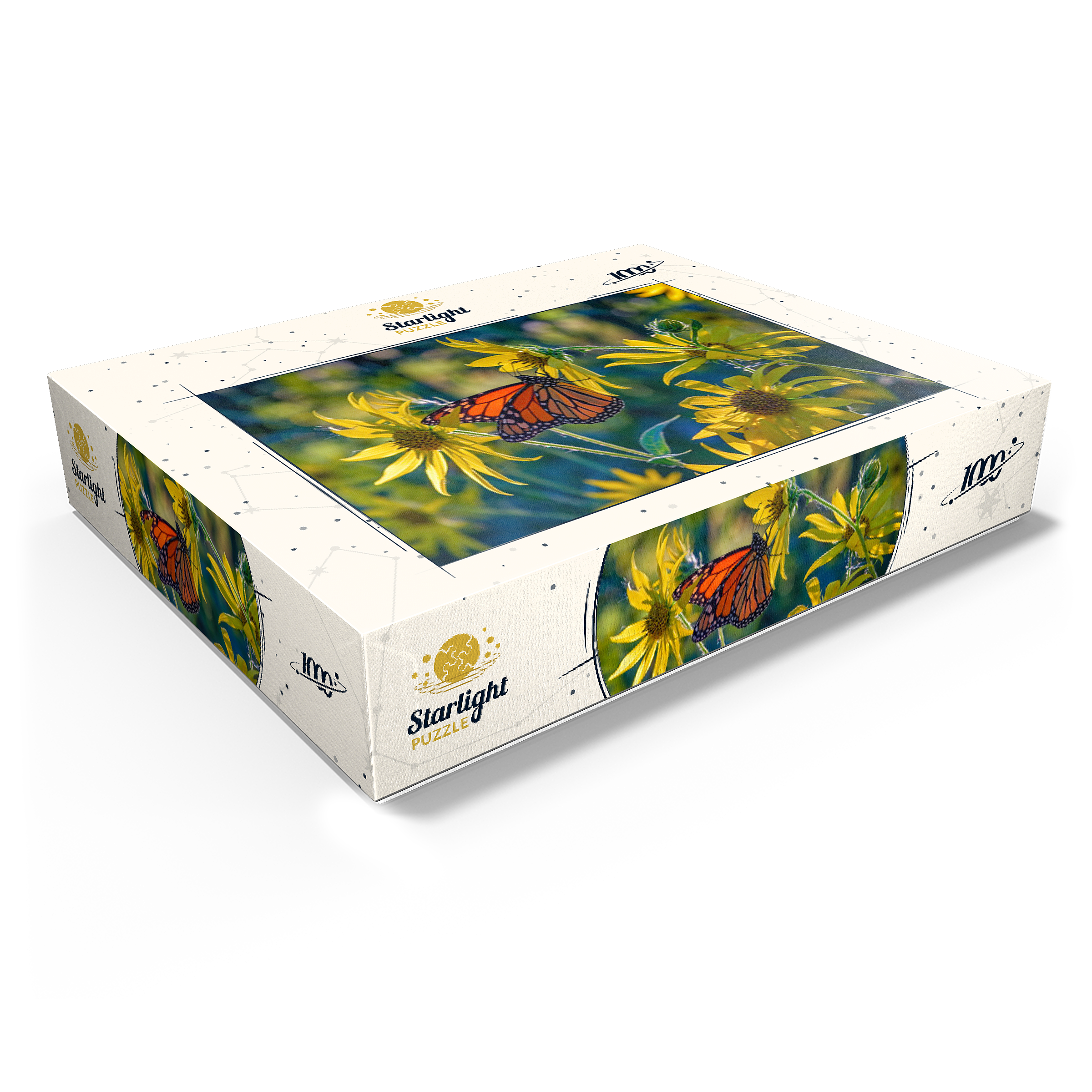 A vibrant image of a monarch butterfly perched delicately on a cluster of bright yellow wildflowers. The butterfly’s striking orange and black patterned wings contrast beautifully with the vivid petals and lush green stems. Bathed in warm sunlight, this serene scene captures the elegance of nature and the symbiotic relationship between pollinators and flowers. It is a perfect snapshot of late summer or early autumn in a blooming meadow.