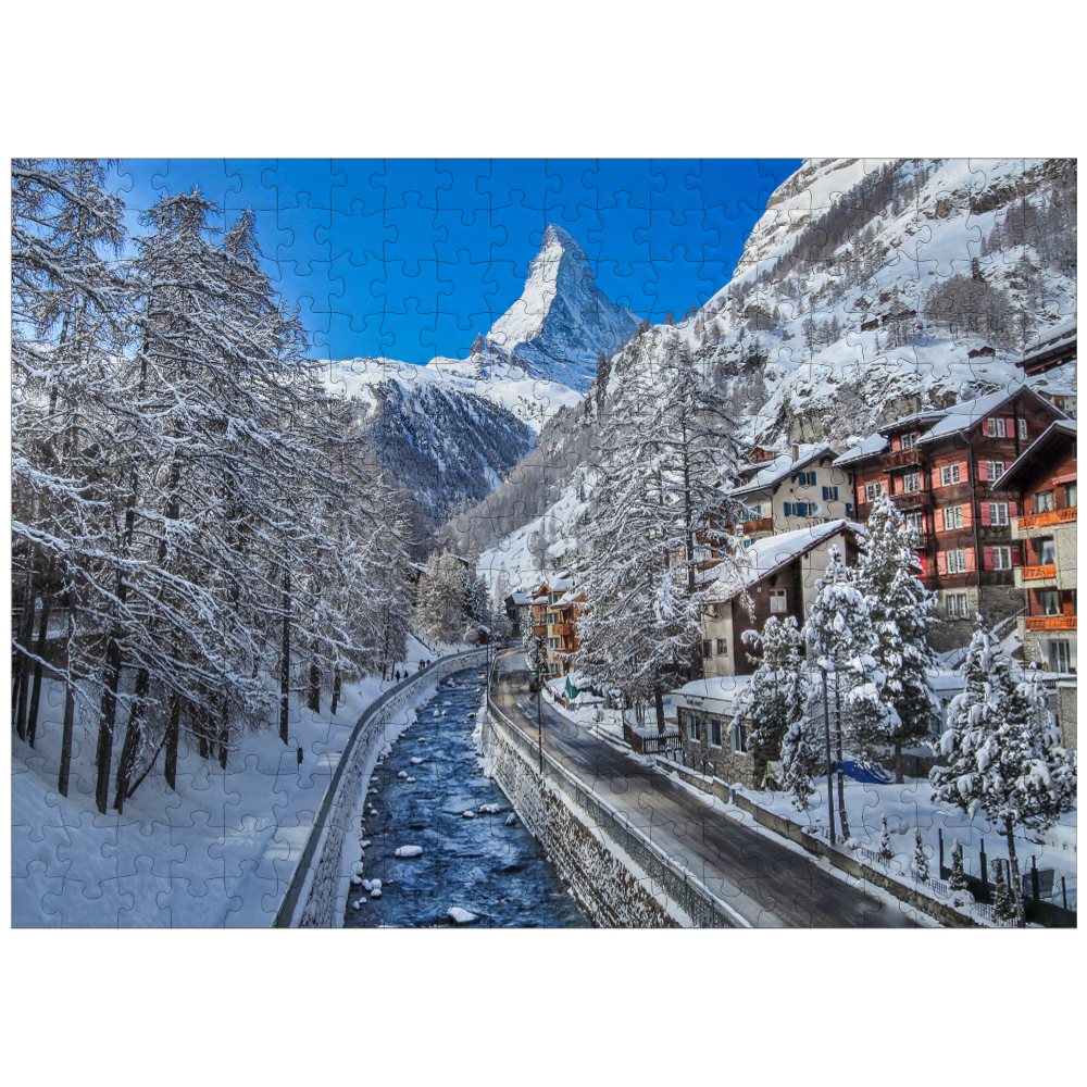 The mountain village of Zermatt in Switzerland, The Matterhorn, Alpine river