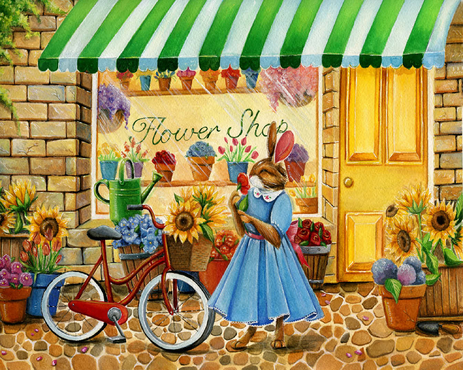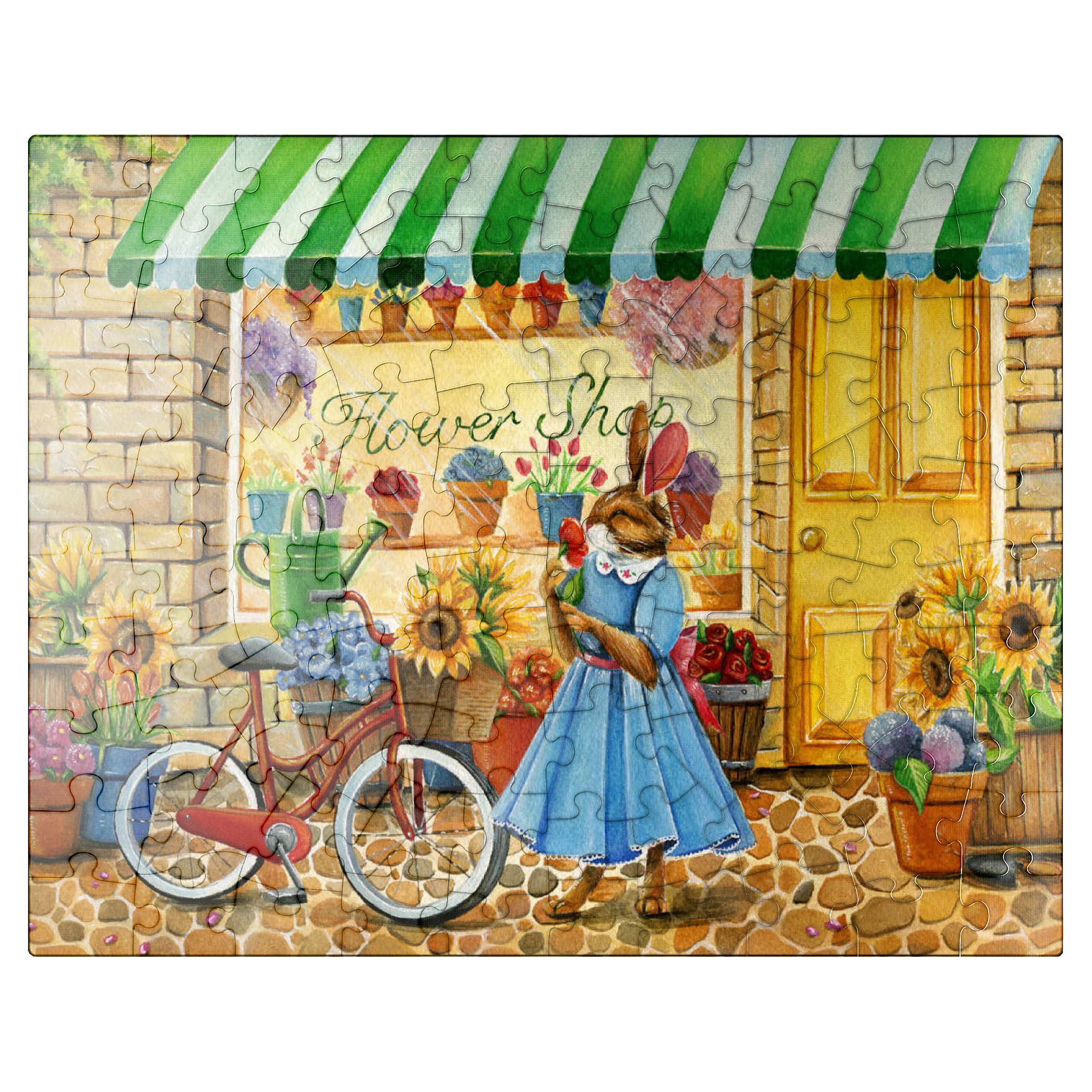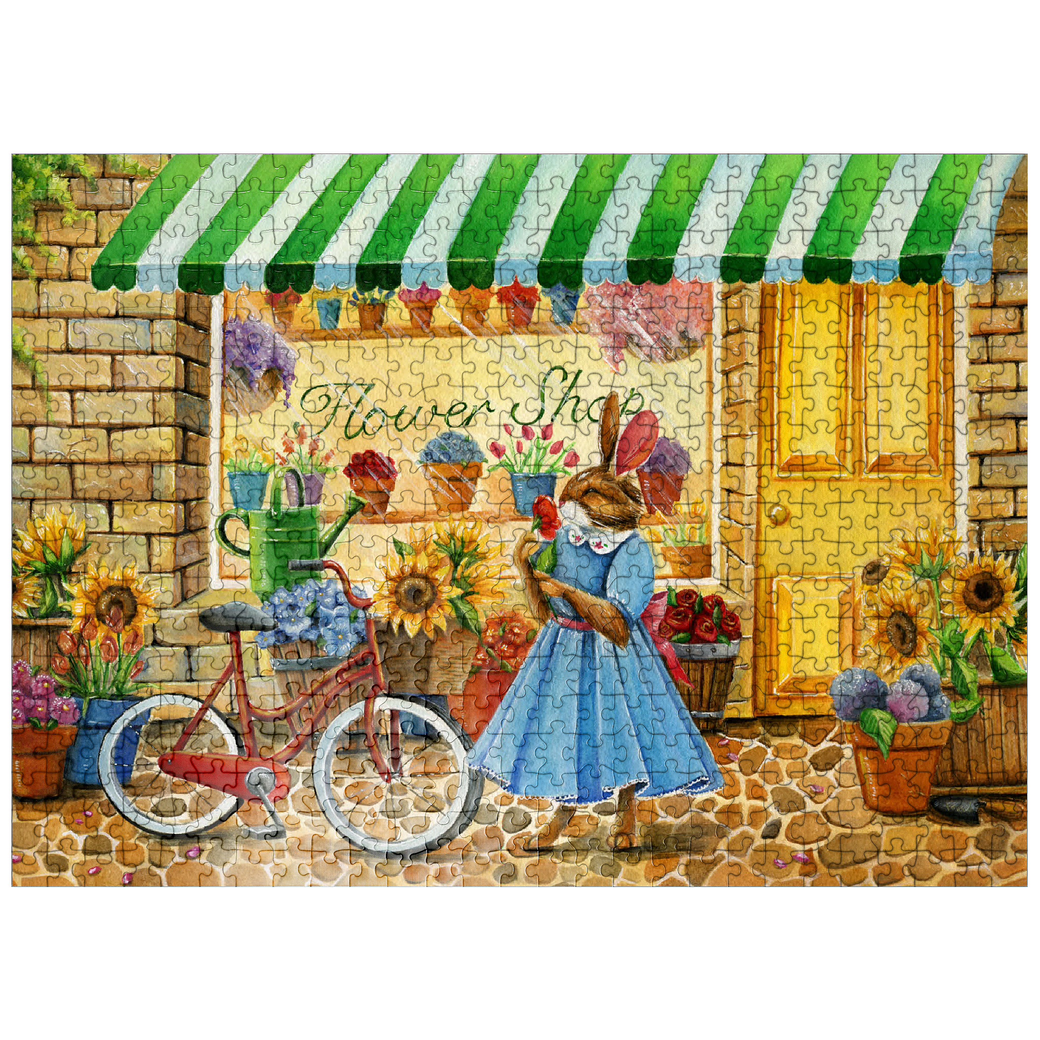 Step into a charming countryside scene with this delightful jigsaw puzzle, featuring a sweet bunny in a blue dress enjoying the scent of a freshly picked rose outside a quaint flower store. The warm brick storefront, vibrant blooms, and vintage bicycle create a cozy and nostalgic setting, perfect for puzzle lovers of all ages. This enchanting illustration captures the beauty of springtime, florals, and woodland whimsy, making it a wonderful gift for animal lovers and garden enthusiasts alike.