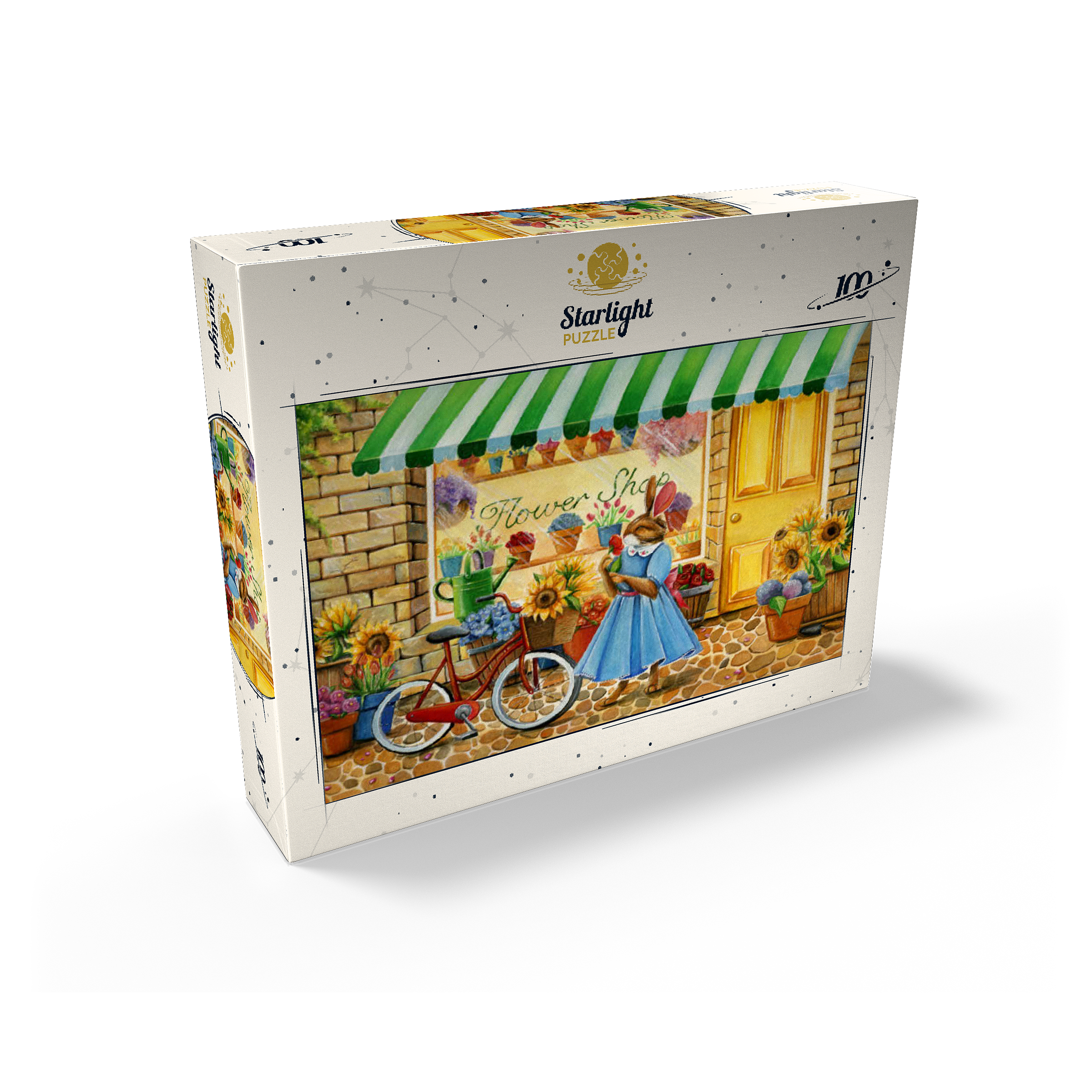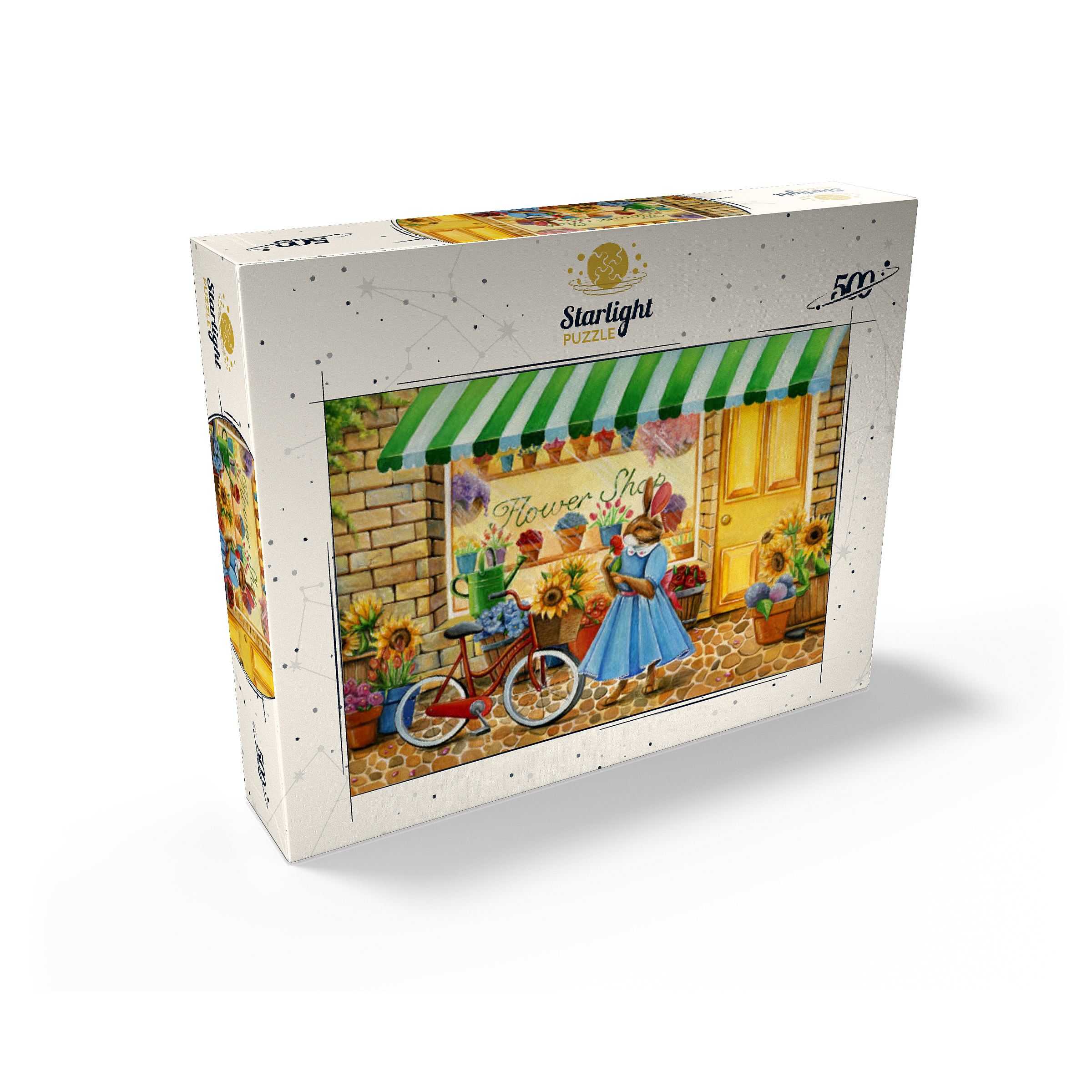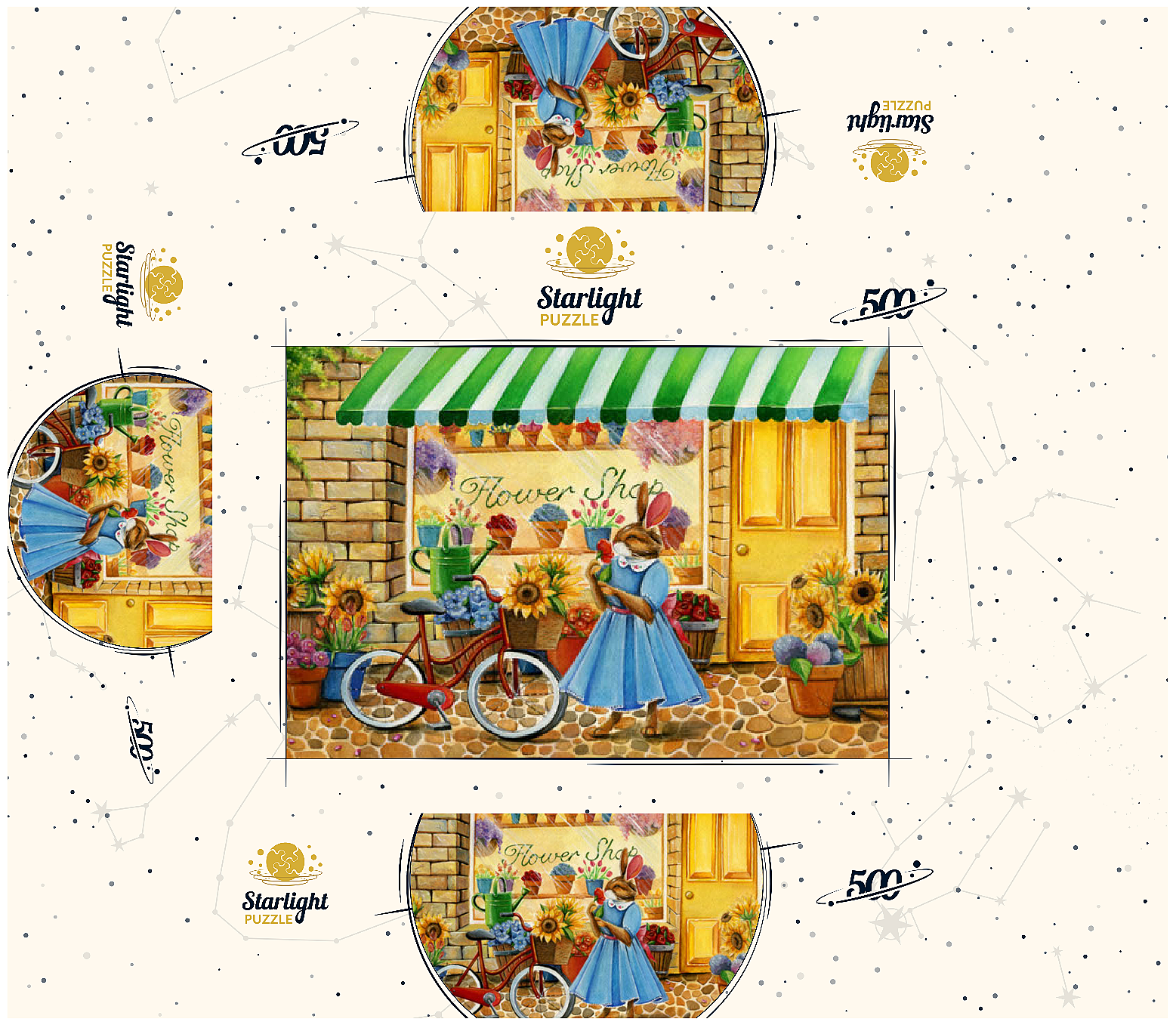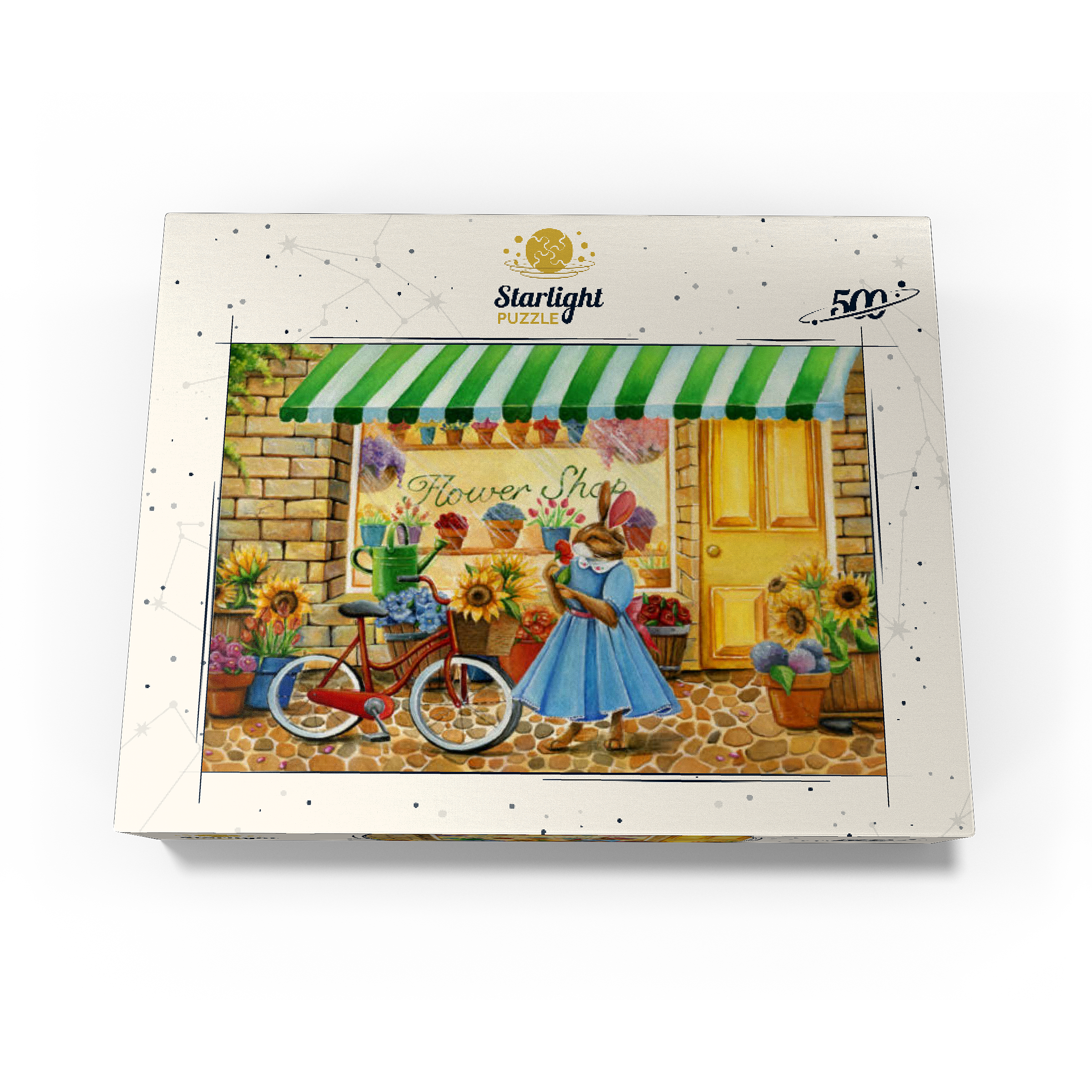 Step into a charming countryside scene with this delightful jigsaw puzzle, featuring a sweet bunny in a blue dress enjoying the scent of a freshly picked rose outside a quaint flower store. The warm brick storefront, vibrant blooms, and vintage bicycle create a cozy and nostalgic setting, perfect for puzzle lovers of all ages. This enchanting illustration captures the beauty of springtime, florals, and woodland whimsy, making it a wonderful gift for animal lovers and garden enthusiasts alike.