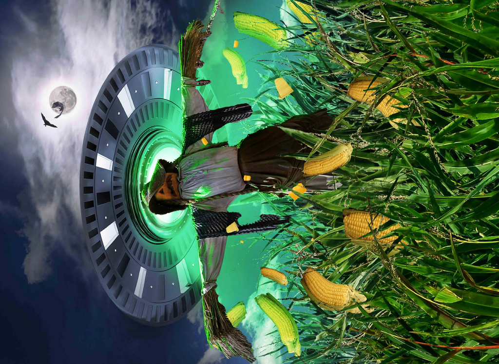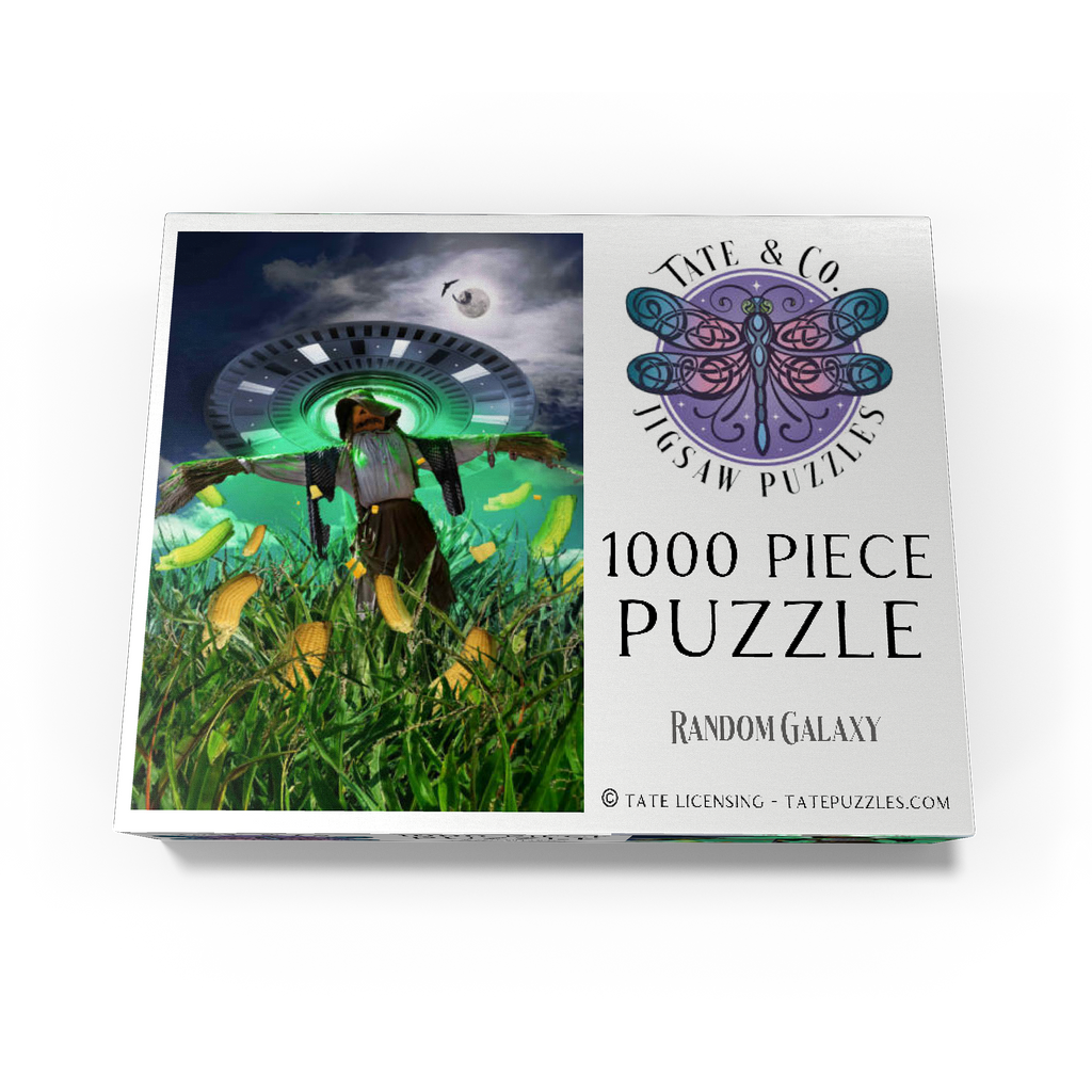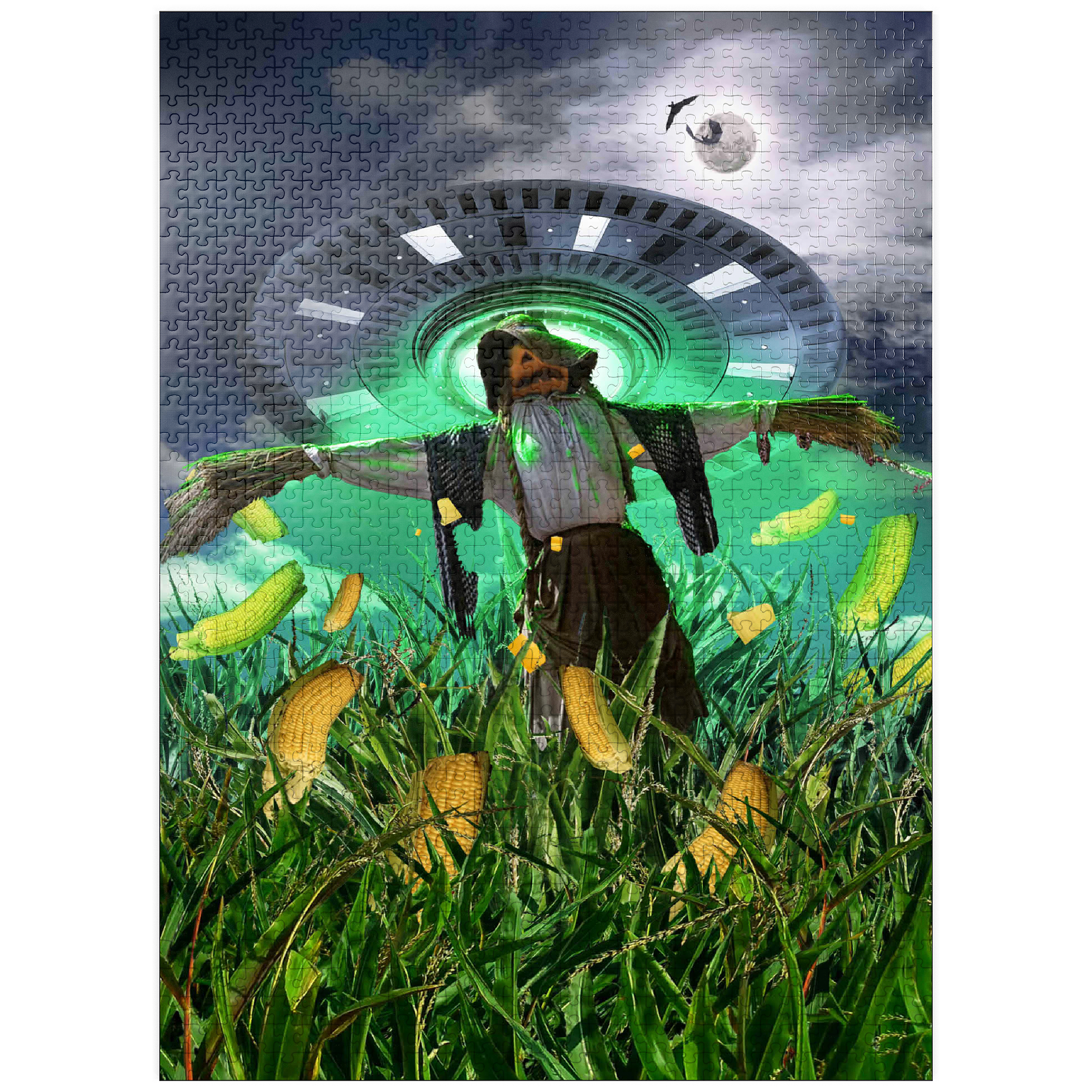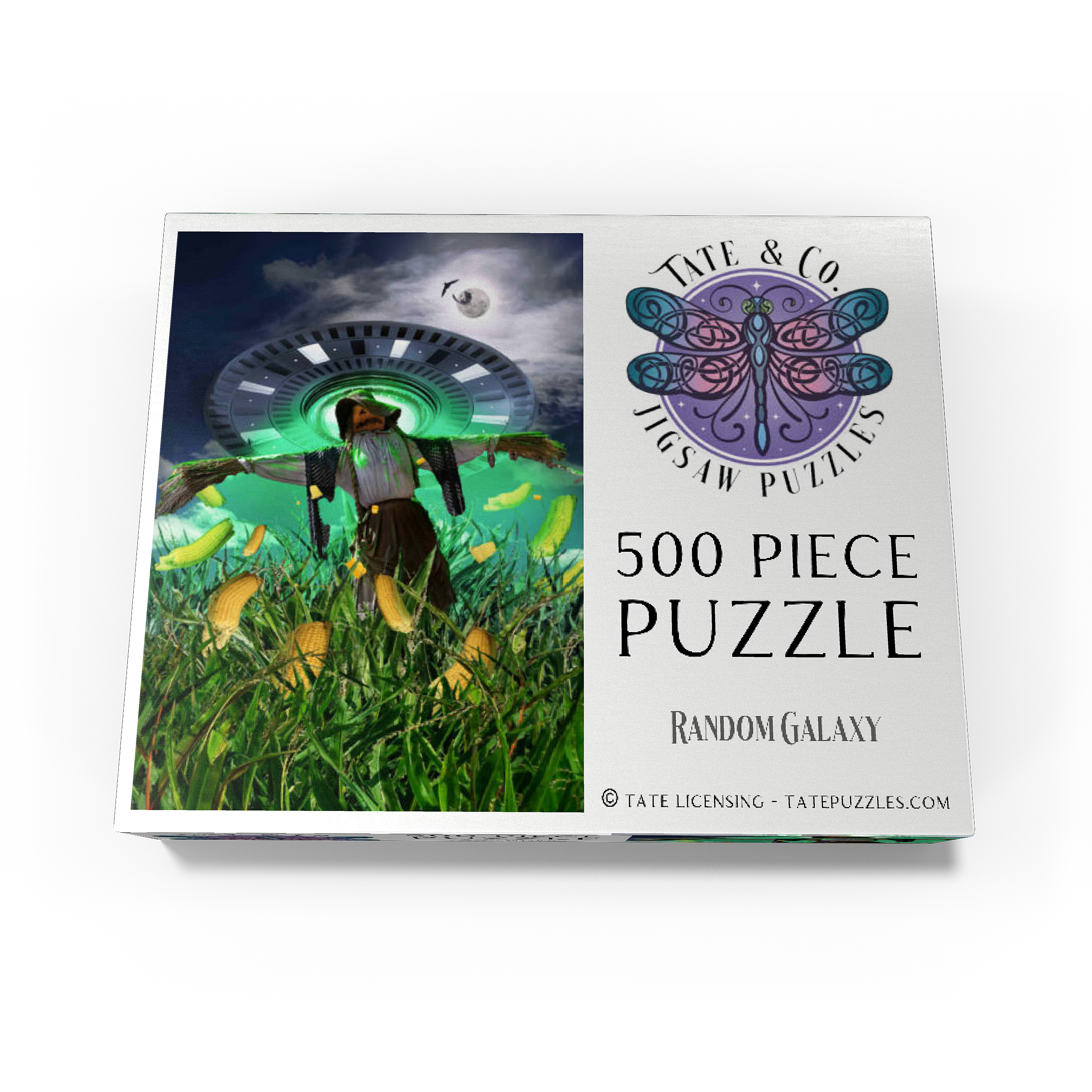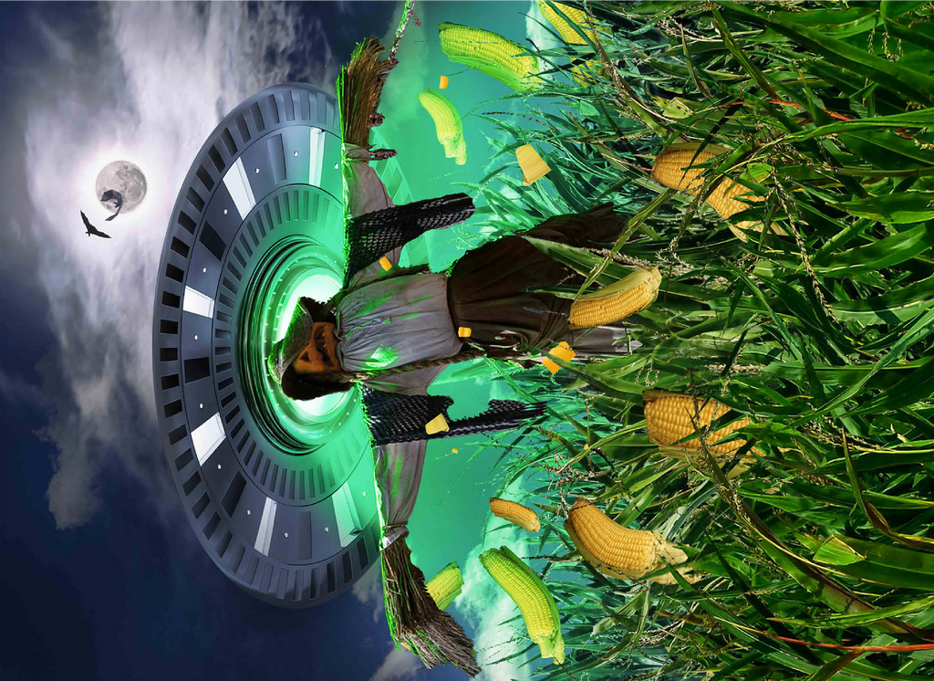 An eerie UFO hovers over a cornfield, spotlighting a scarecrow below. Random Galaxy fuses extraterrestrial mystery with rural Americana in this surreal sci-fi artwork.