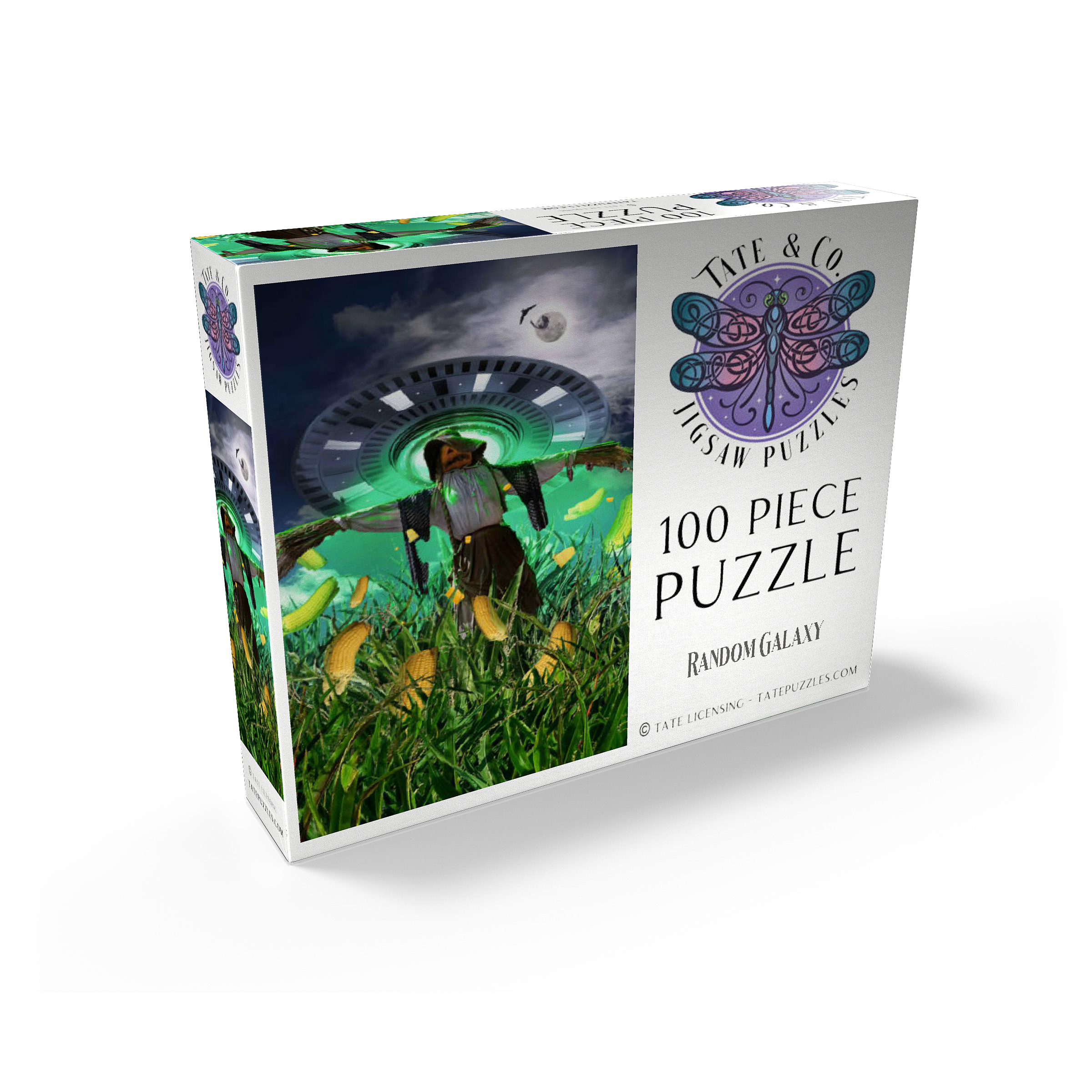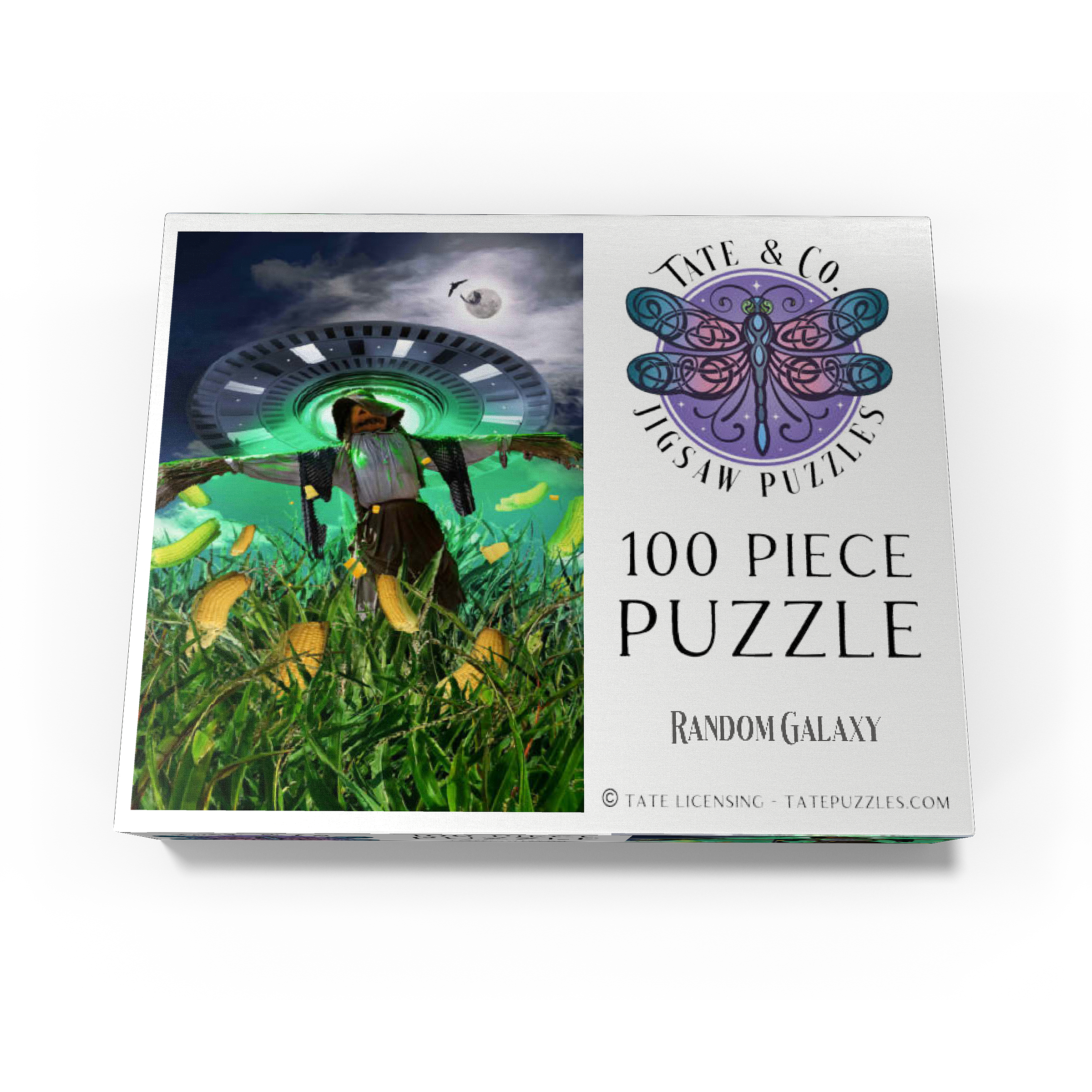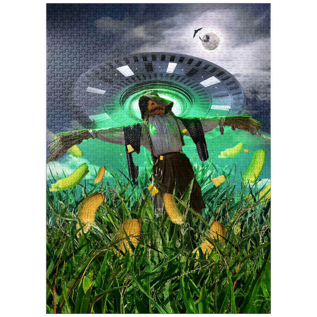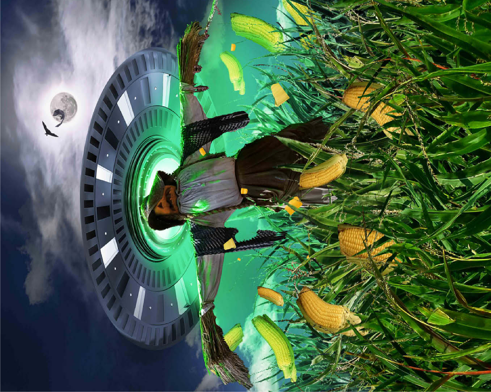 An eerie UFO hovers over a cornfield, spotlighting a scarecrow below. Random Galaxy fuses extraterrestrial mystery with rural Americana in this surreal sci-fi artwork.