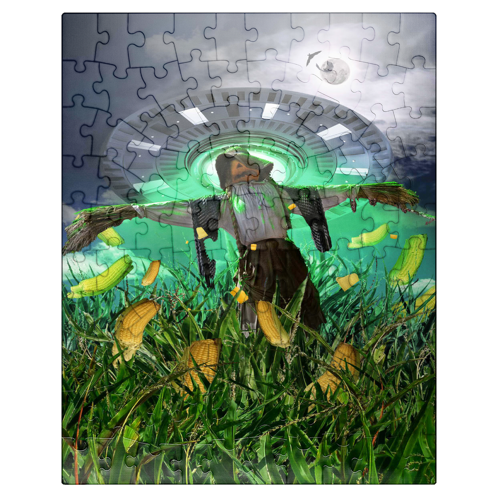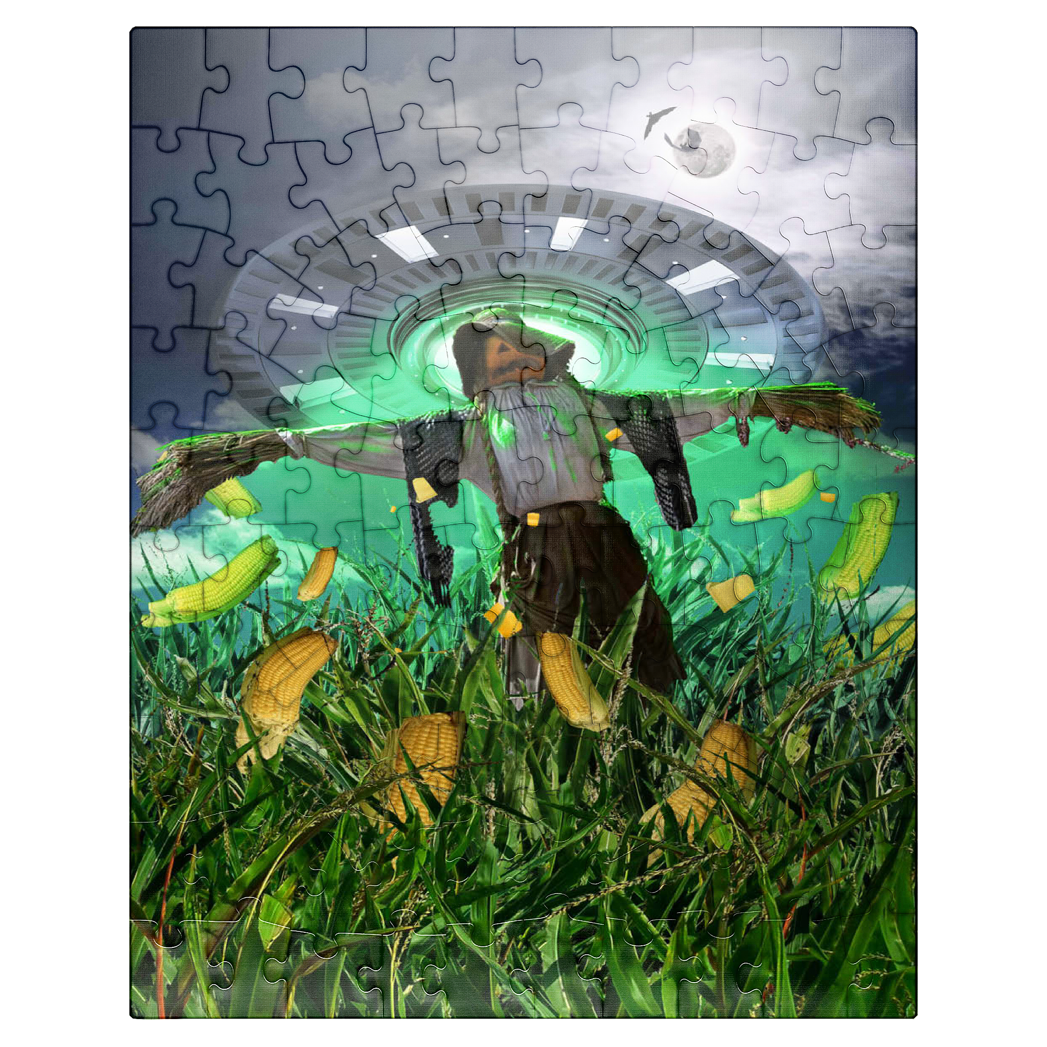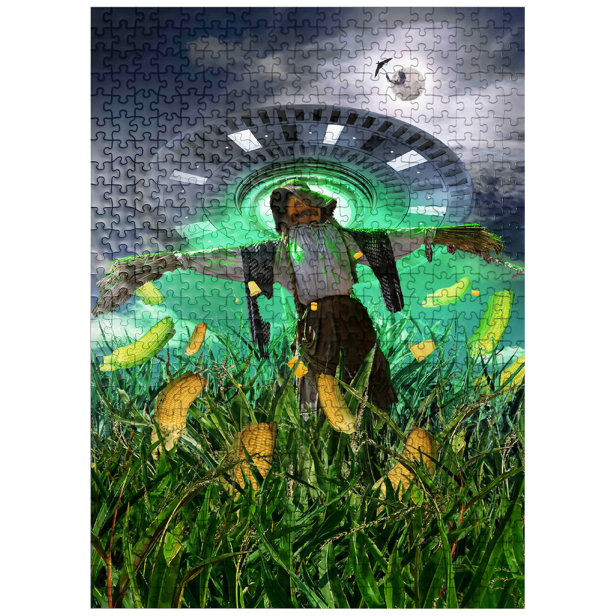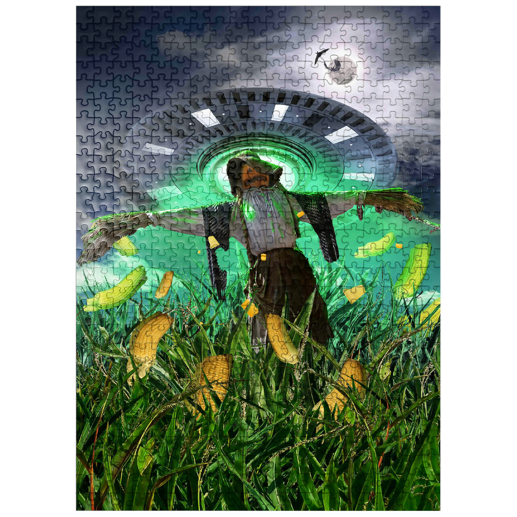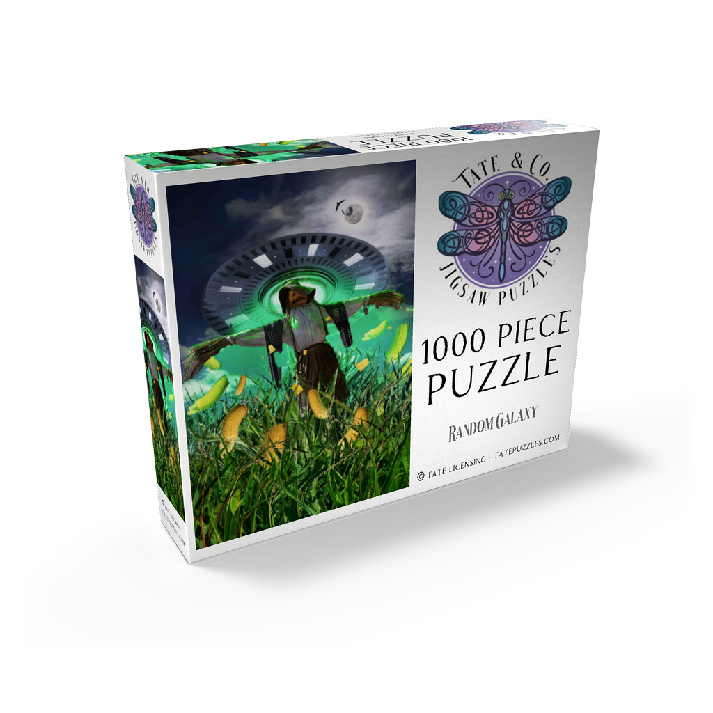 An eerie UFO hovers over a cornfield, spotlighting a scarecrow below. Random Galaxy fuses extraterrestrial mystery with rural Americana in this surreal sci-fi artwork.