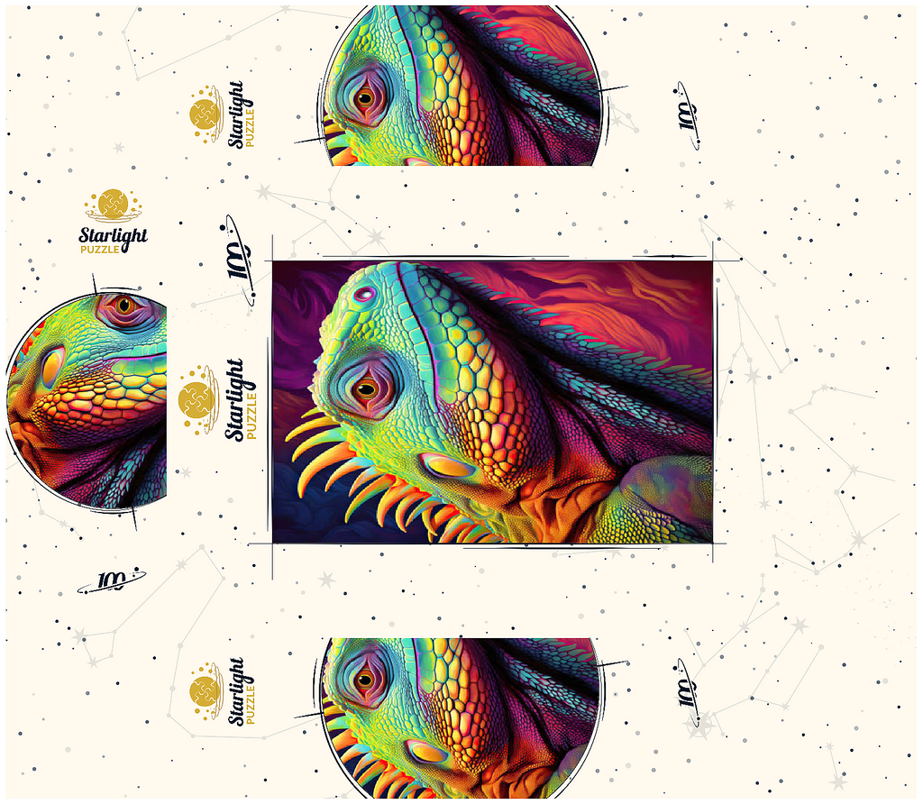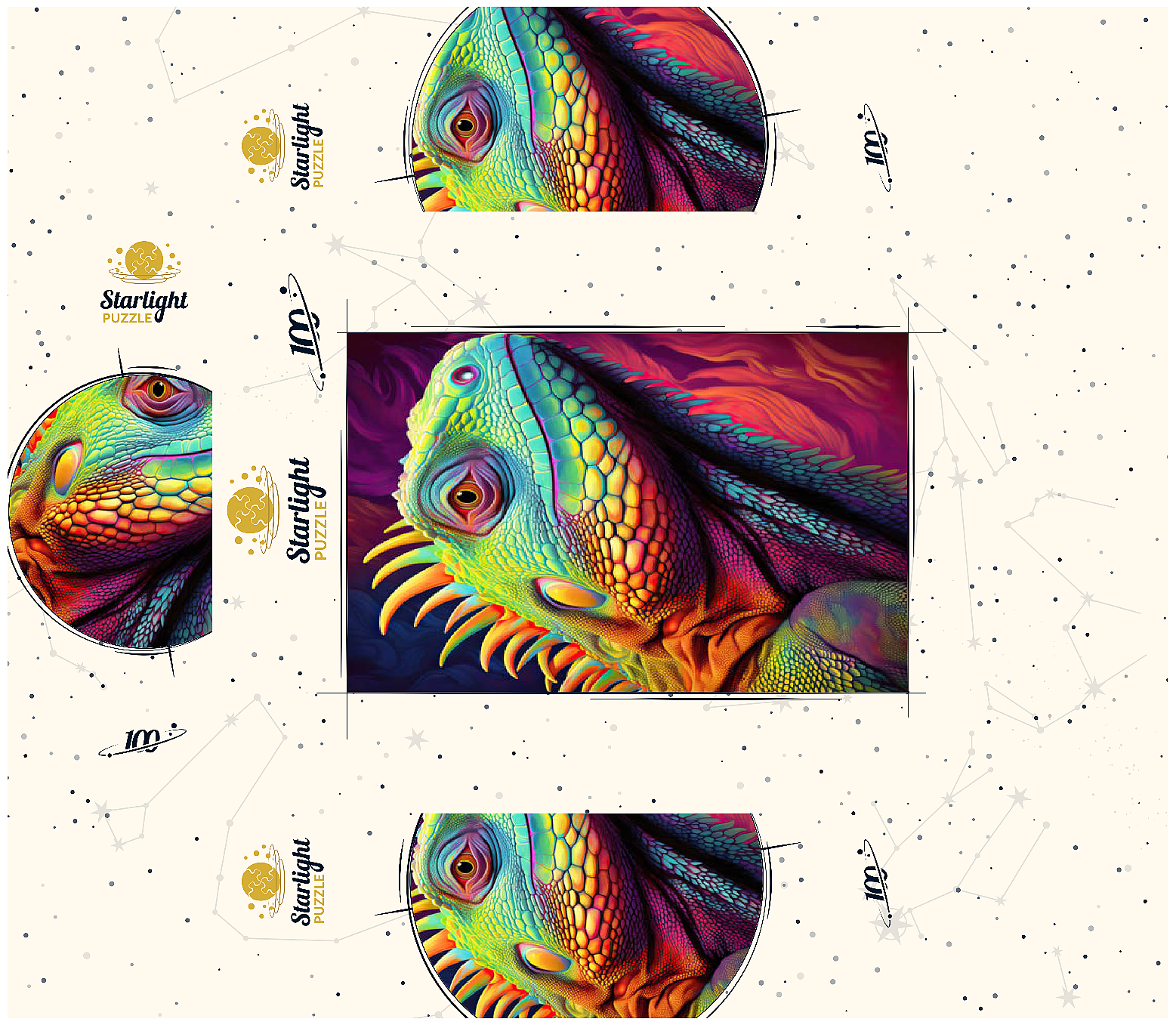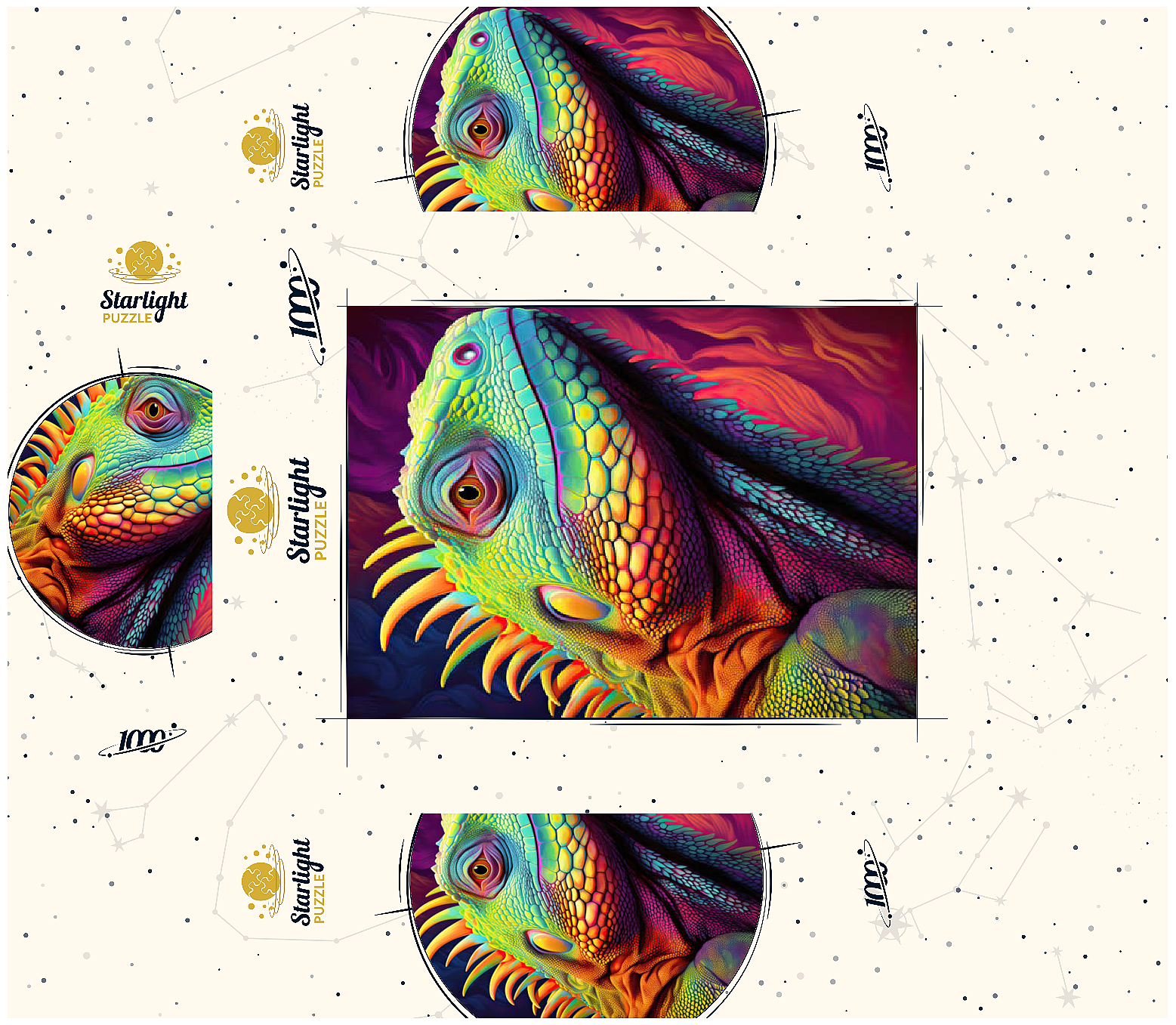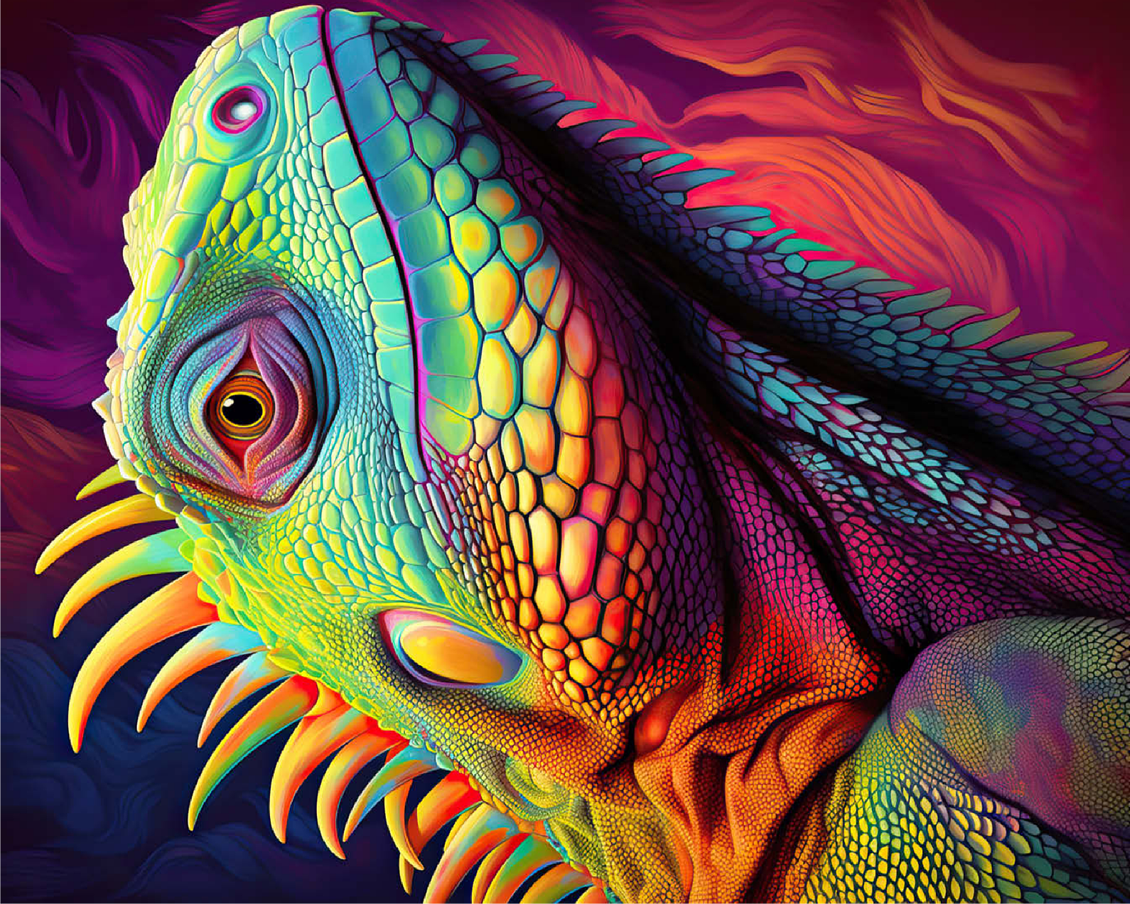This mesmerizing artwork showcases a brilliantly colored iguana in a surreal, psychedelic style. its intricate scales shimmer with a fusion of neon greens, fiery oranges, deep purples, and electric blues, creating an eye-catching and otherworldly effect. the detailed textures and vibrant hues bring out the reptile's natural beauty while adding a fantastical, dreamlike quality. set against a dramatic, swirling background, this piece radiates energy, making it a perfect choice for reptile lovers, fantasy art enthusiasts, and those drawn to bold, colorful digital illustrations.