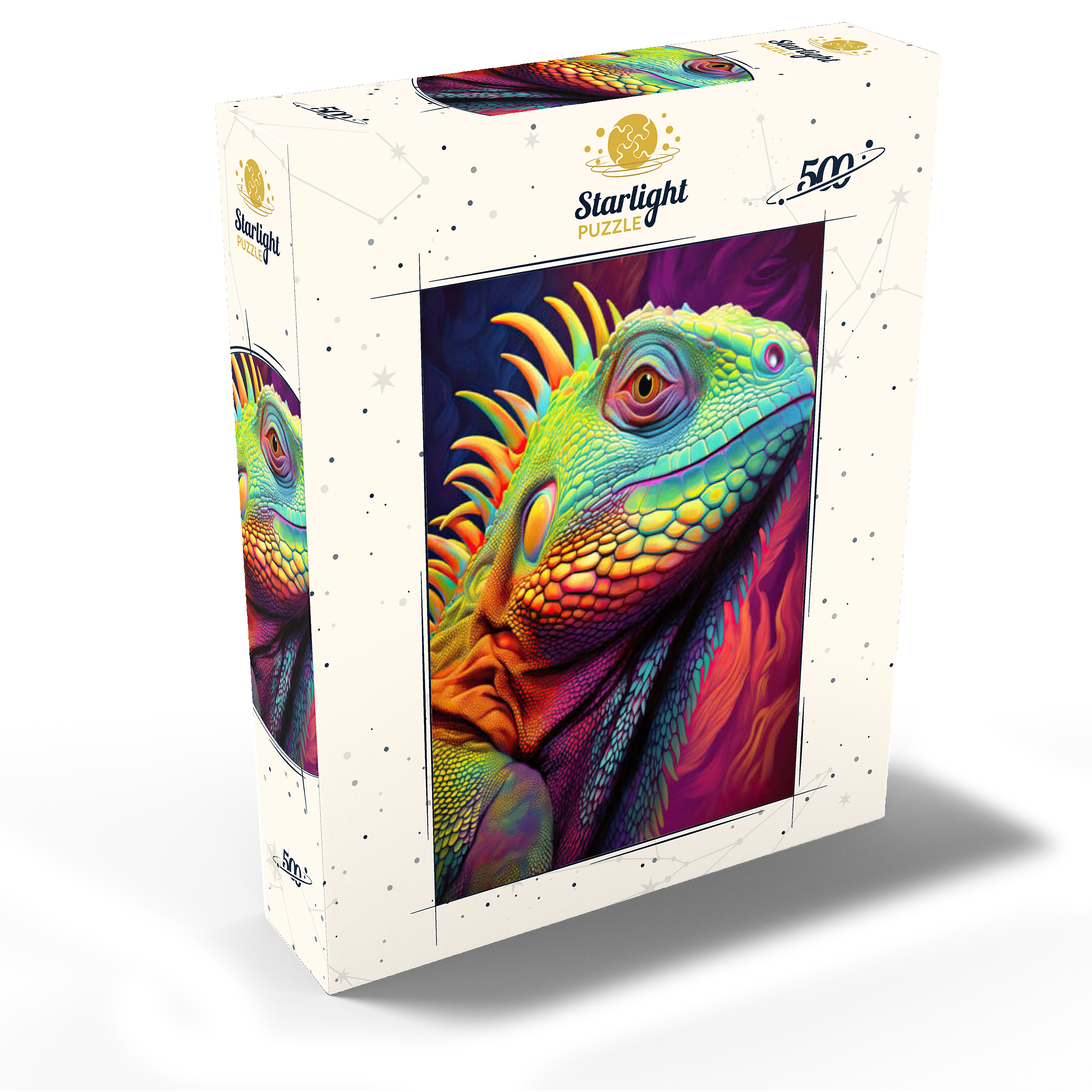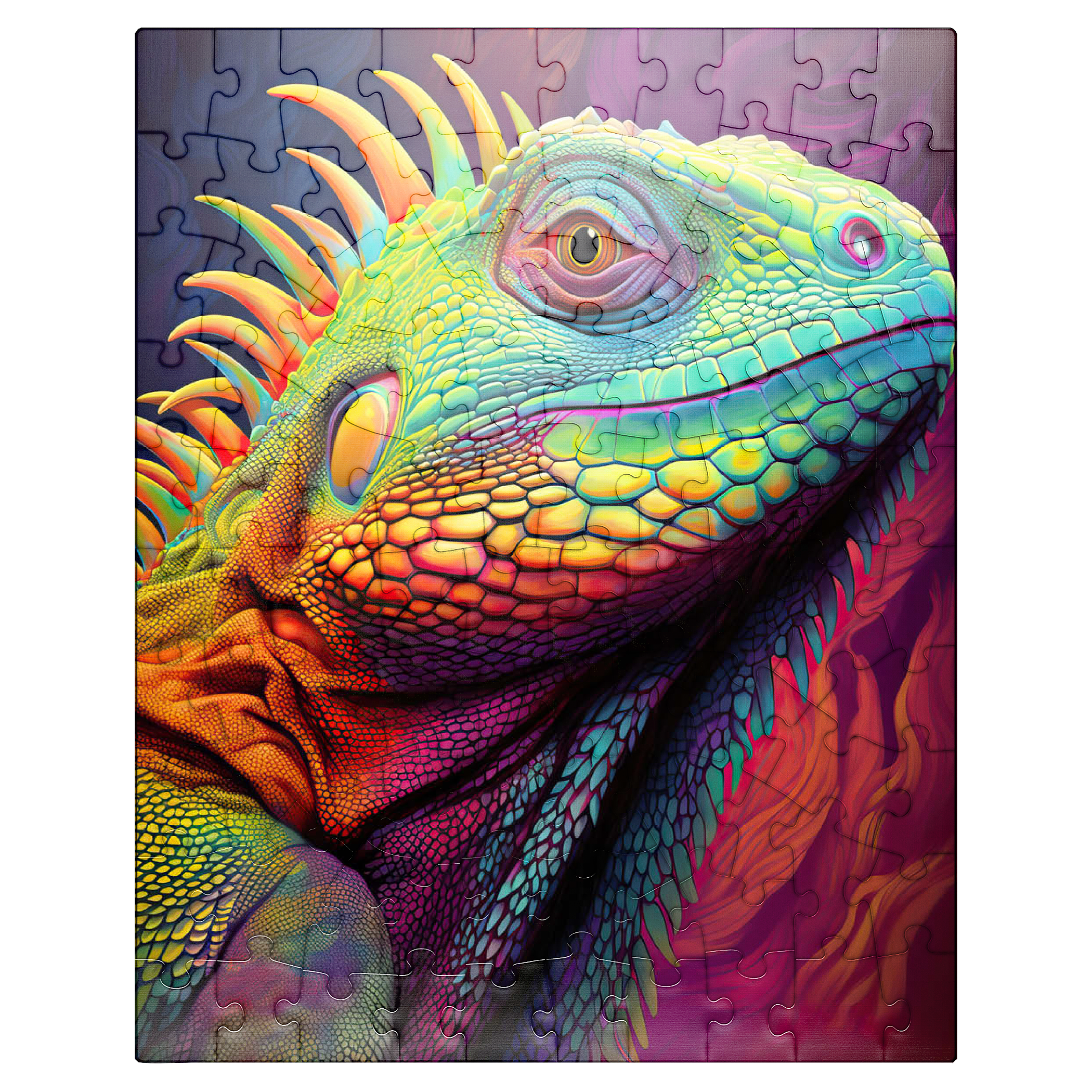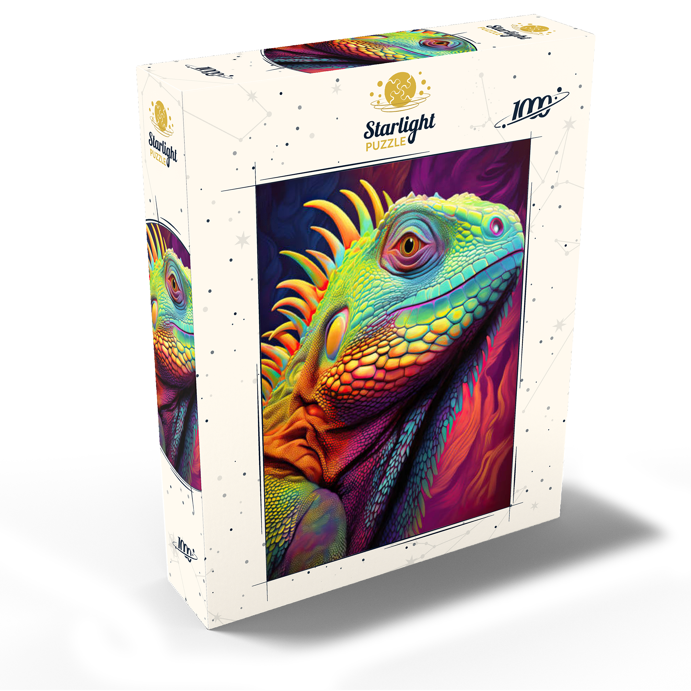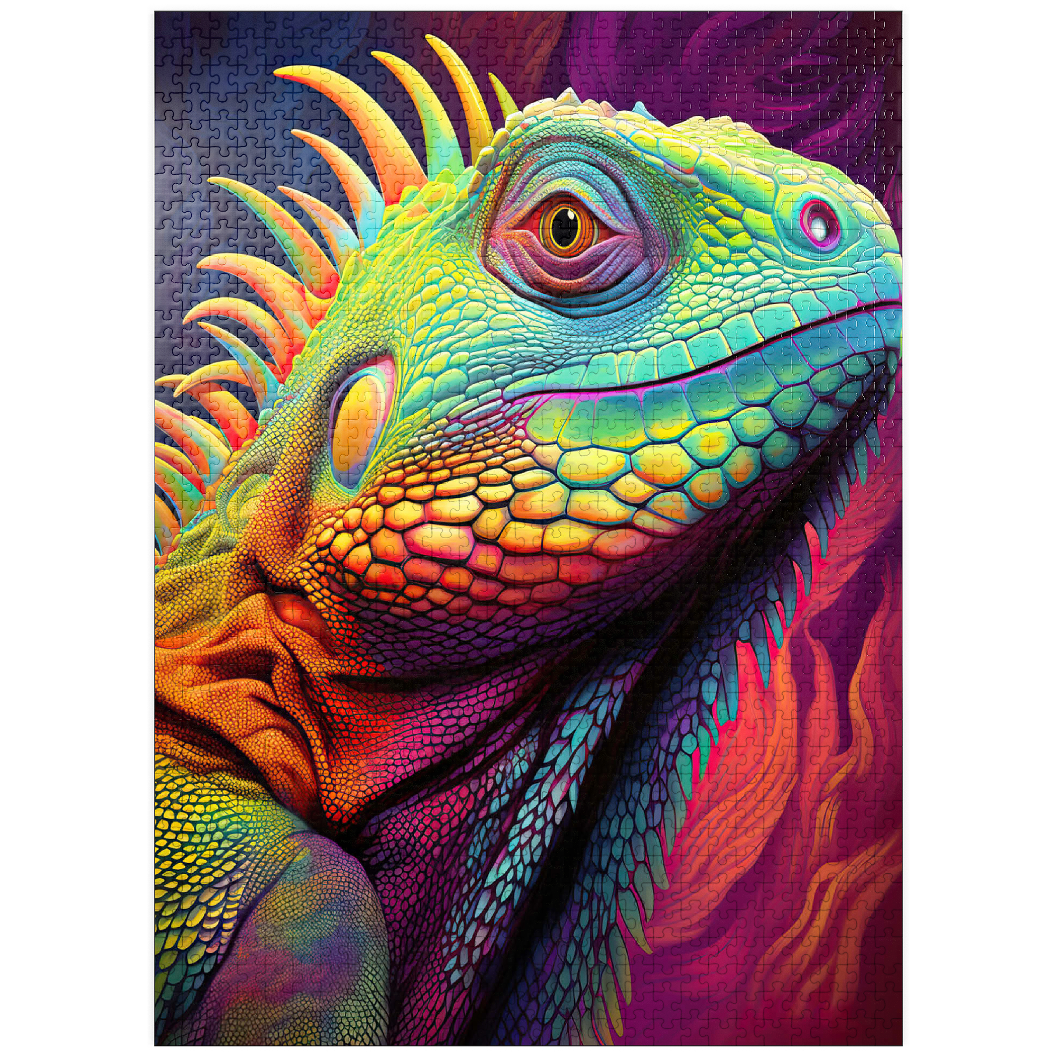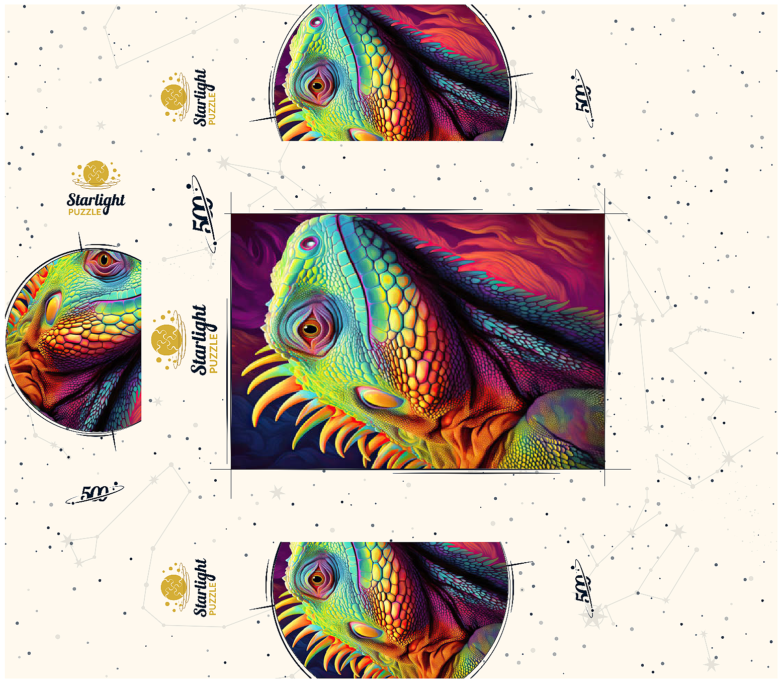 This mesmerizing artwork showcases a brilliantly colored iguana in a surreal, psychedelic style. its intricate scales shimmer with a fusion of neon greens, fiery oranges, deep purples, and electric blues, creating an eye-catching and otherworldly effect. the detailed textures and vibrant hues bring out the reptile's natural beauty while adding a fantastical, dreamlike quality. set against a dramatic, swirling background, this piece radiates energy, making it a perfect choice for reptile lovers, fantasy art enthusiasts, and those drawn to bold, colorful digital illustrations.