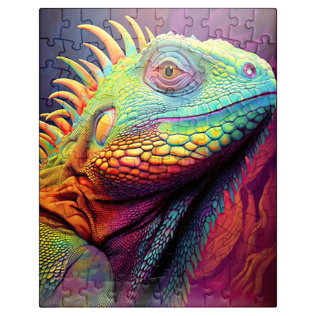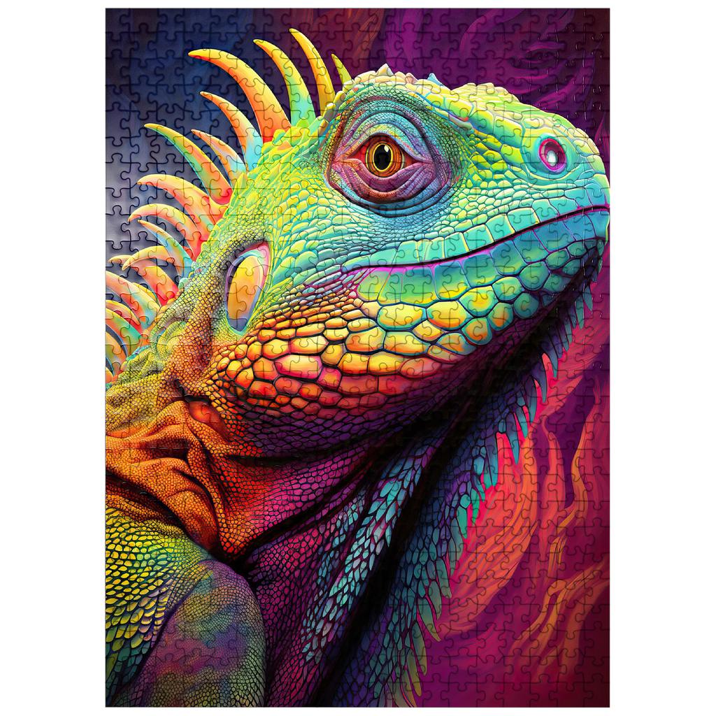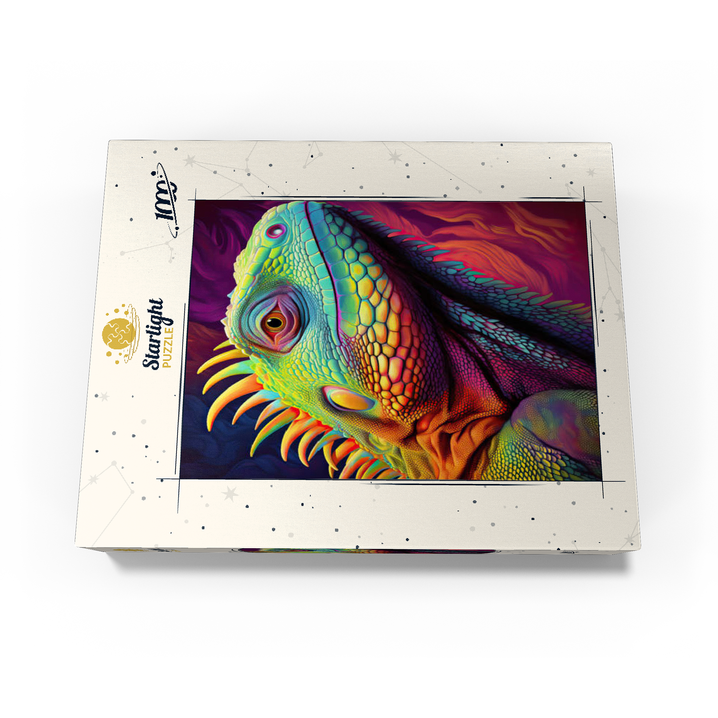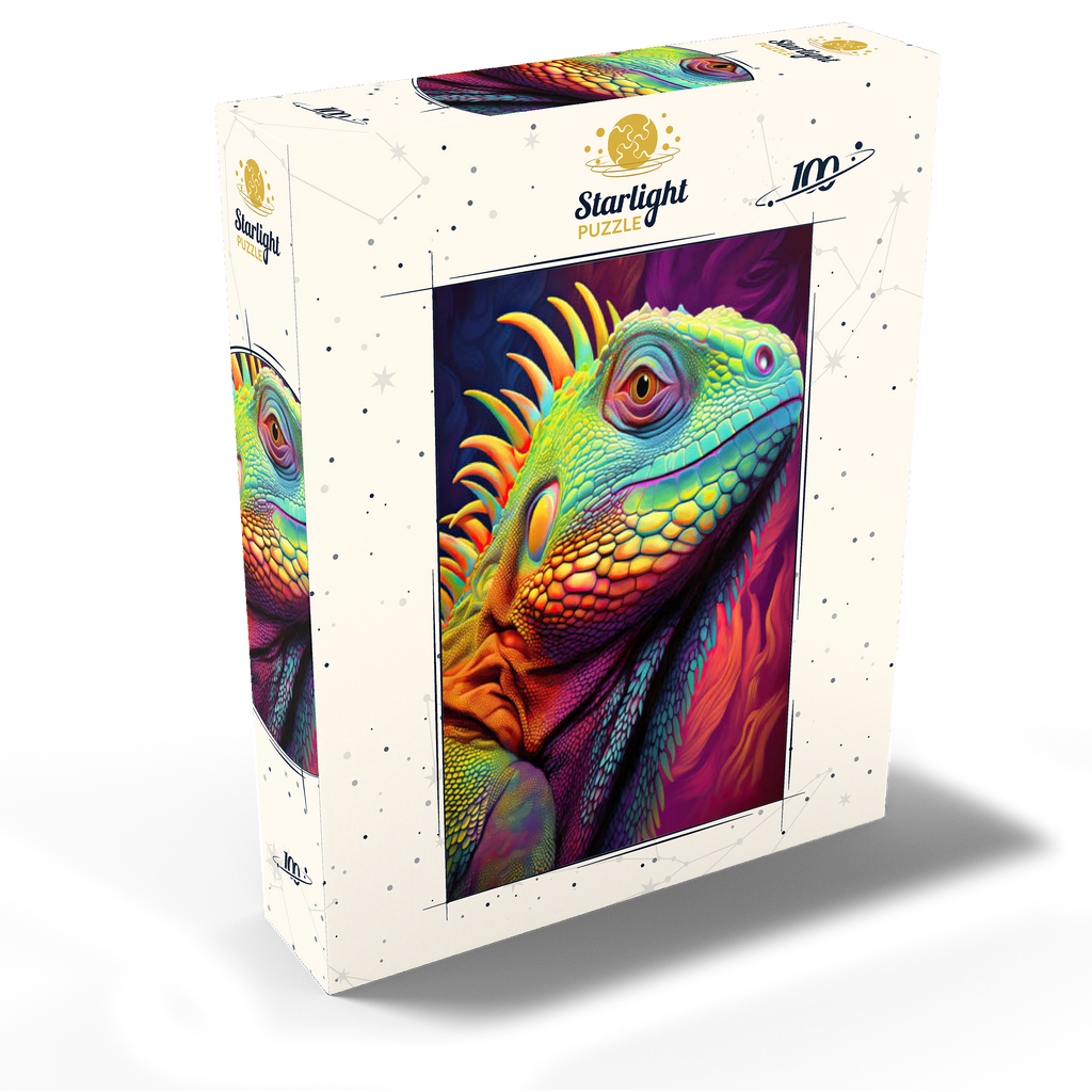 This mesmerizing artwork showcases a brilliantly colored iguana in a surreal, psychedelic style. its intricate scales shimmer with a fusion of neon greens, fiery oranges, deep purples, and electric blues, creating an eye-catching and otherworldly effect. the detailed textures and vibrant hues bring out the reptile's natural beauty while adding a fantastical, dreamlike quality. set against a dramatic, swirling background, this piece radiates energy, making it a perfect choice for reptile lovers, fantasy art enthusiasts, and those drawn to bold, colorful digital illustrations.