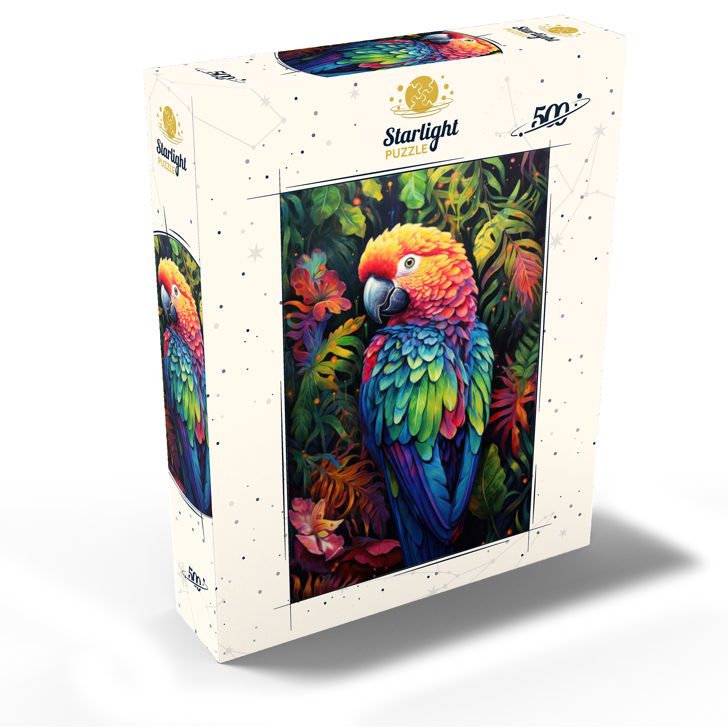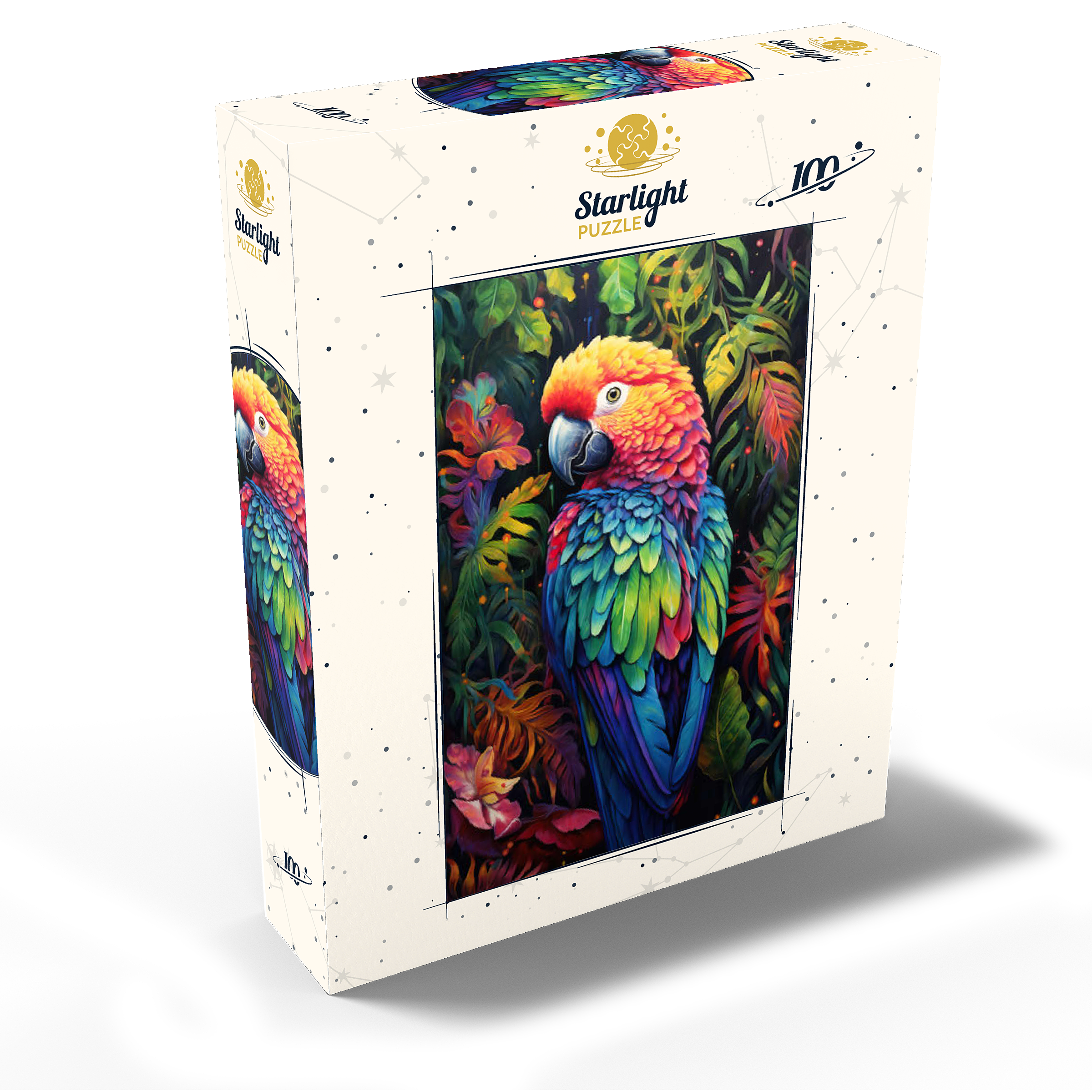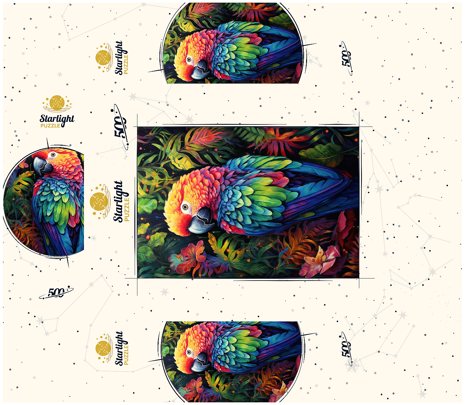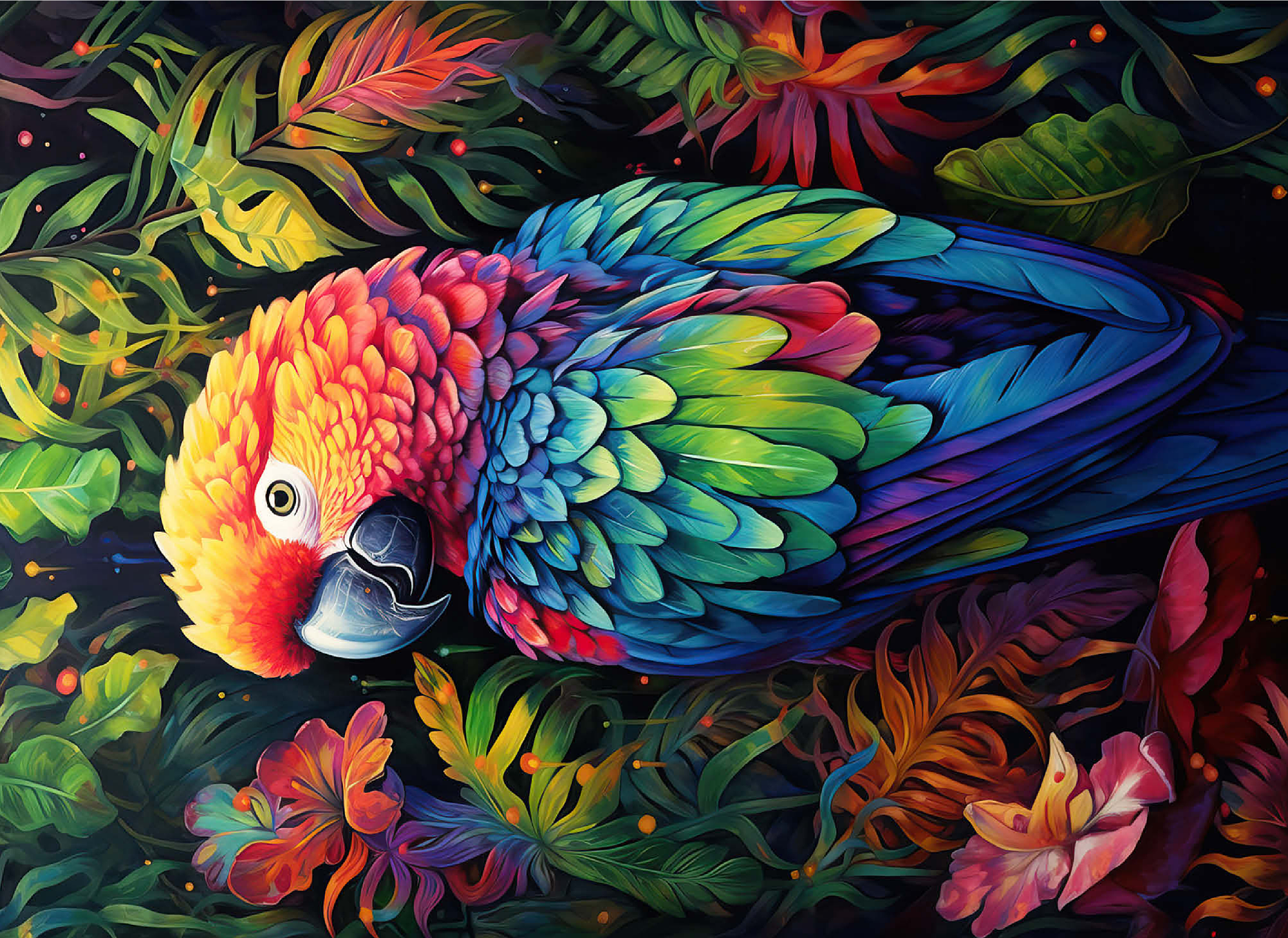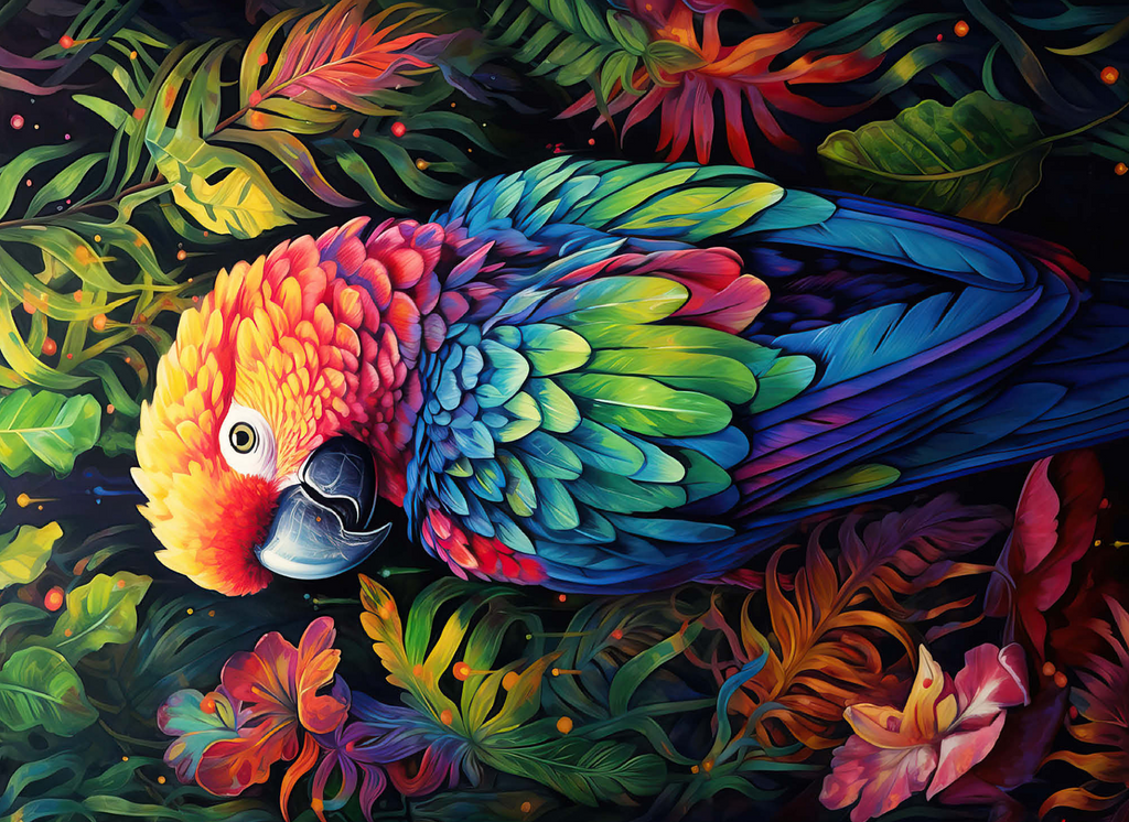 This stunning artwork captures the beauty of a scarlet macaw with an explosion of vibrant colors, set against a lush tropical jungle. The intricate feather details showcase a mesmerizing blend of red, blue, green, and yellow, creating a striking visual masterpiece. The exotic foliage and deep rainforest hues enhance the parrot's regal presence, making this a perfect piece for nature and bird lovers. Ideal for those who appreciate wildlife art, tropical aesthetics, and colorful, detailed illustrations.