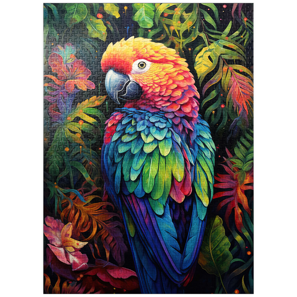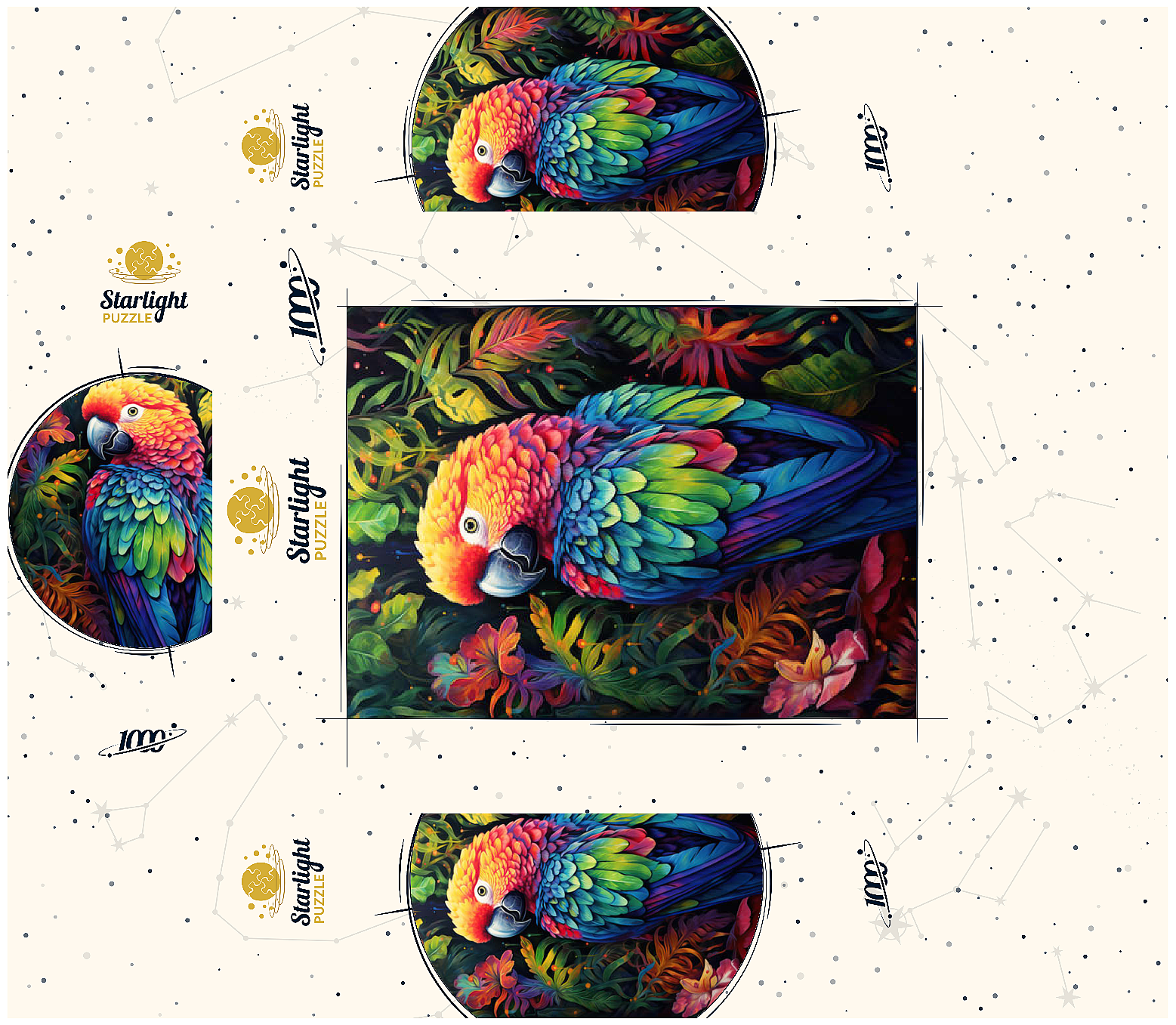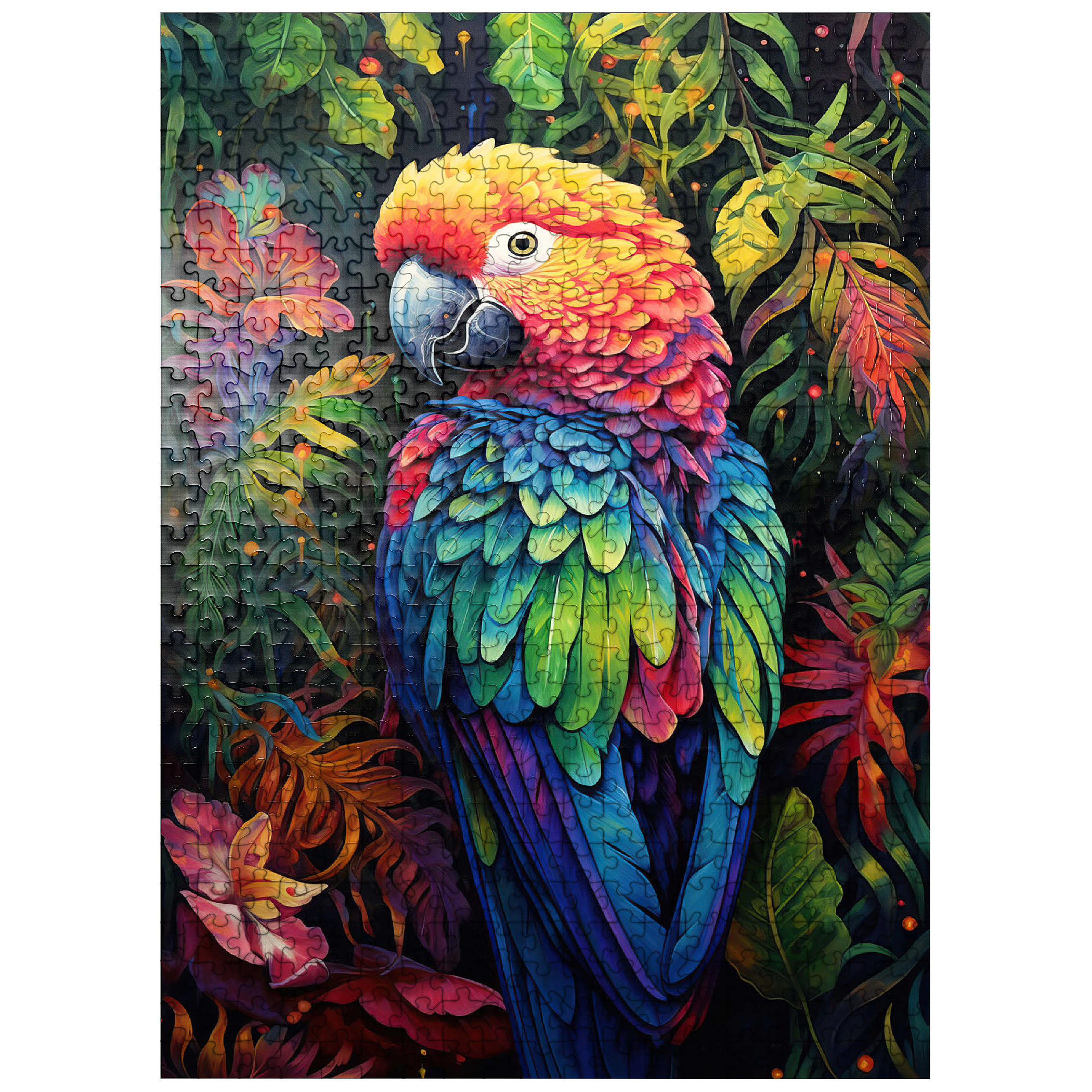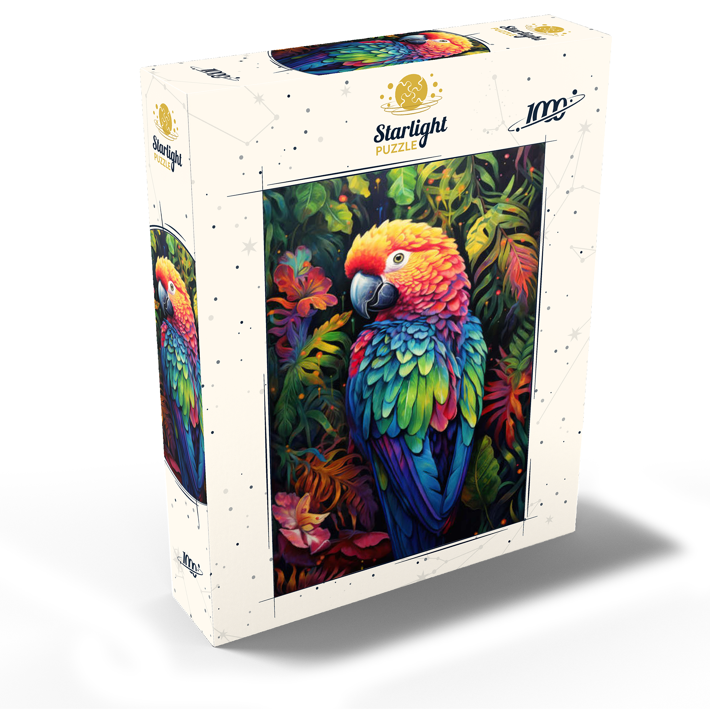 This stunning artwork captures the beauty of a scarlet macaw with an explosion of vibrant colors, set against a lush tropical jungle. The intricate feather details showcase a mesmerizing blend of red, blue, green, and yellow, creating a striking visual masterpiece. The exotic foliage and deep rainforest hues enhance the parrot's regal presence, making this a perfect piece for nature and bird lovers. Ideal for those who appreciate wildlife art, tropical aesthetics, and colorful, detailed illustrations.