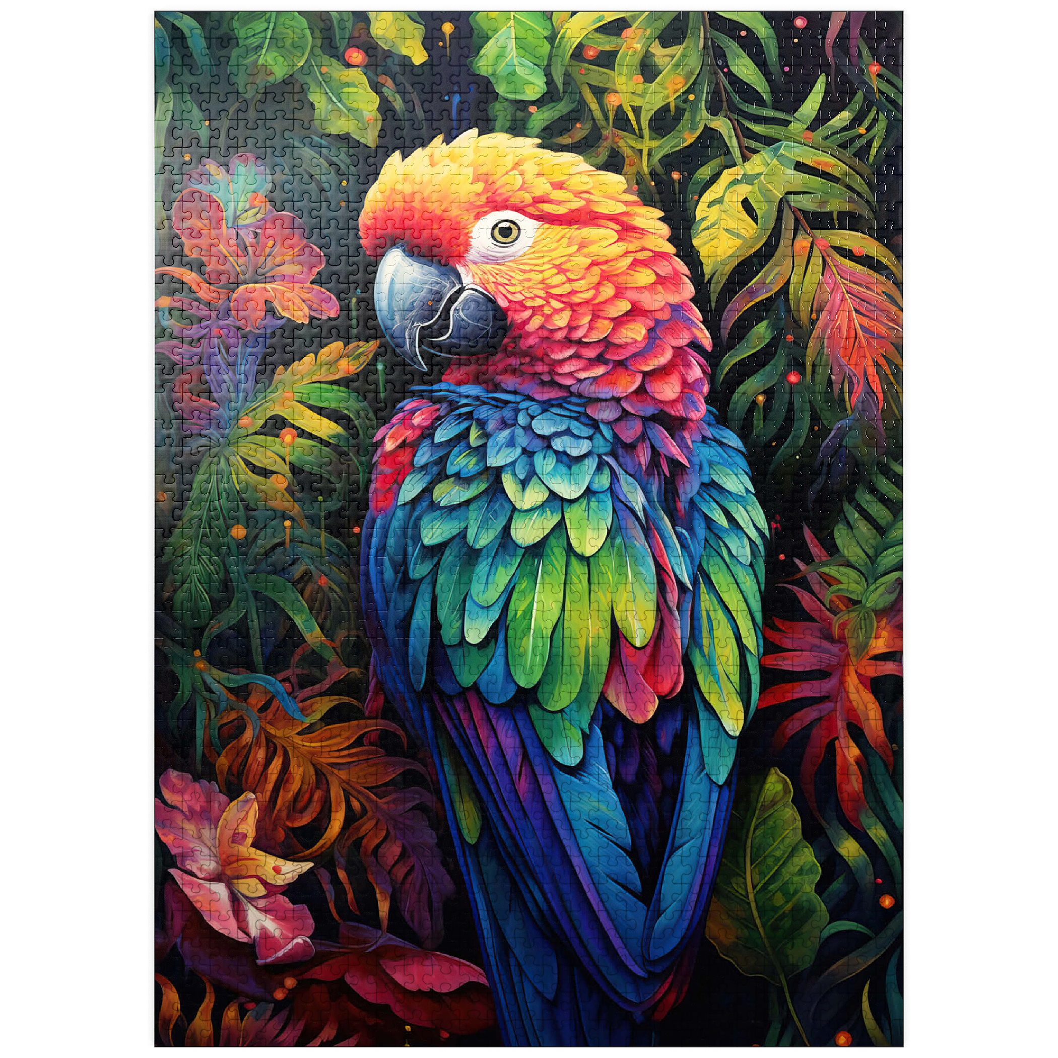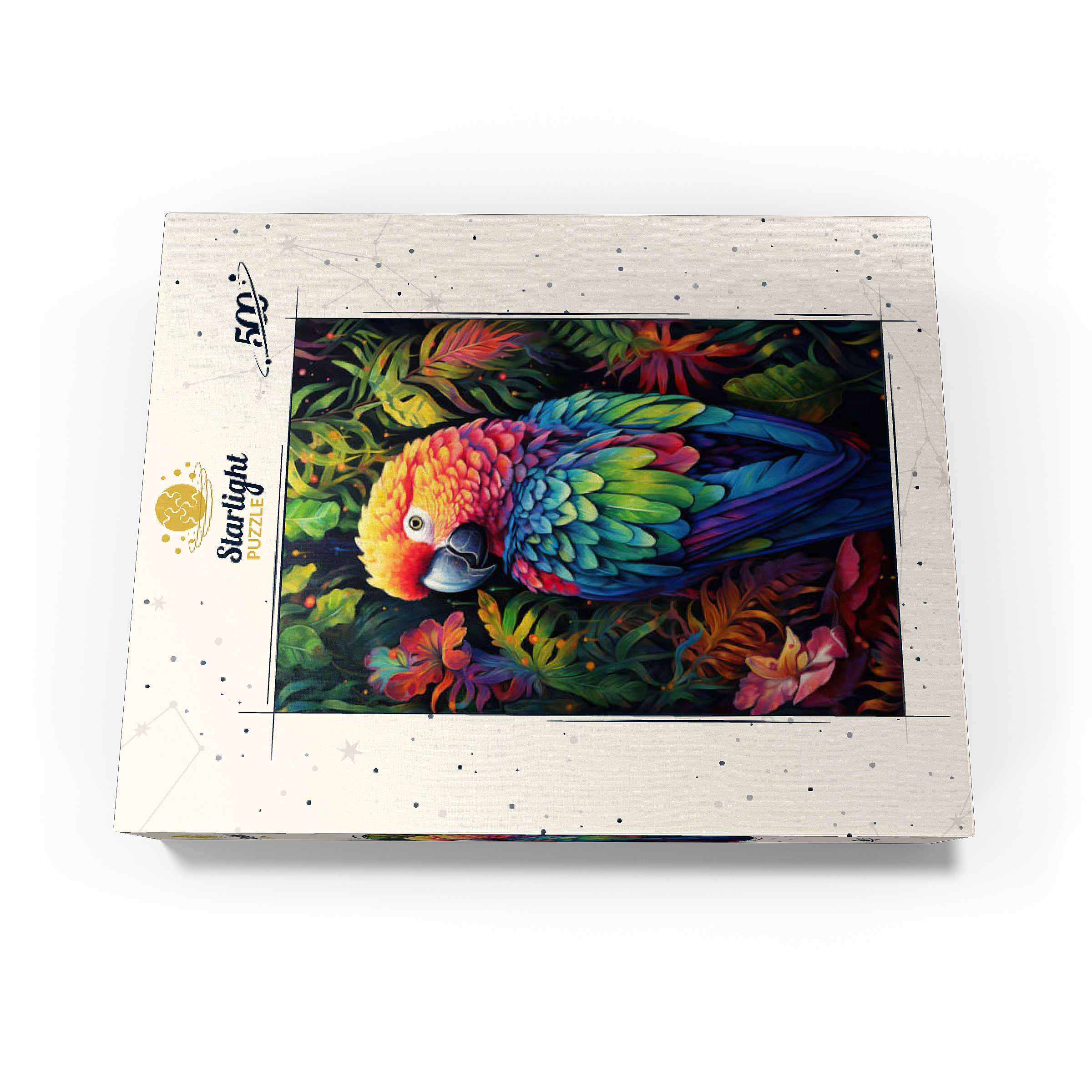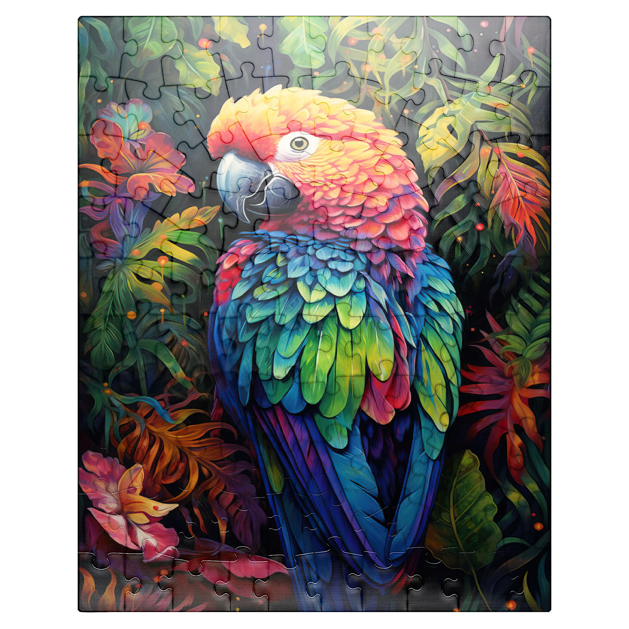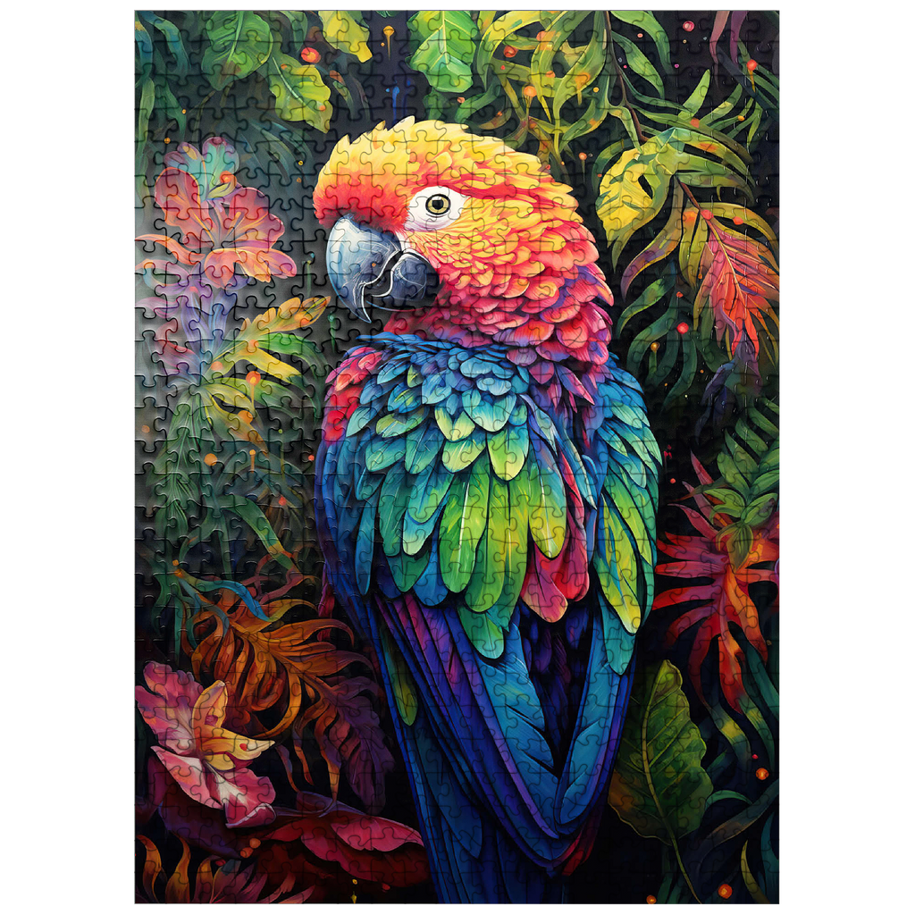 This stunning artwork captures the beauty of a scarlet macaw with an explosion of vibrant colors, set against a lush tropical jungle. The intricate feather details showcase a mesmerizing blend of red, blue, green, and yellow, creating a striking visual masterpiece. The exotic foliage and deep rainforest hues enhance the parrot's regal presence, making this a perfect piece for nature and bird lovers. Ideal for those who appreciate wildlife art, tropical aesthetics, and colorful, detailed illustrations.