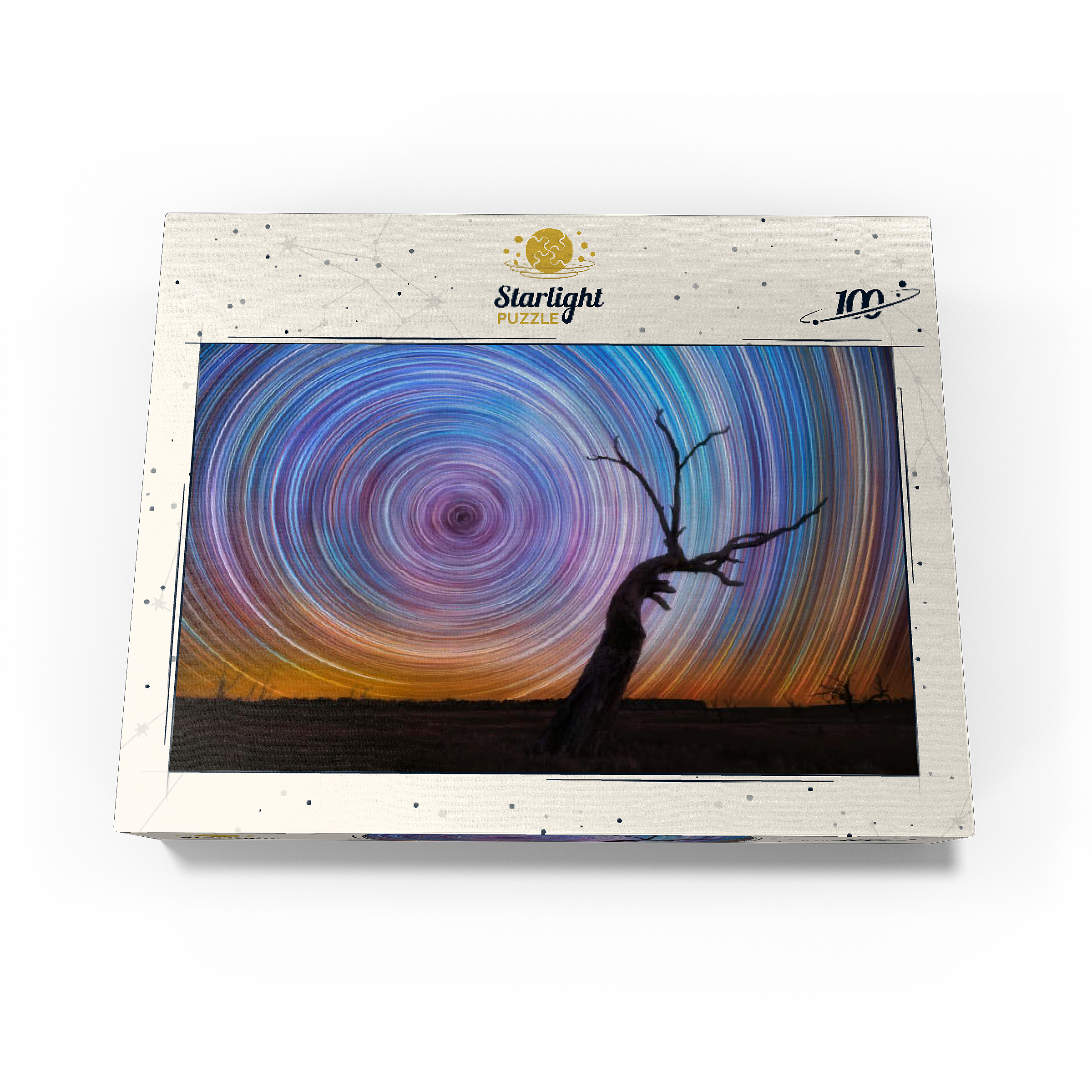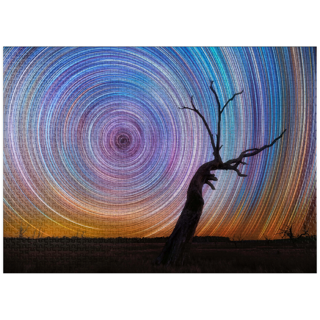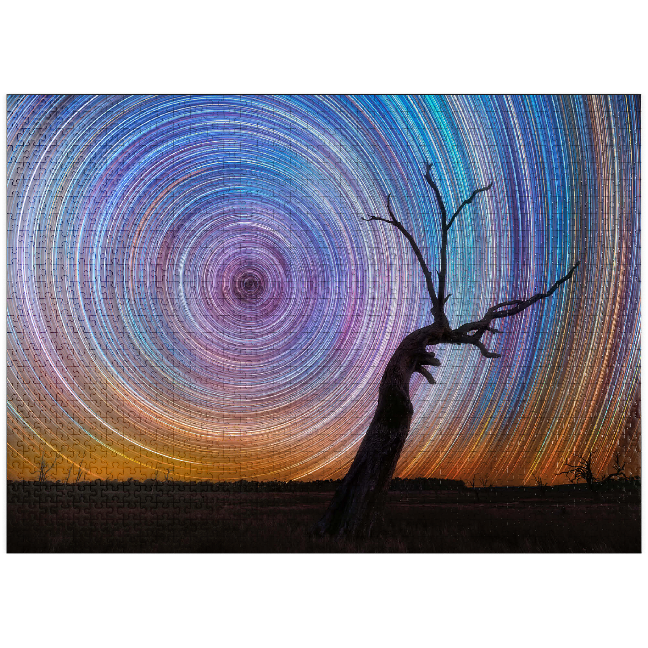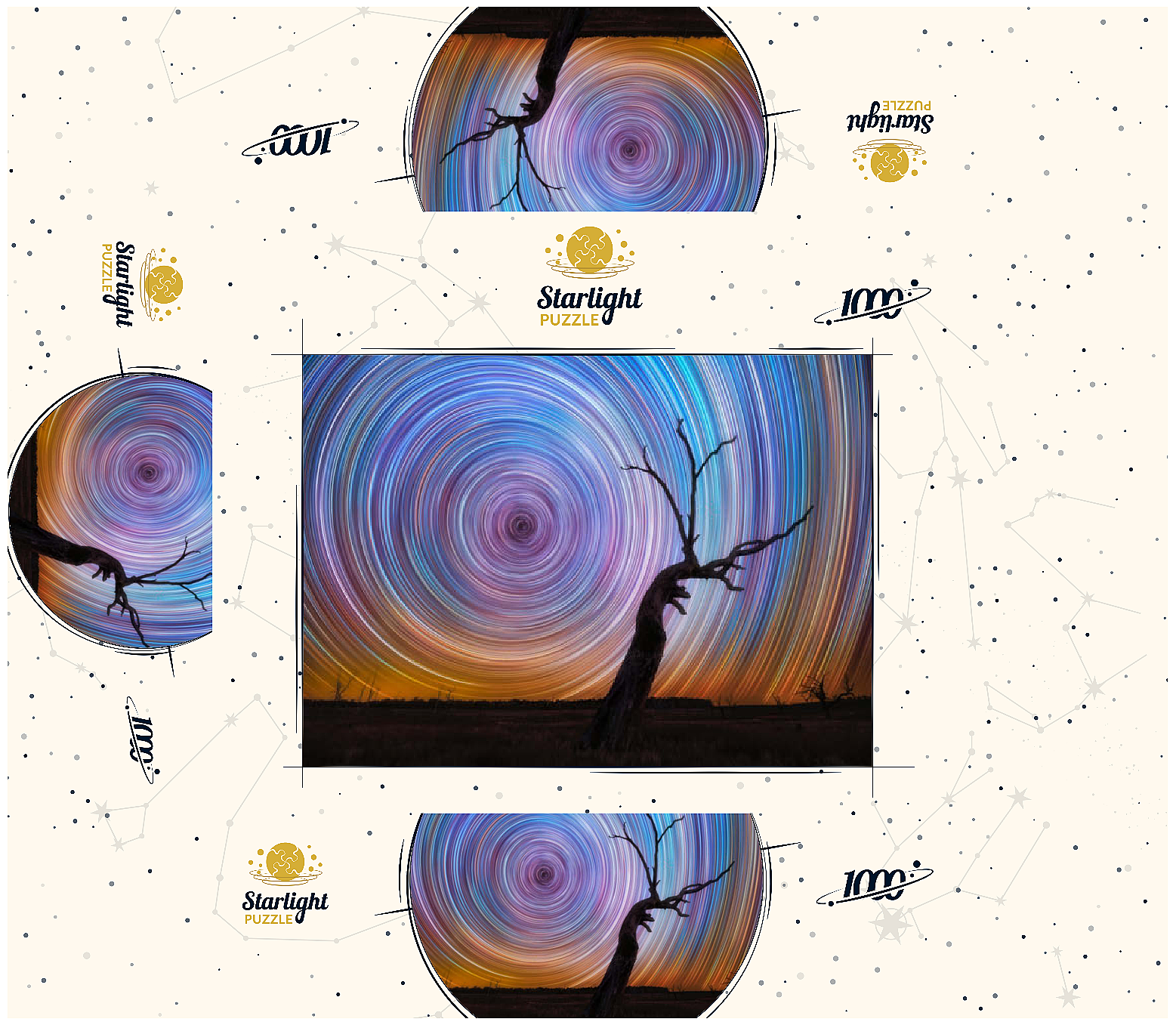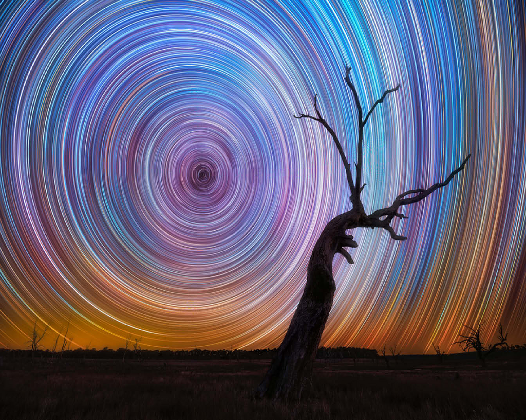 This mesmerizing nightscape features a dramatic swirl of colorful star trails rotating above a lone, twisted tree in the Australian outback. Captured with long-exposure photography, the sky transforms into a vortex of vivid purples, blues, oranges, and yellows, radiating outward in perfect circular motion. The silhouette of the gnarled tree in the foreground adds a raw, organic element, creating a powerful contrast against the cosmic patterns above. Set against a deep horizon and a dark, quiet field, this celestial masterpiece highlights the beauty of astrophotography in remote, unspoiled landscapes. A captivating addition for astronomy lovers, stargazing enthusiasts, or fans of nature's grandeur.