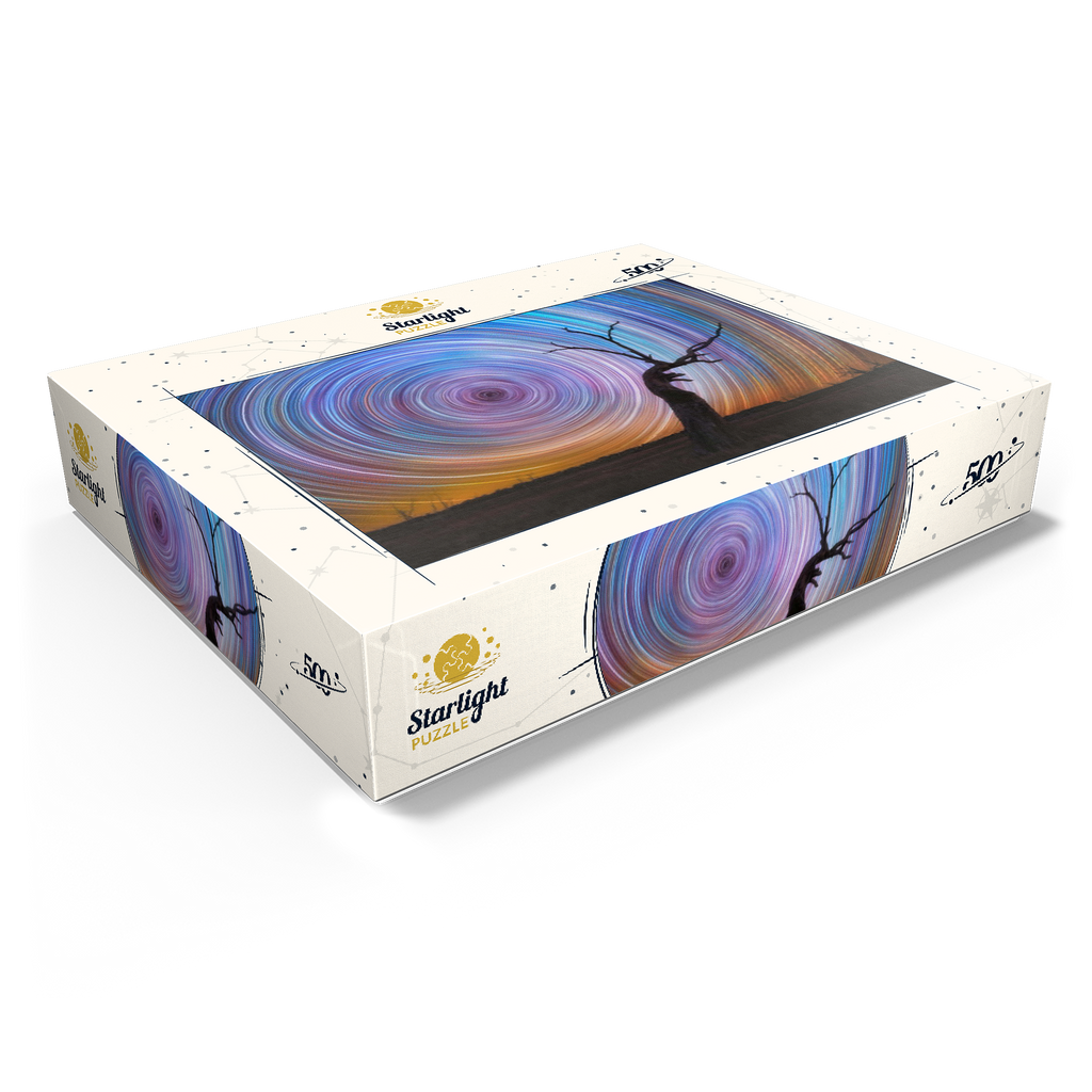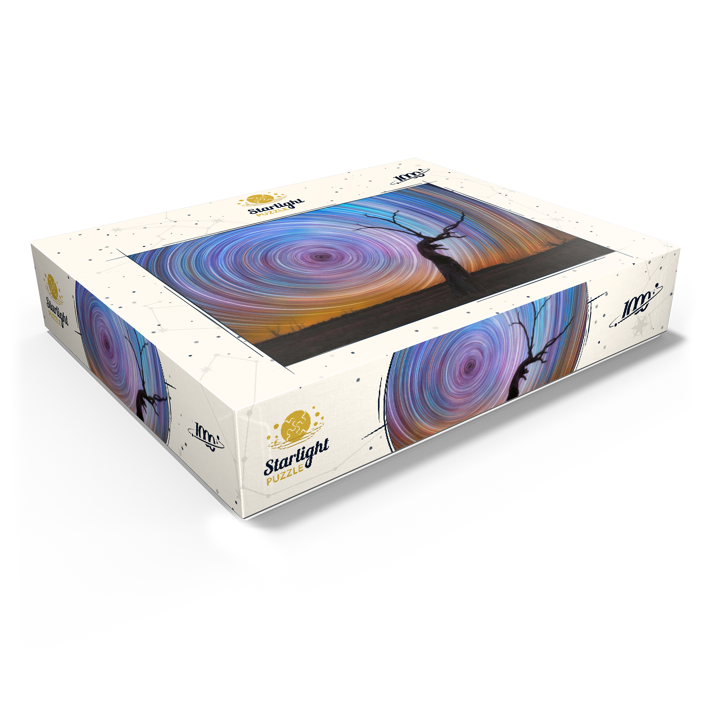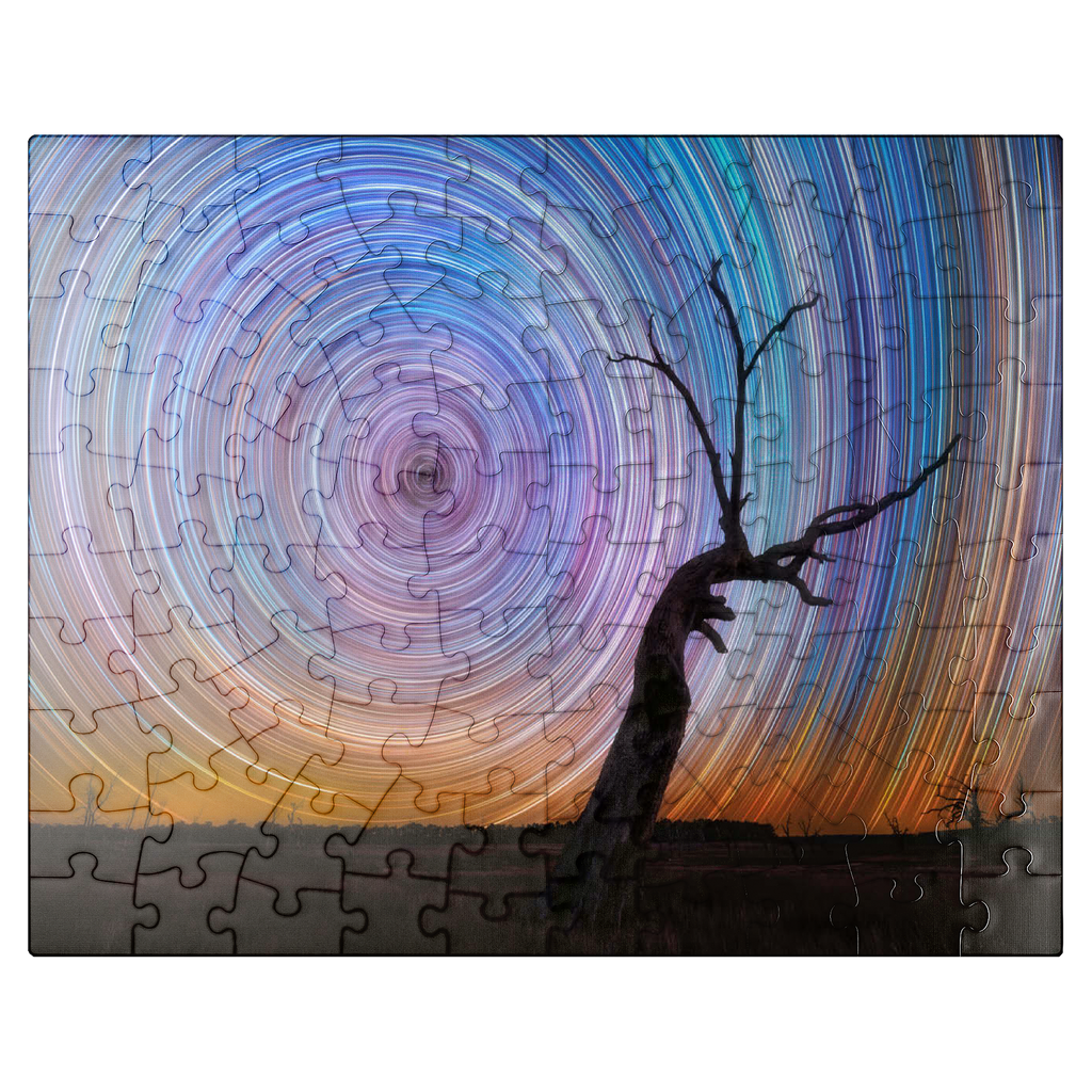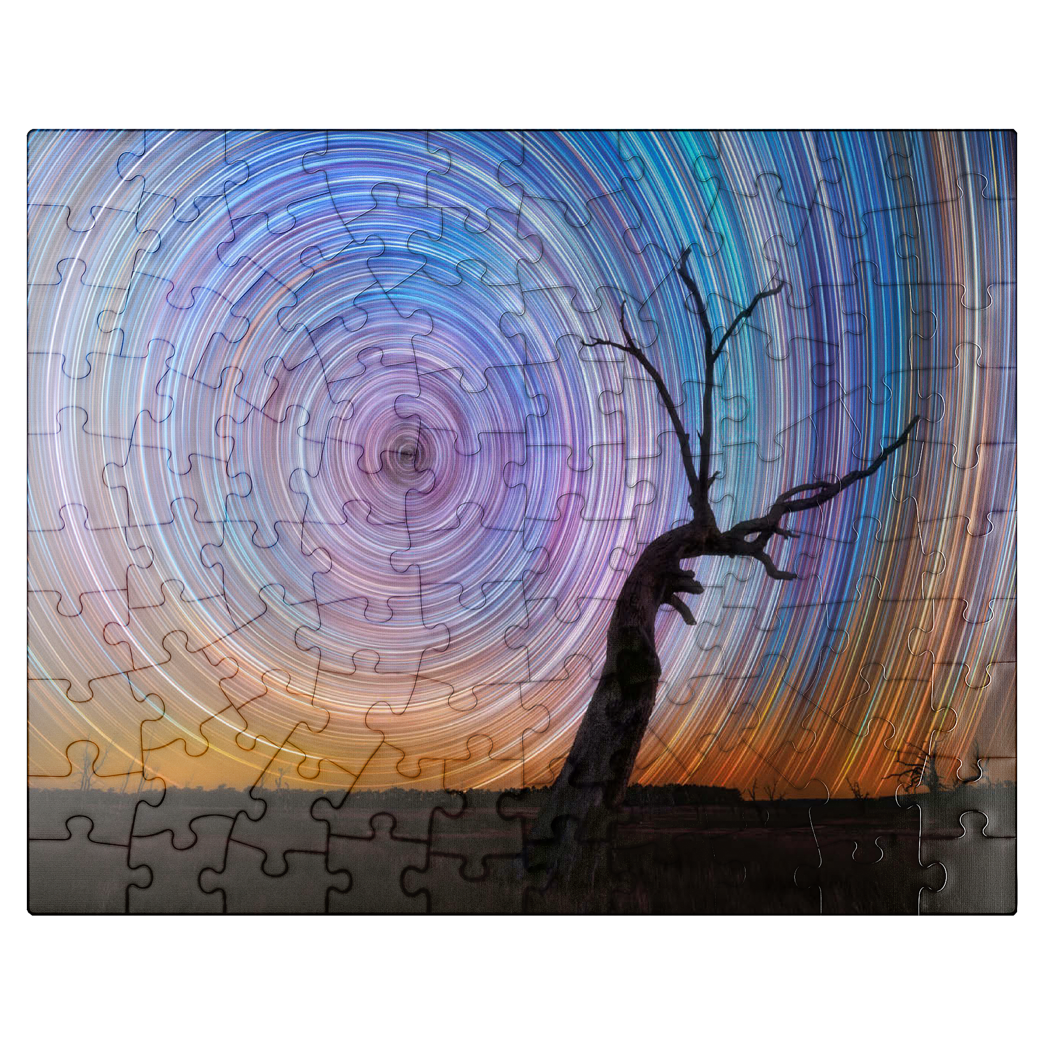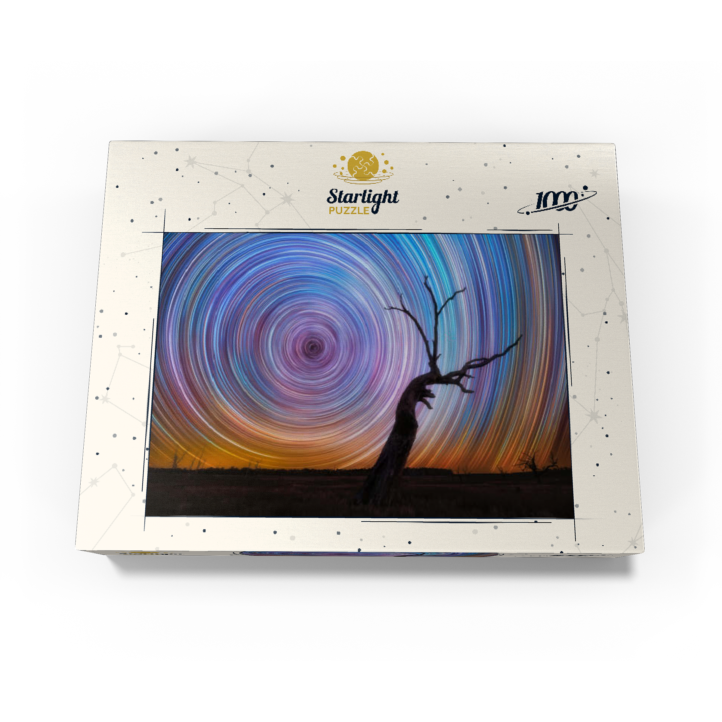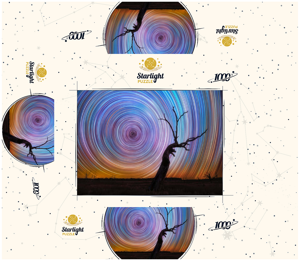 This mesmerizing nightscape features a dramatic swirl of colorful star trails rotating above a lone, twisted tree in the Australian outback. Captured with long-exposure photography, the sky transforms into a vortex of vivid purples, blues, oranges, and yellows, radiating outward in perfect circular motion. The silhouette of the gnarled tree in the foreground adds a raw, organic element, creating a powerful contrast against the cosmic patterns above. Set against a deep horizon and a dark, quiet field, this celestial masterpiece highlights the beauty of astrophotography in remote, unspoiled landscapes. A captivating addition for astronomy lovers, stargazing enthusiasts, or fans of nature's grandeur.