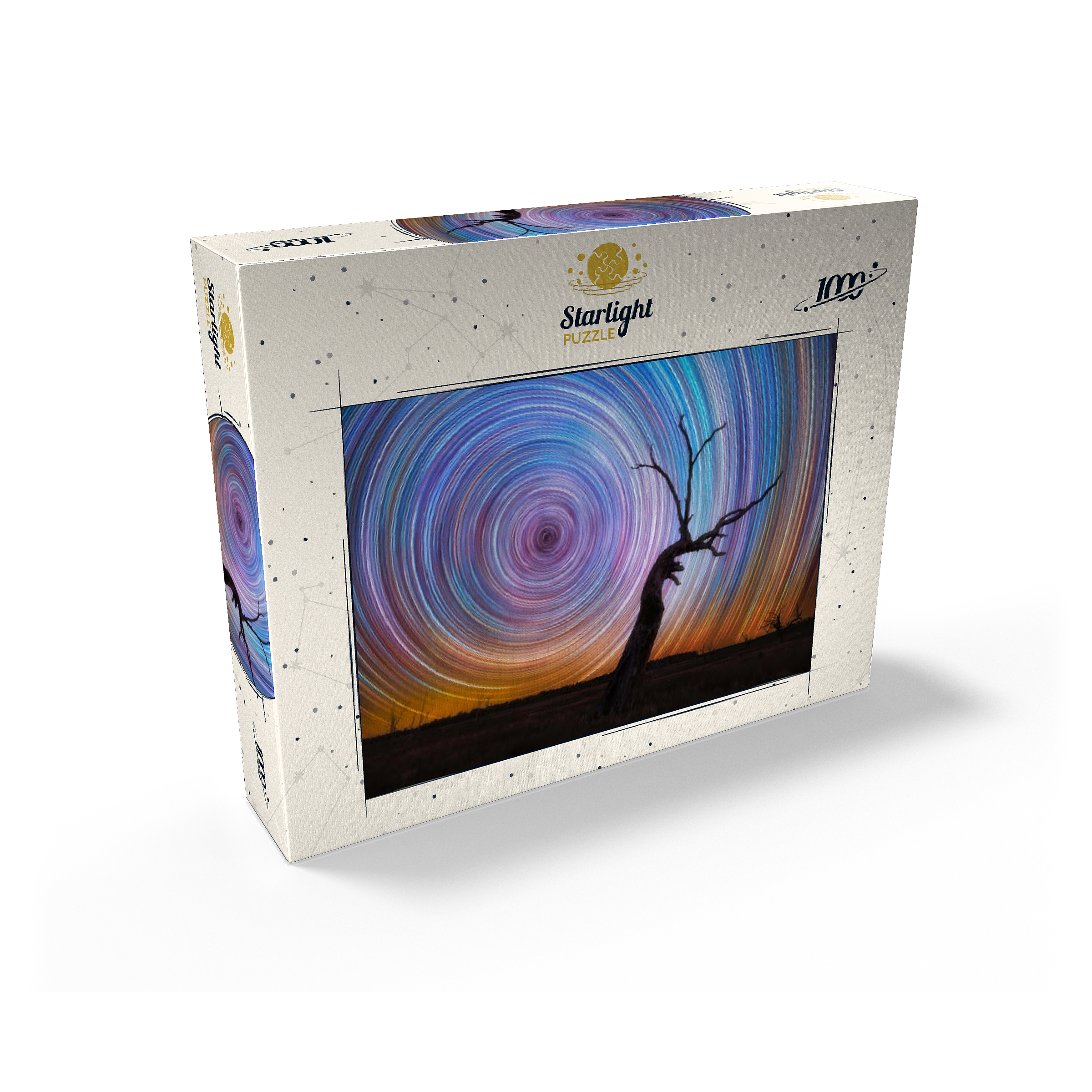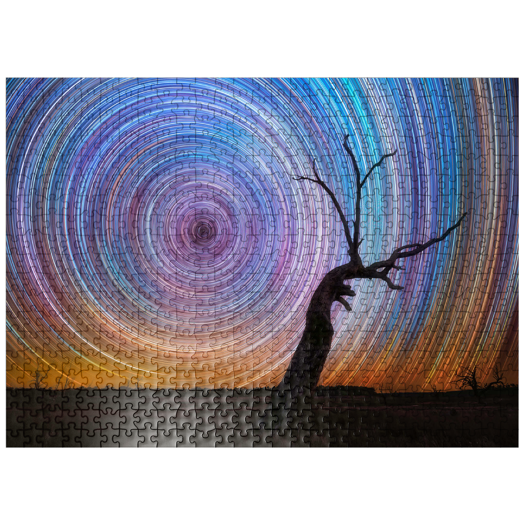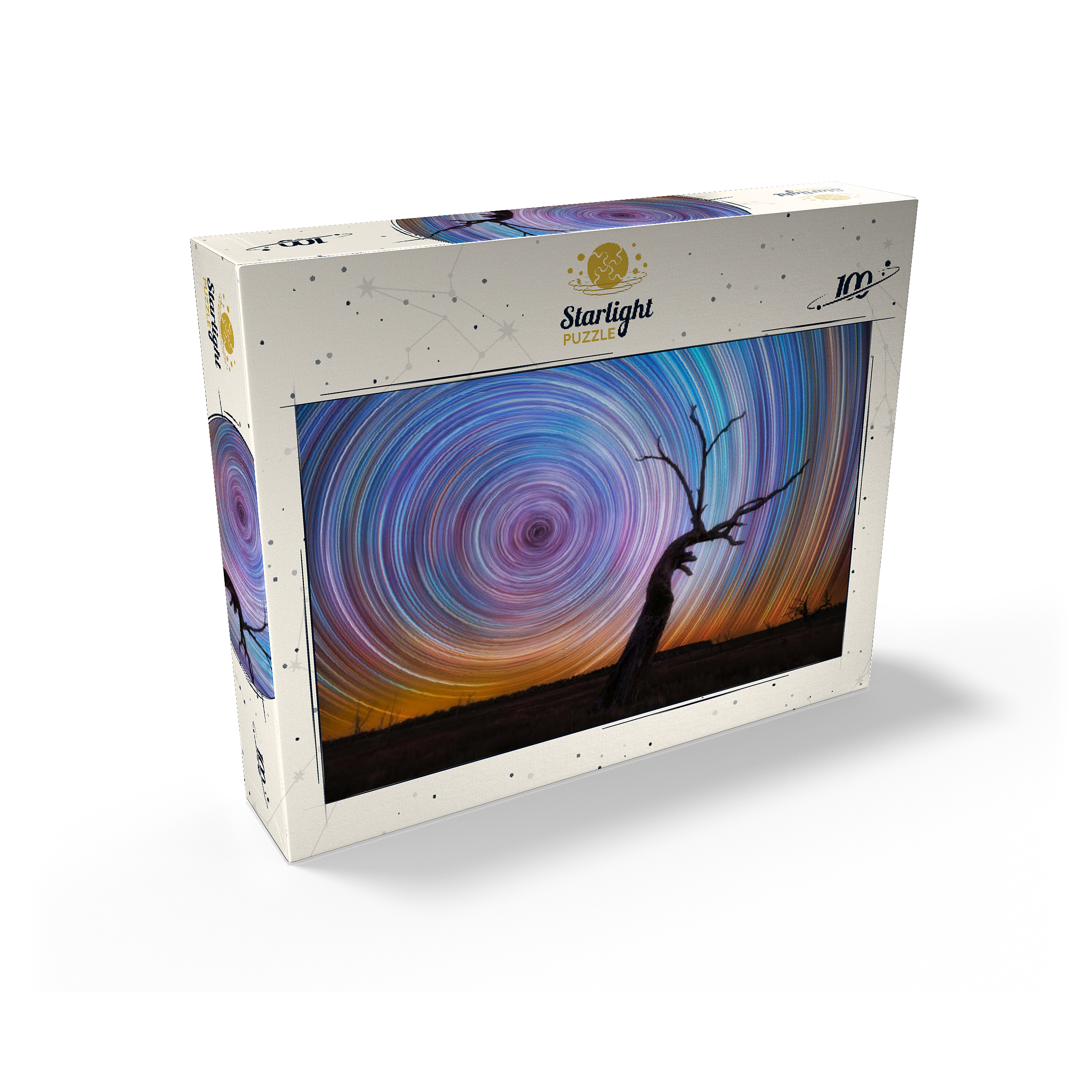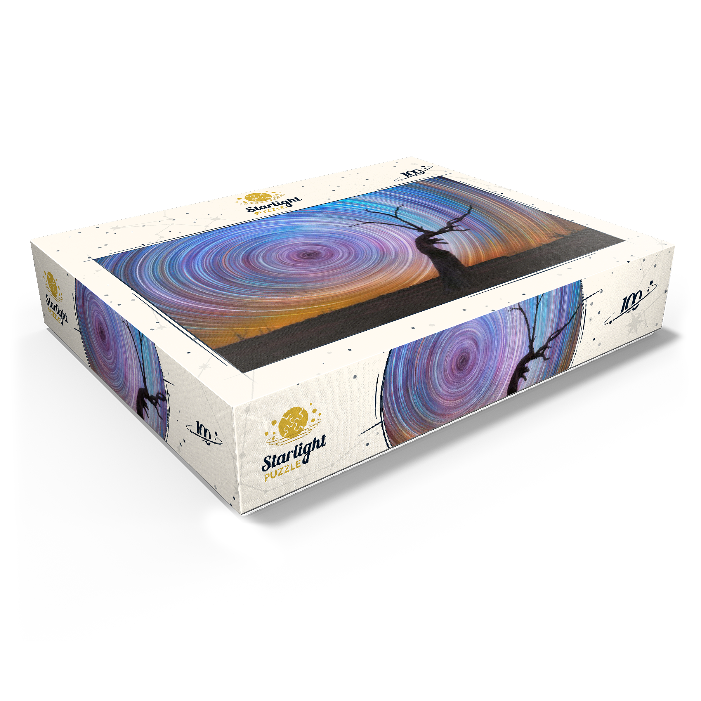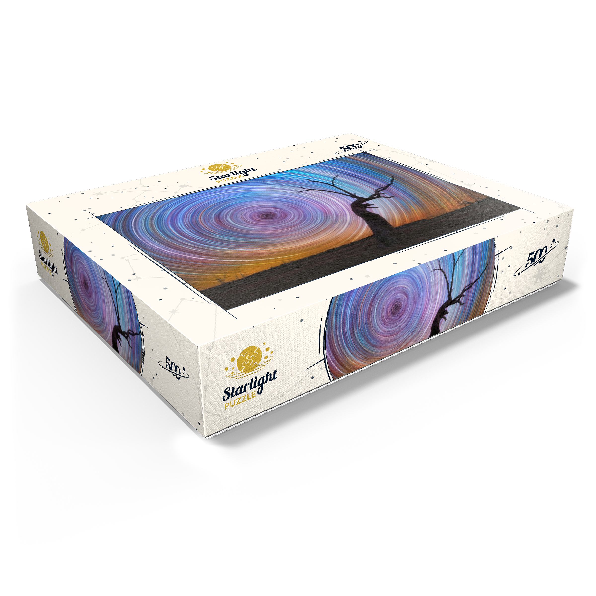 This mesmerizing nightscape features a dramatic swirl of colorful star trails rotating above a lone, twisted tree in the Australian outback. Captured with long-exposure photography, the sky transforms into a vortex of vivid purples, blues, oranges, and yellows, radiating outward in perfect circular motion. The silhouette of the gnarled tree in the foreground adds a raw, organic element, creating a powerful contrast against the cosmic patterns above. Set against a deep horizon and a dark, quiet field, this celestial masterpiece highlights the beauty of astrophotography in remote, unspoiled landscapes. A captivating addition for astronomy lovers, stargazing enthusiasts, or fans of nature's grandeur.
