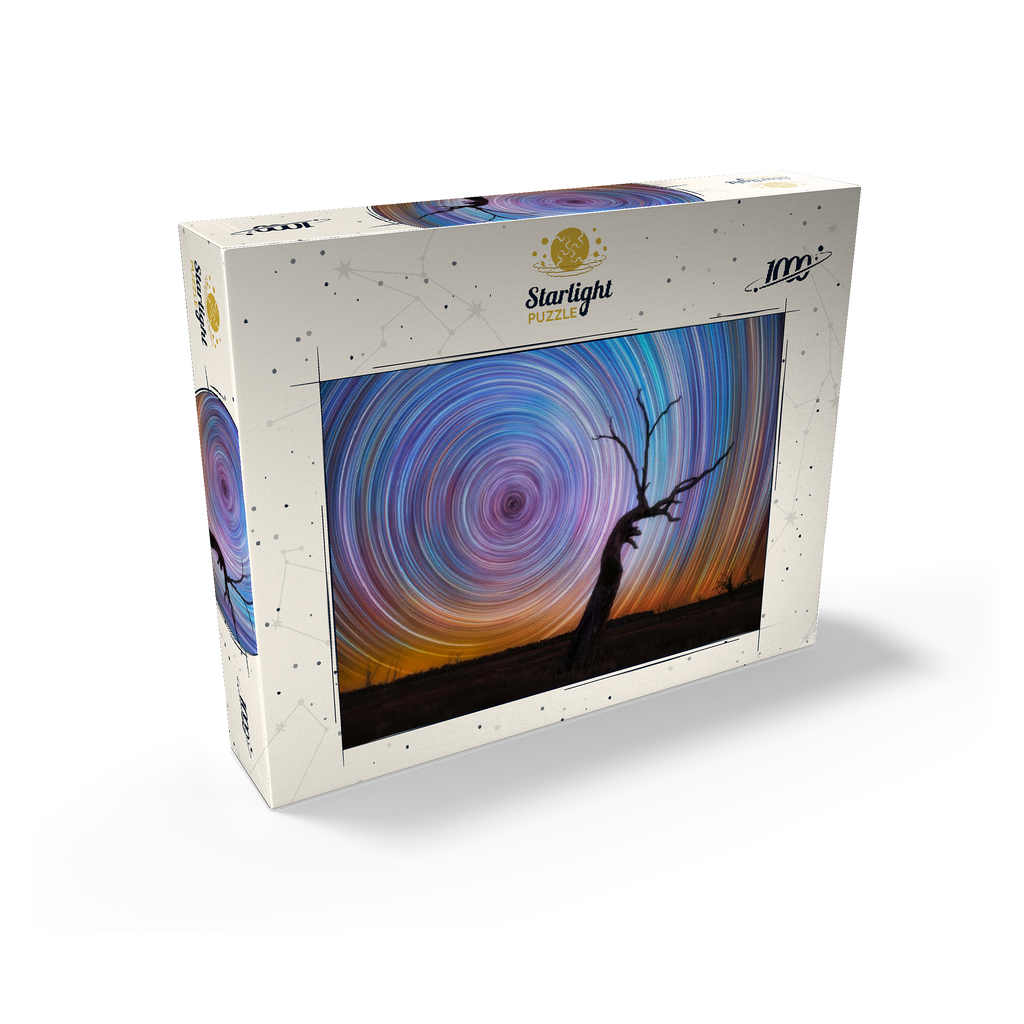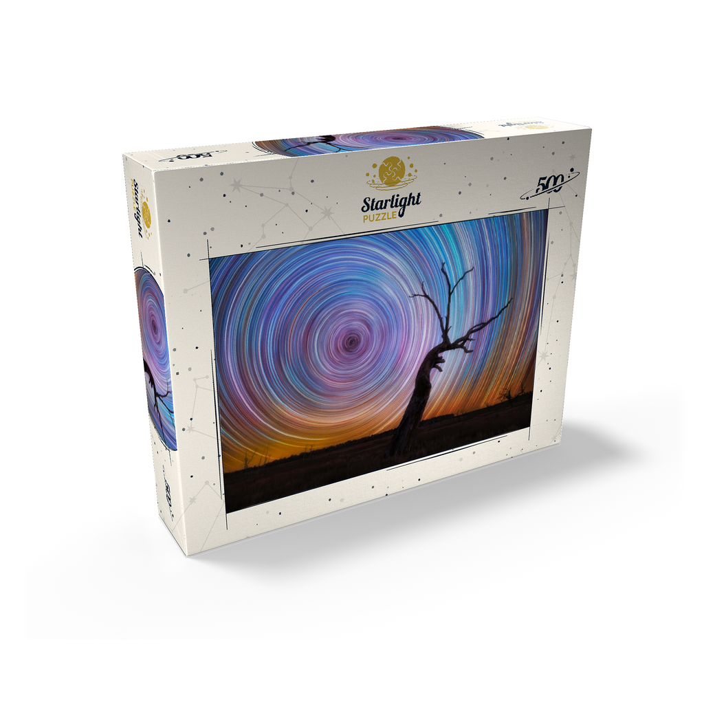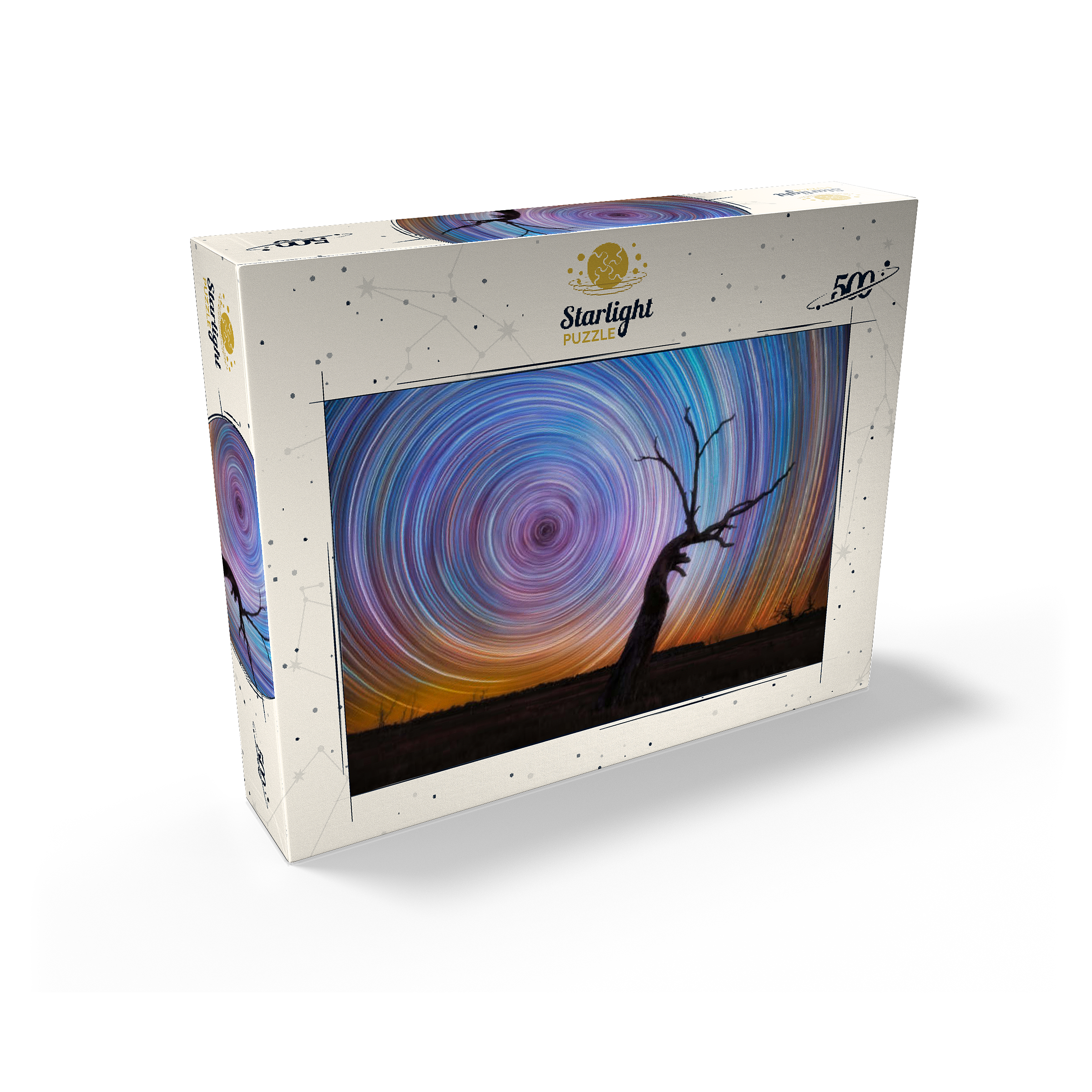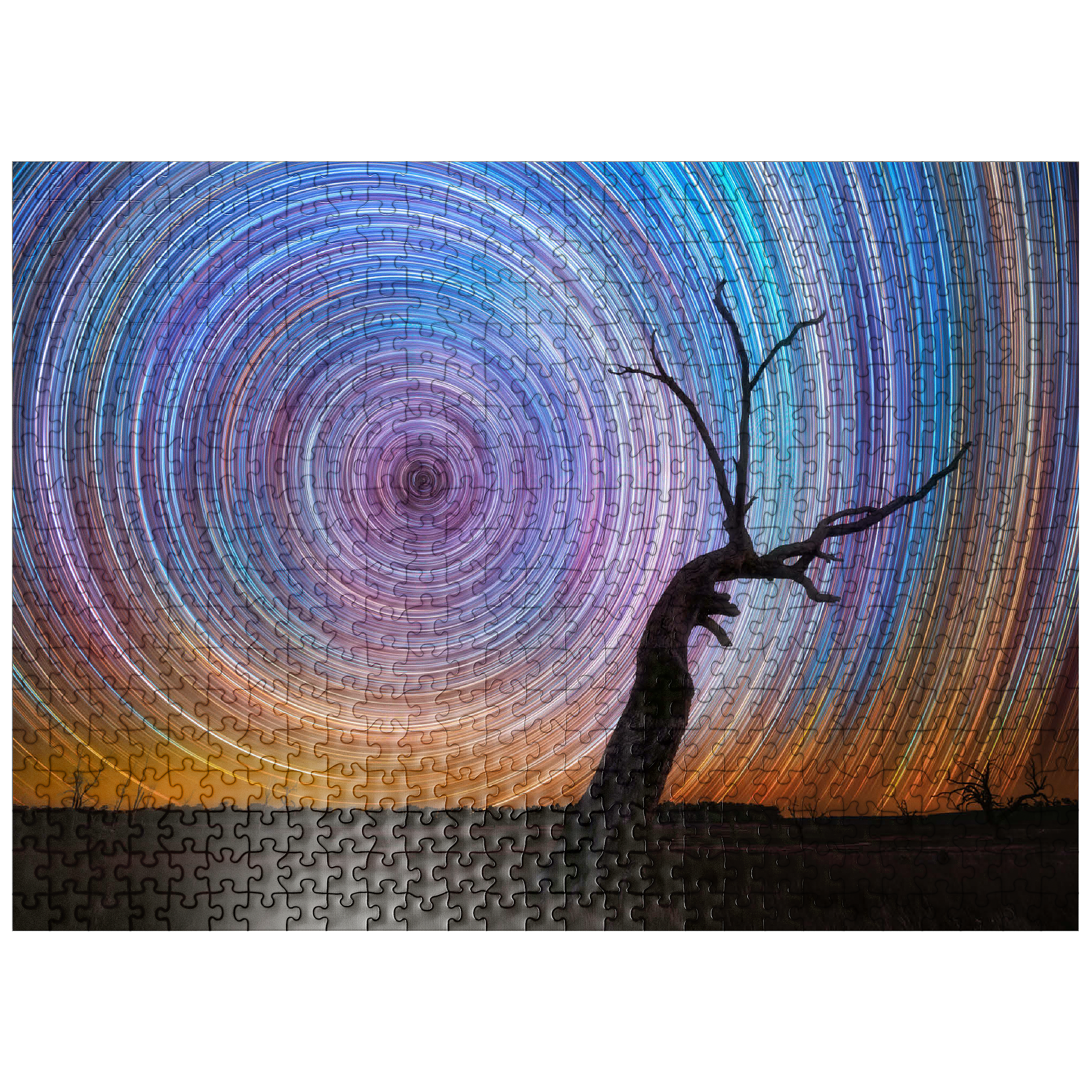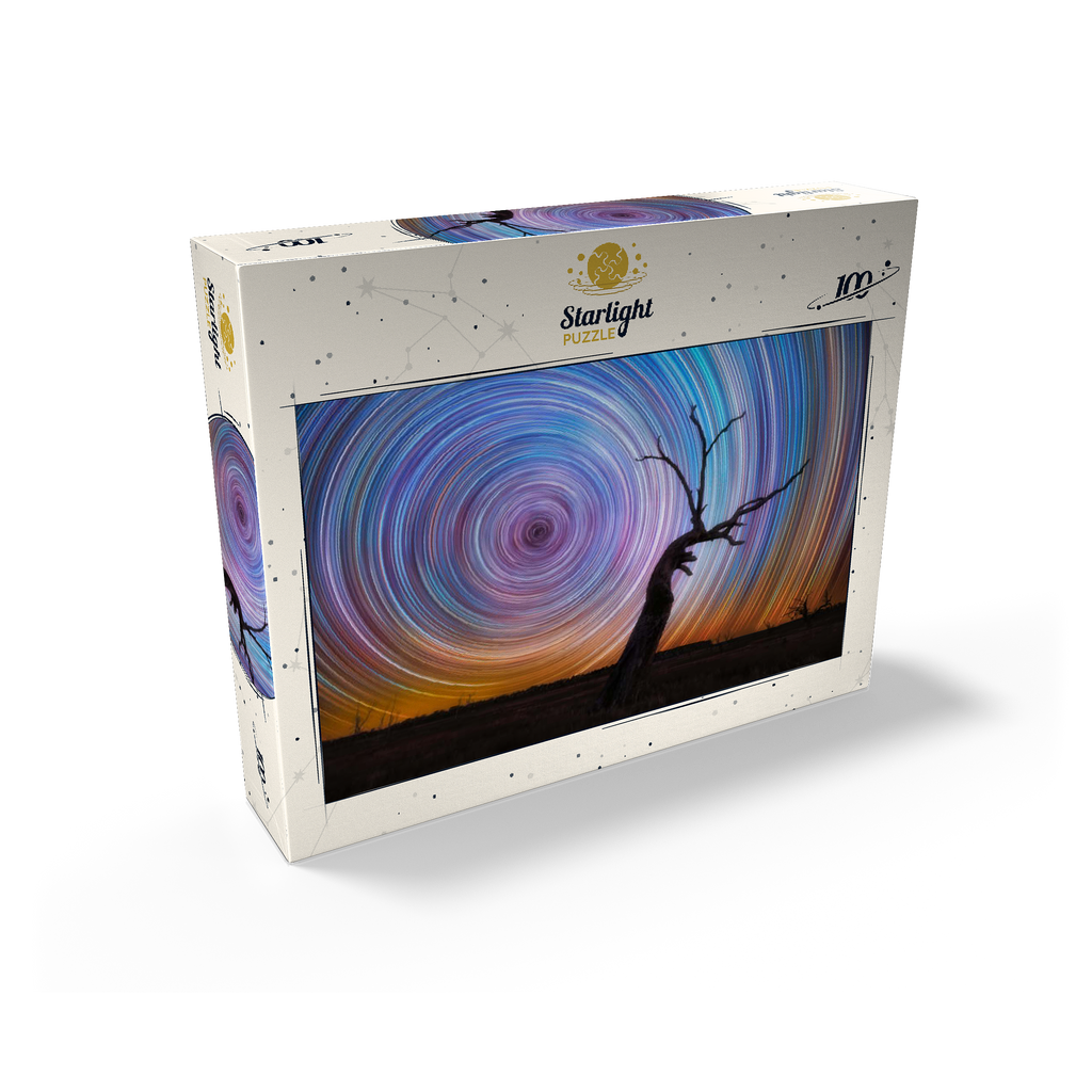This mesmerizing nightscape features a dramatic swirl of colorful star trails rotating above a lone, twisted tree in the Australian outback. Captured with long-exposure photography, the sky transforms into a vortex of vivid purples, blues, oranges, and yellows, radiating outward in perfect circular motion. The silhouette of the gnarled tree in the foreground adds a raw, organic element, creating a powerful contrast against the cosmic patterns above. Set against a deep horizon and a dark, quiet field, this celestial masterpiece highlights the beauty of astrophotography in remote, unspoiled landscapes. A captivating addition for astronomy lovers, stargazing enthusiasts, or fans of nature's grandeur.