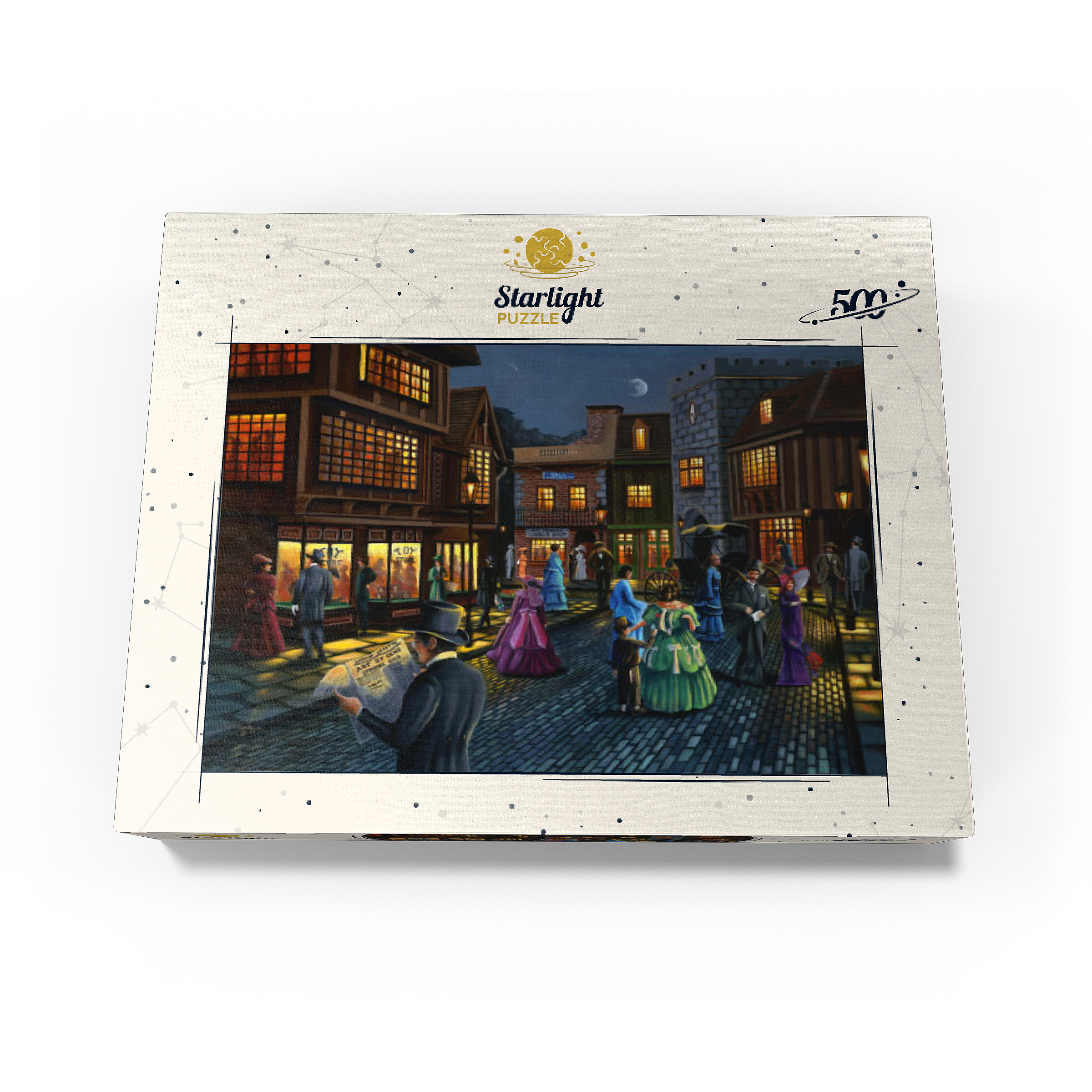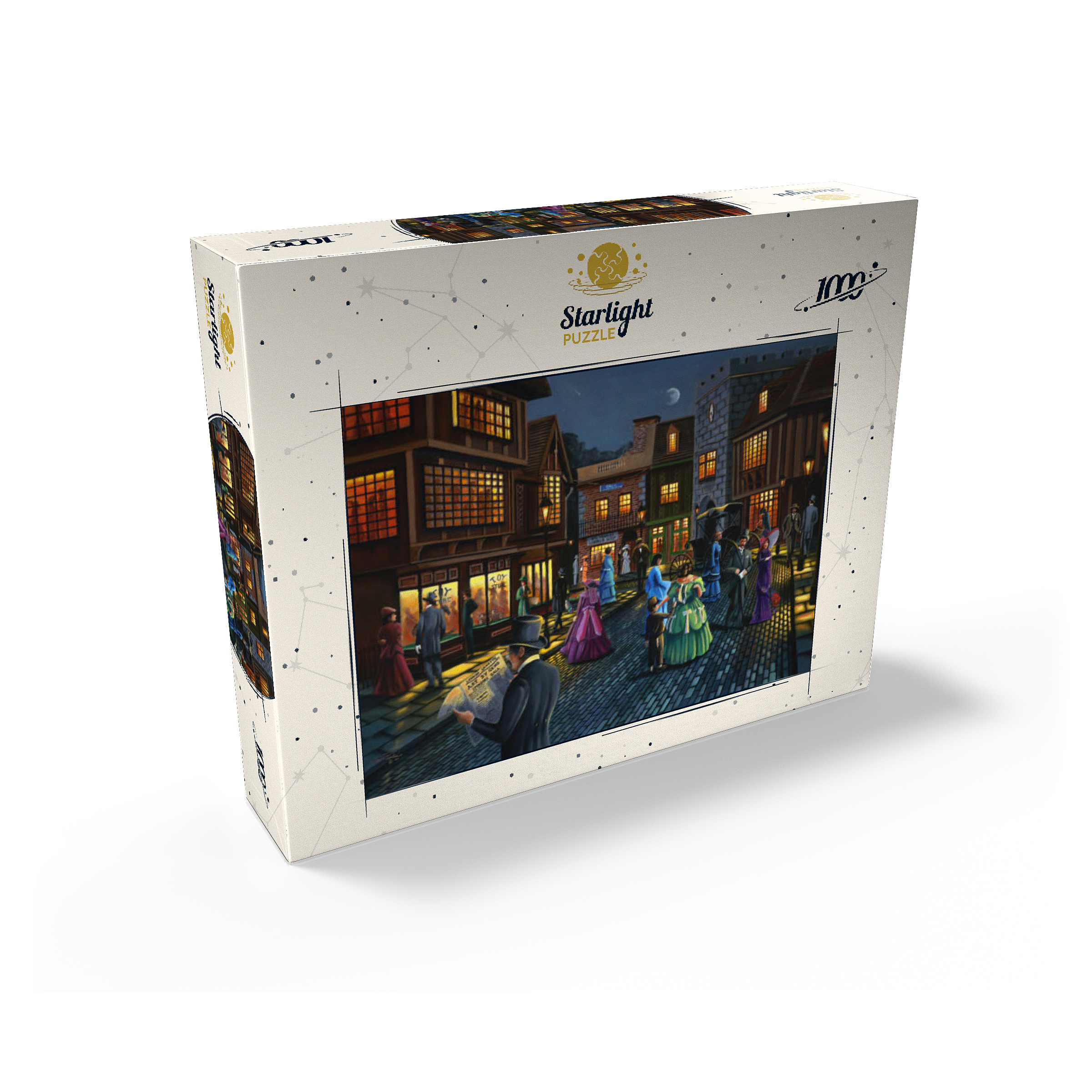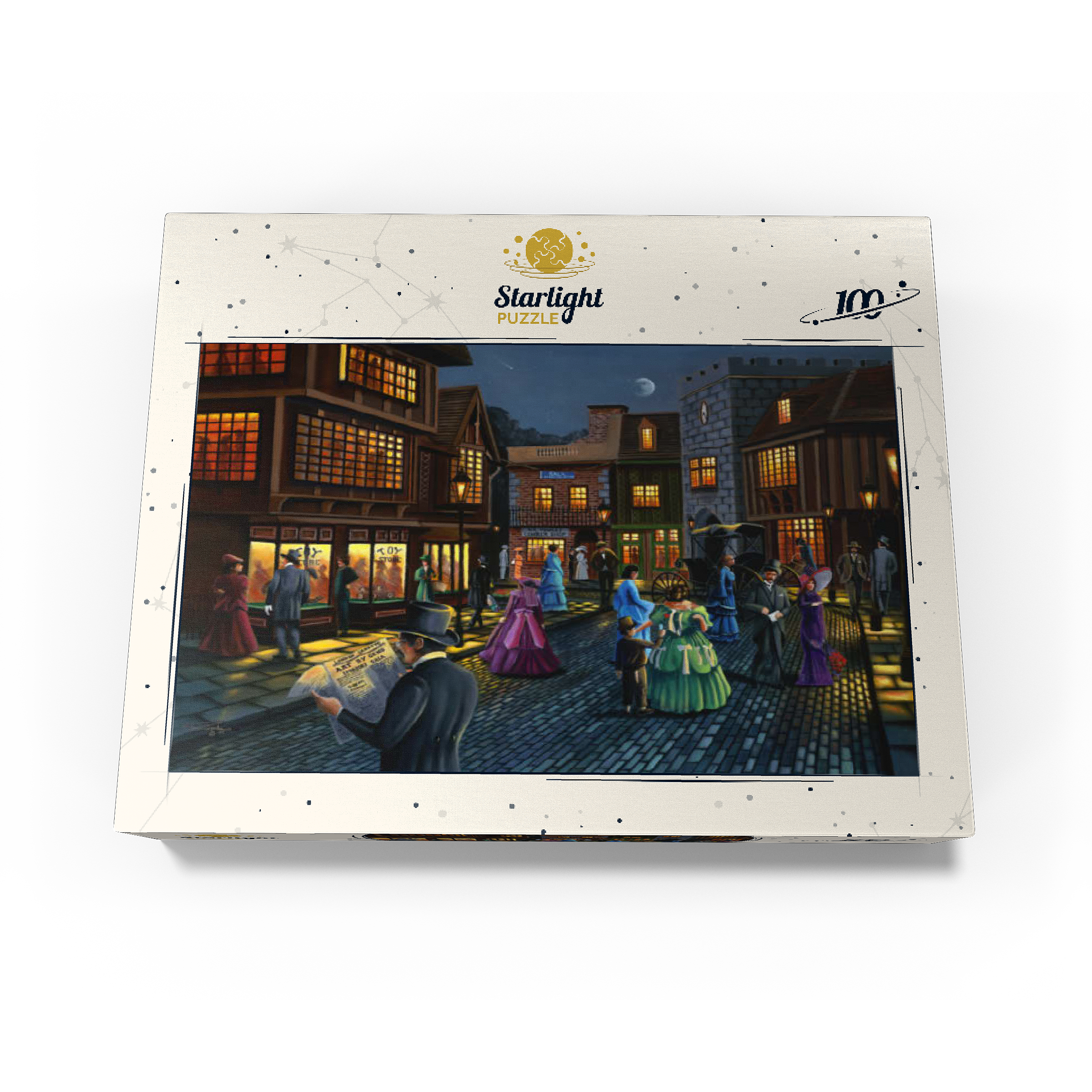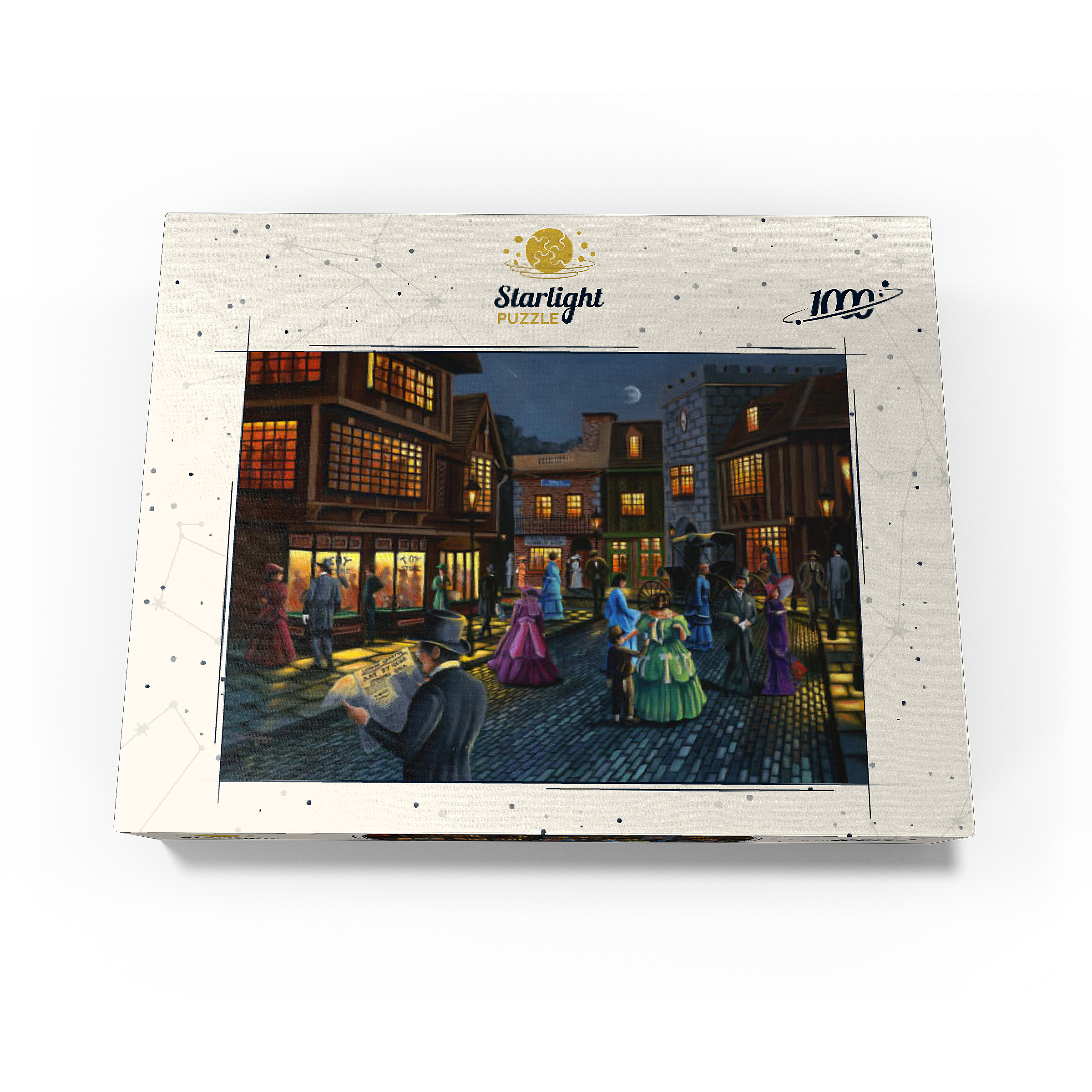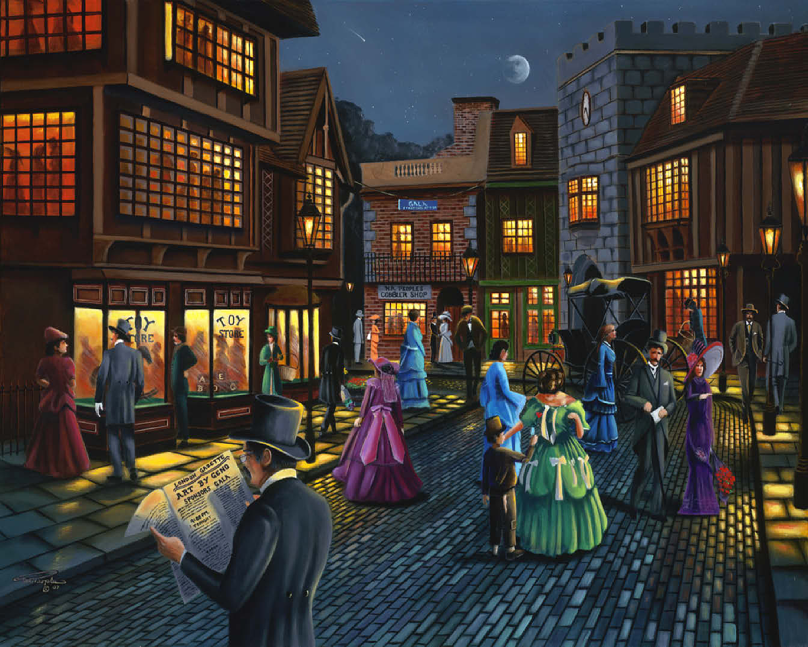 This nostalgic night scene depicts a lively Victorian-era town bathed in warm lamplight beneath a crescent moon. Elegantly dressed figures stroll along cobblestone streets, while a man reads a newspaper and others peer into glowing storefronts. A horse-drawn carriage adds charm to the bustling intersection, surrounded by brick and timber-framed buildings with glowing windows. The attention to period detail, from fashion to architecture, captures the essence of 19th-century urban life during a peaceful evening under the stars.