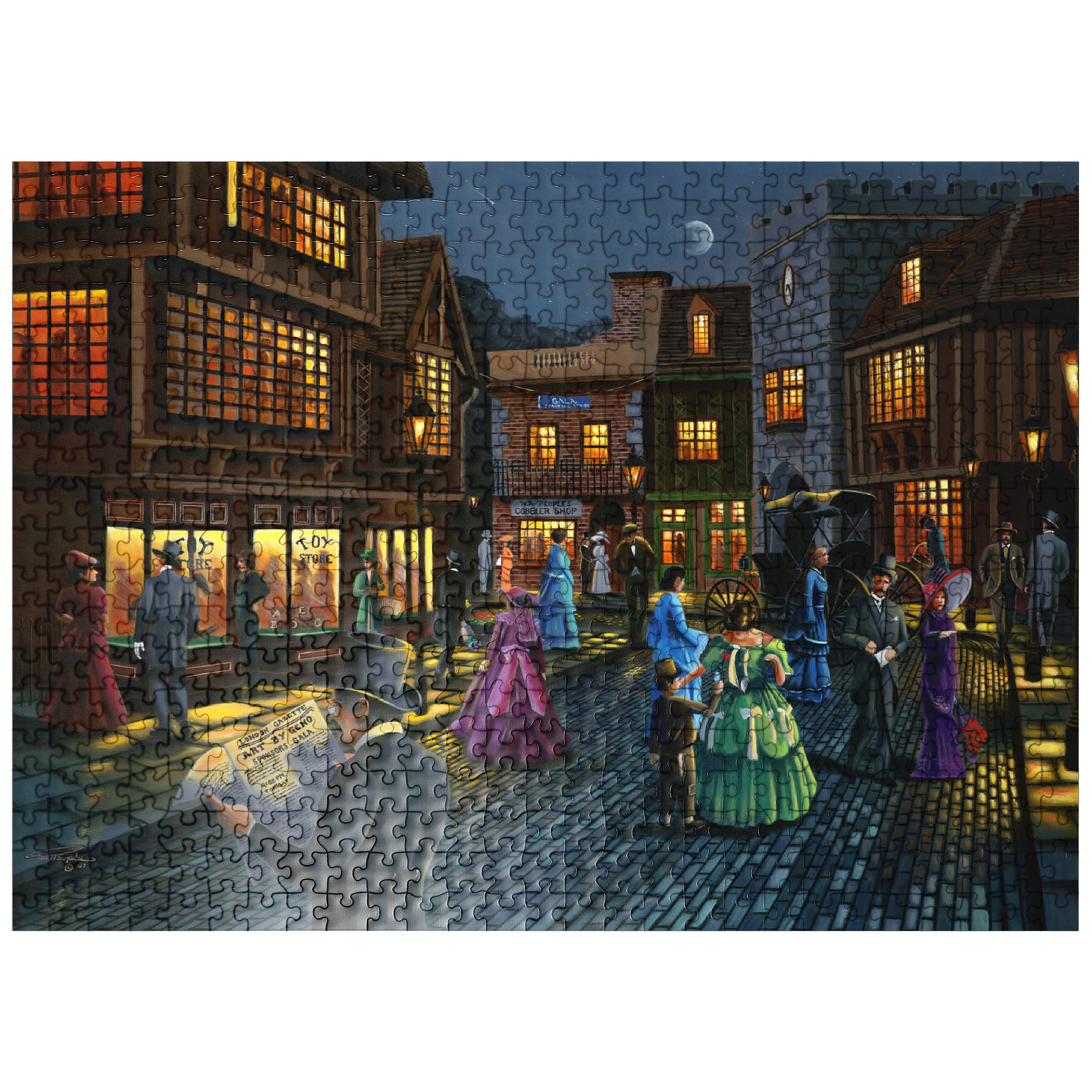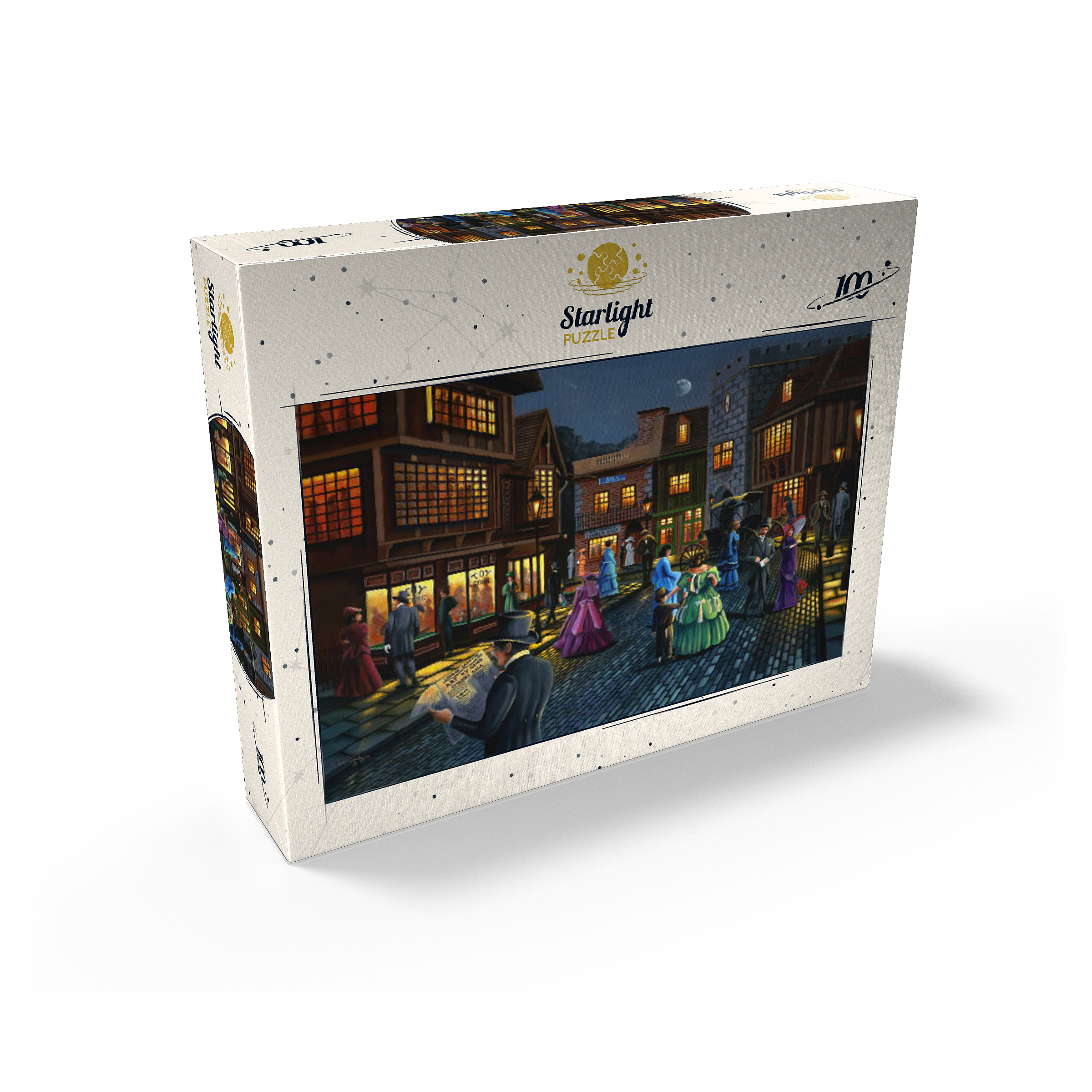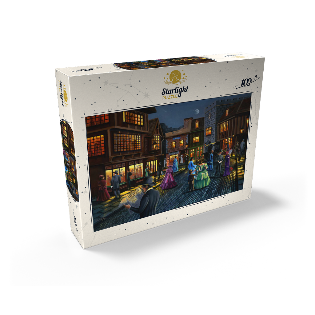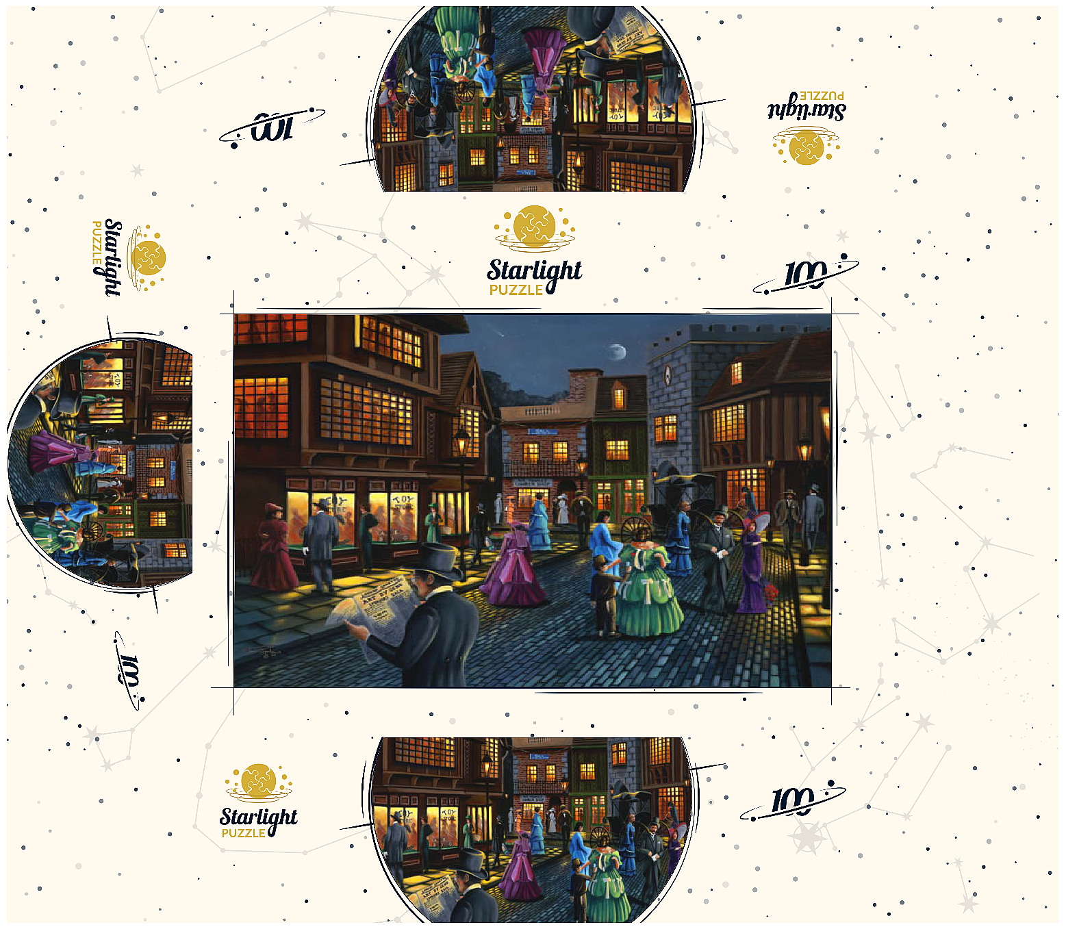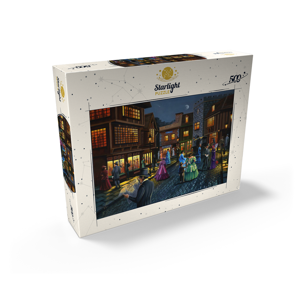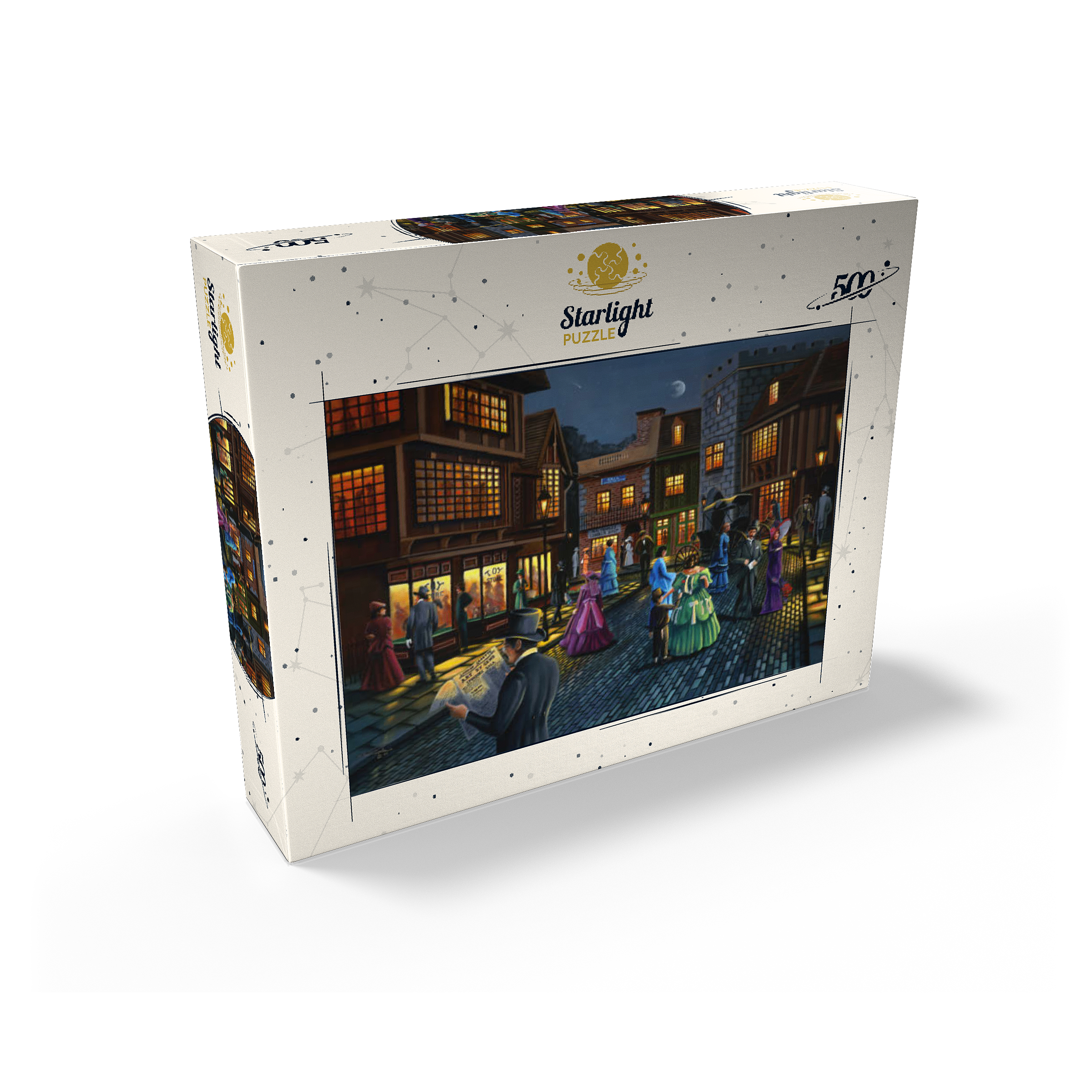 This nostalgic night scene depicts a lively Victorian-era town bathed in warm lamplight beneath a crescent moon. Elegantly dressed figures stroll along cobblestone streets, while a man reads a newspaper and others peer into glowing storefronts. A horse-drawn carriage adds charm to the bustling intersection, surrounded by brick and timber-framed buildings with glowing windows. The attention to period detail, from fashion to architecture, captures the essence of 19th-century urban life during a peaceful evening under the stars.