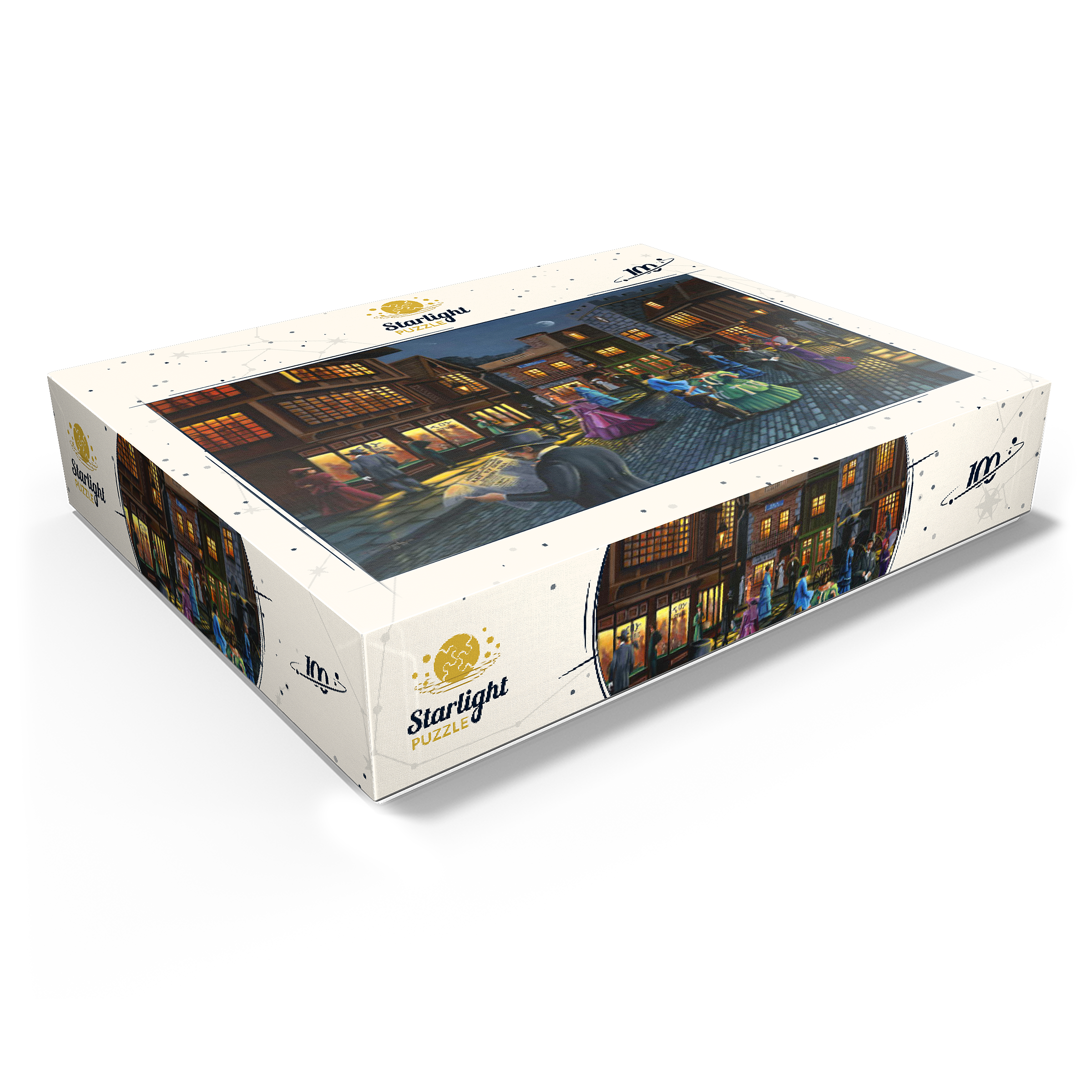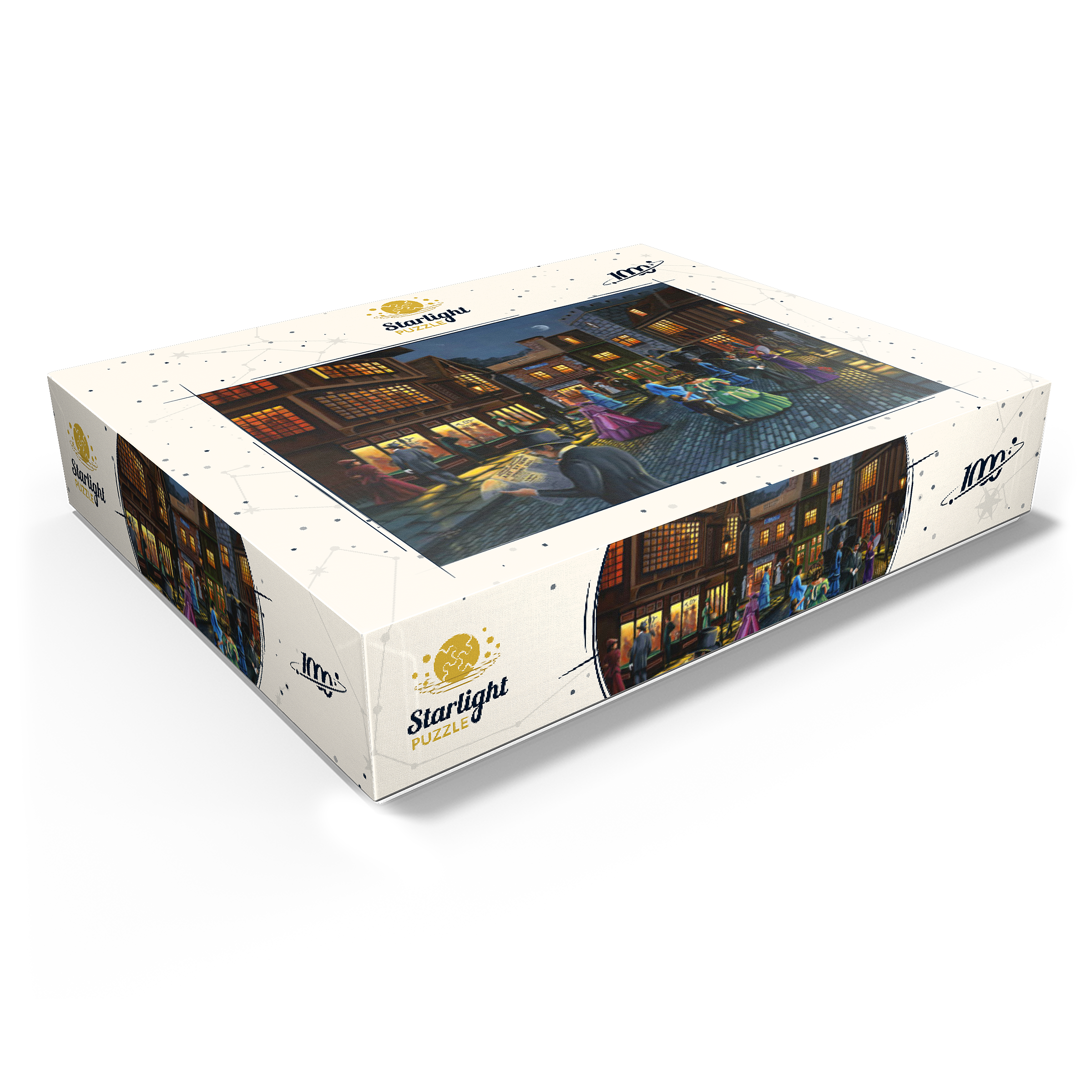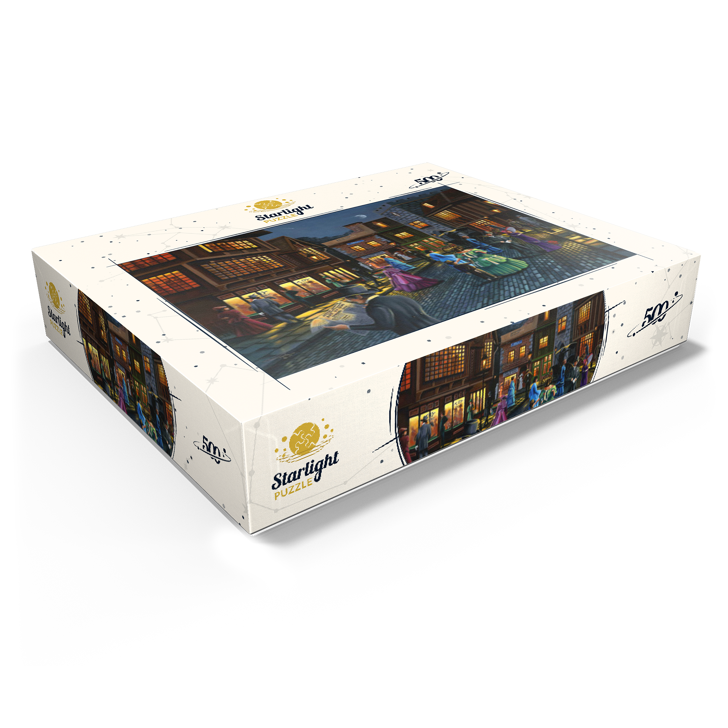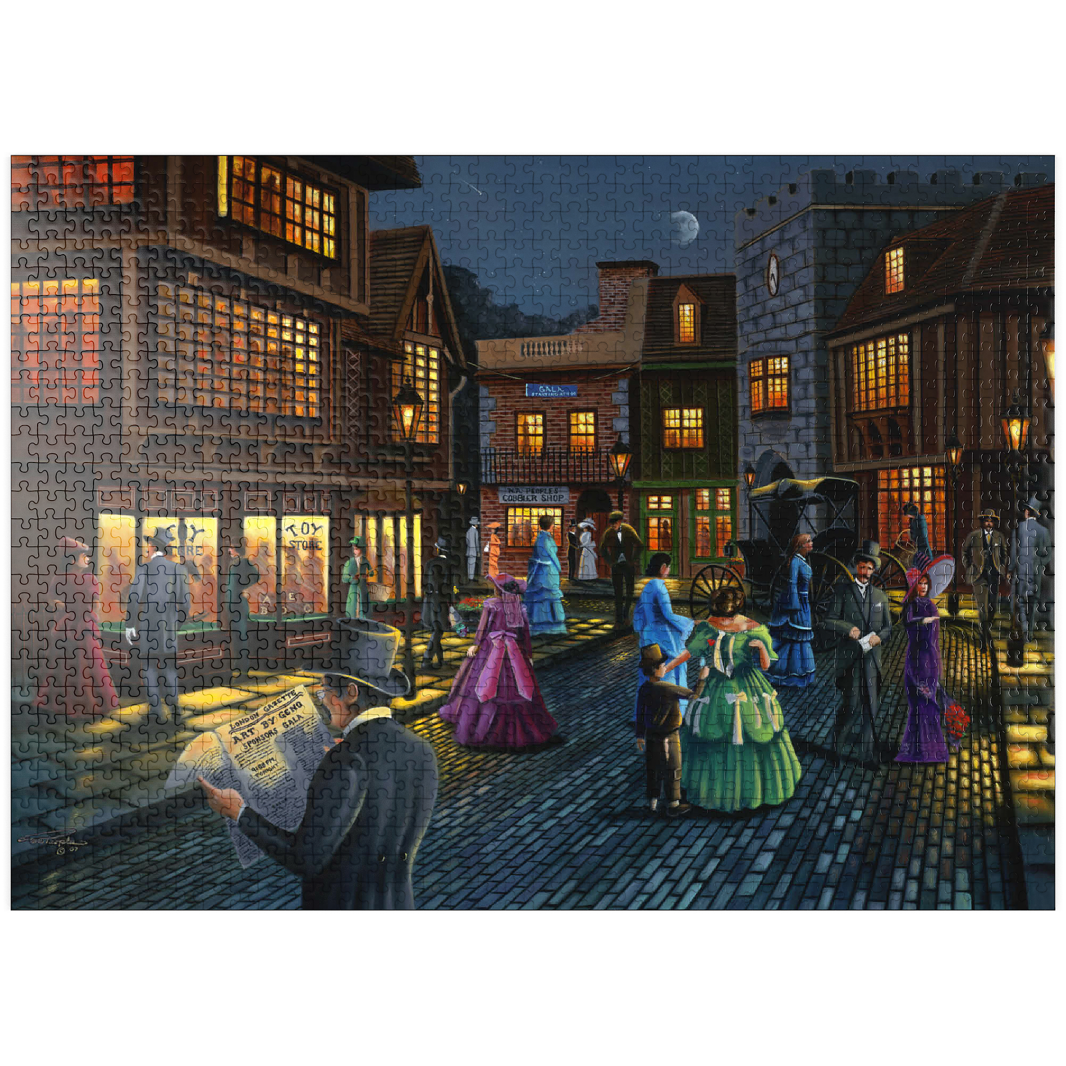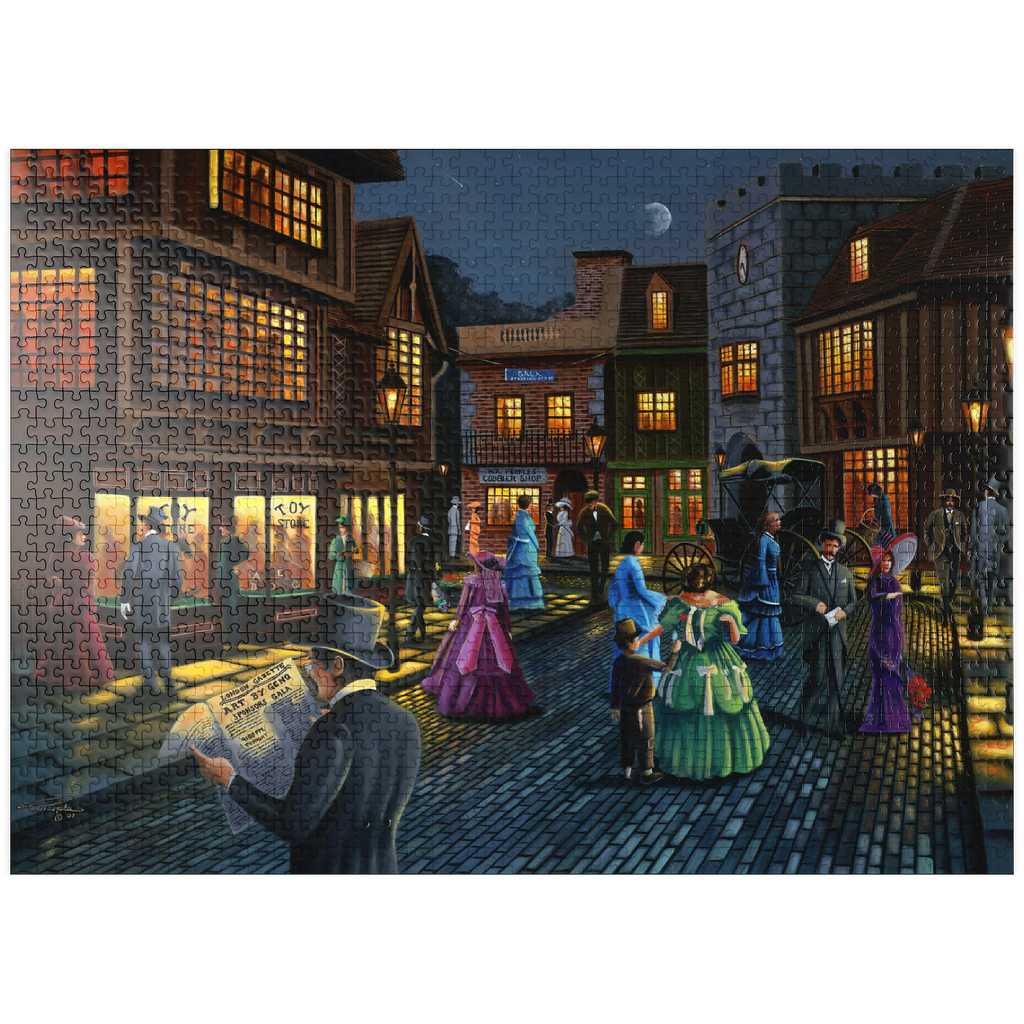 This nostalgic night scene depicts a lively Victorian-era town bathed in warm lamplight beneath a crescent moon. Elegantly dressed figures stroll along cobblestone streets, while a man reads a newspaper and others peer into glowing storefronts. A horse-drawn carriage adds charm to the bustling intersection, surrounded by brick and timber-framed buildings with glowing windows. The attention to period detail, from fashion to architecture, captures the essence of 19th-century urban life during a peaceful evening under the stars.