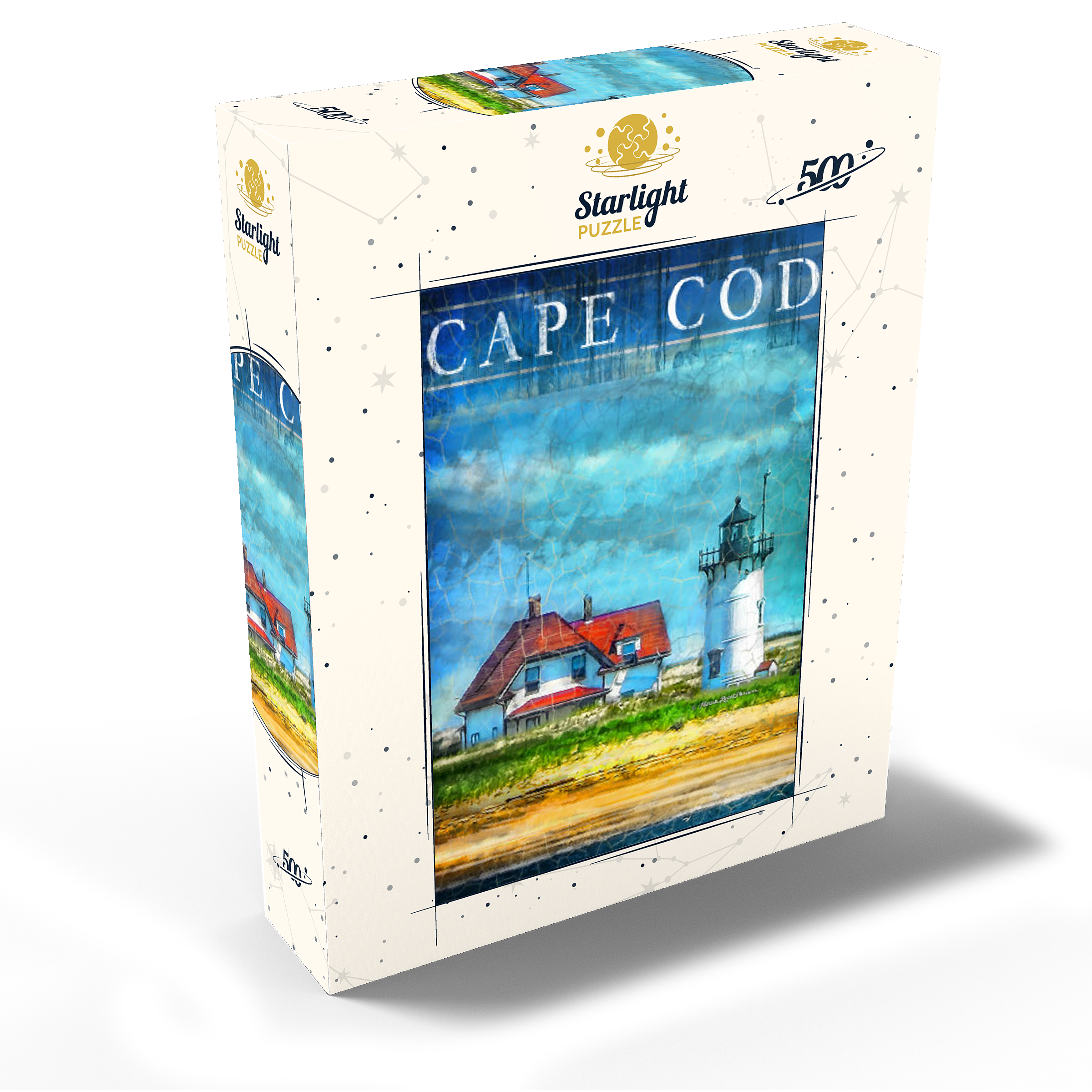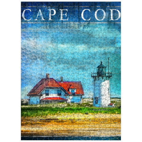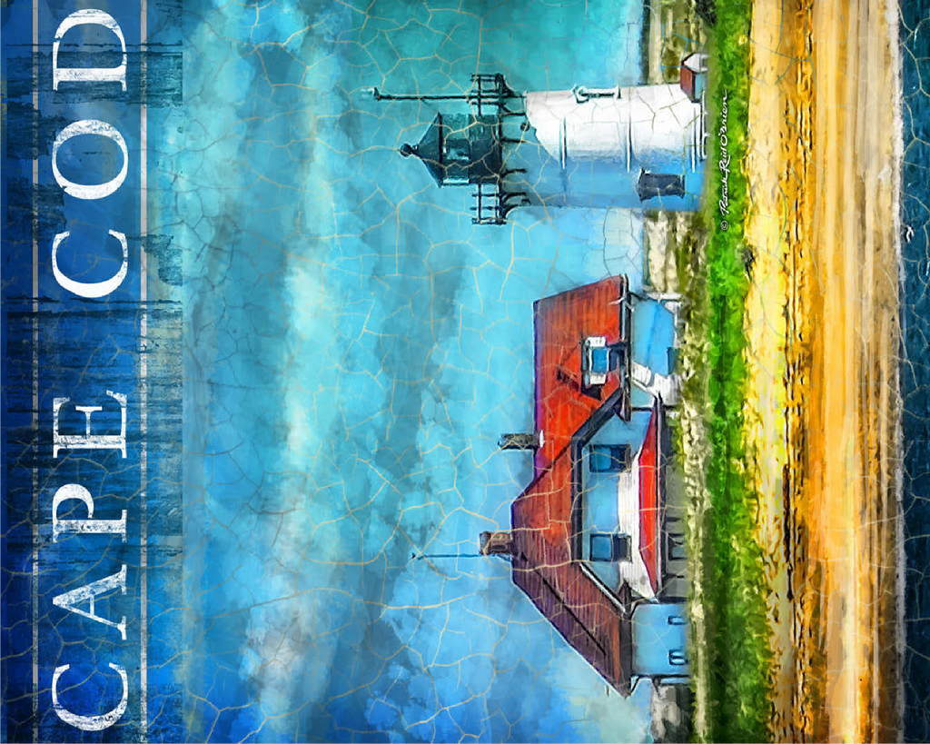 This stunning vintage-style artwork captures the charm of a classic Cape Cod lighthouse set against a vibrant blue sky. Featuring a textured, weathered overlay, the piece evokes a nostalgic, seaside travel poster aesthetic. The white lighthouse, paired with a charming red-roofed keeper's house, stands as a beacon of maritime history along the picturesque coastline. Golden sand, lush greenery, and a dramatic sky complete this beautifully composed coastal scene. Perfect for lovers of New England landscapes, nautical decor, and retro travel art.