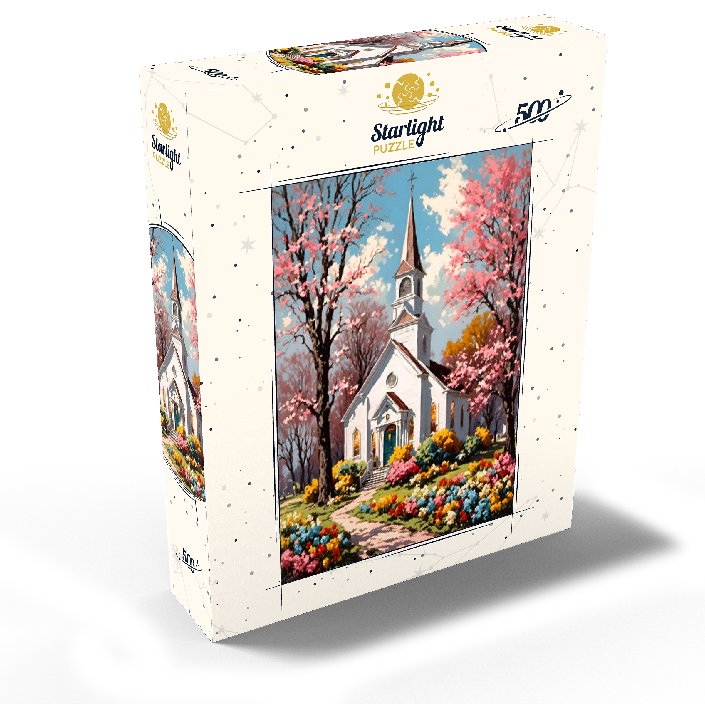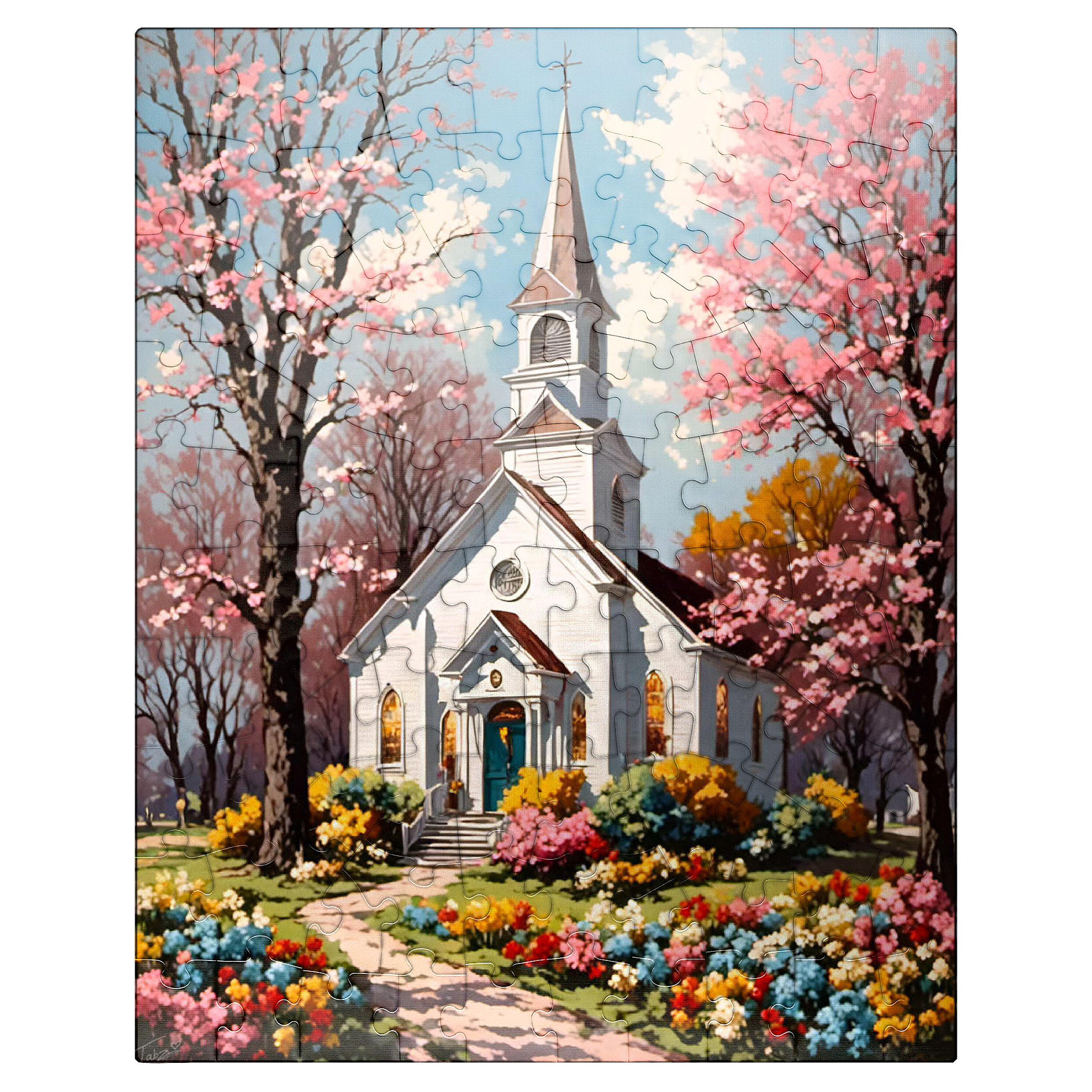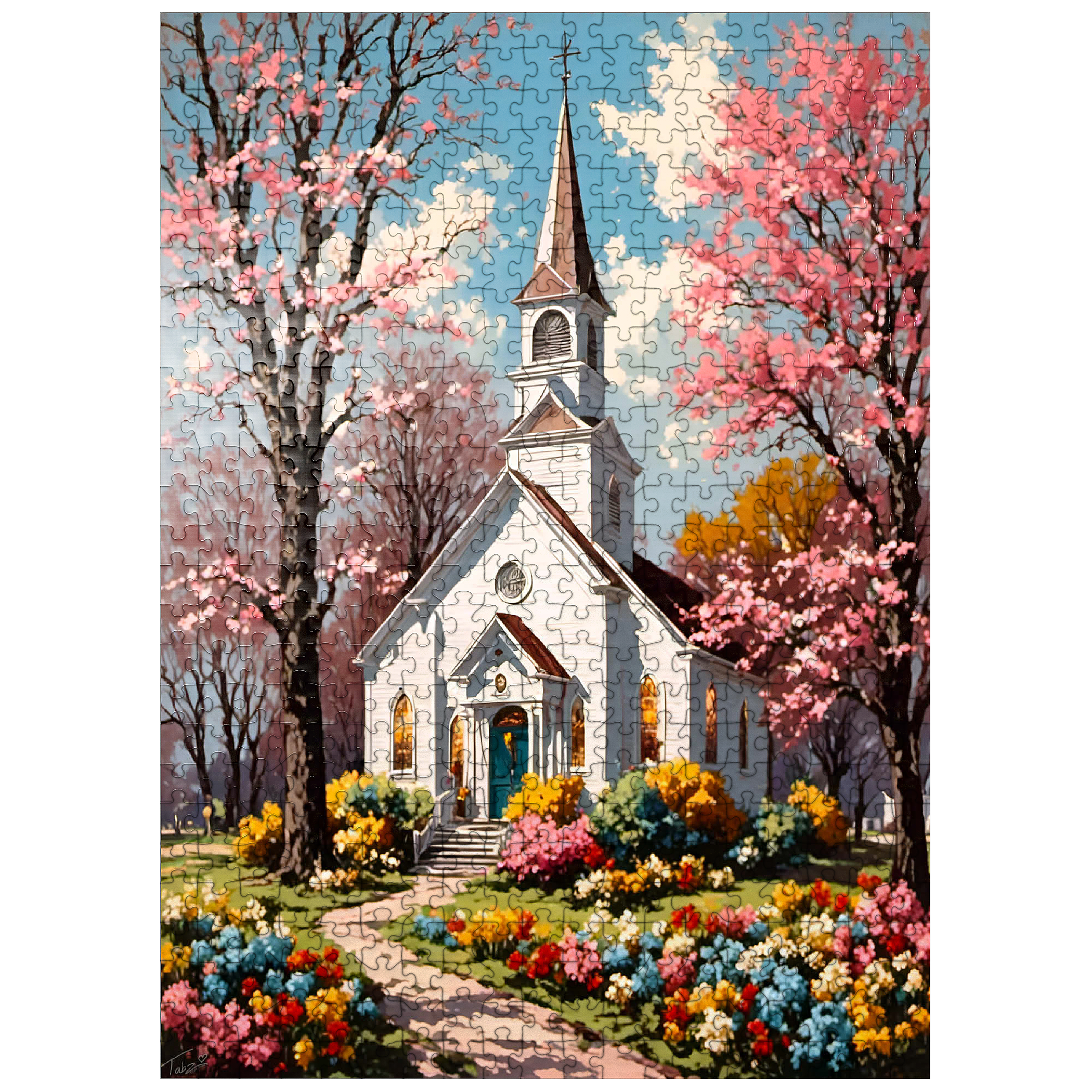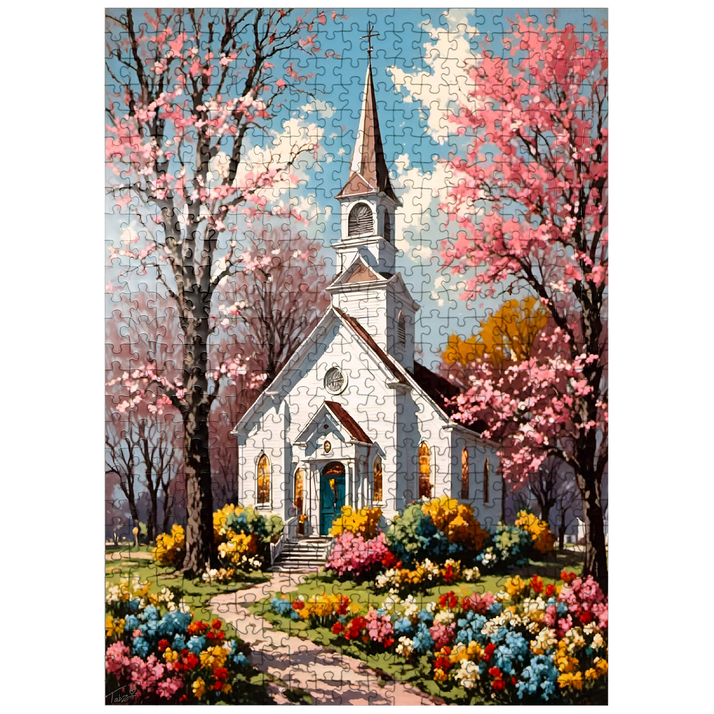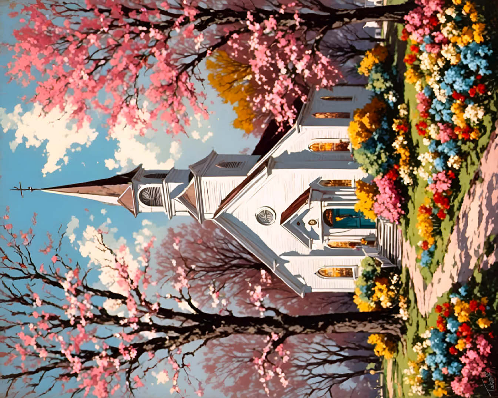 This delightful scene captures a quaint white country church surrounded by vibrant spring blossoms. The charming building, with its pointed steeple and classic stained-glass windows, sits nestled among trees adorned with pink and white blossoms. A colorful array of flowers lines the winding path leading to the entrance, creating a warm and inviting atmosphere. The blue sky, dotted with fluffy white clouds, completes this picturesque setting, evoking a sense of peace and renewal. A timeless celebration of spring's beauty and serenity.
