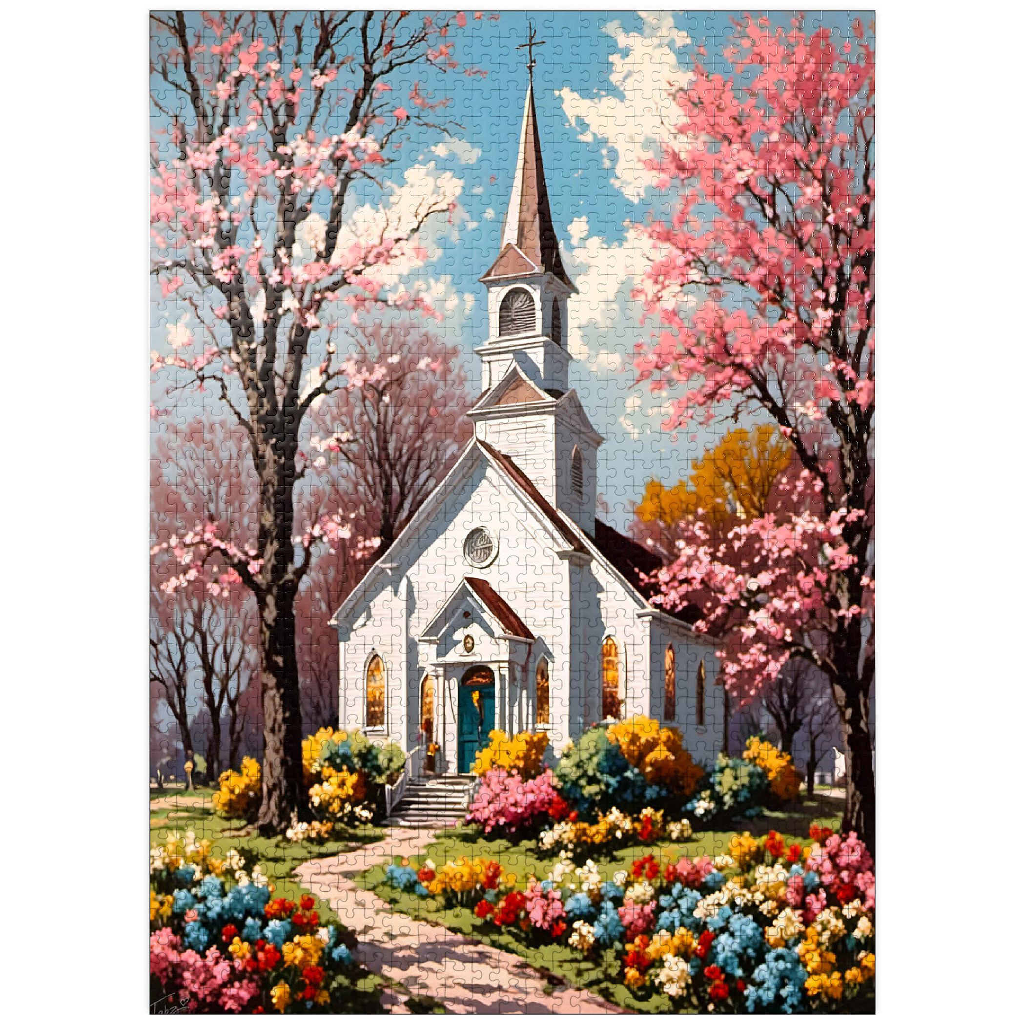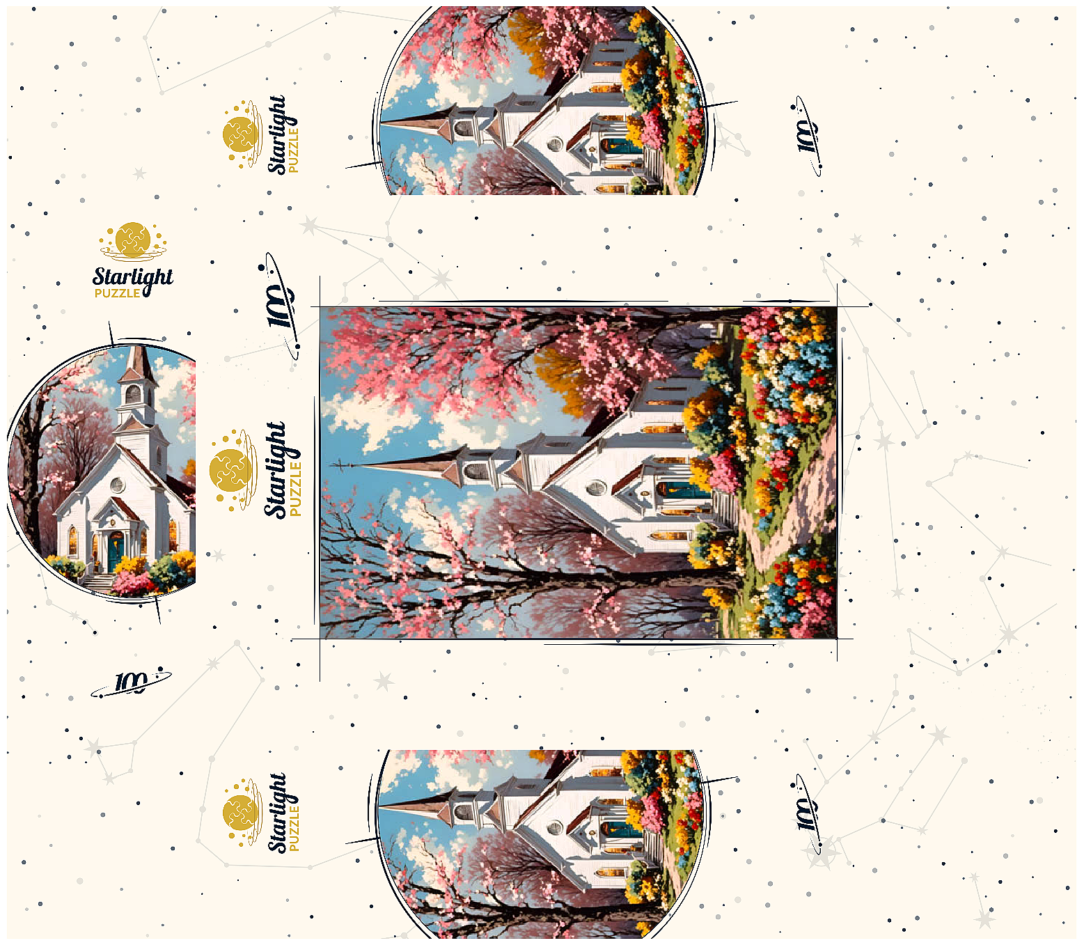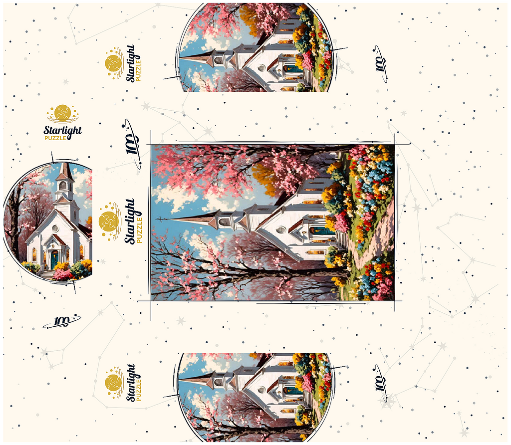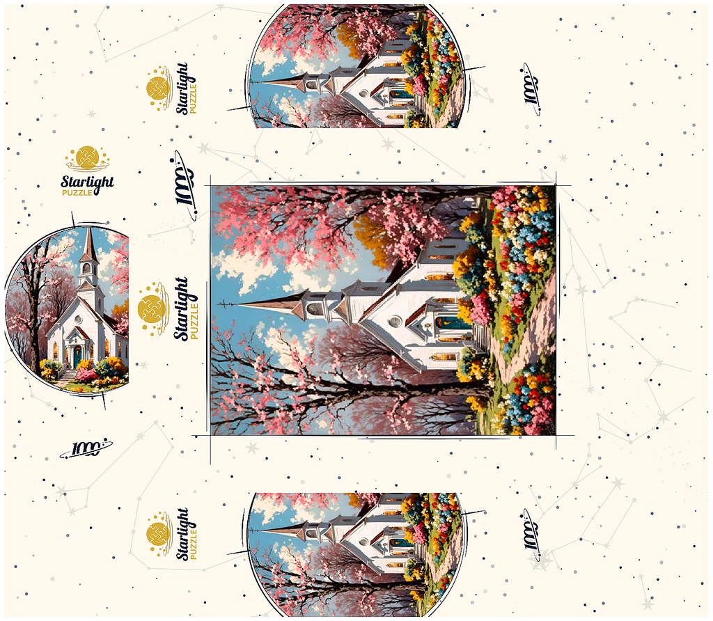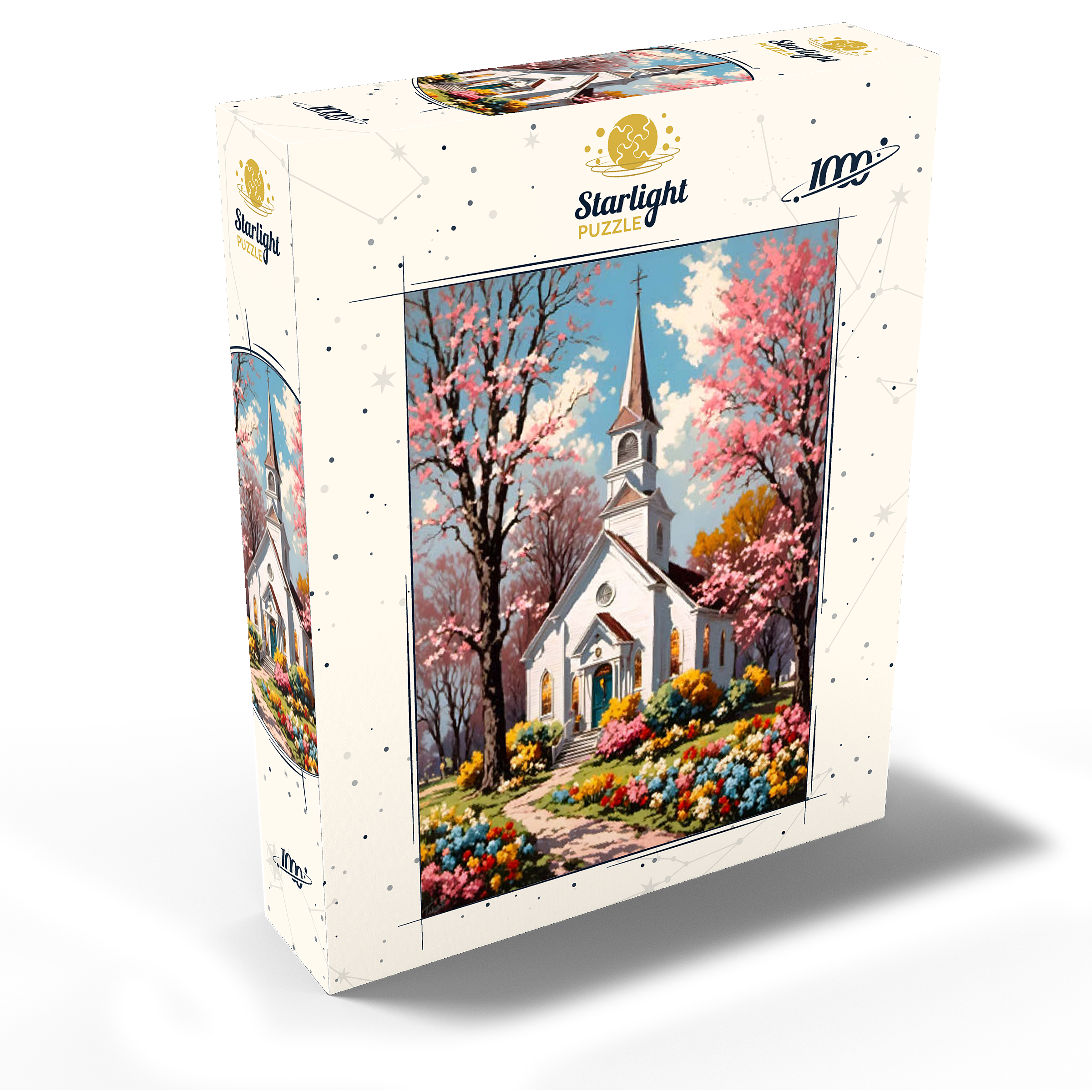 This delightful scene captures a quaint white country church surrounded by vibrant spring blossoms. The charming building, with its pointed steeple and classic stained-glass windows, sits nestled among trees adorned with pink and white blossoms. A colorful array of flowers lines the winding path leading to the entrance, creating a warm and inviting atmosphere. The blue sky, dotted with fluffy white clouds, completes this picturesque setting, evoking a sense of peace and renewal. A timeless celebration of spring's beauty and serenity.