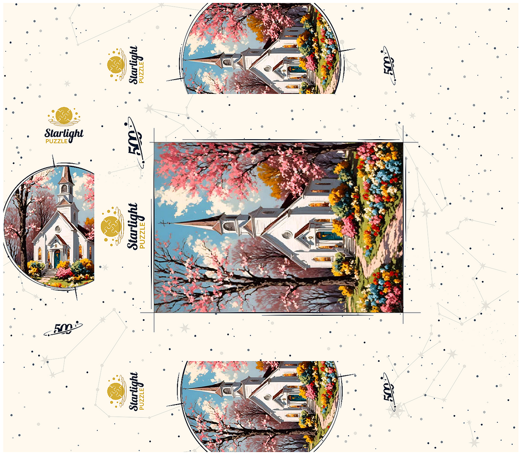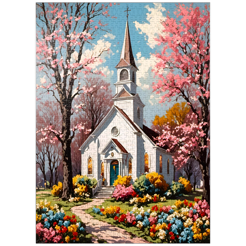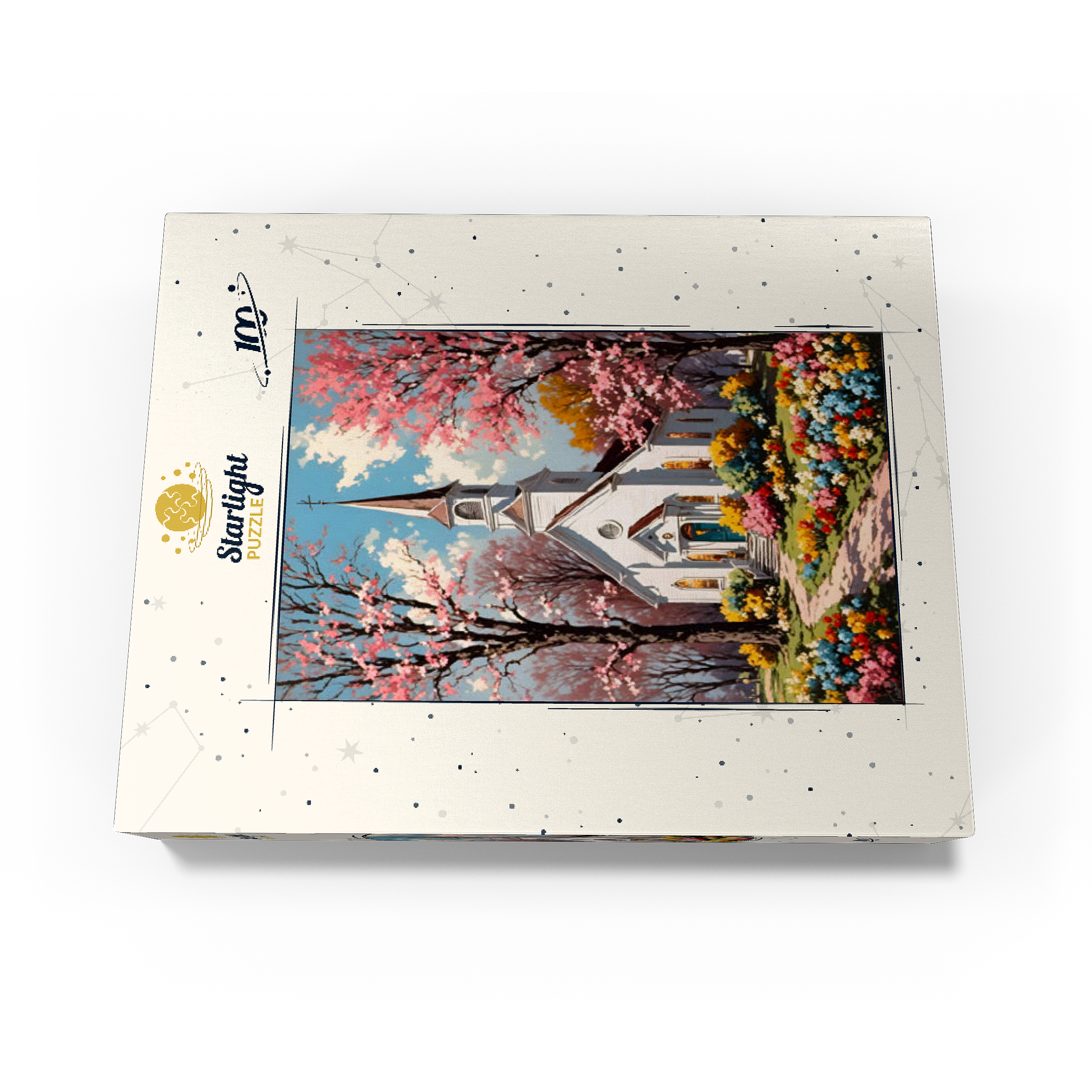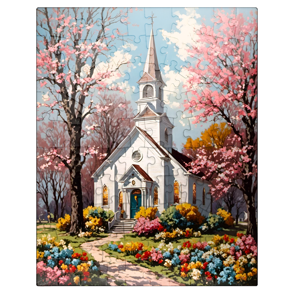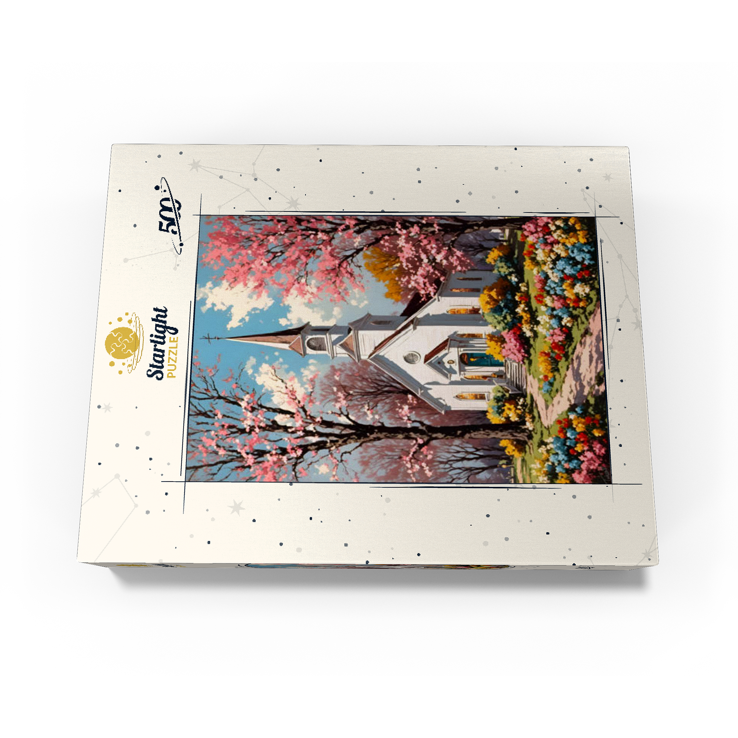 This delightful scene captures a quaint white country church surrounded by vibrant spring blossoms. The charming building, with its pointed steeple and classic stained-glass windows, sits nestled among trees adorned with pink and white blossoms. A colorful array of flowers lines the winding path leading to the entrance, creating a warm and inviting atmosphere. The blue sky, dotted with fluffy white clouds, completes this picturesque setting, evoking a sense of peace and renewal. A timeless celebration of spring's beauty and serenity.