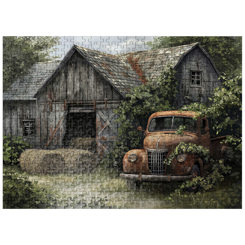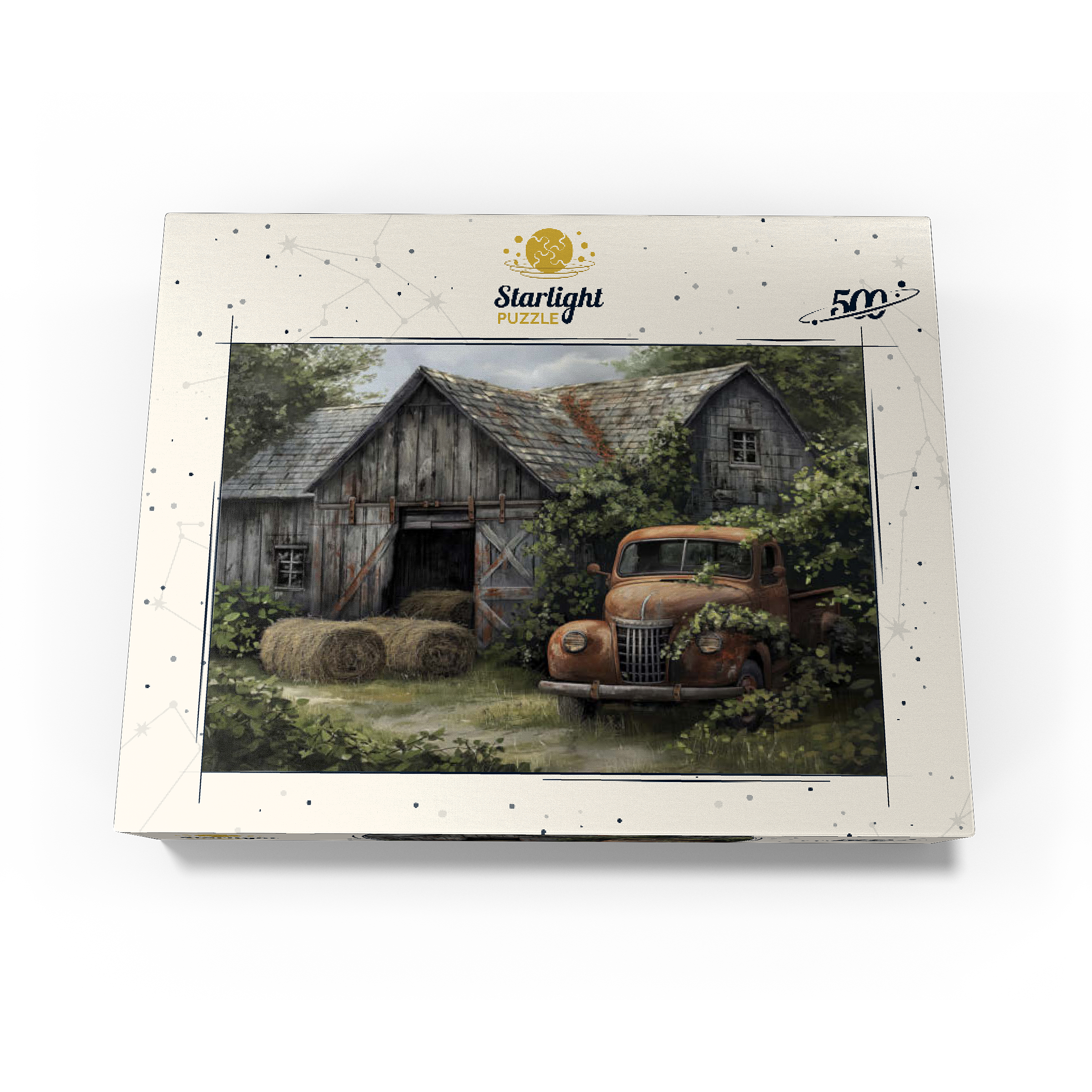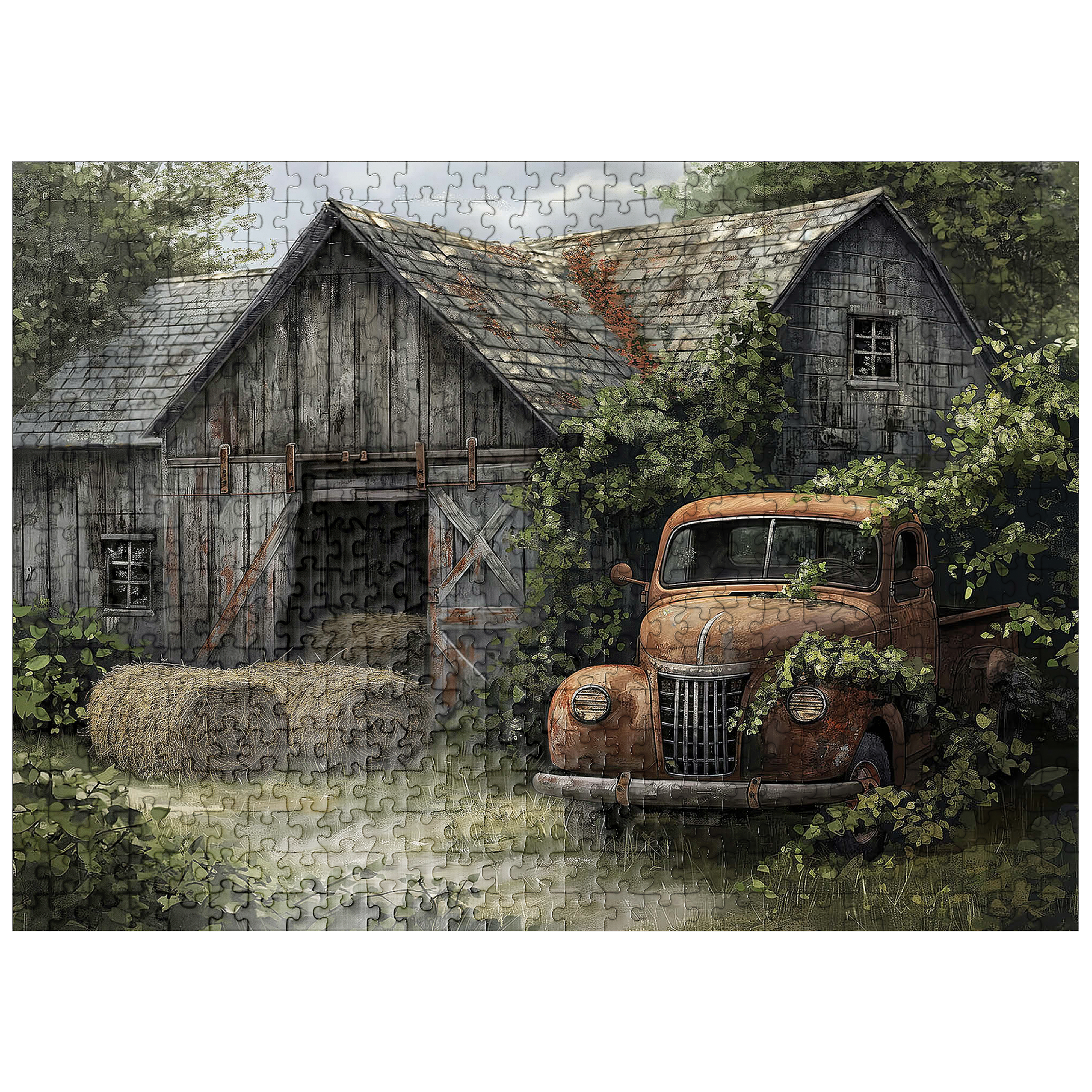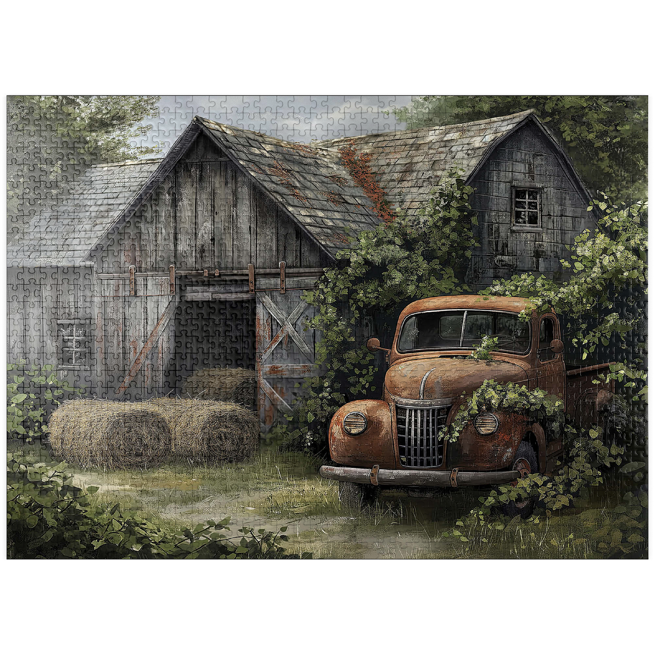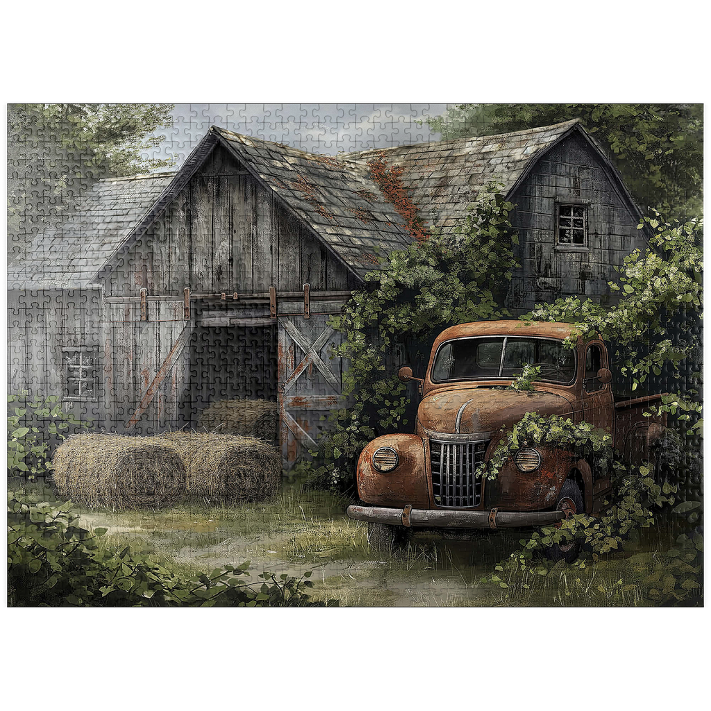 This picturesque artwork showcases a weathered barn enveloped in lush greenery, exuding the rustic charm of the countryside. The barn's aged wood and moss-covered roof tell a story of decades gone by. In the foreground, a classic rusty pickup truck, partially cloaked in vines, adds an element of nostalgia. Nearby, bales of hay rest on the grass, enhancing the pastoral atmosphere. The scene perfectly captures the serene beauty of rural life, making it ideal for admirers of vintage farm aesthetics.