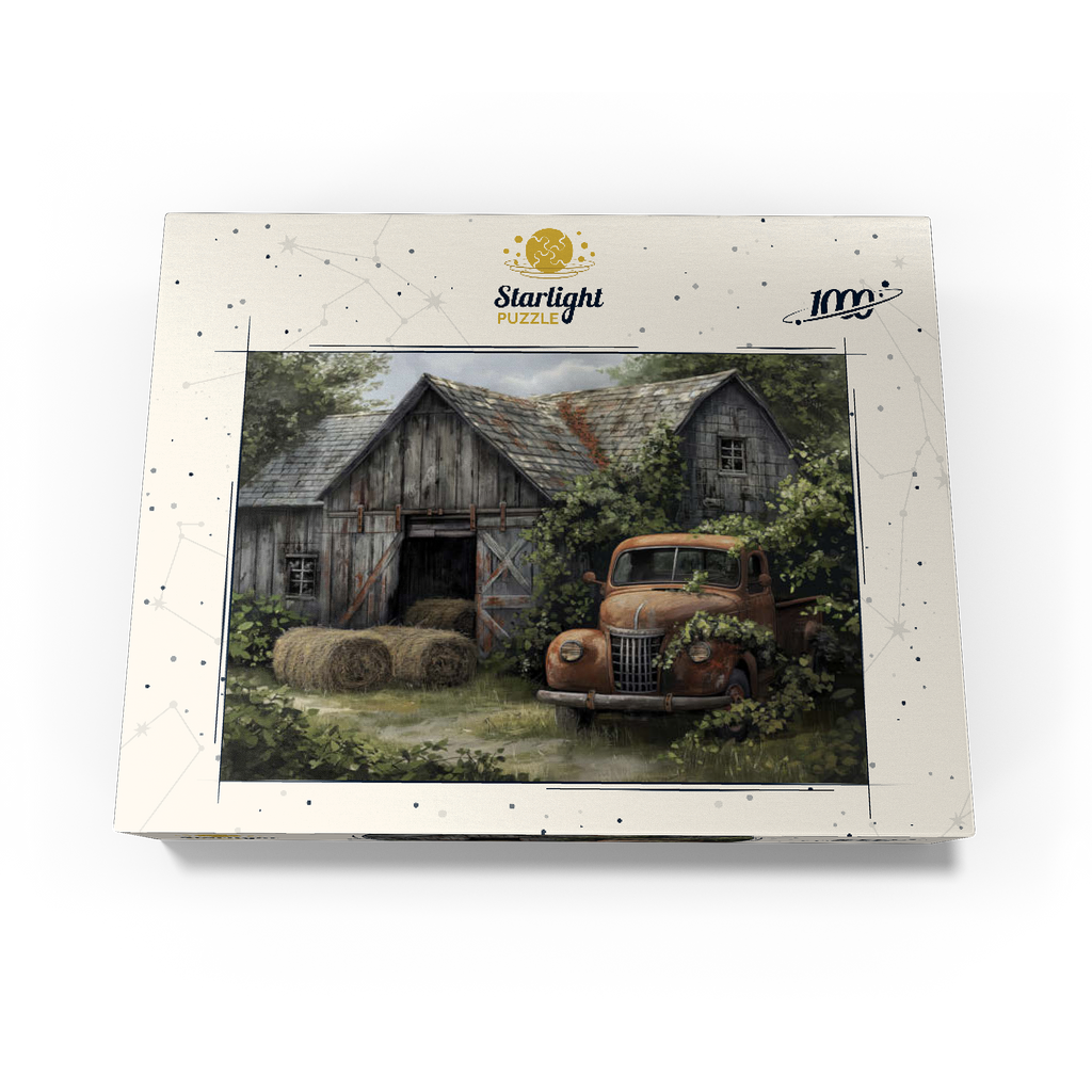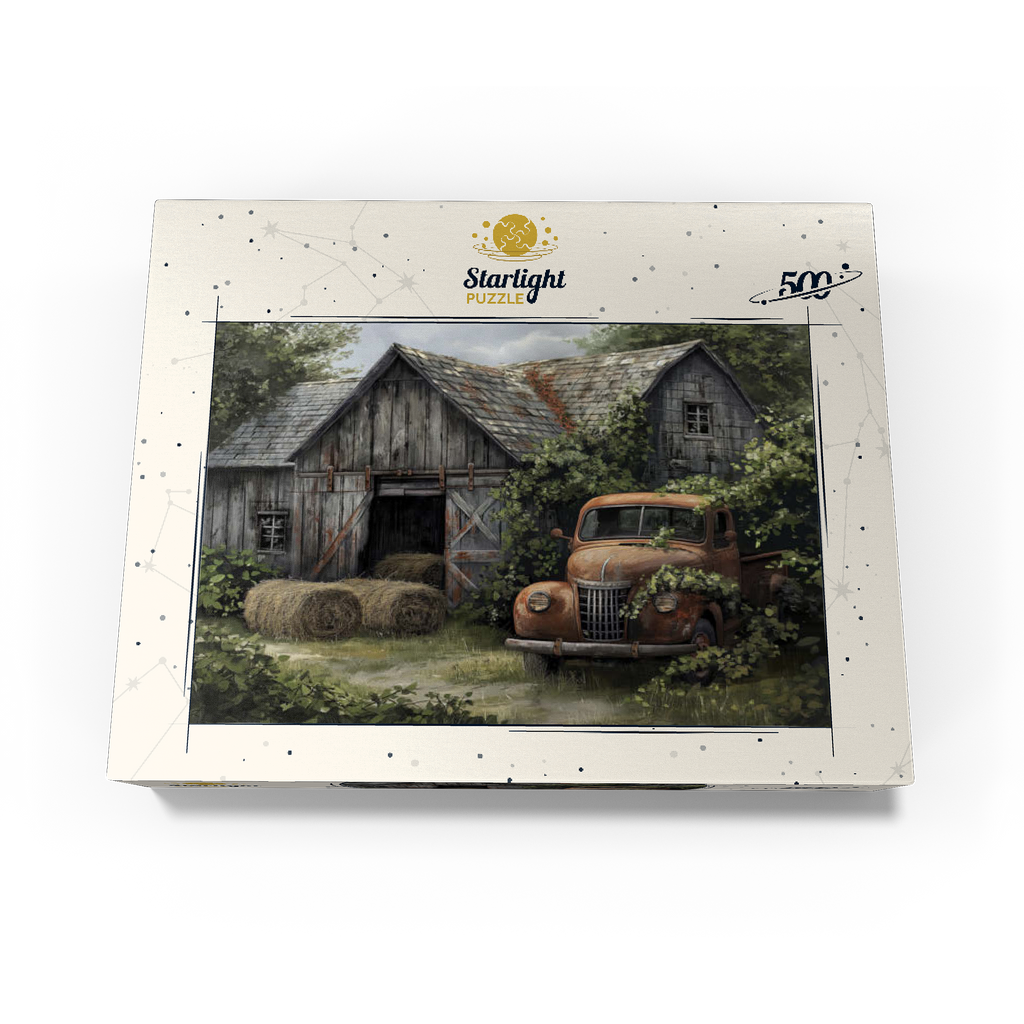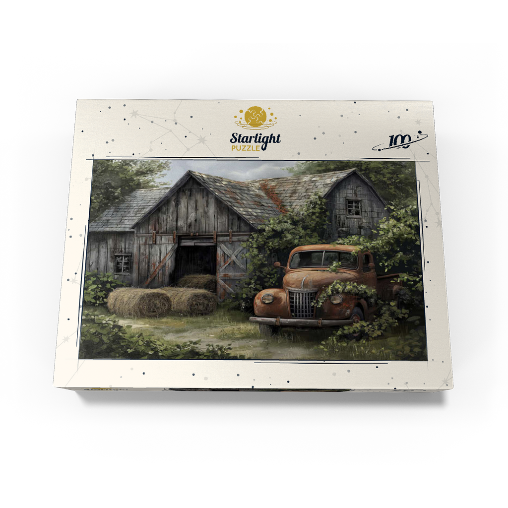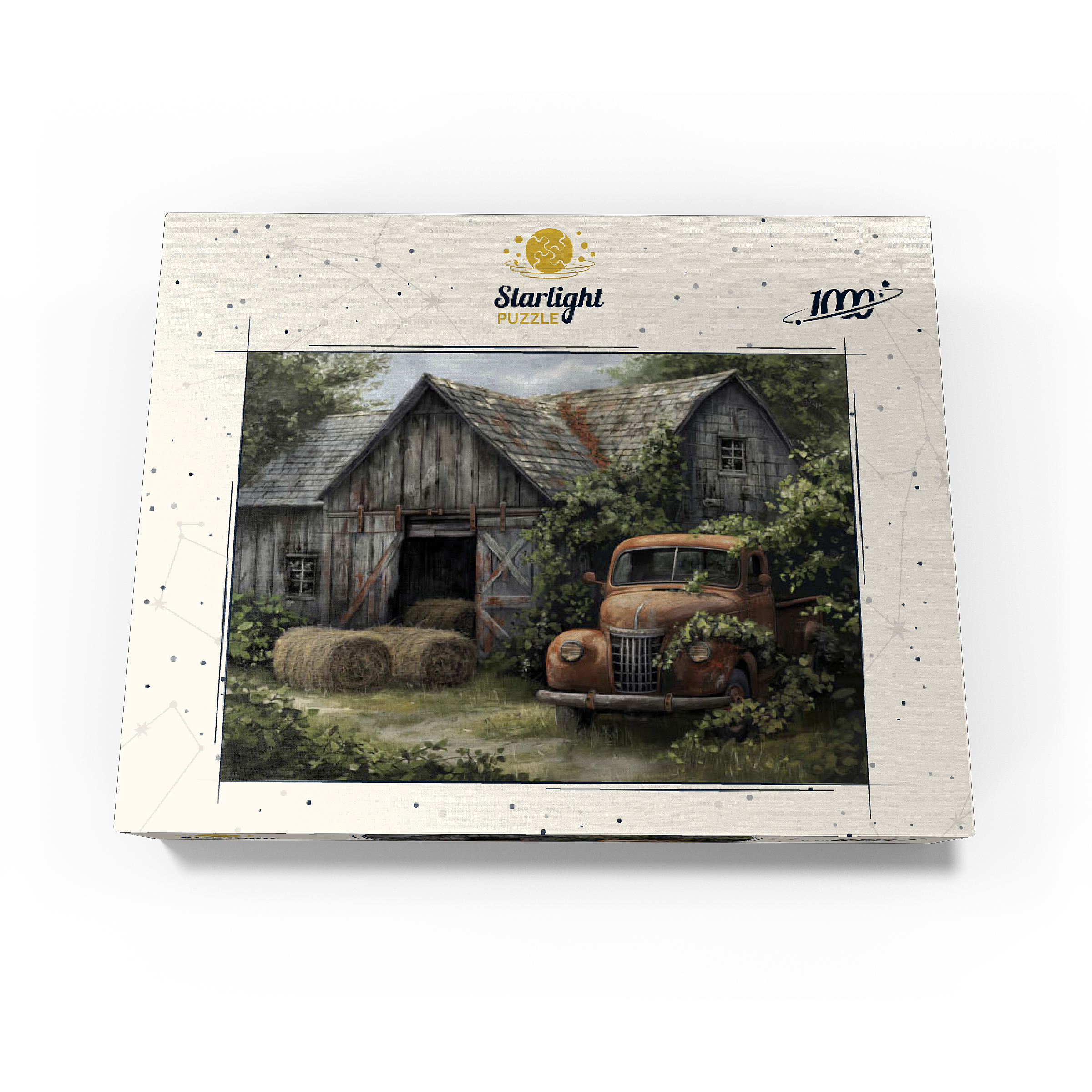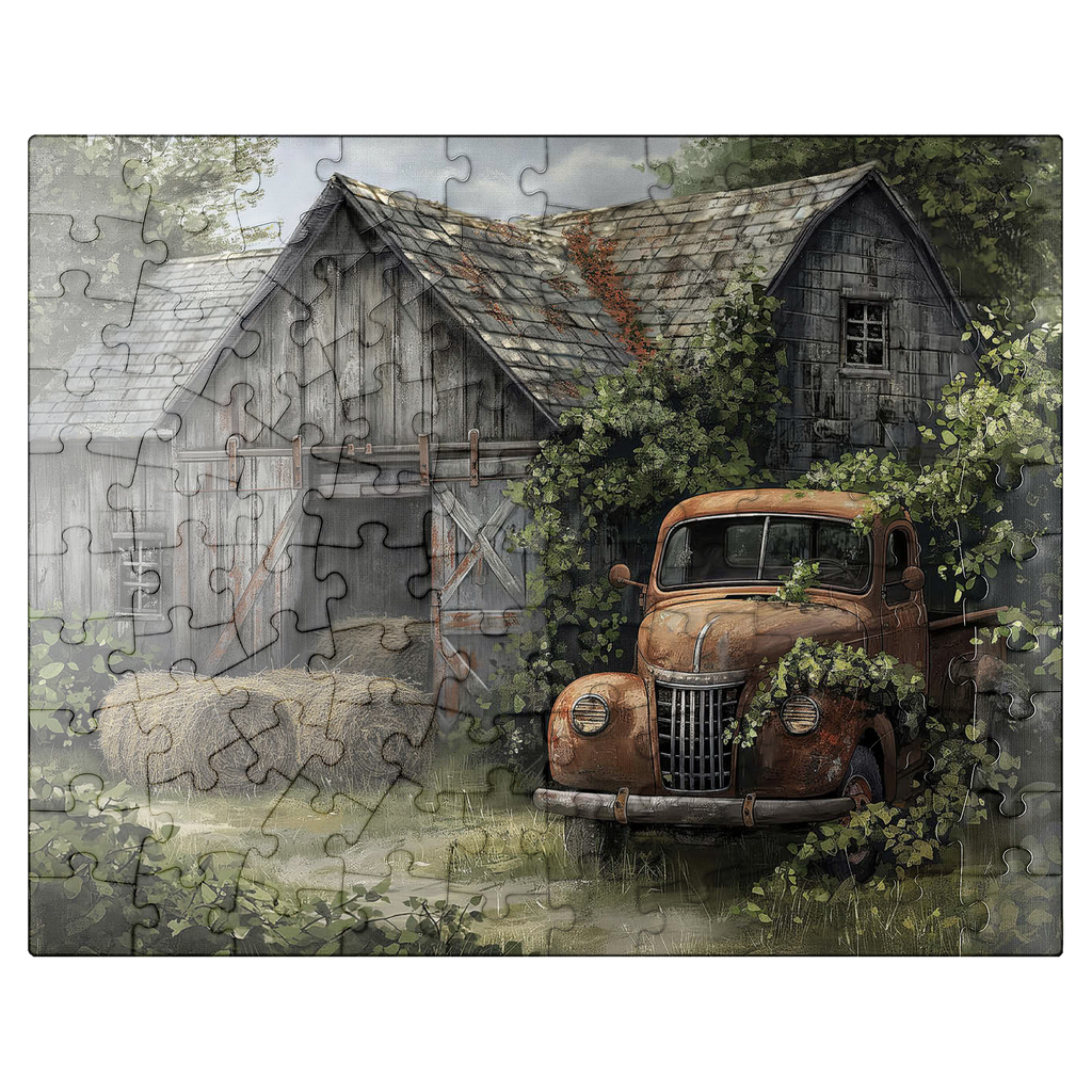 This picturesque artwork showcases a weathered barn enveloped in lush greenery, exuding the rustic charm of the countryside. The barn's aged wood and moss-covered roof tell a story of decades gone by. In the foreground, a classic rusty pickup truck, partially cloaked in vines, adds an element of nostalgia. Nearby, bales of hay rest on the grass, enhancing the pastoral atmosphere. The scene perfectly captures the serene beauty of rural life, making it ideal for admirers of vintage farm aesthetics.