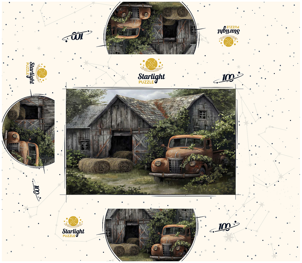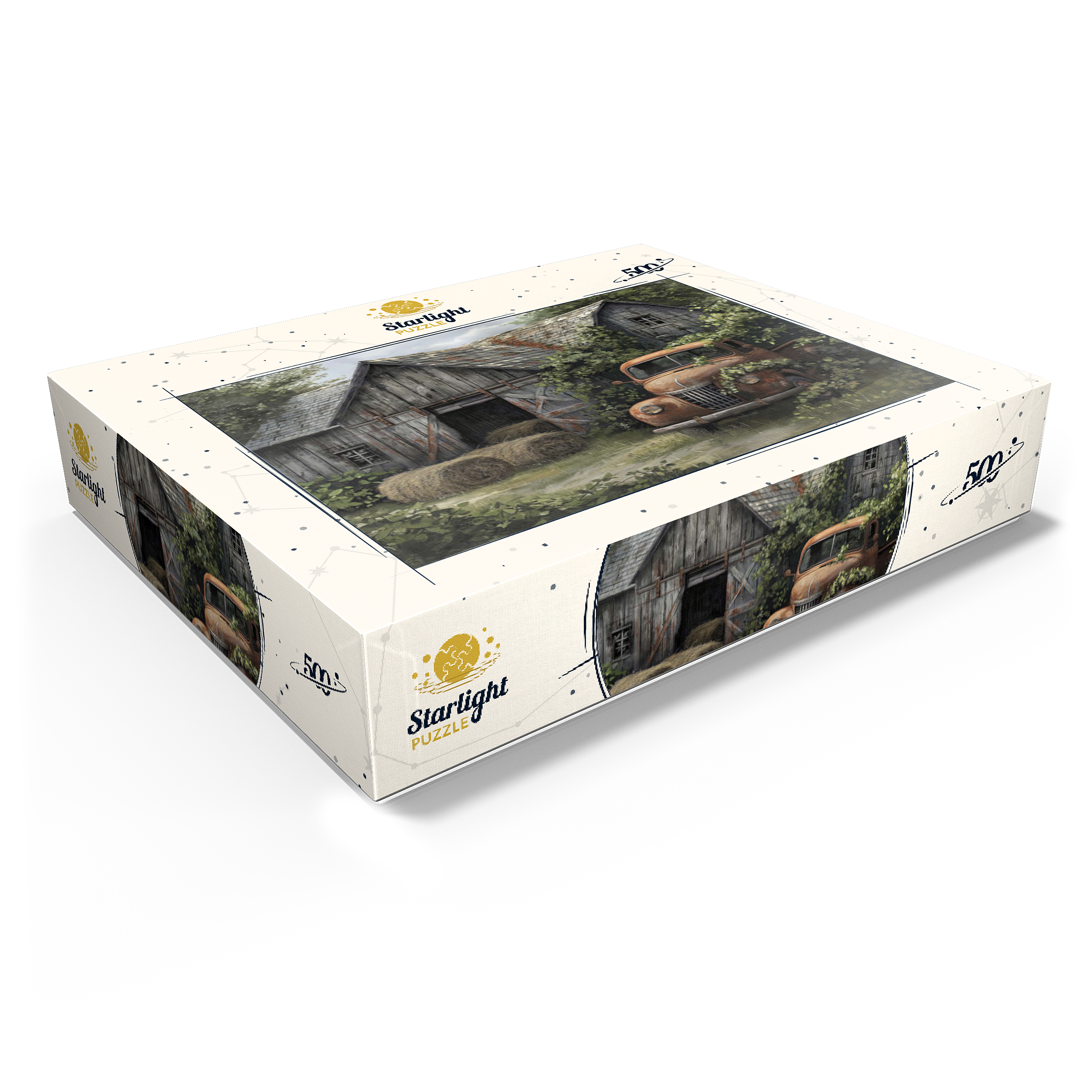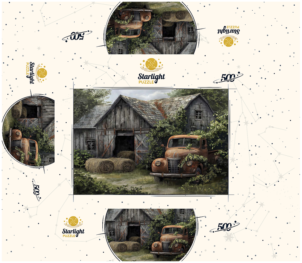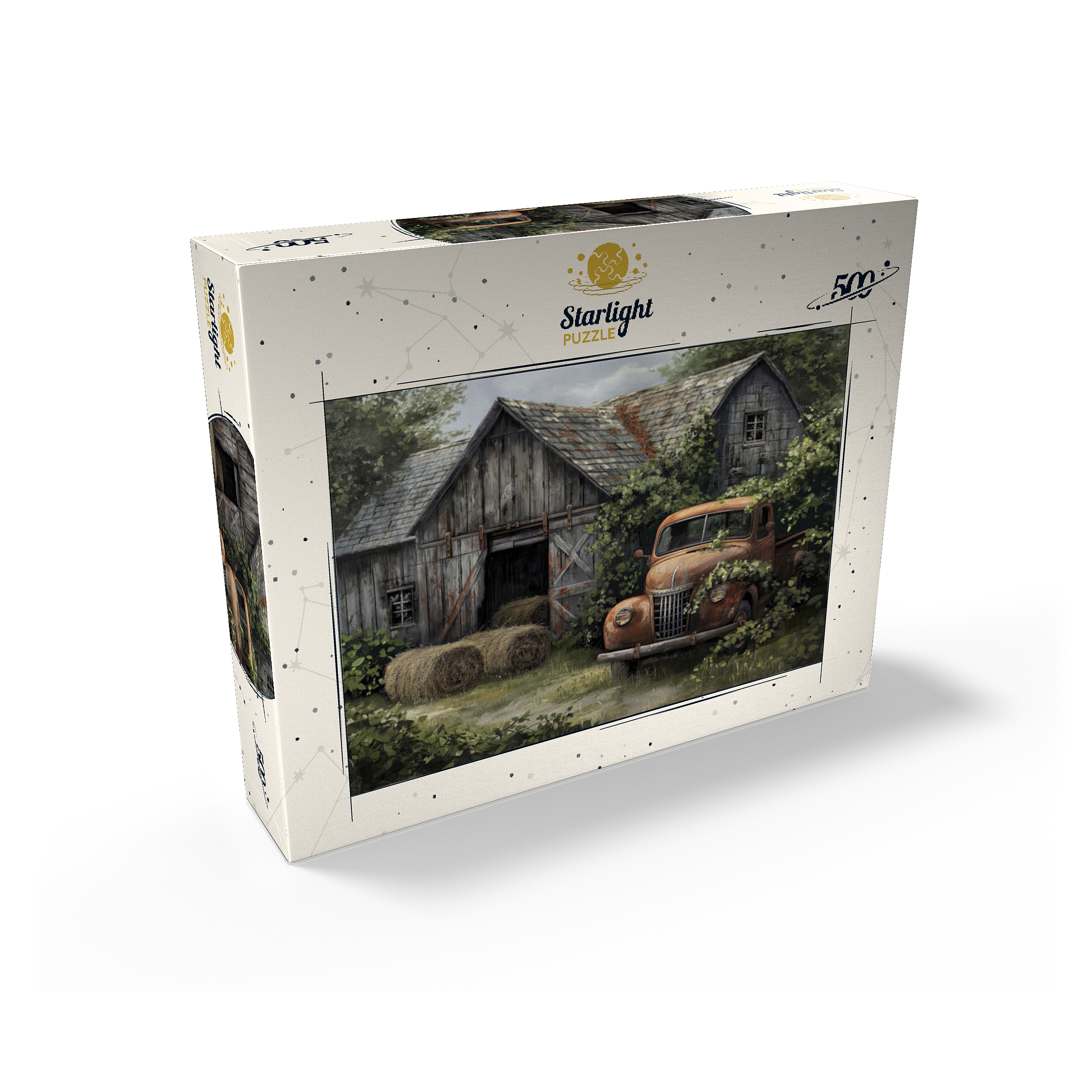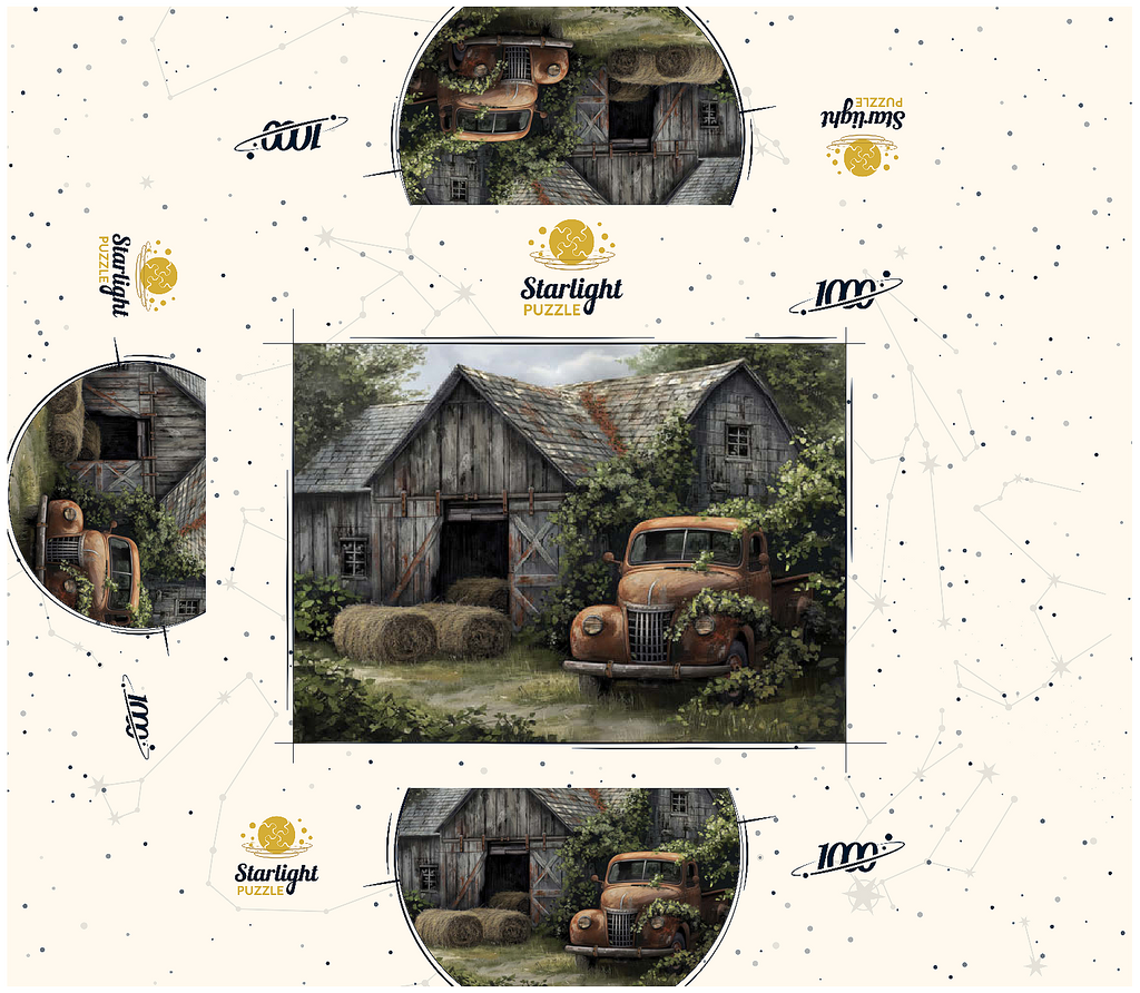 This picturesque artwork showcases a weathered barn enveloped in lush greenery, exuding the rustic charm of the countryside. The barn's aged wood and moss-covered roof tell a story of decades gone by. In the foreground, a classic rusty pickup truck, partially cloaked in vines, adds an element of nostalgia. Nearby, bales of hay rest on the grass, enhancing the pastoral atmosphere. The scene perfectly captures the serene beauty of rural life, making it ideal for admirers of vintage farm aesthetics.
