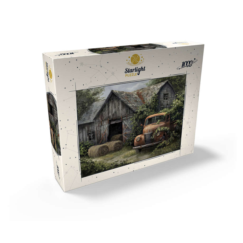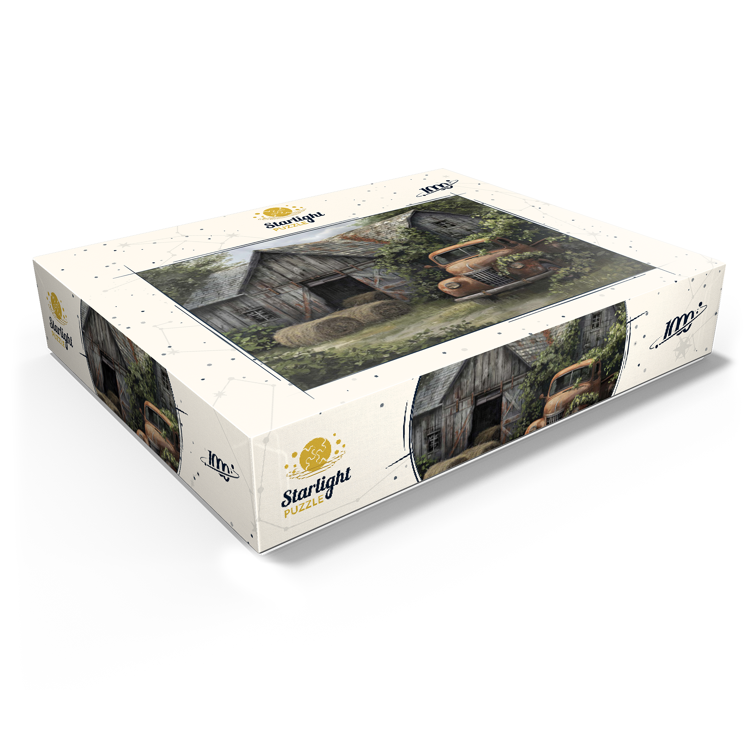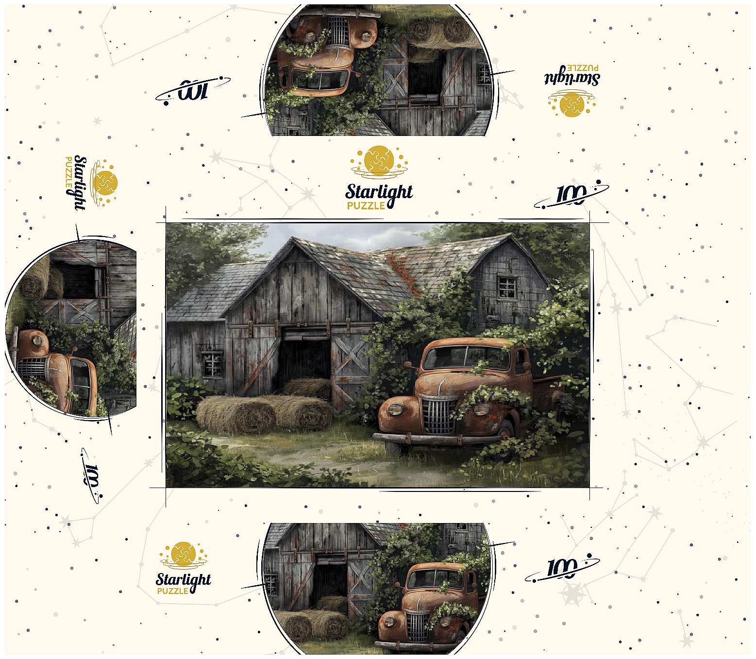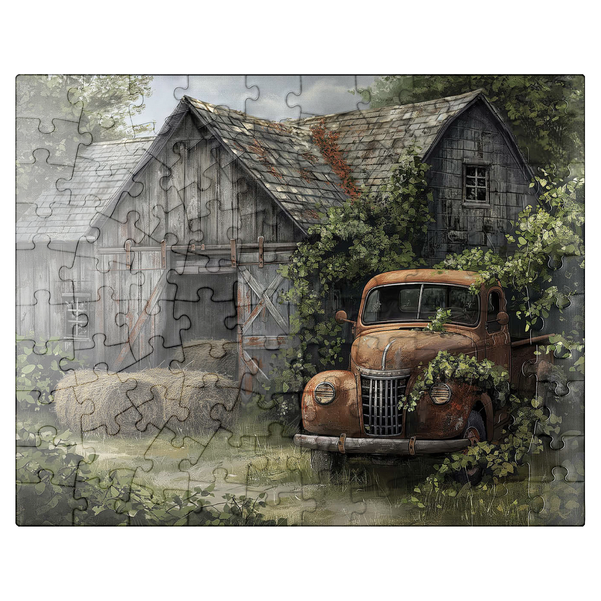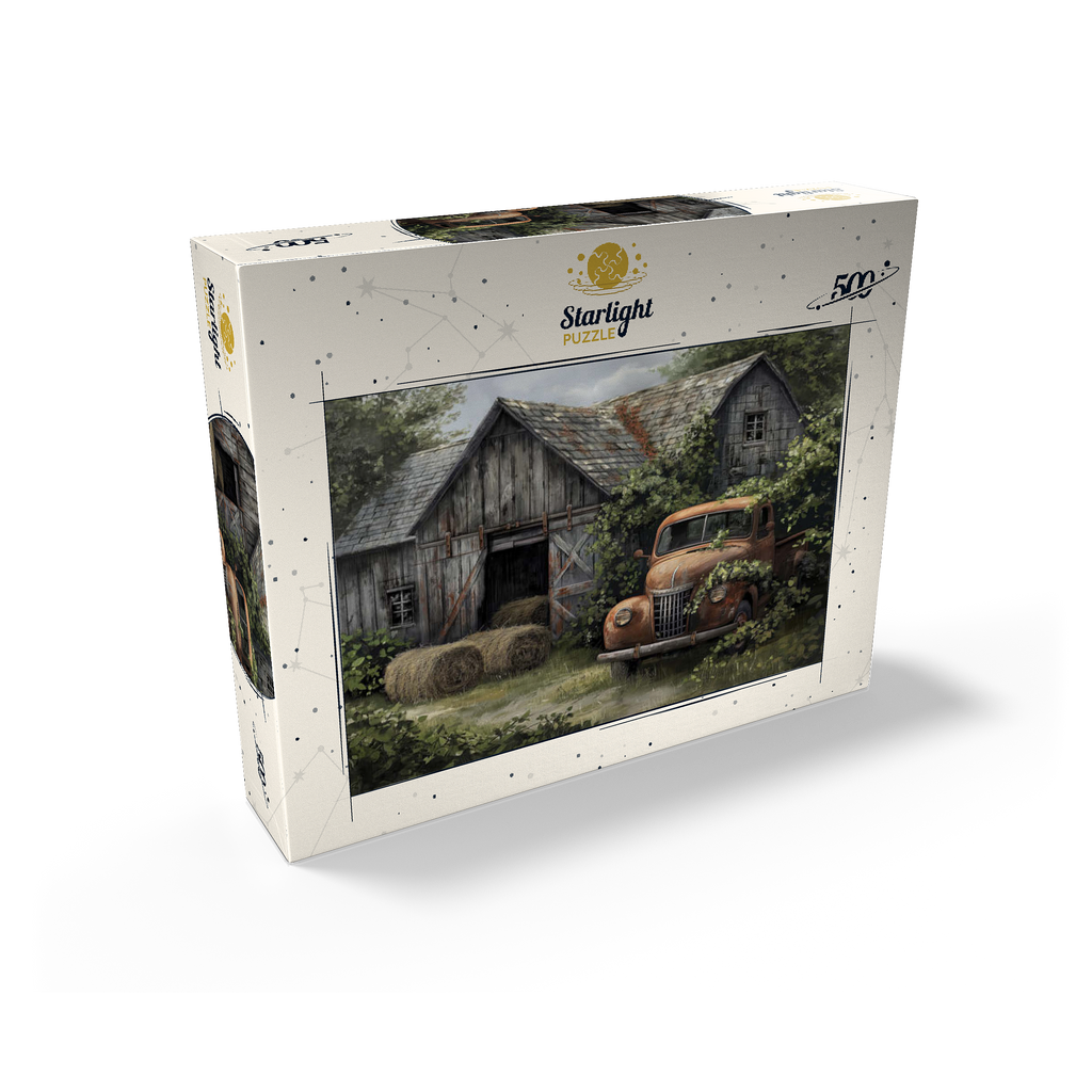This picturesque artwork showcases a weathered barn enveloped in lush greenery, exuding the rustic charm of the countryside. The barn's aged wood and moss-covered roof tell a story of decades gone by. In the foreground, a classic rusty pickup truck, partially cloaked in vines, adds an element of nostalgia. Nearby, bales of hay rest on the grass, enhancing the pastoral atmosphere. The scene perfectly captures the serene beauty of rural life, making it ideal for admirers of vintage farm aesthetics.