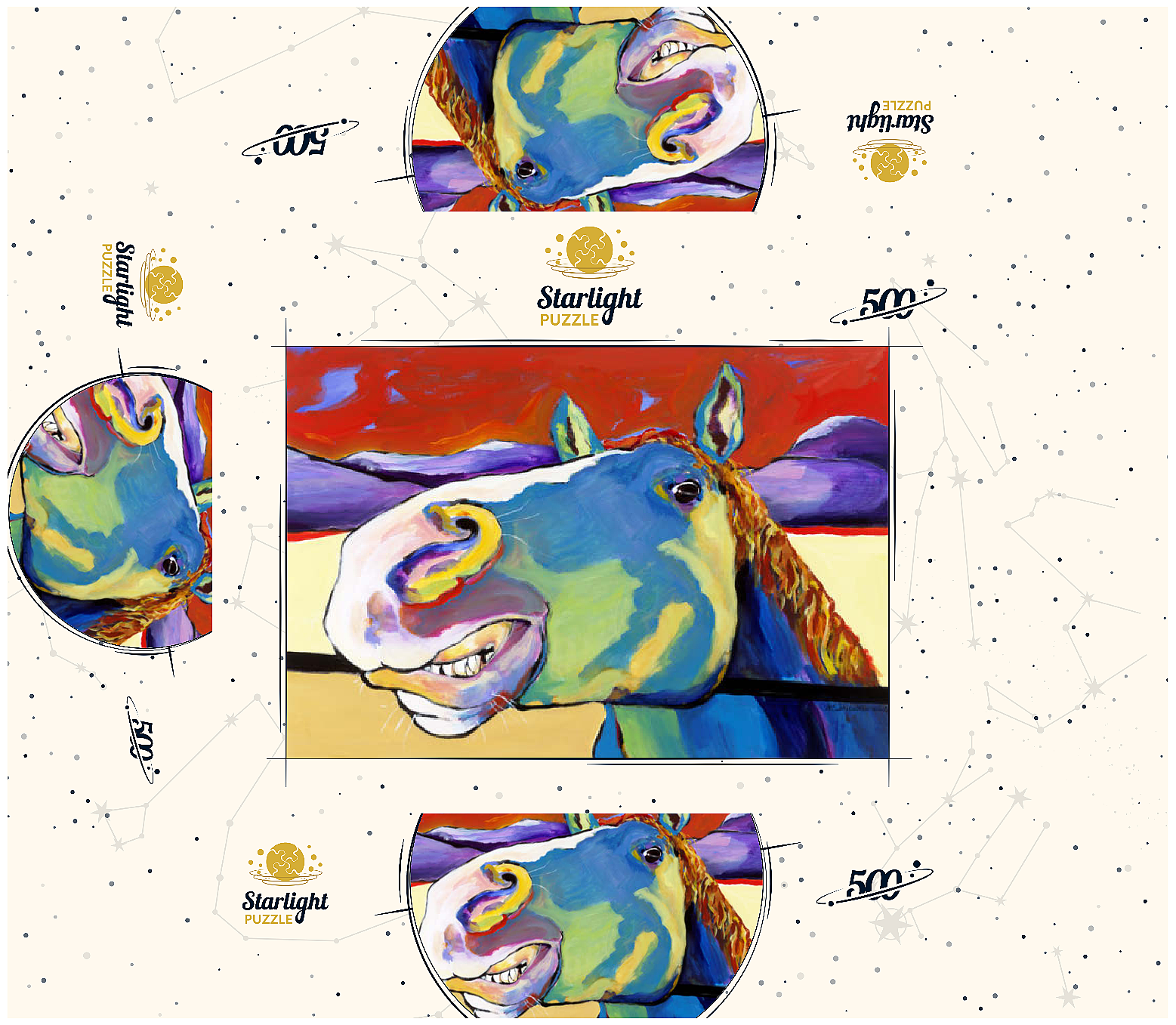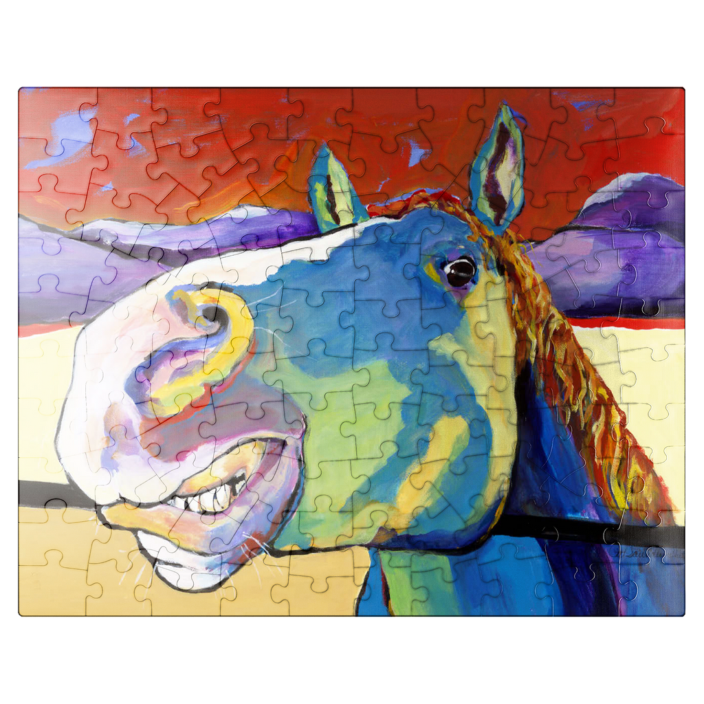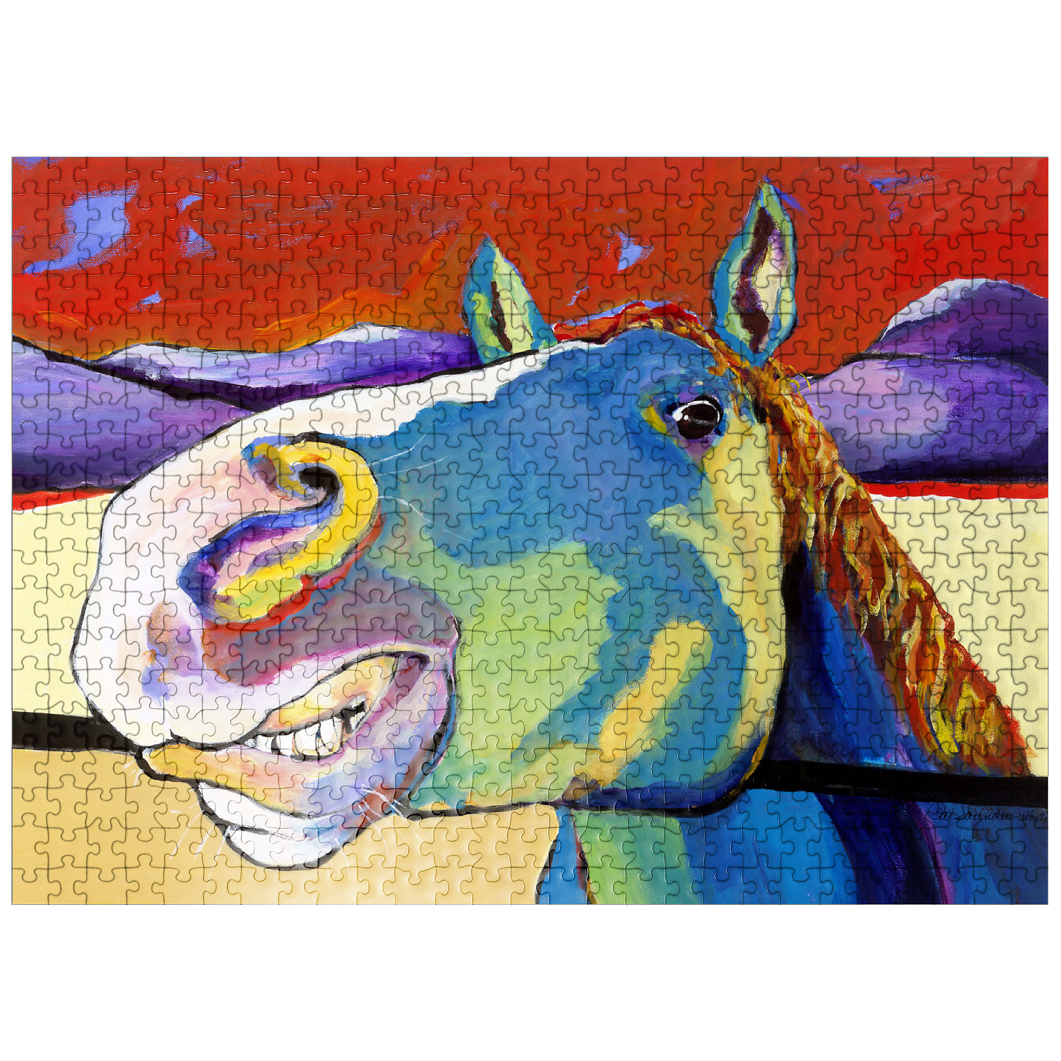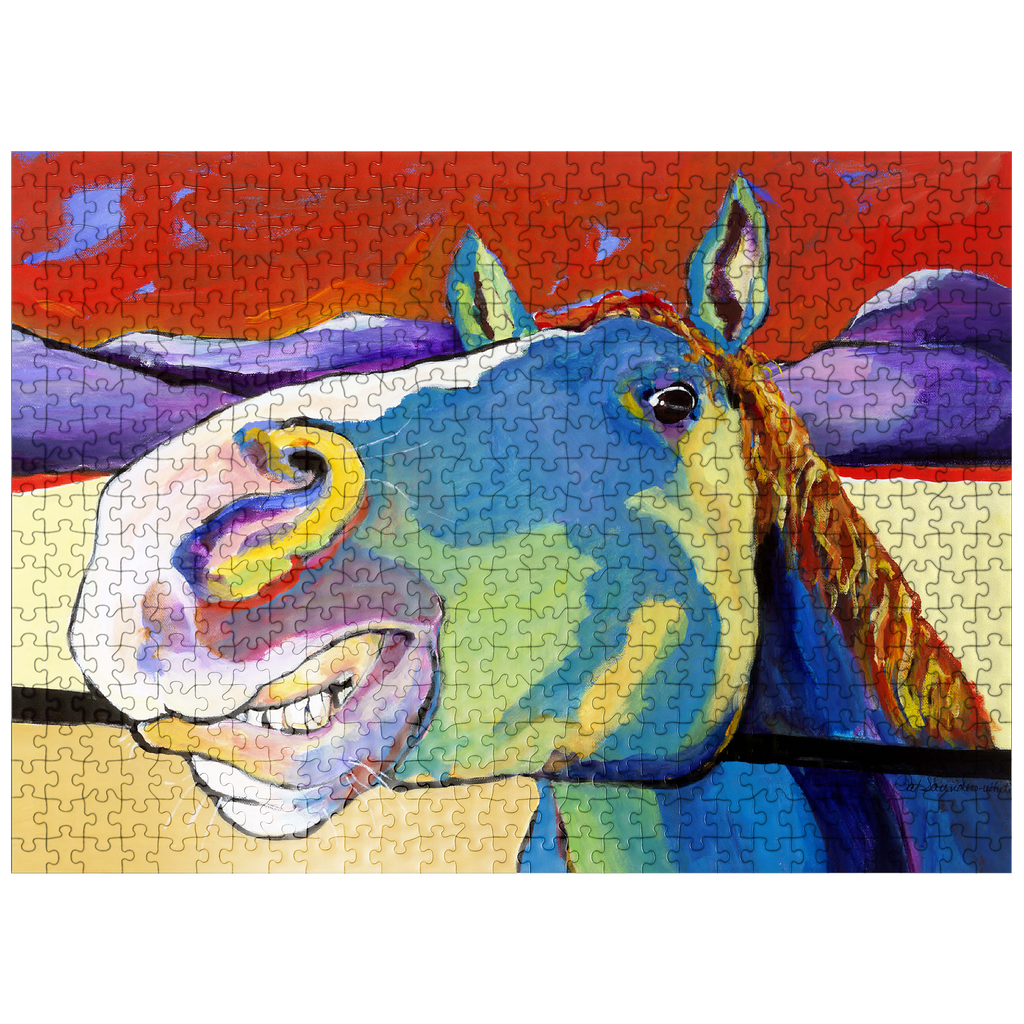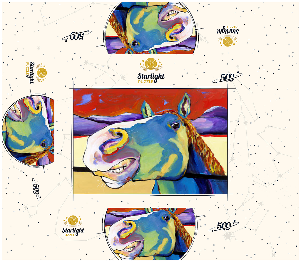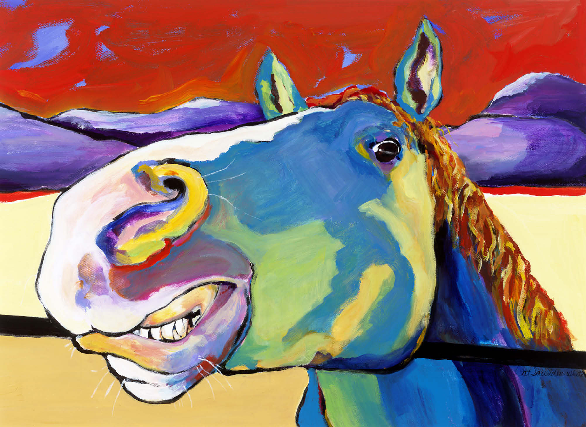This striking painting showcases a playful and colorful depiction of a horse, brimming with personality and humor. Bold blues, greens, and yellows dominate the composition, set against a vivid red and purple background that emphasizes the horse's lively expression and cheerful grin. The stylized brushstrokes and bright palette give this artwork a modern, whimsical charm, making it a captivating piece for animal and art lovers alike.