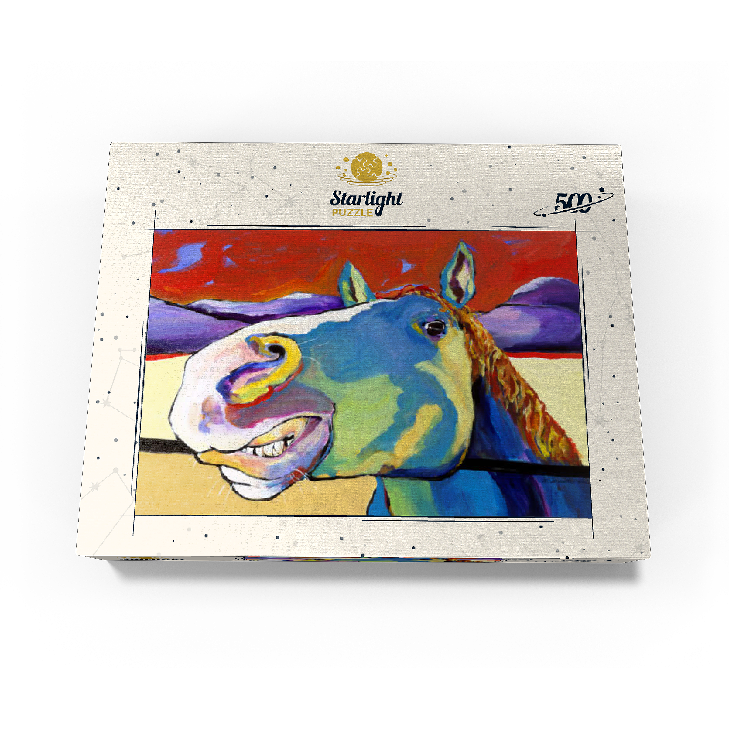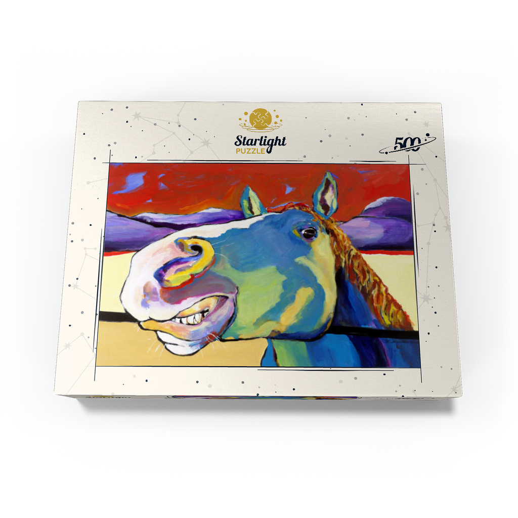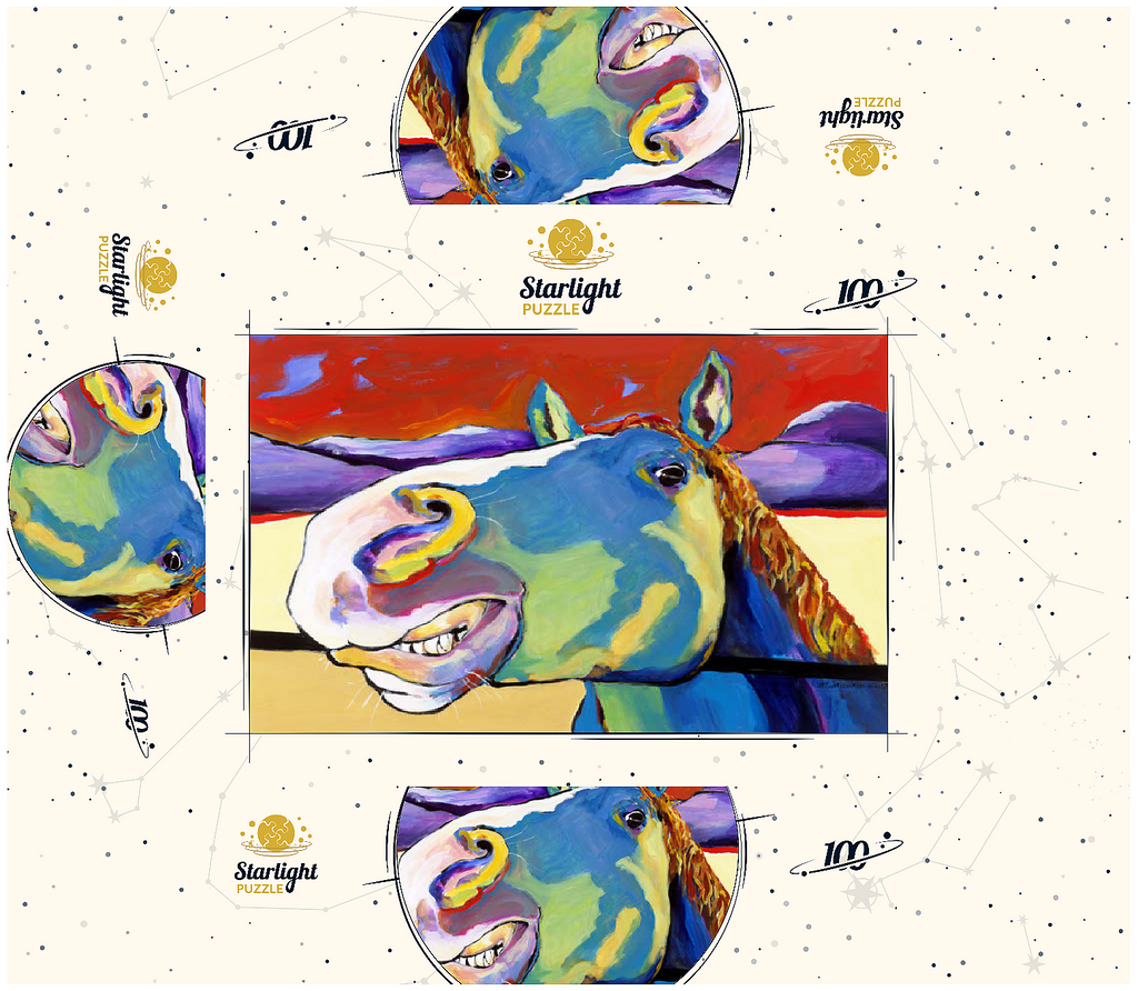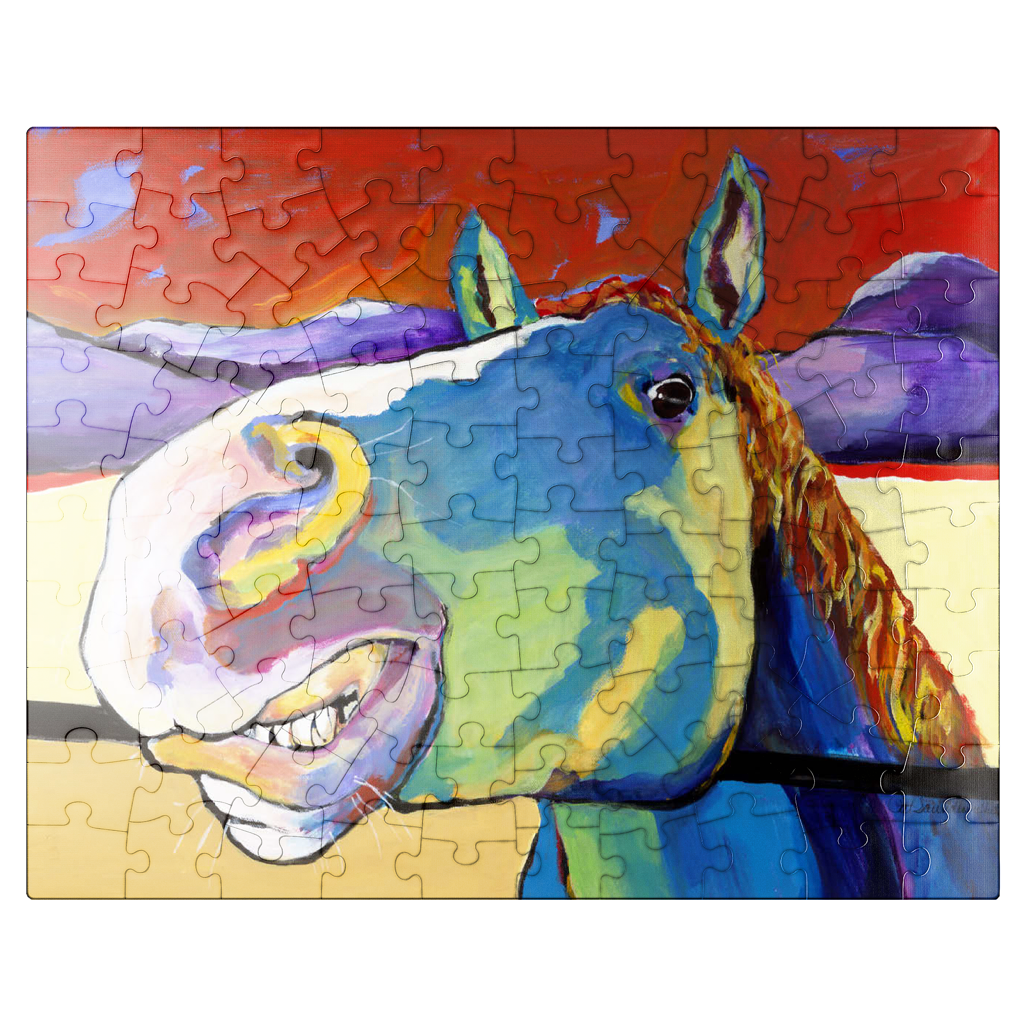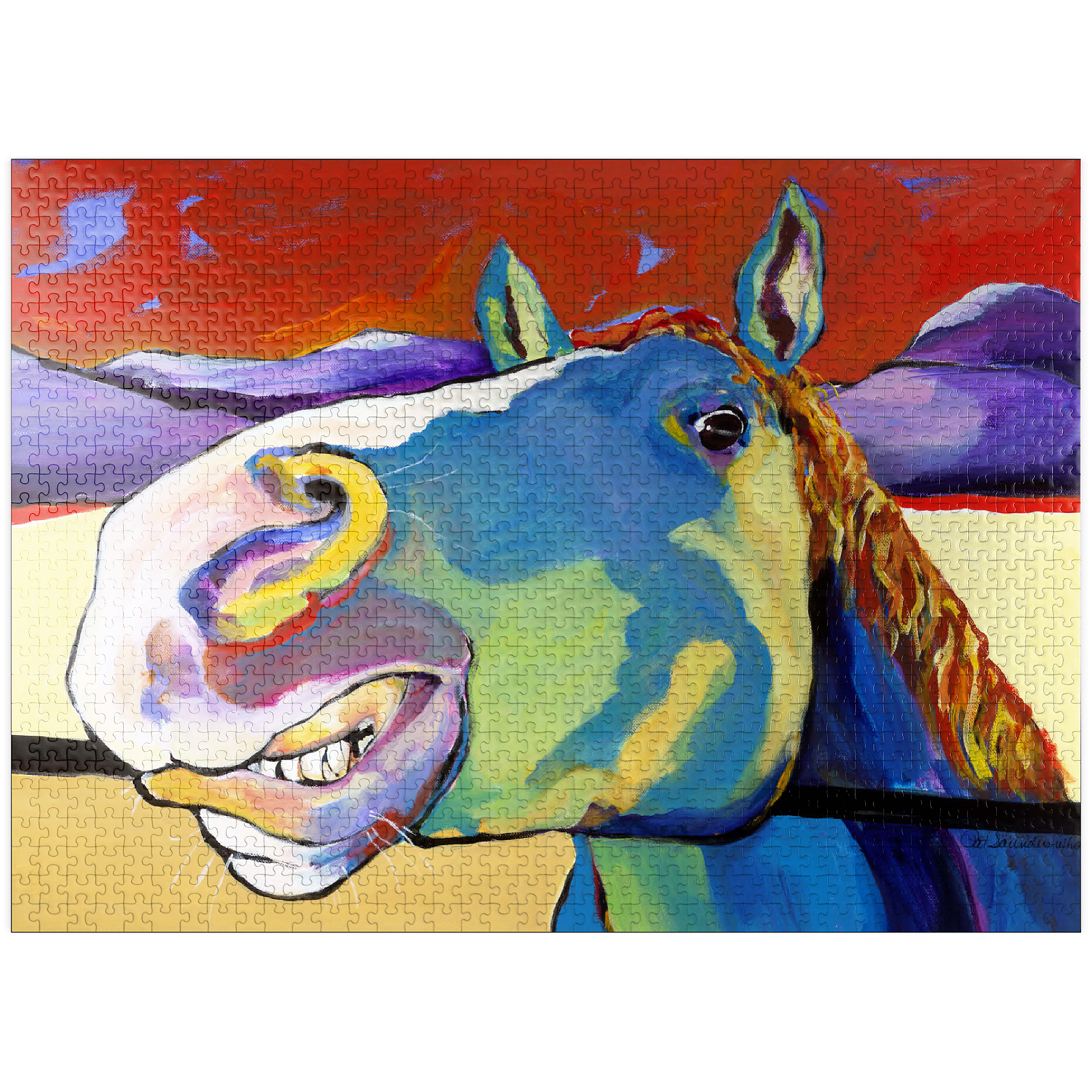 This striking painting showcases a playful and colorful depiction of a horse, brimming with personality and humor. Bold blues, greens, and yellows dominate the composition, set against a vivid red and purple background that emphasizes the horse's lively expression and cheerful grin. The stylized brushstrokes and bright palette give this artwork a modern, whimsical charm, making it a captivating piece for animal and art lovers alike.