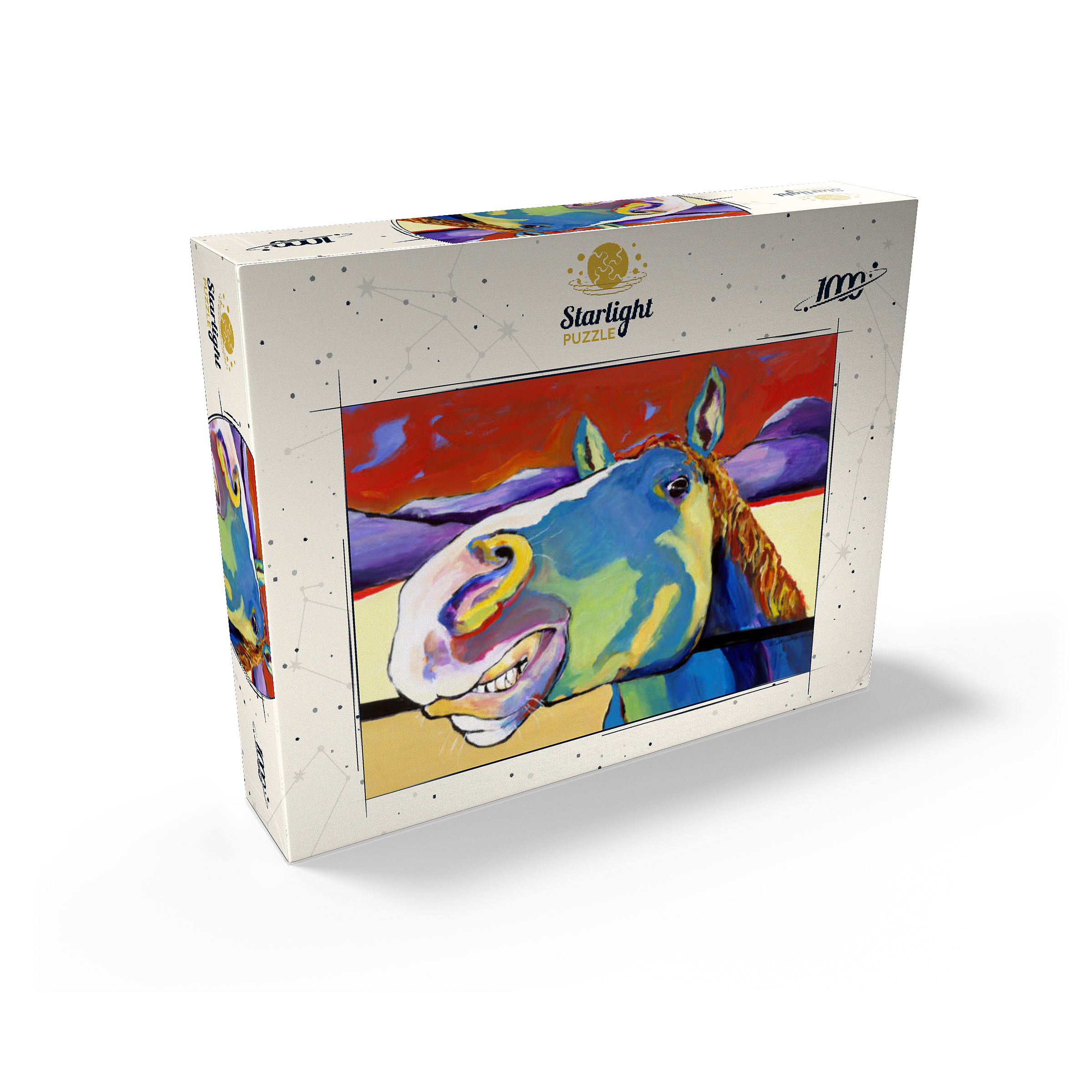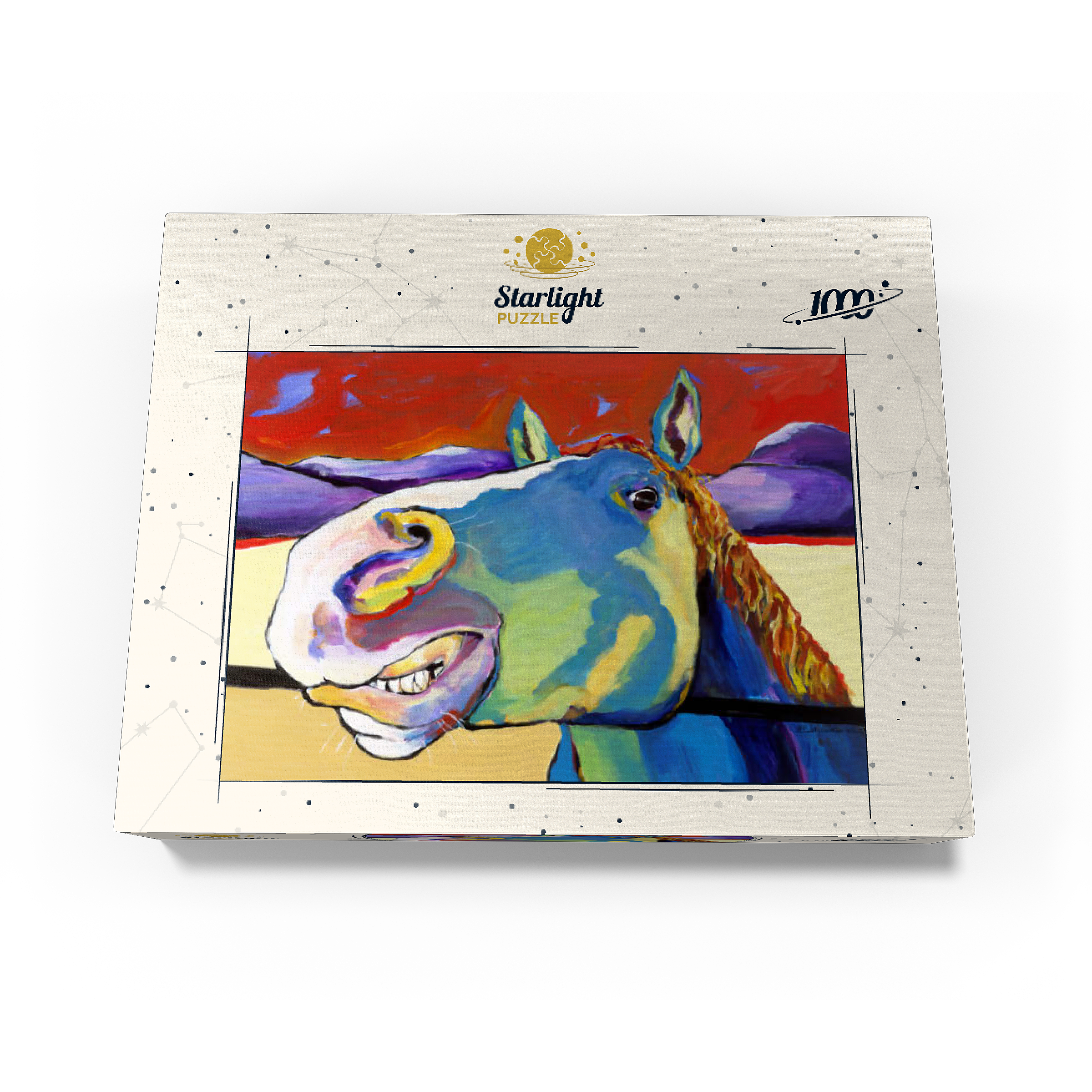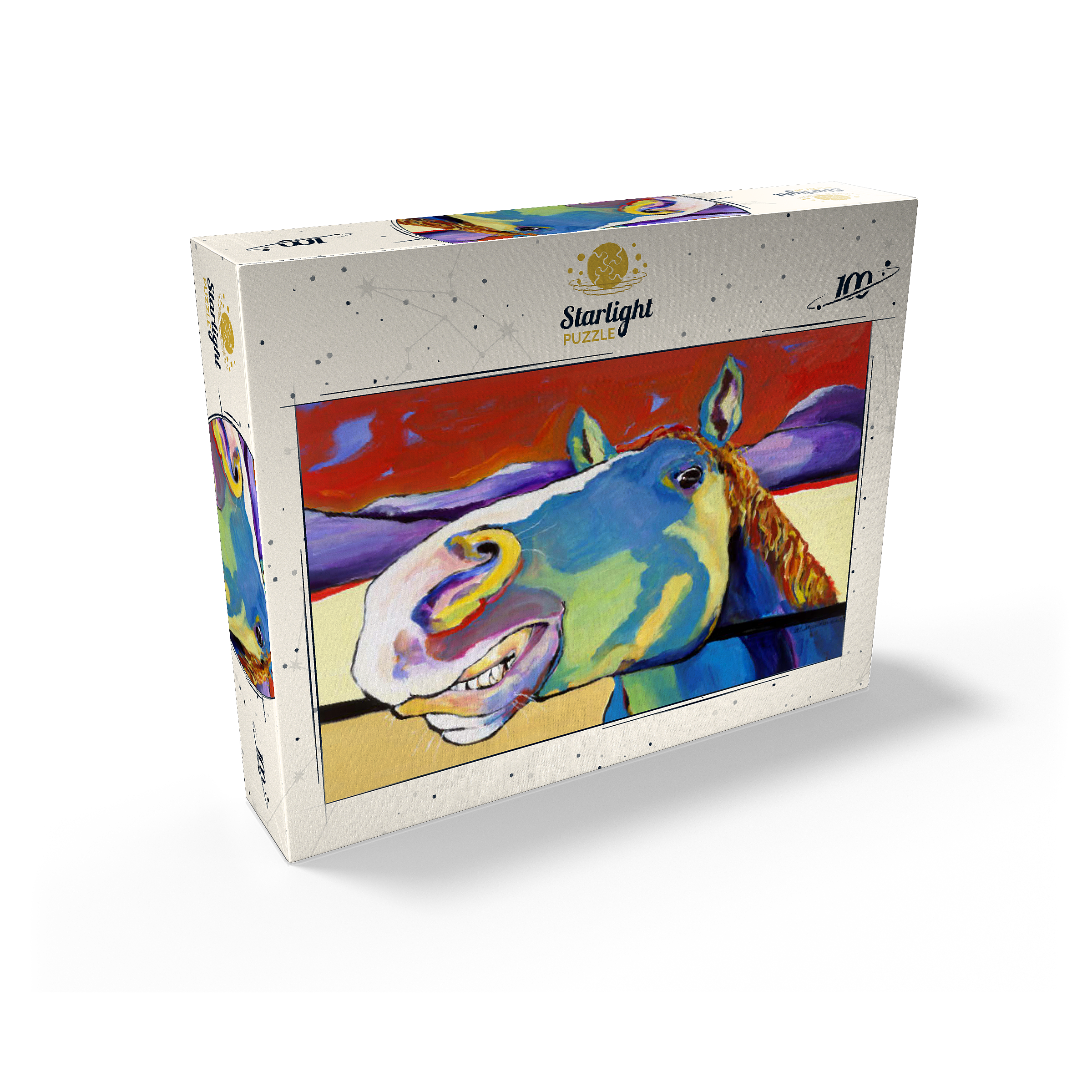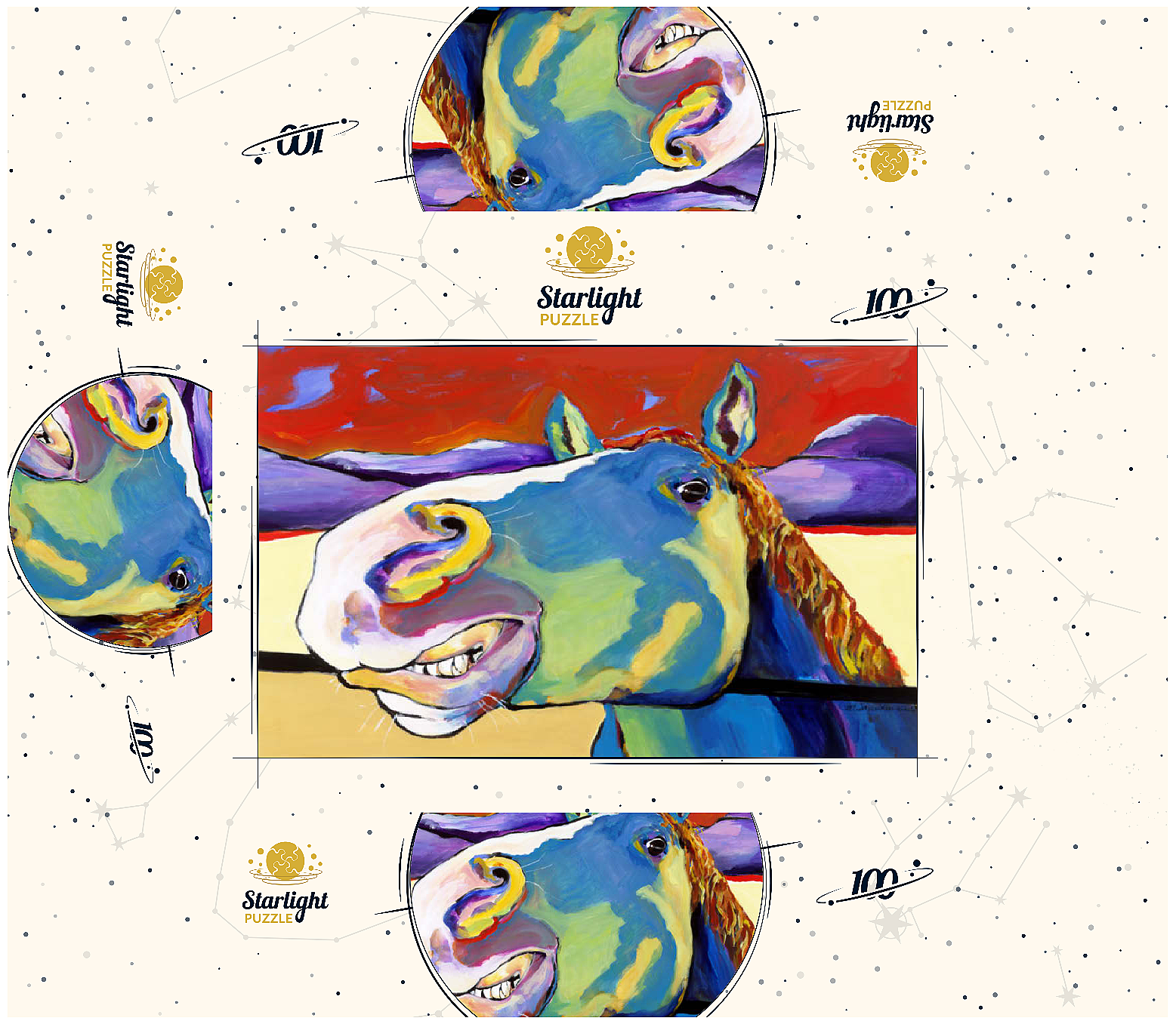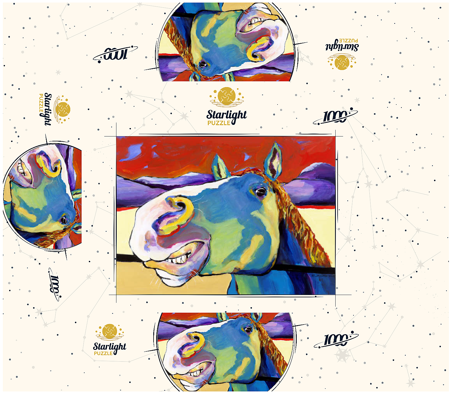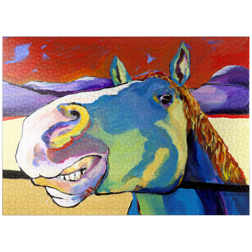 This striking painting showcases a playful and colorful depiction of a horse, brimming with personality and humor. Bold blues, greens, and yellows dominate the composition, set against a vivid red and purple background that emphasizes the horse's lively expression and cheerful grin. The stylized brushstrokes and bright palette give this artwork a modern, whimsical charm, making it a captivating piece for animal and art lovers alike.